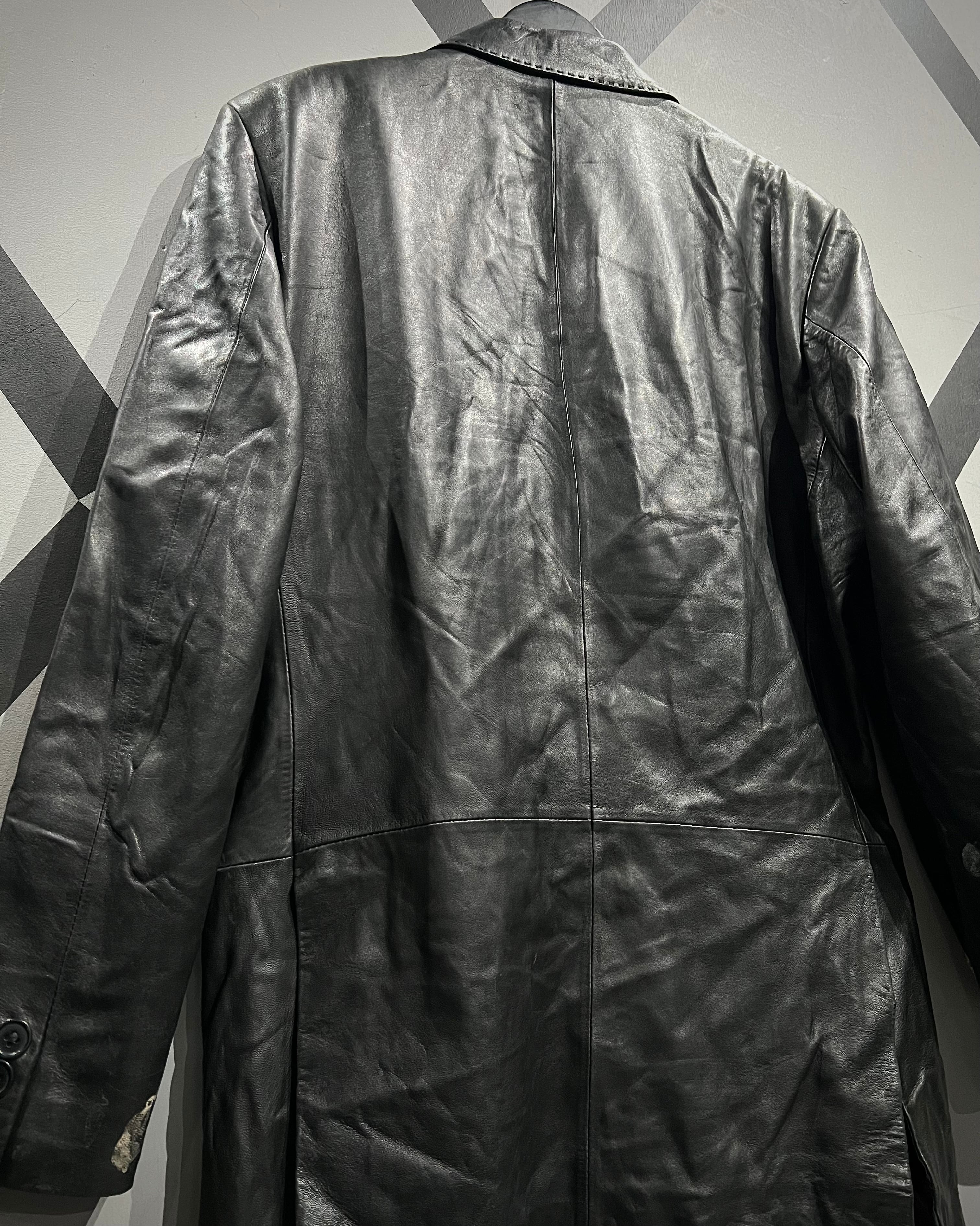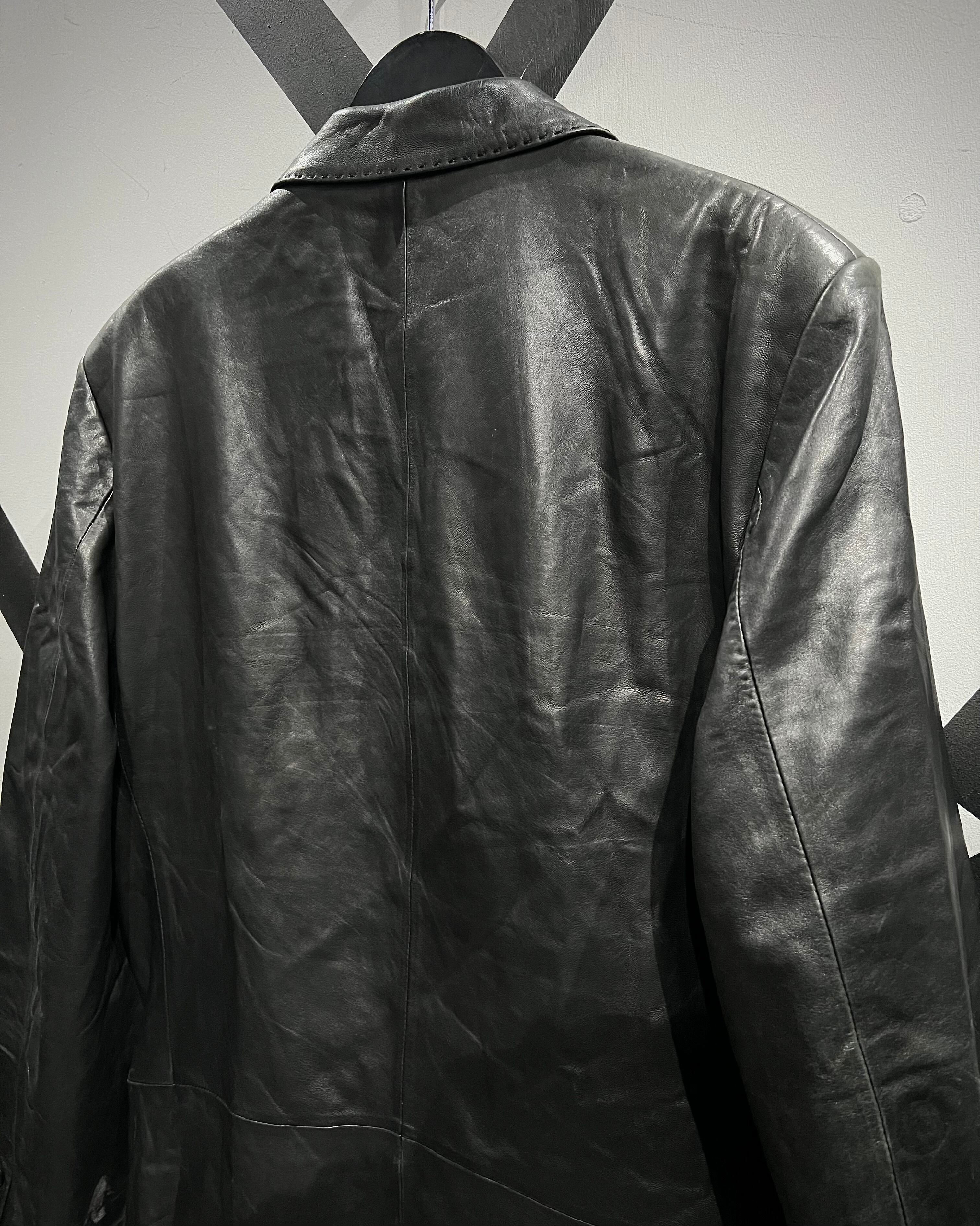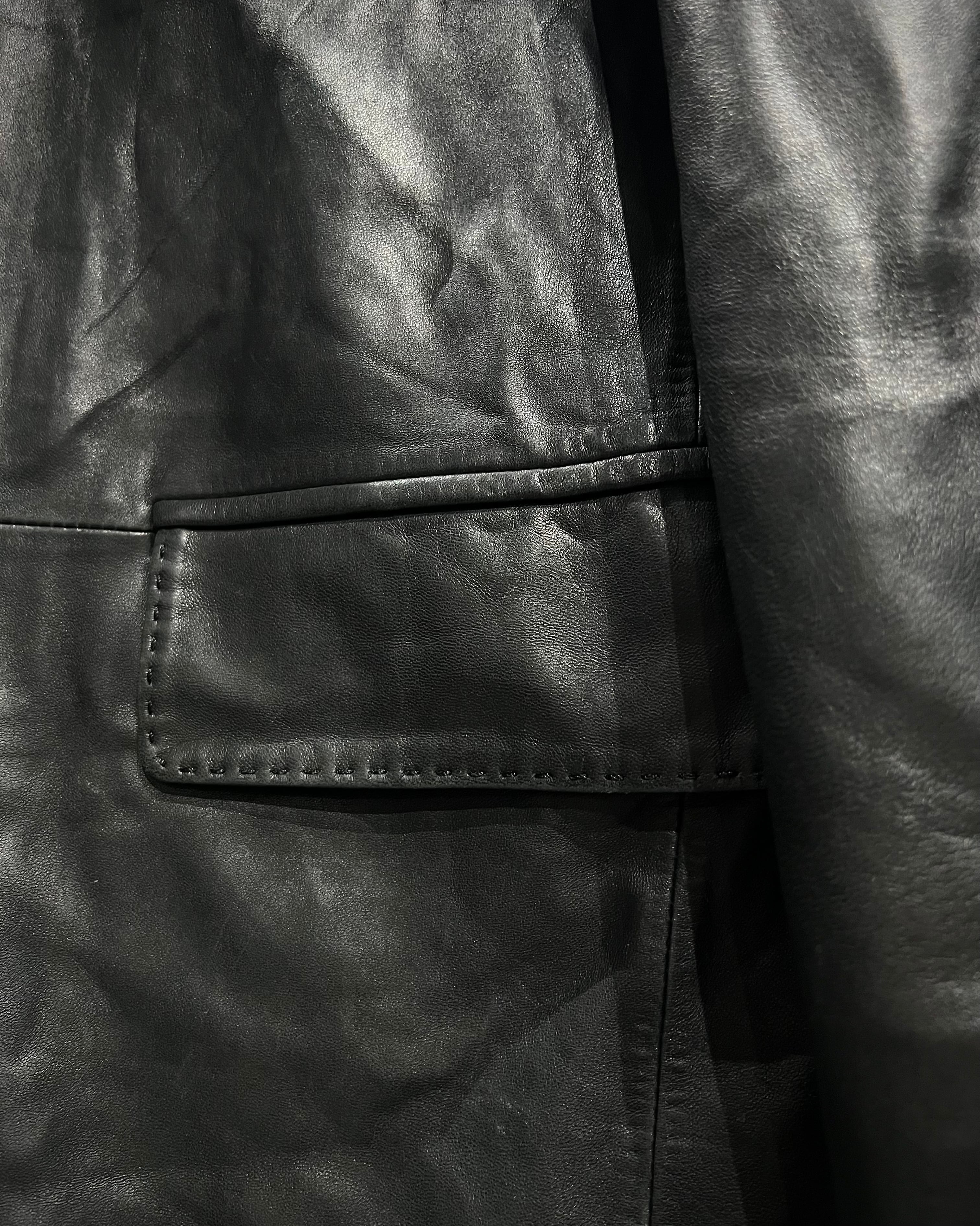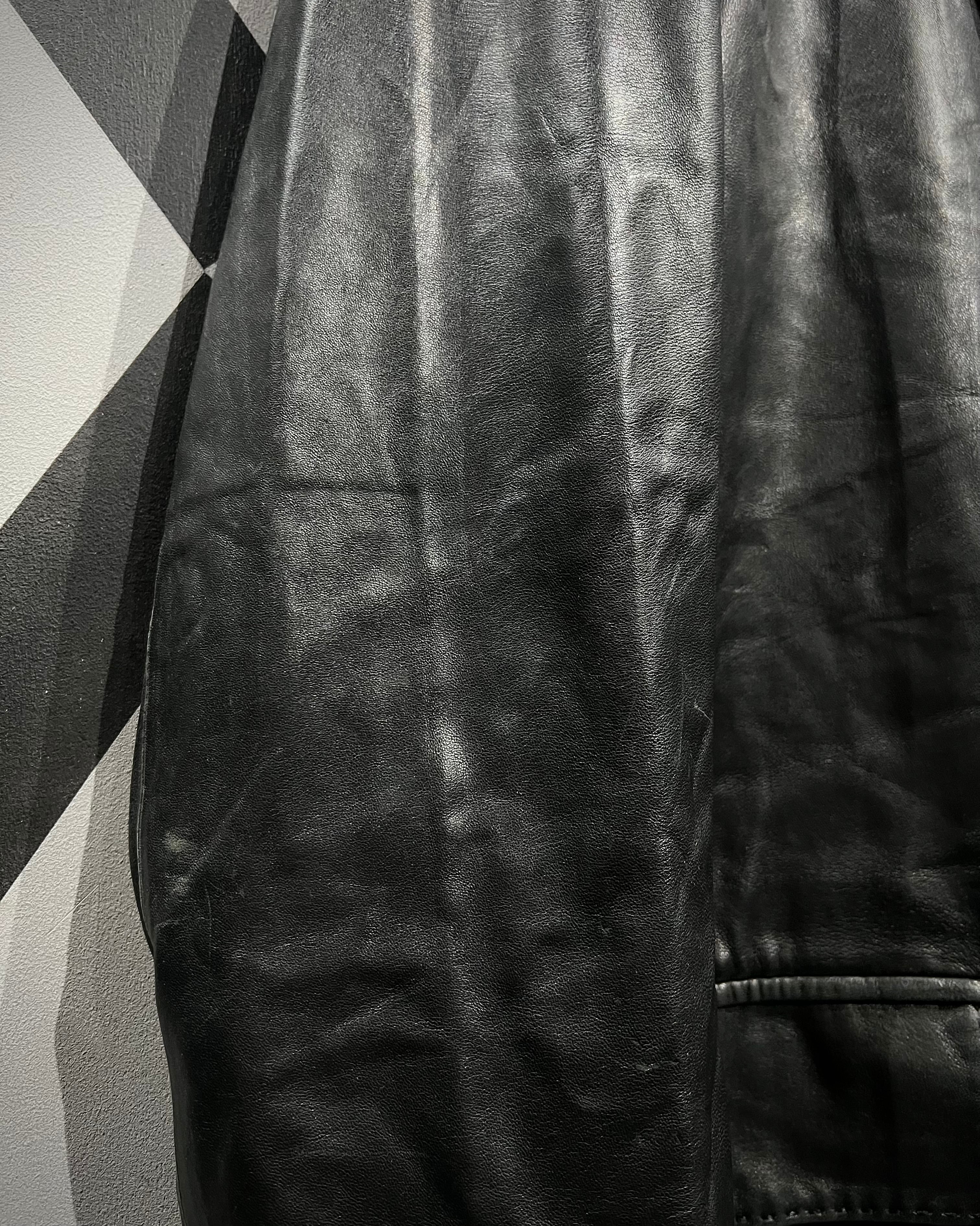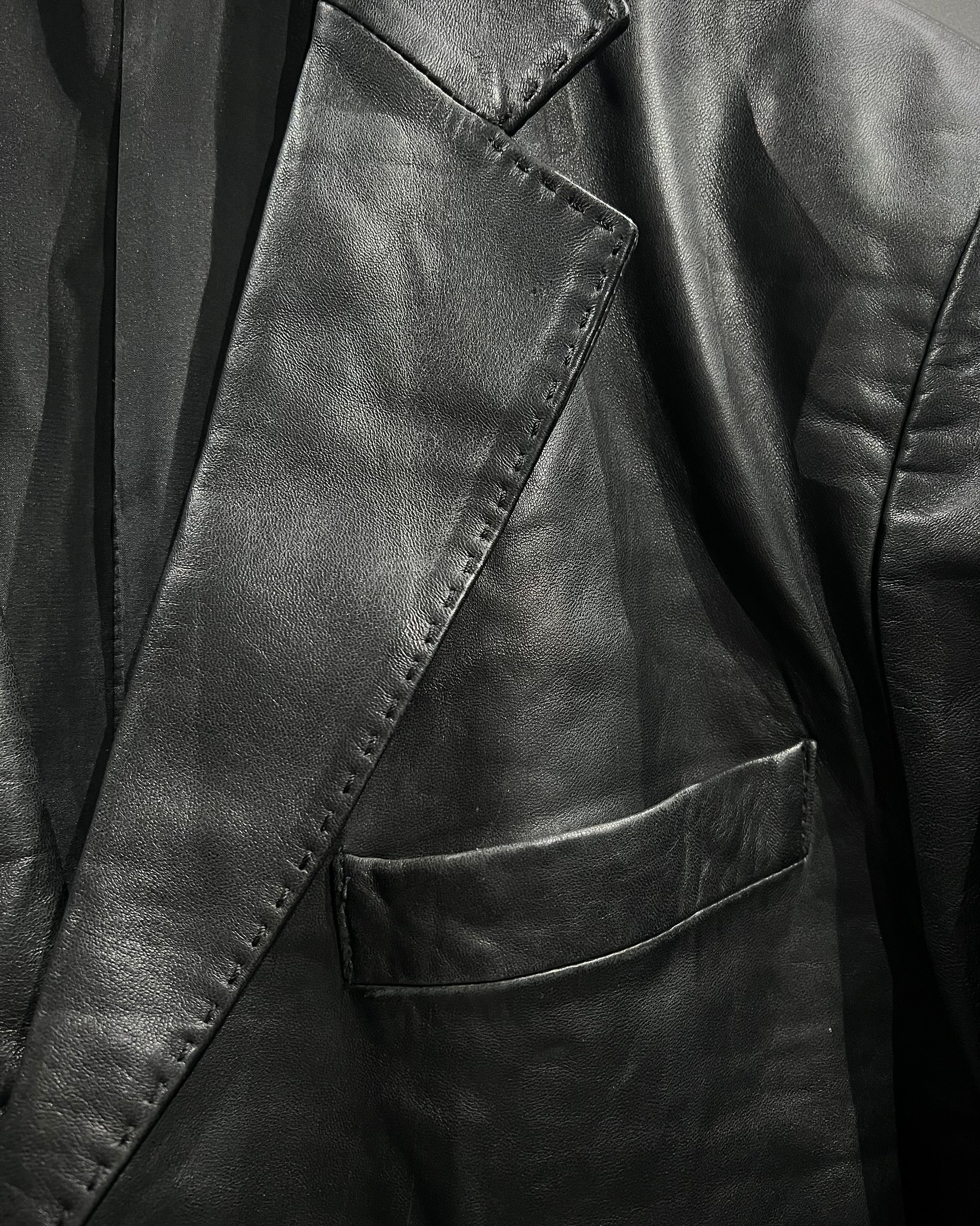 滑らかでしなやかなレザーは、着込むほどに身体へ馴染み、皺や陰影が奥行きを生み出す表情豊かな質感。光を受けて鈍く反射する艶が、ラグジュアリーさと無骨さを同時に演出します。