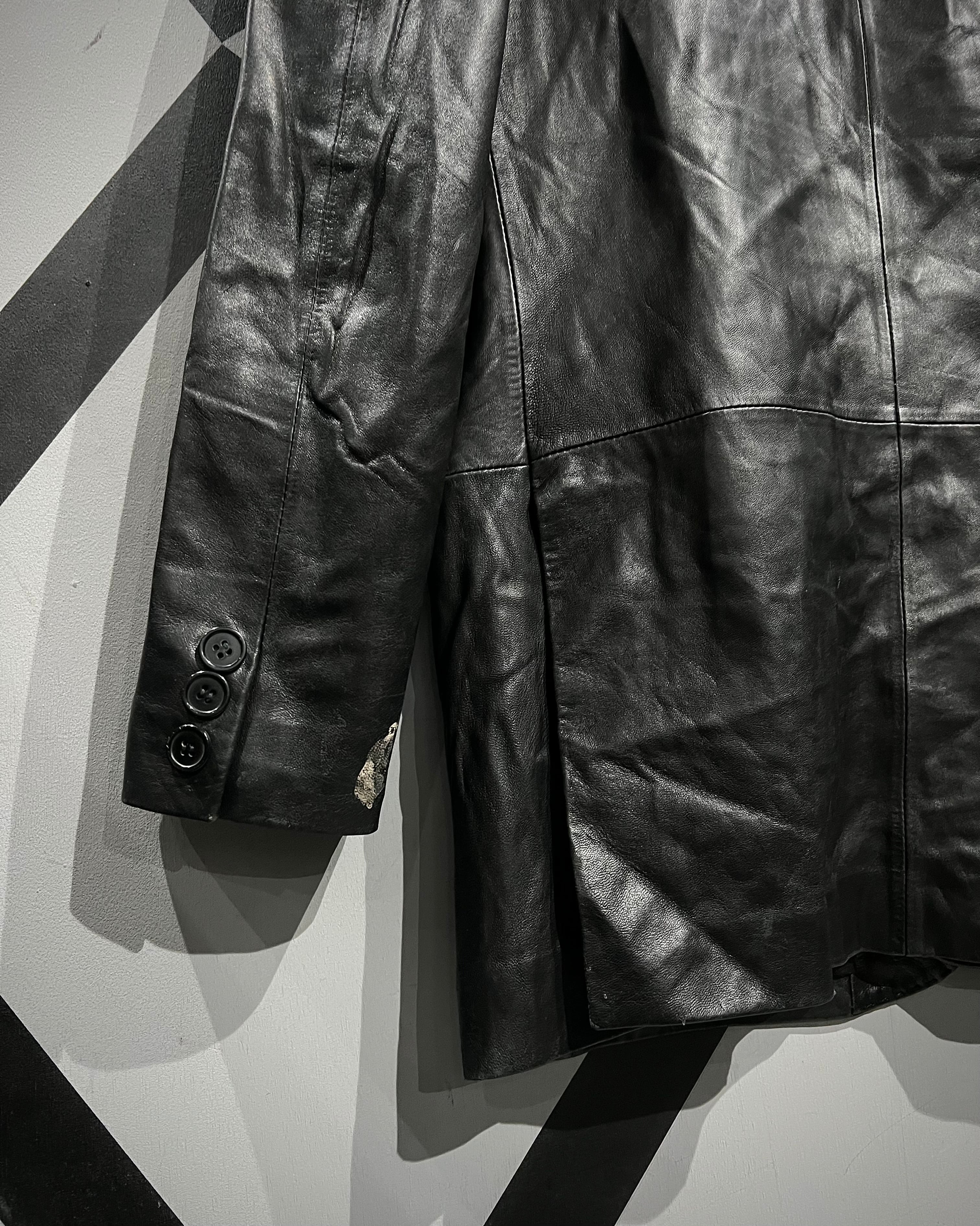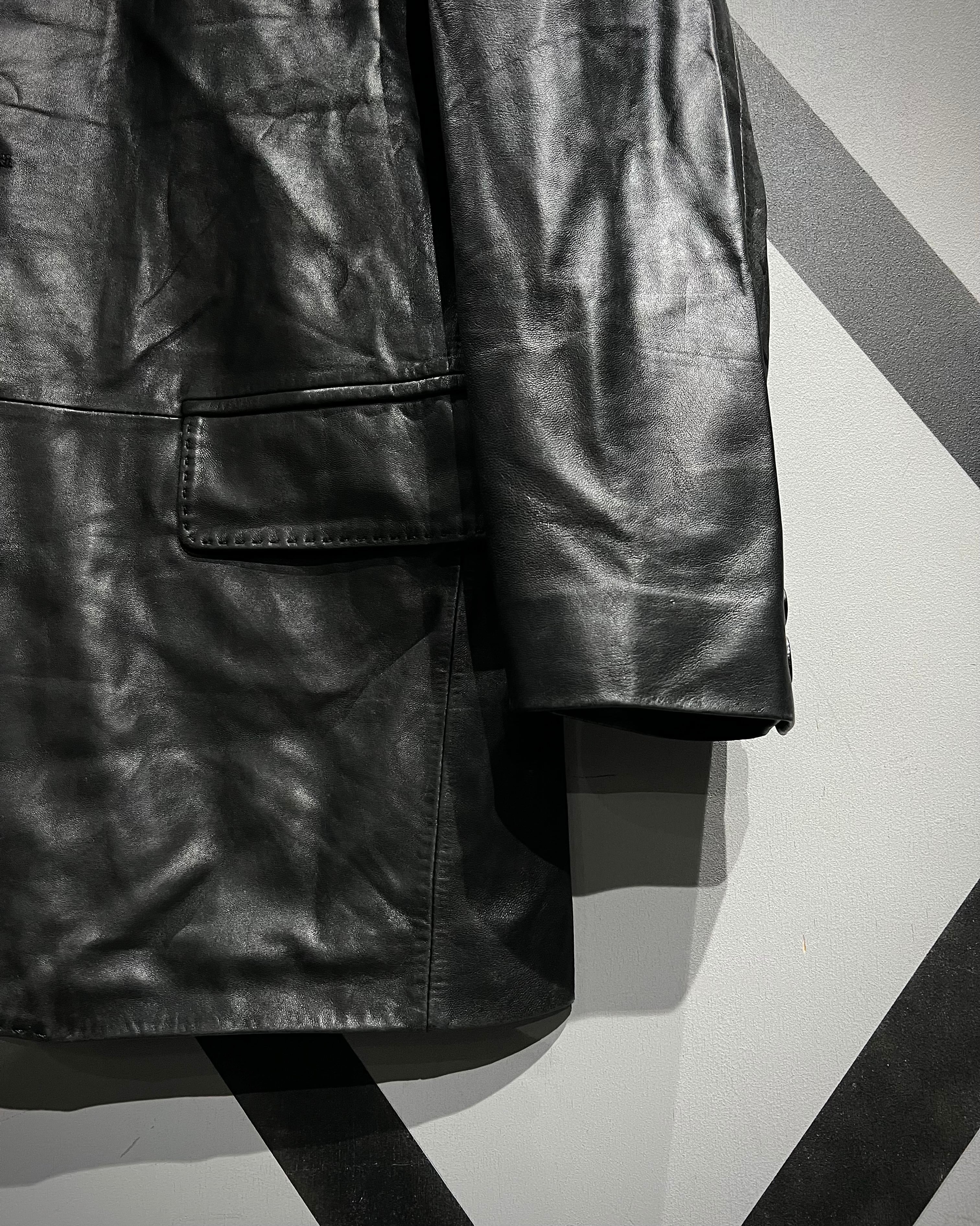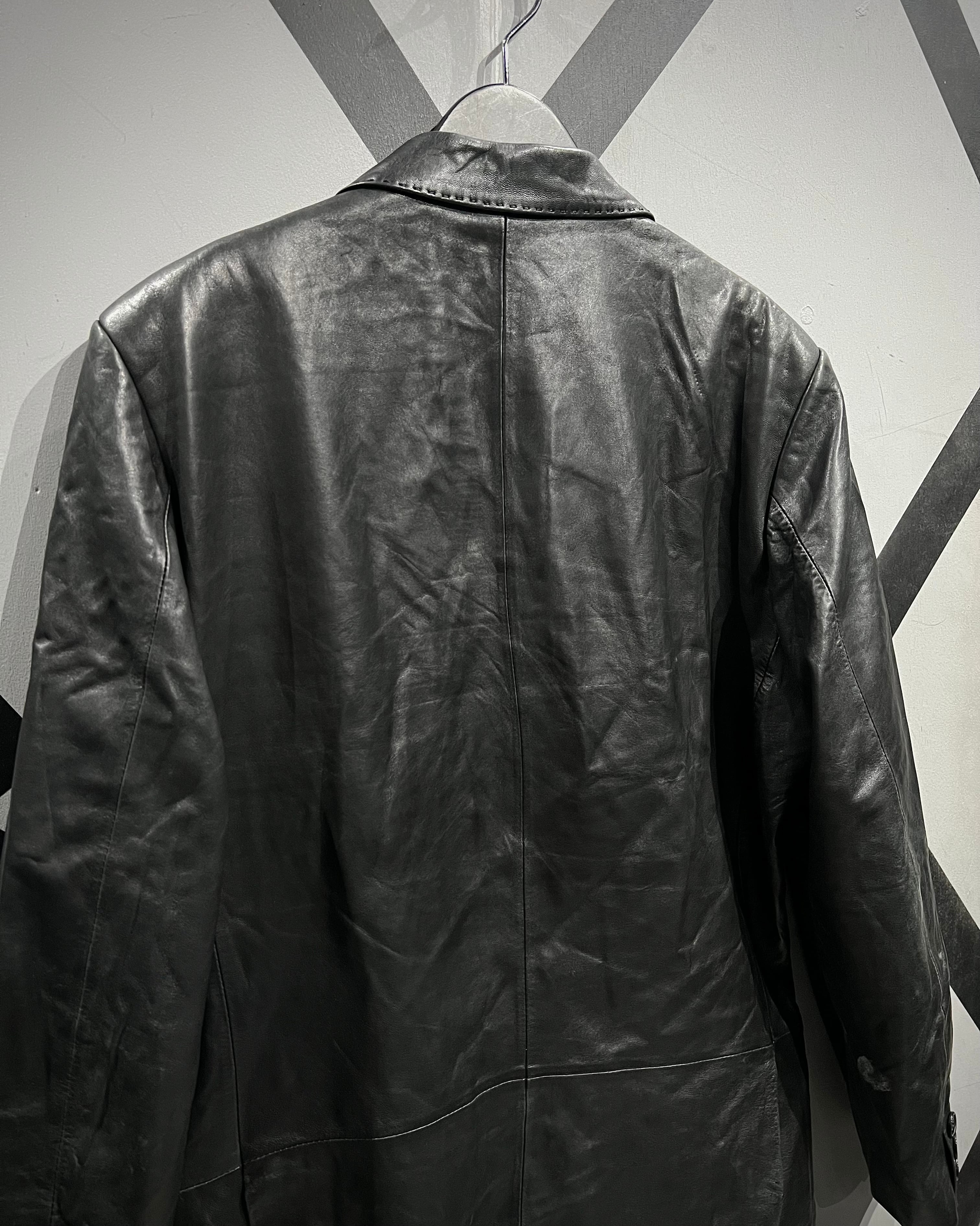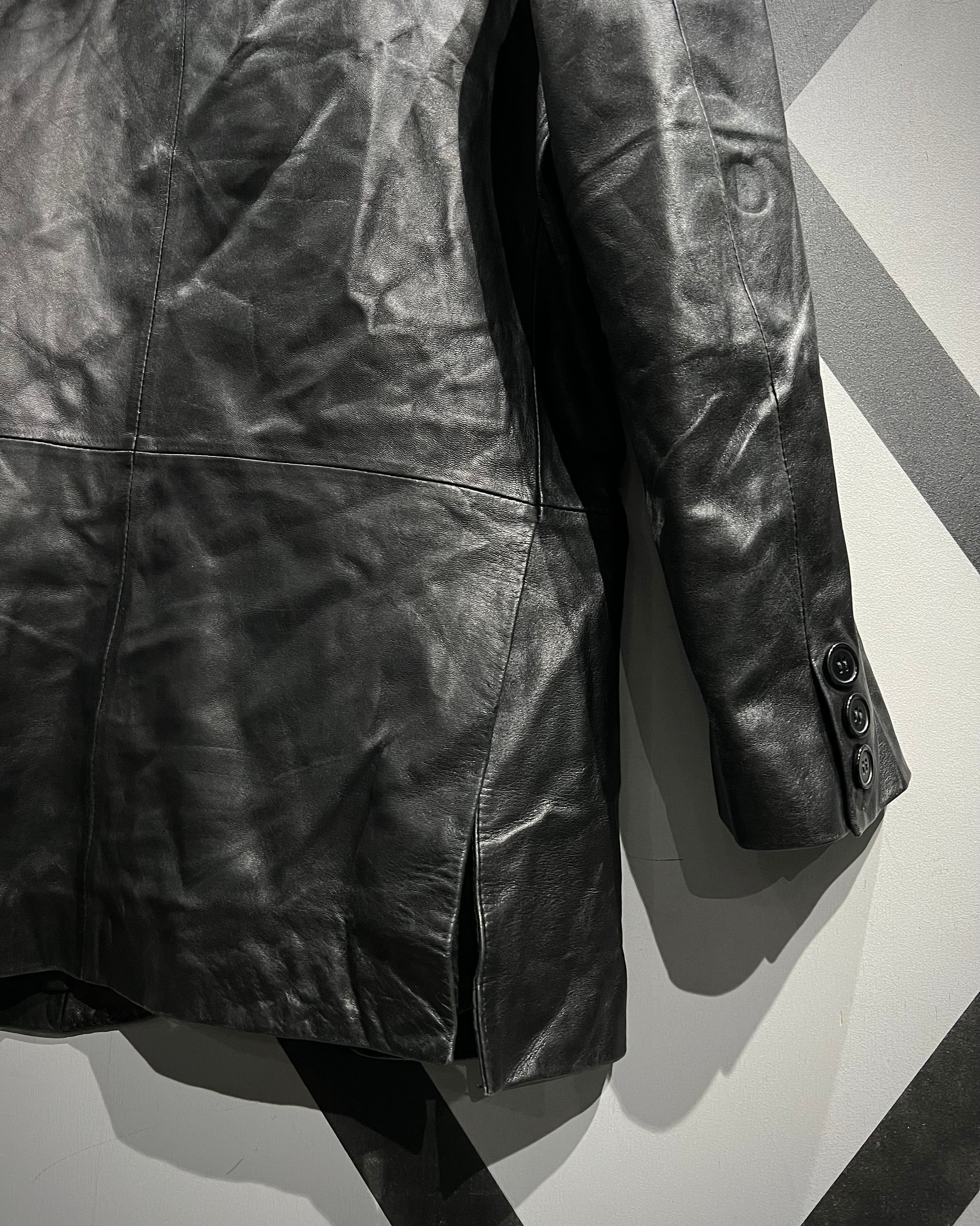 艶やかなブラックレザーで仕上げられた、シングルブレスト仕様のレザーテーラードジャケット。