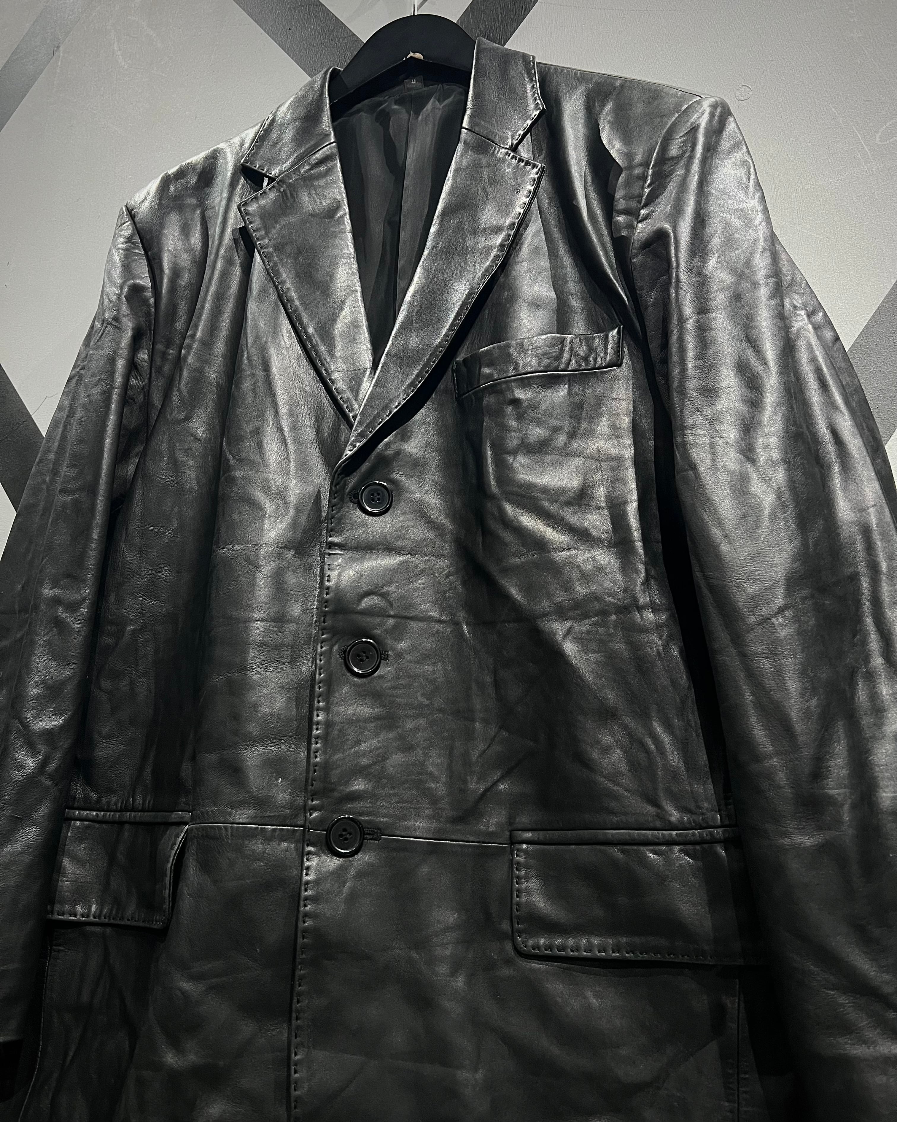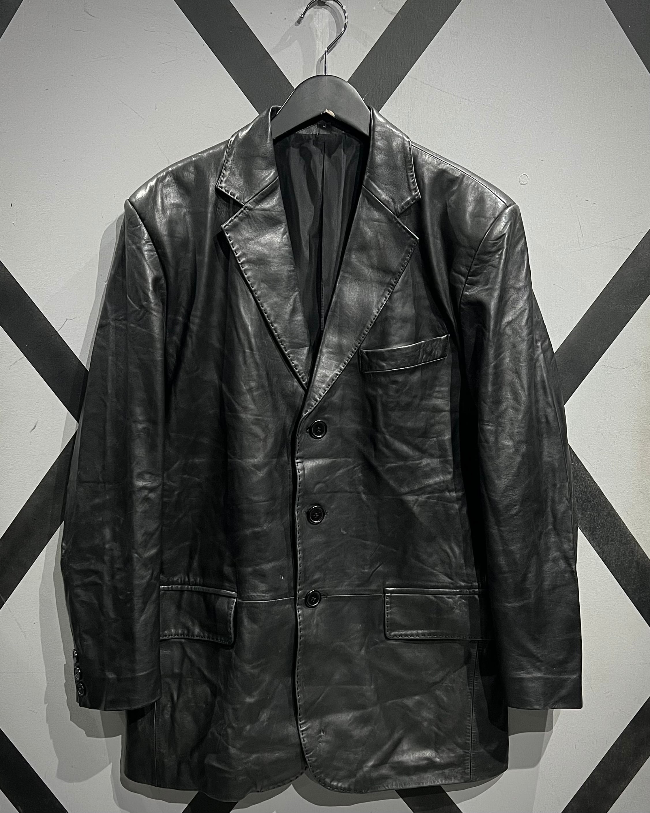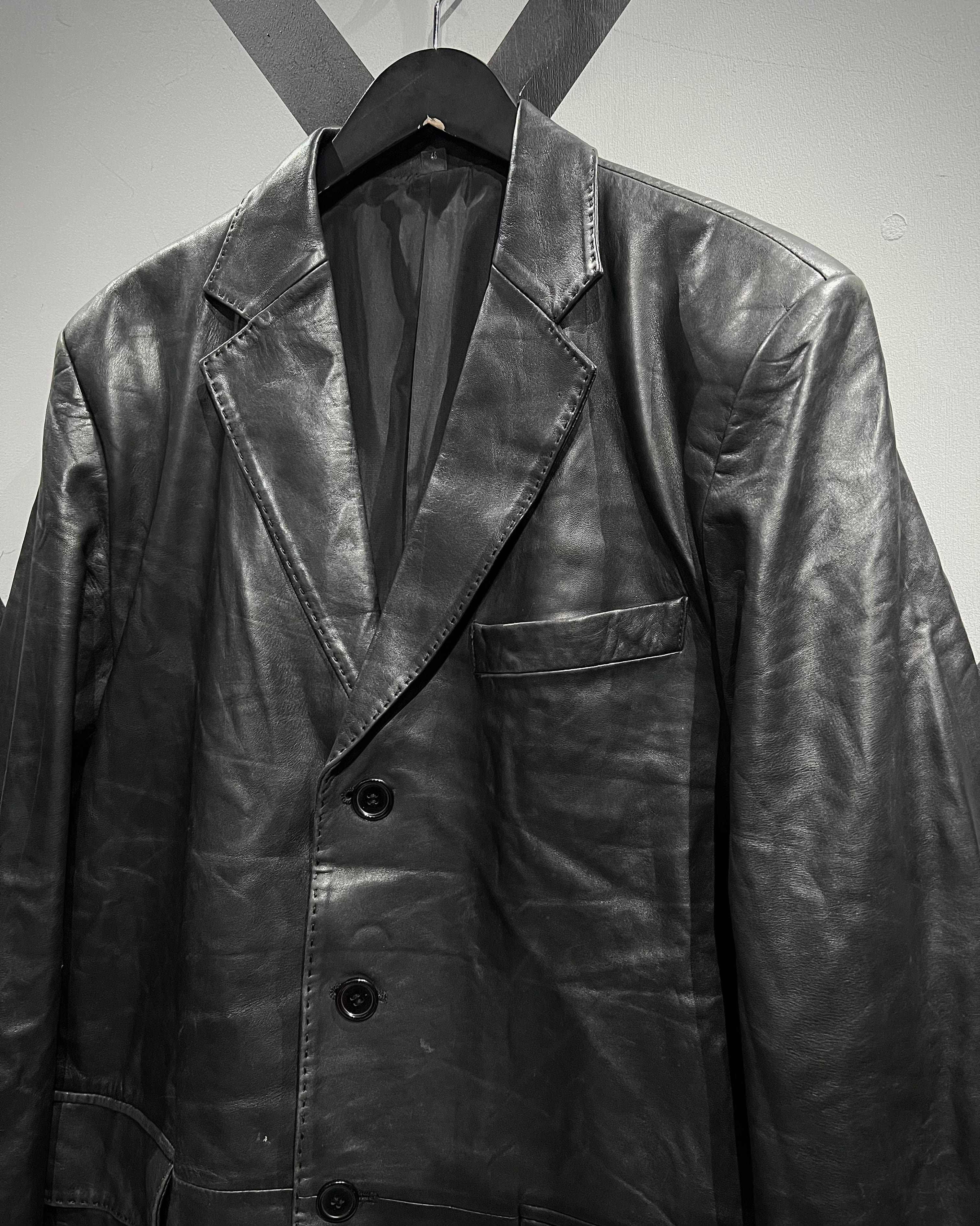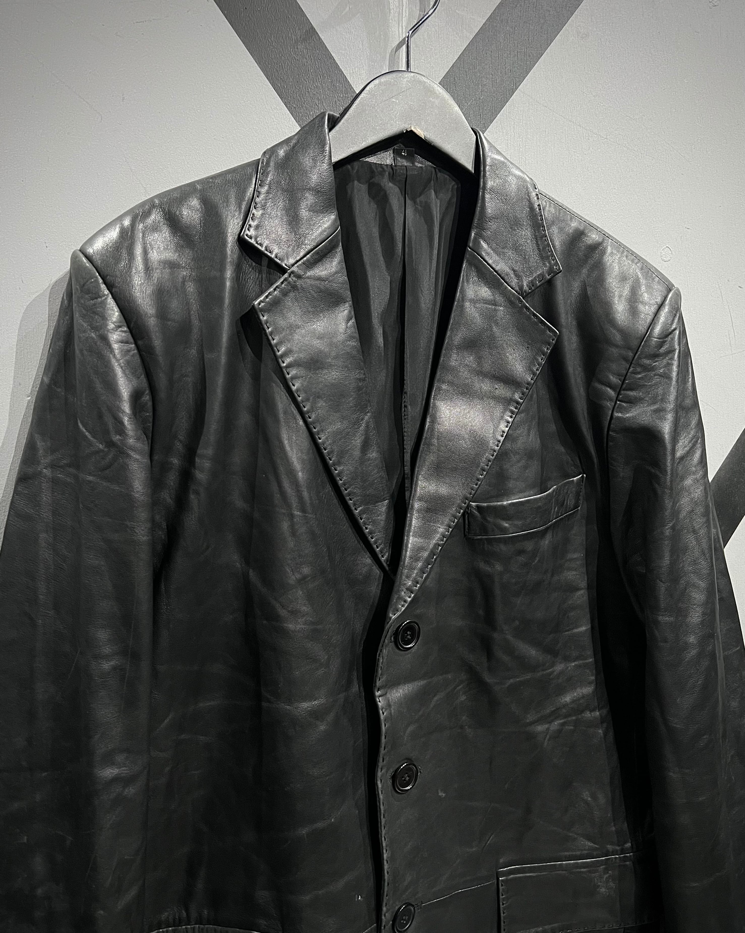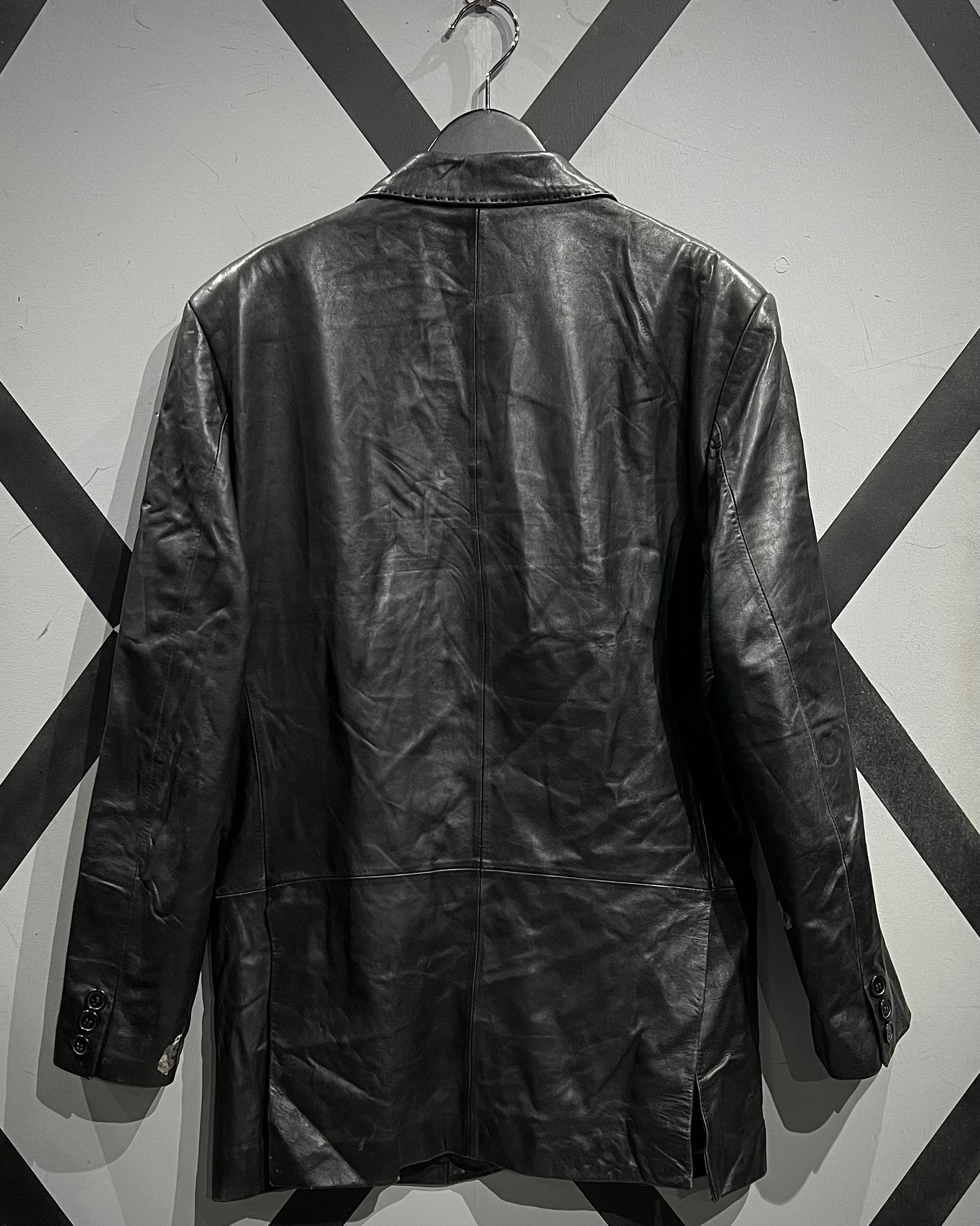 艶やかなブラックレザーで仕上げられた、シングルブレスト仕様のレザーテーラードジャケット。