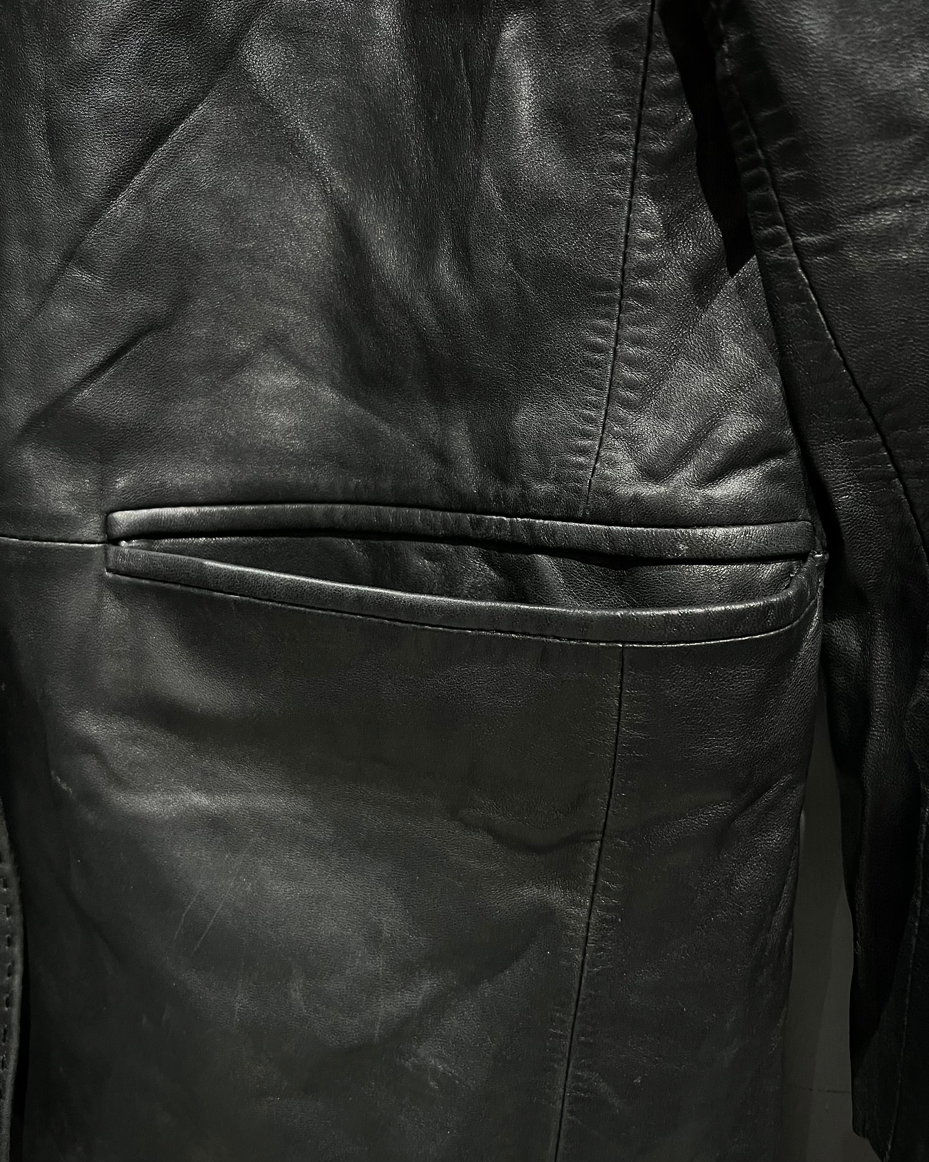 フロントはシングルブレストの3ボタン仕様。ノッチドラペルの端正なラインに、胸ポケット、フラップポケットを備えたクラシックなディテール。サイドベンツなど、テーラードの基本が、レザーという素材と掛け合わさることで唯一無二の雰囲気へと昇華されています。