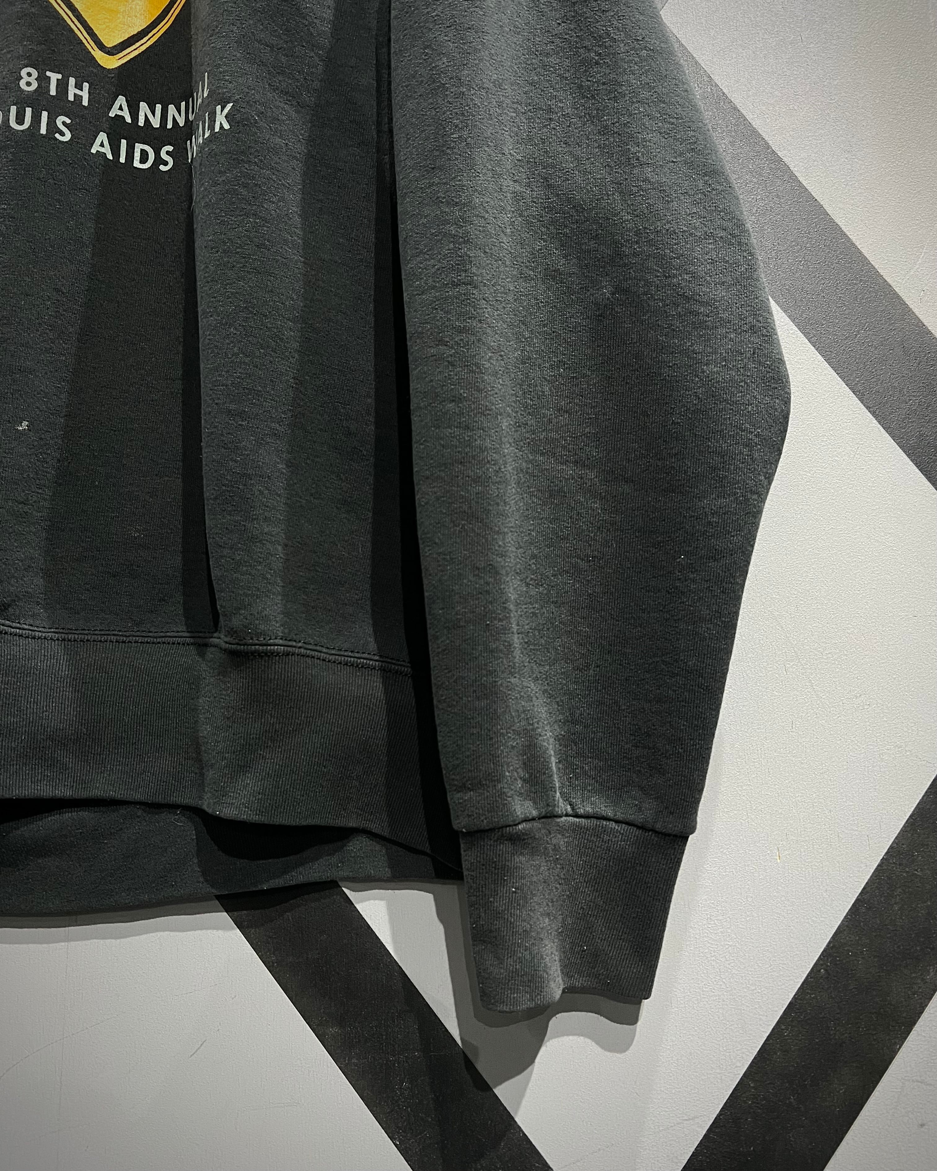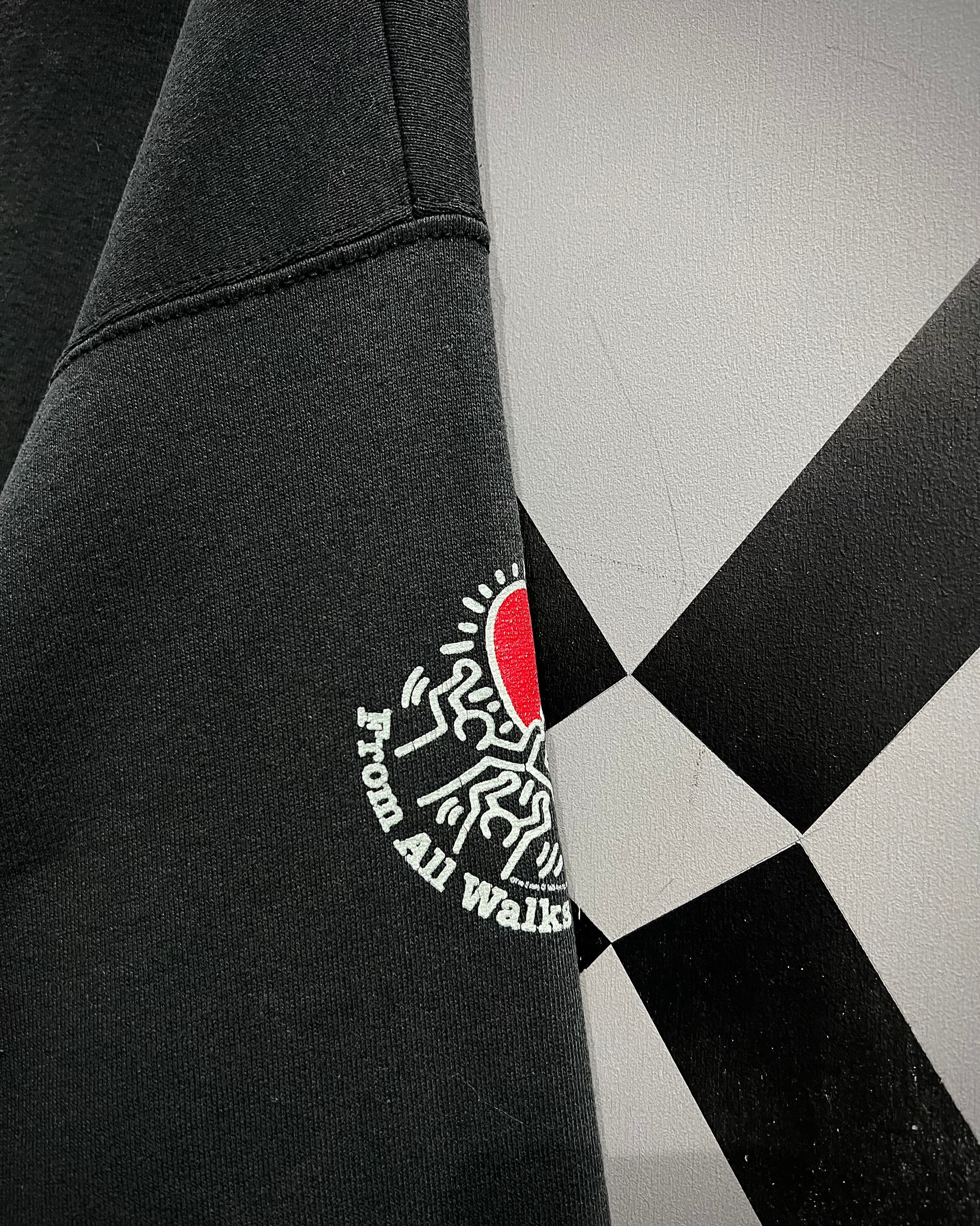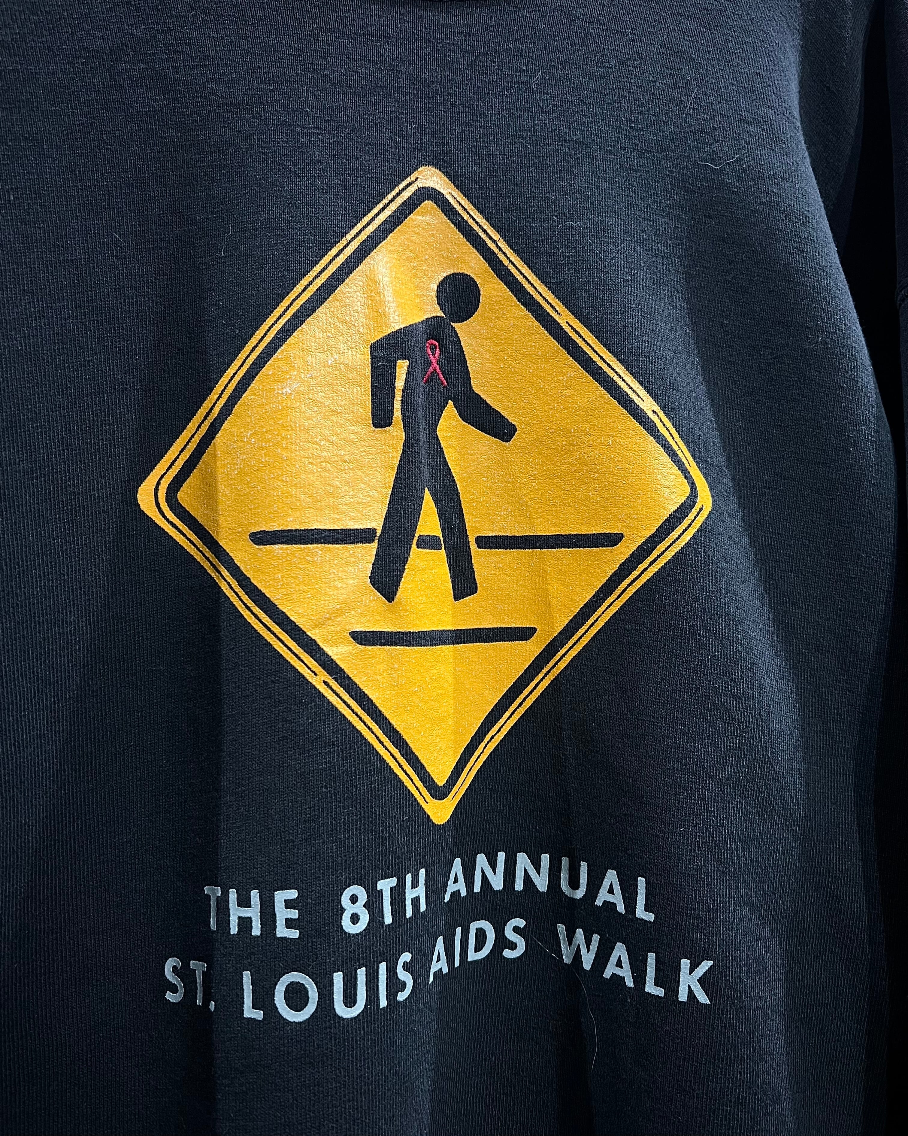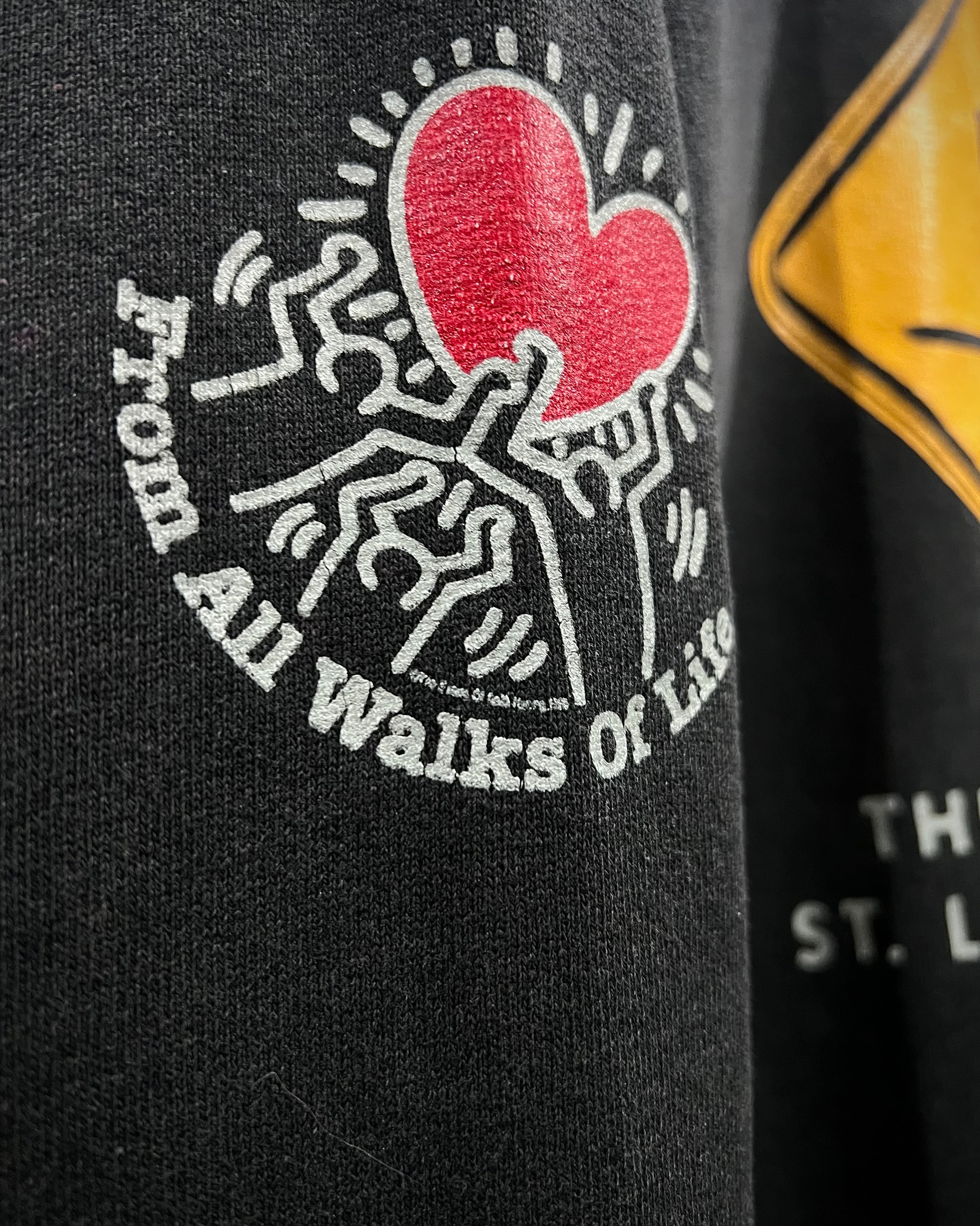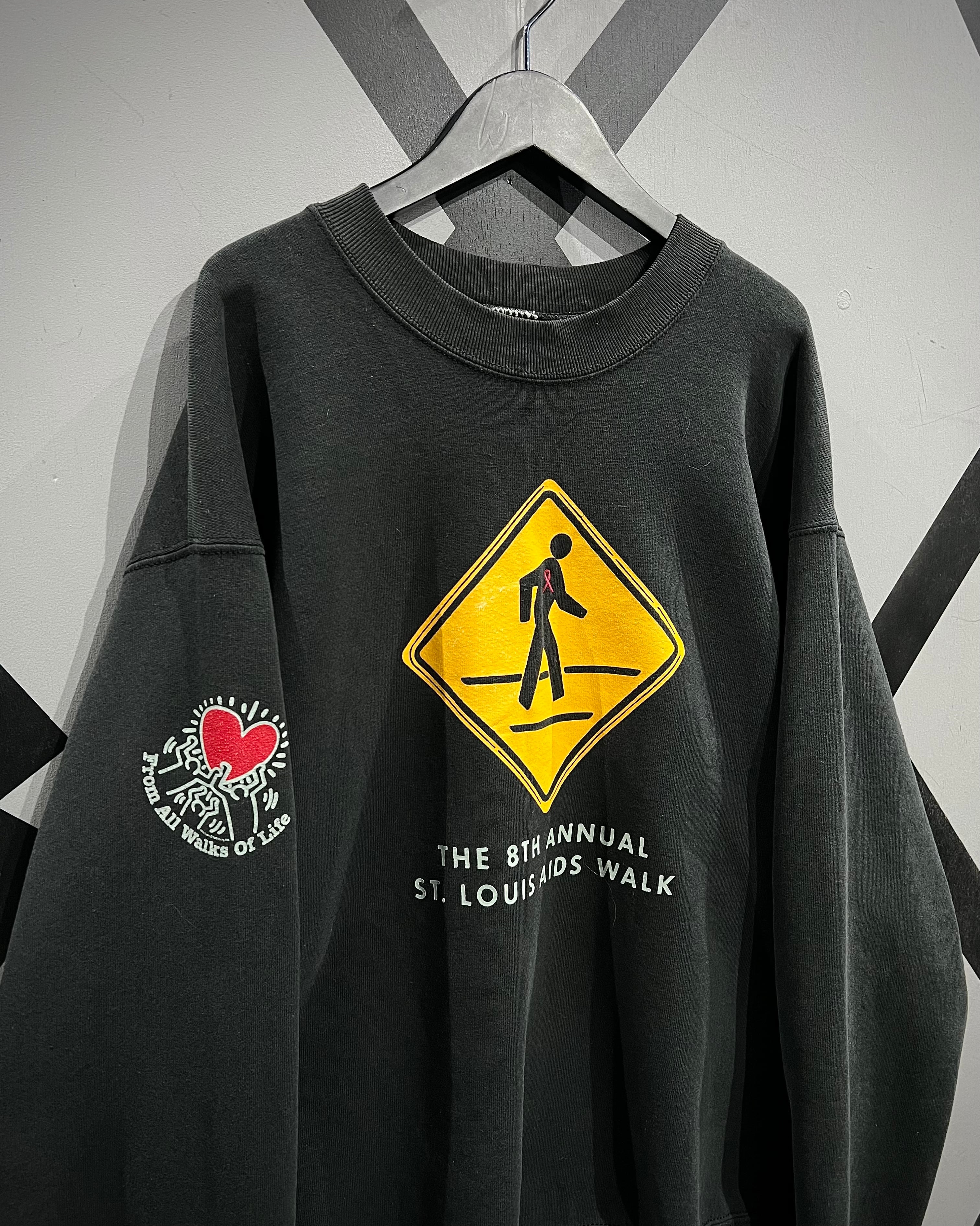 袖にはお馴染みのハートを掲げるヘリングタッチのアートワーク。「THE 8TH ANNUAL ST. LOUIS AIDS WALK」と入るメッセージ性の強いデザインで、カルチャー背景も申し分なし。