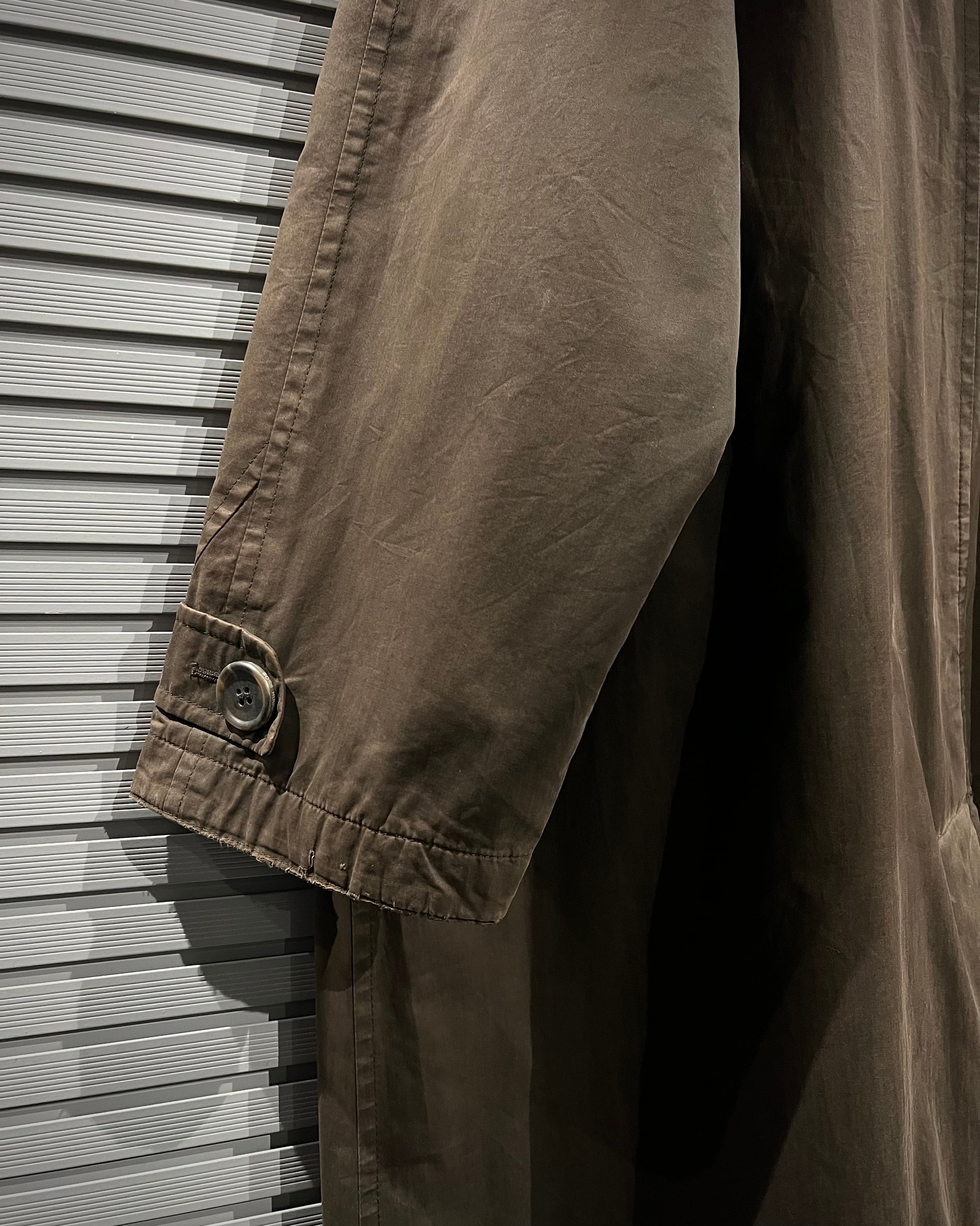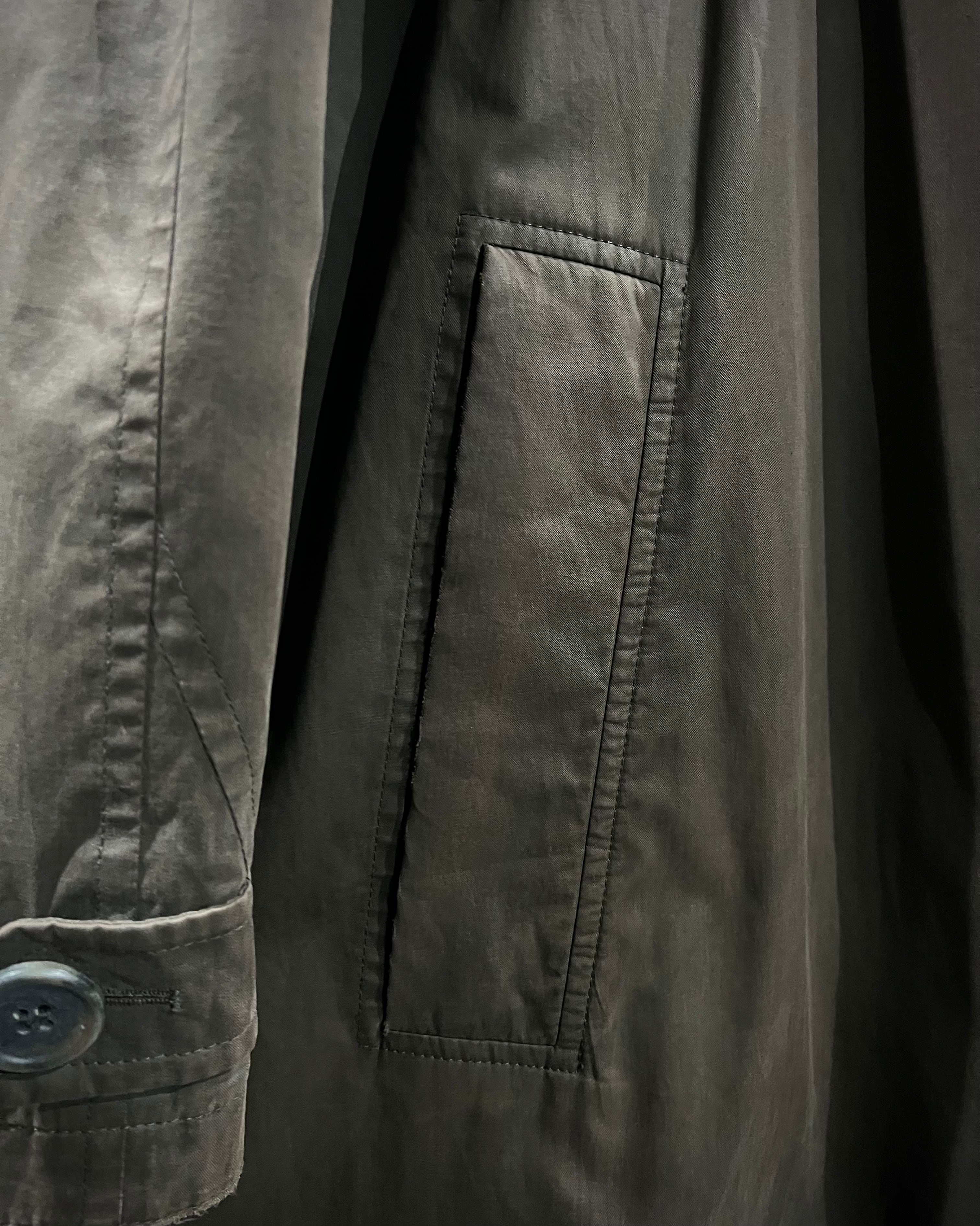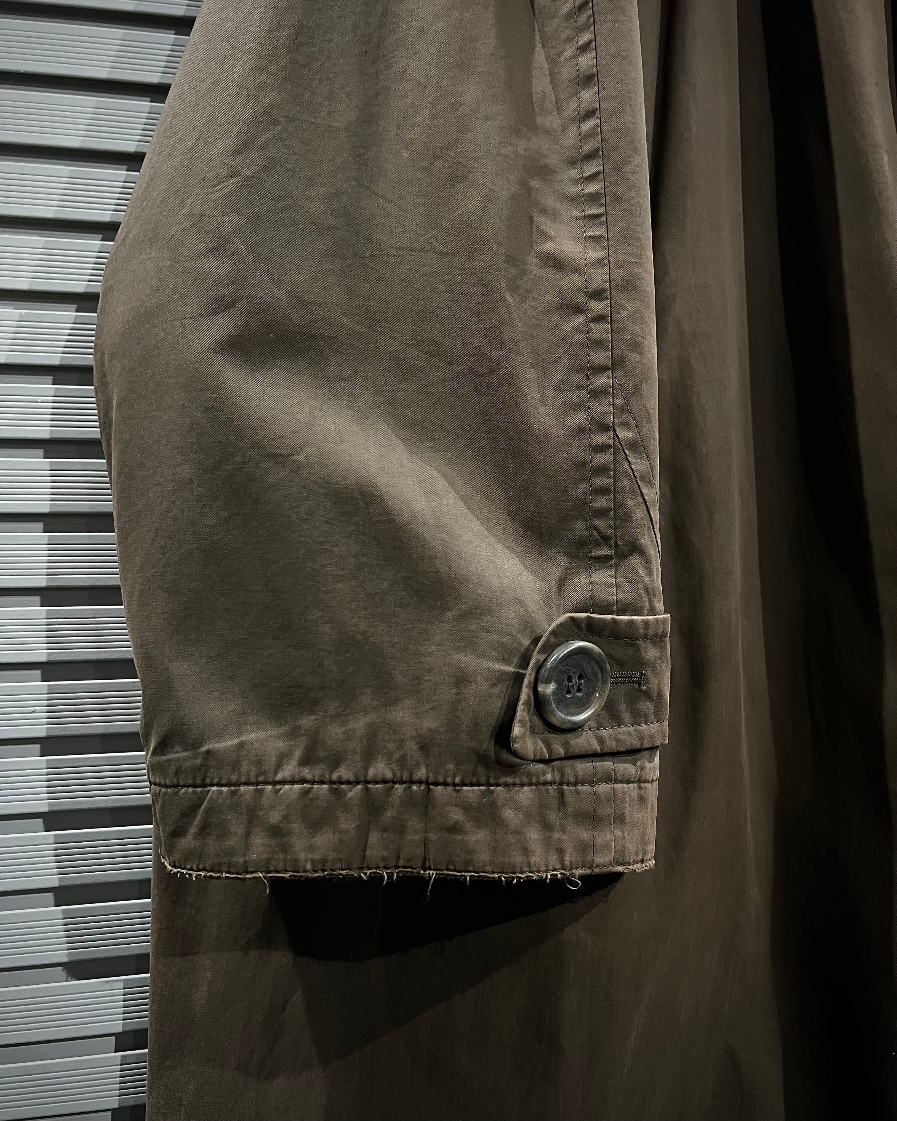 フロントは比翼仕立てでボタンを隠し、クリーンなフロントラインを表現。大ぶりのボタンや袖口のストラップに、バックはセンターベント入りで足捌きも良く、ロング丈ながら軽快な着用感が◎