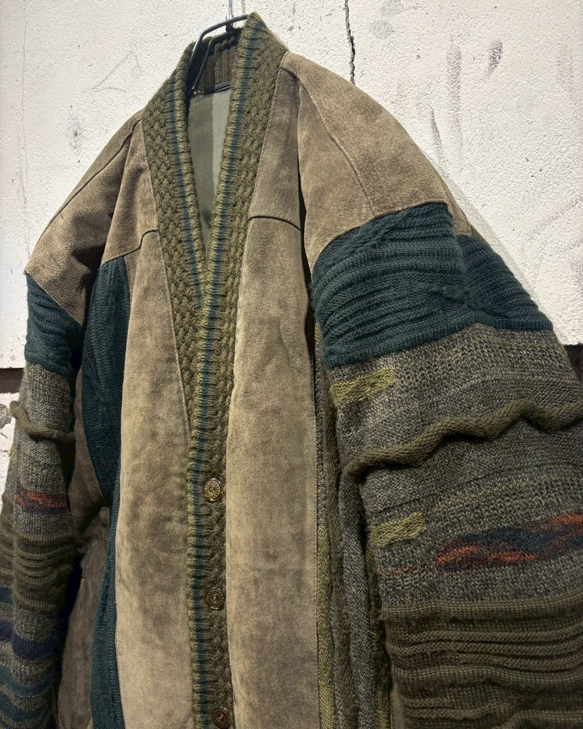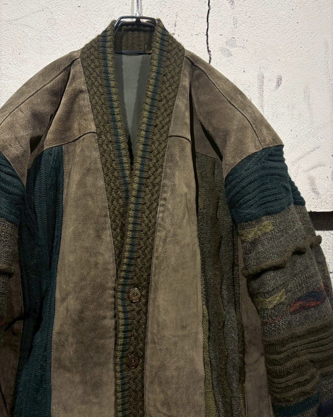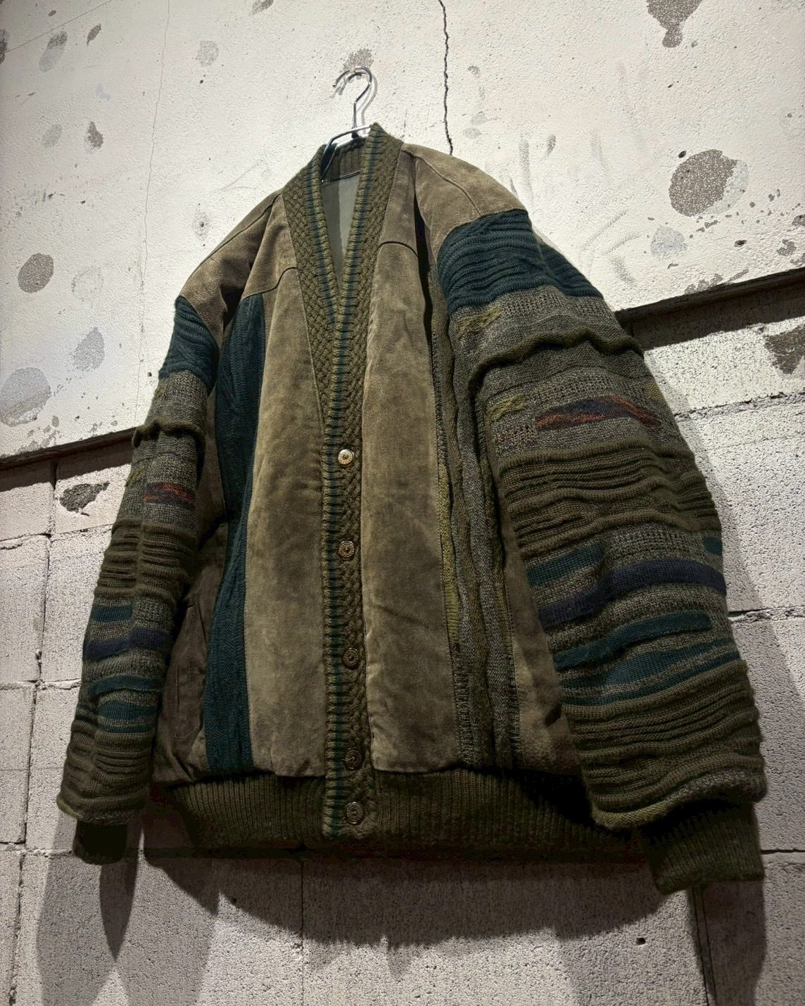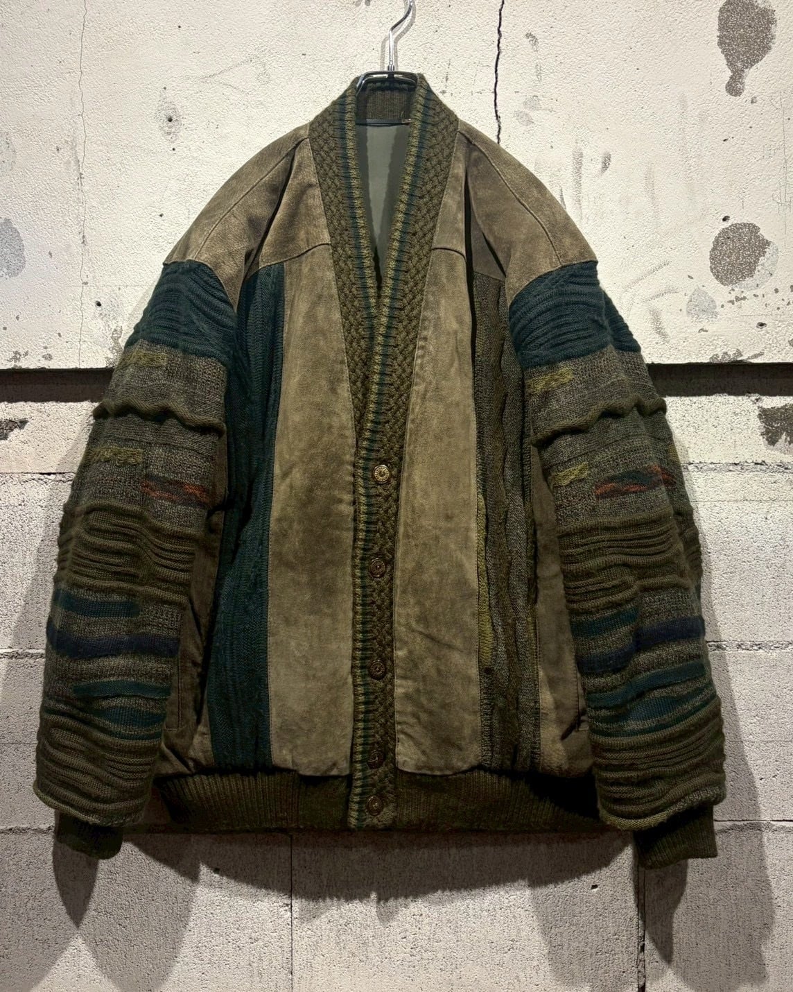 立体的に編み立てられた3Dニットのボディに、重厚なスエードレザーを大胆に施した80'sのカーディガンジャケット。