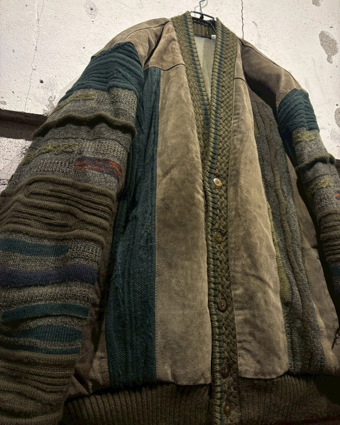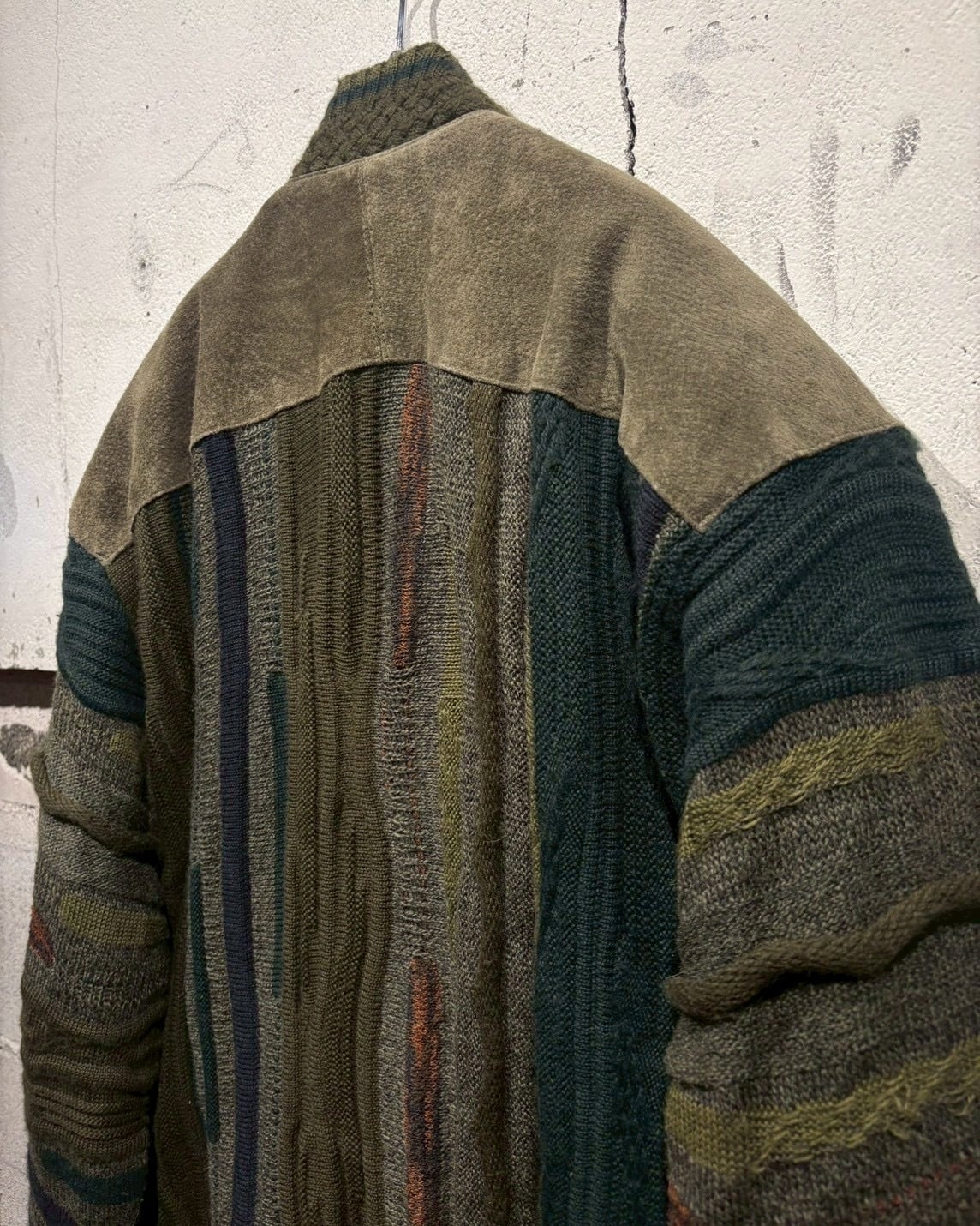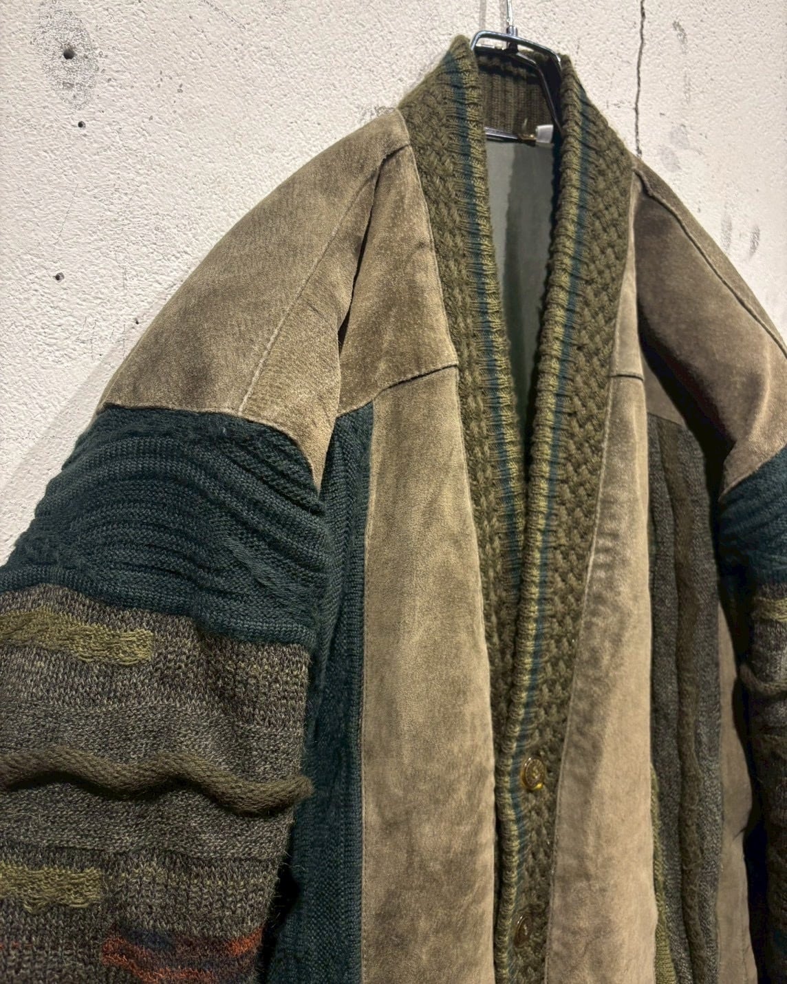 立体的に編み立てられた3Dニットのボディに、重厚なスエードレザーを大胆に施した80'sのカーディガンジャケット。