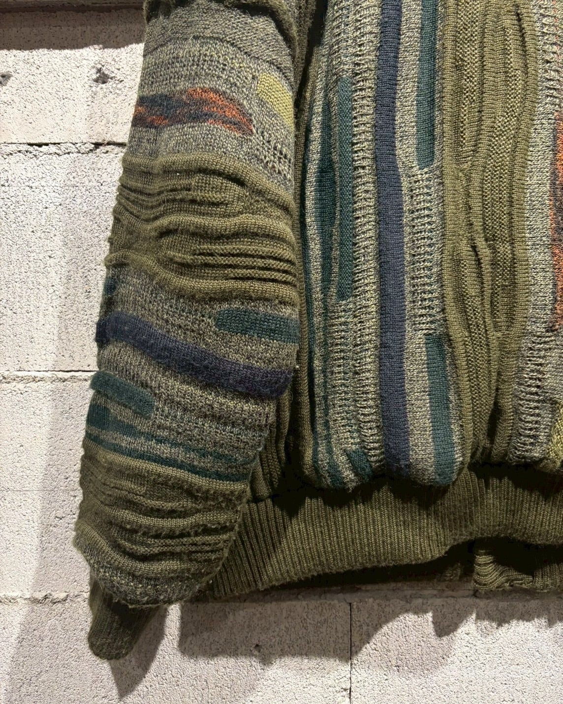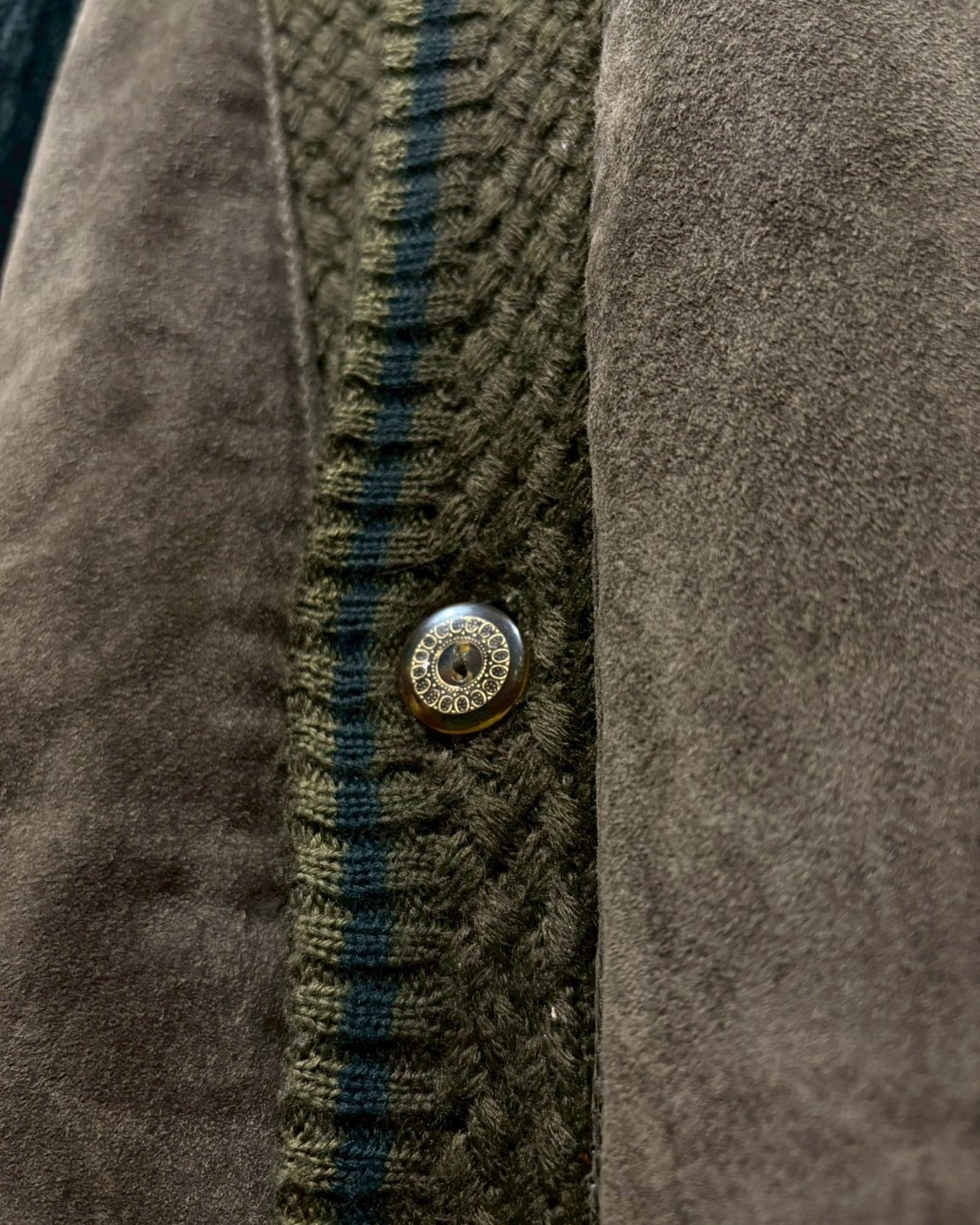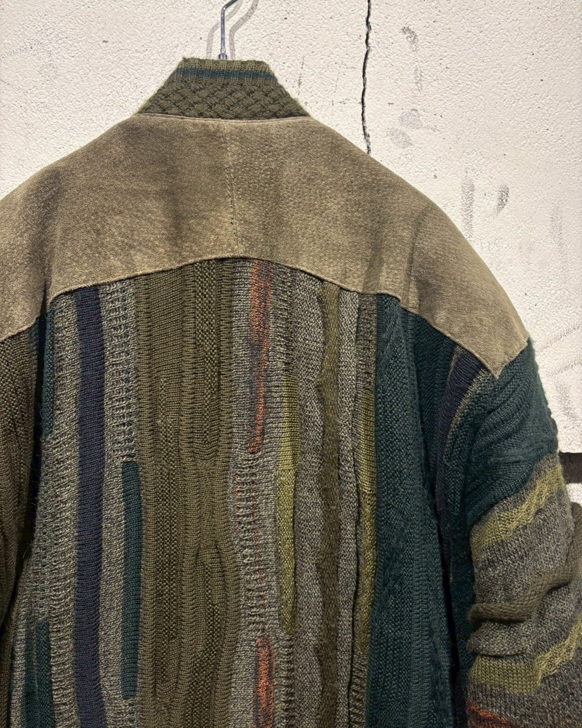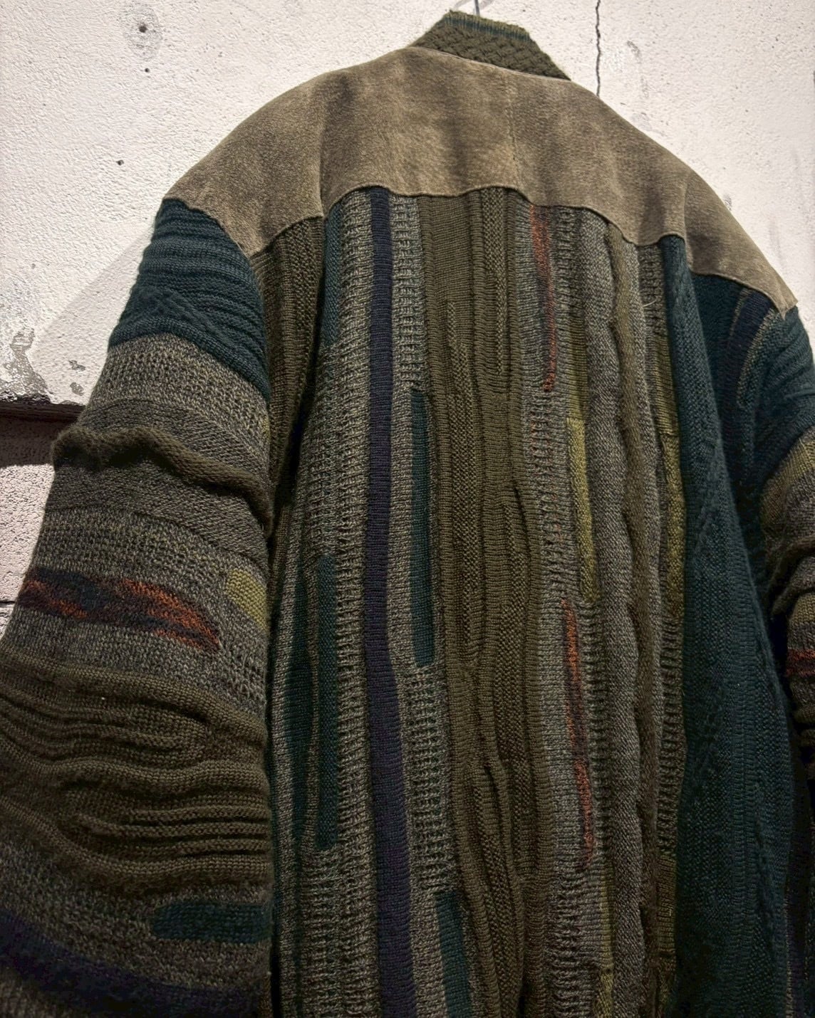 立体的に編み立てられた3Dニットのボディに、重厚なスエードレザーを大胆に施した80'sのカーディガンジャケット。