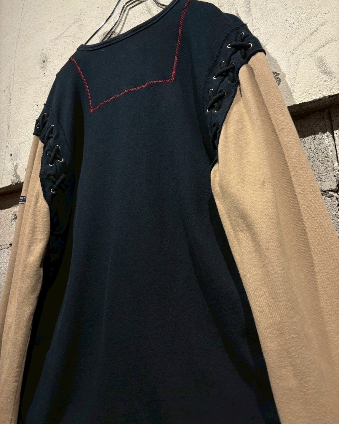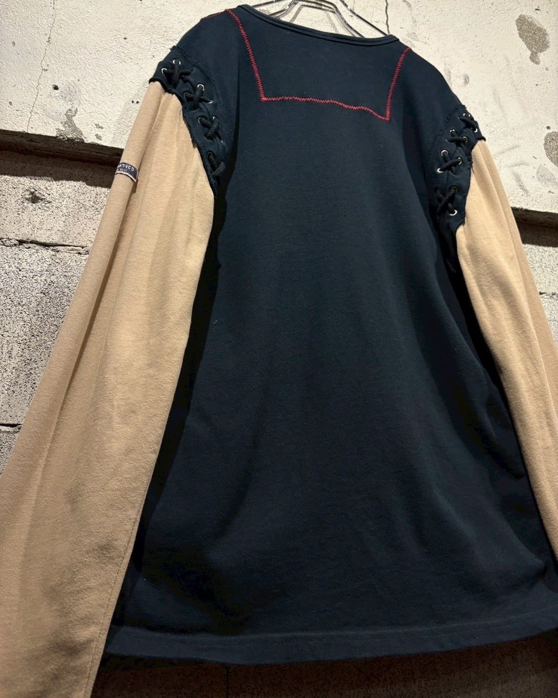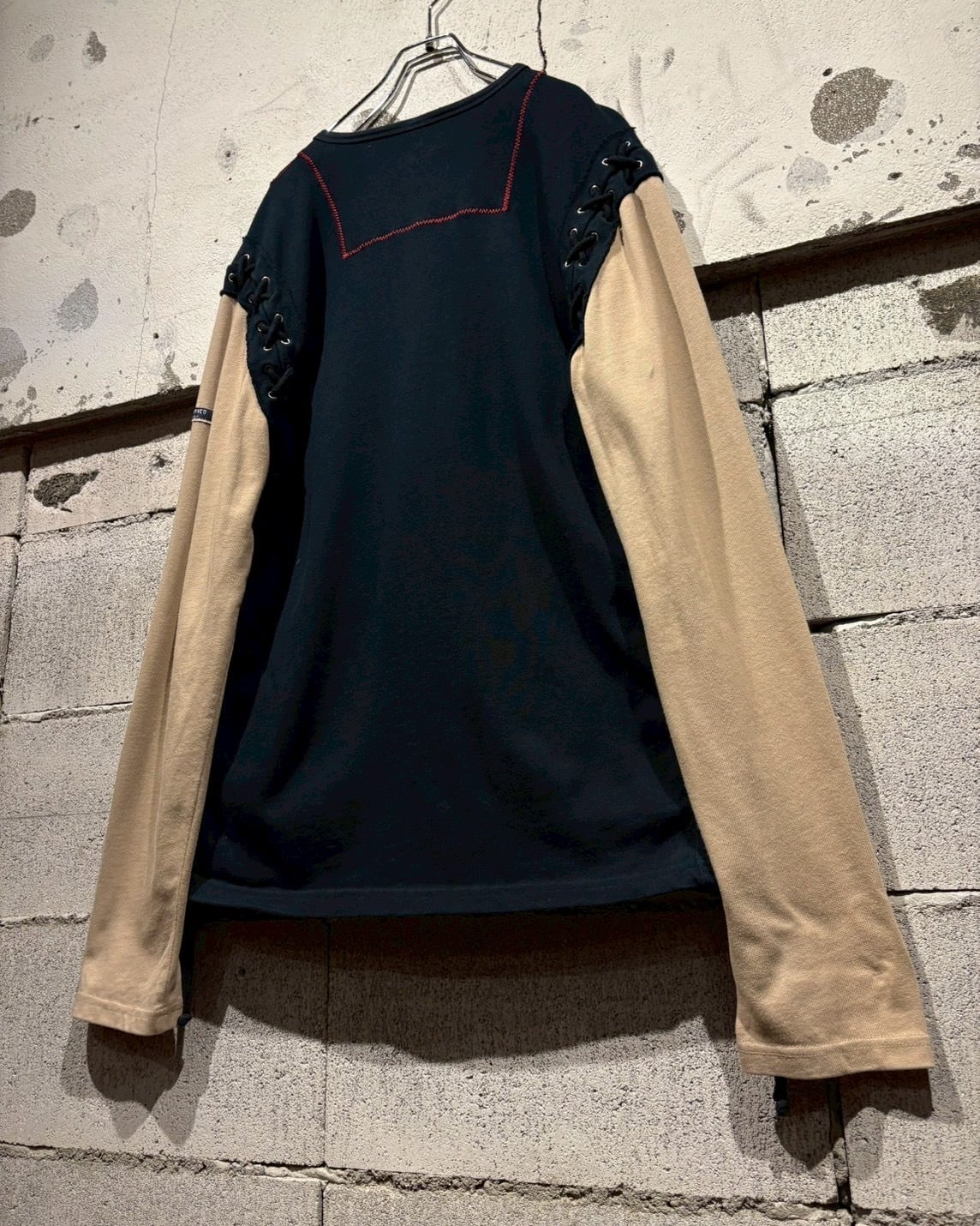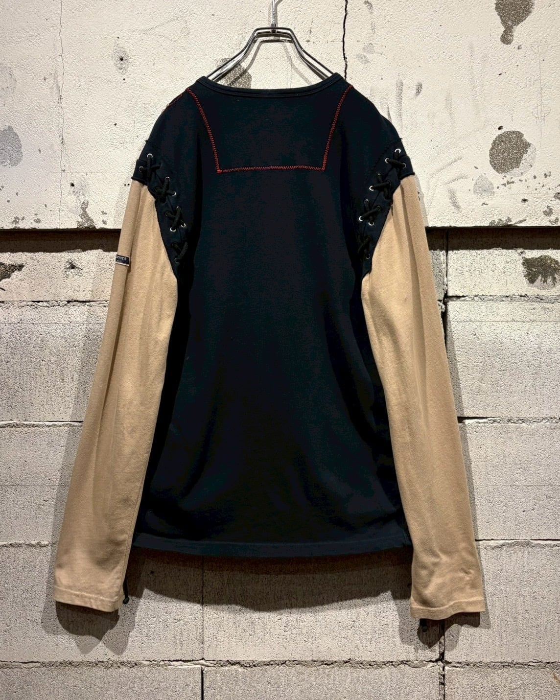 両袖はベージュで切り替えられたレイヤード仕様になっており、1枚で重ね着しているかのような奥行きを演出。サイドにはアイレット×レースアップのギミックを施し、シンプルなロンTの枠に収まらないエッジの効いた佇まいに仕上がっています。