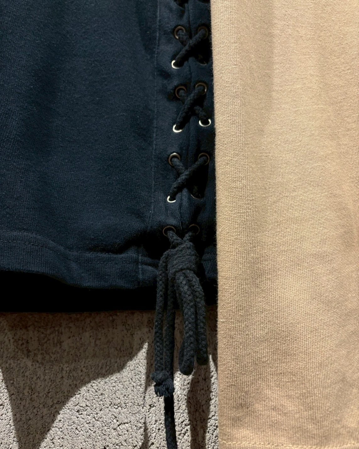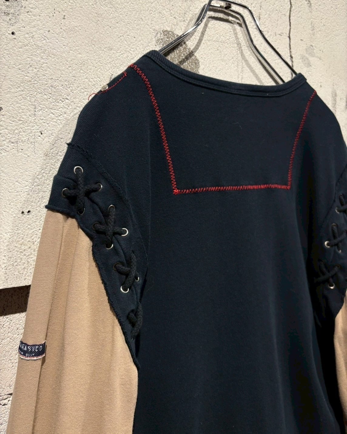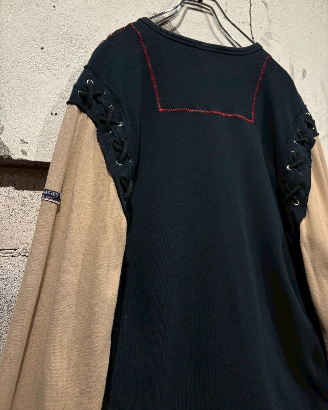 両袖はベージュで切り替えられたレイヤード仕様になっており、1枚で重ね着しているかのような奥行きを演出。サイドにはアイレット×レースアップのギミックを施し、シンプルなロンTの枠に収まらないエッジの効いた佇まいに仕上がっています。