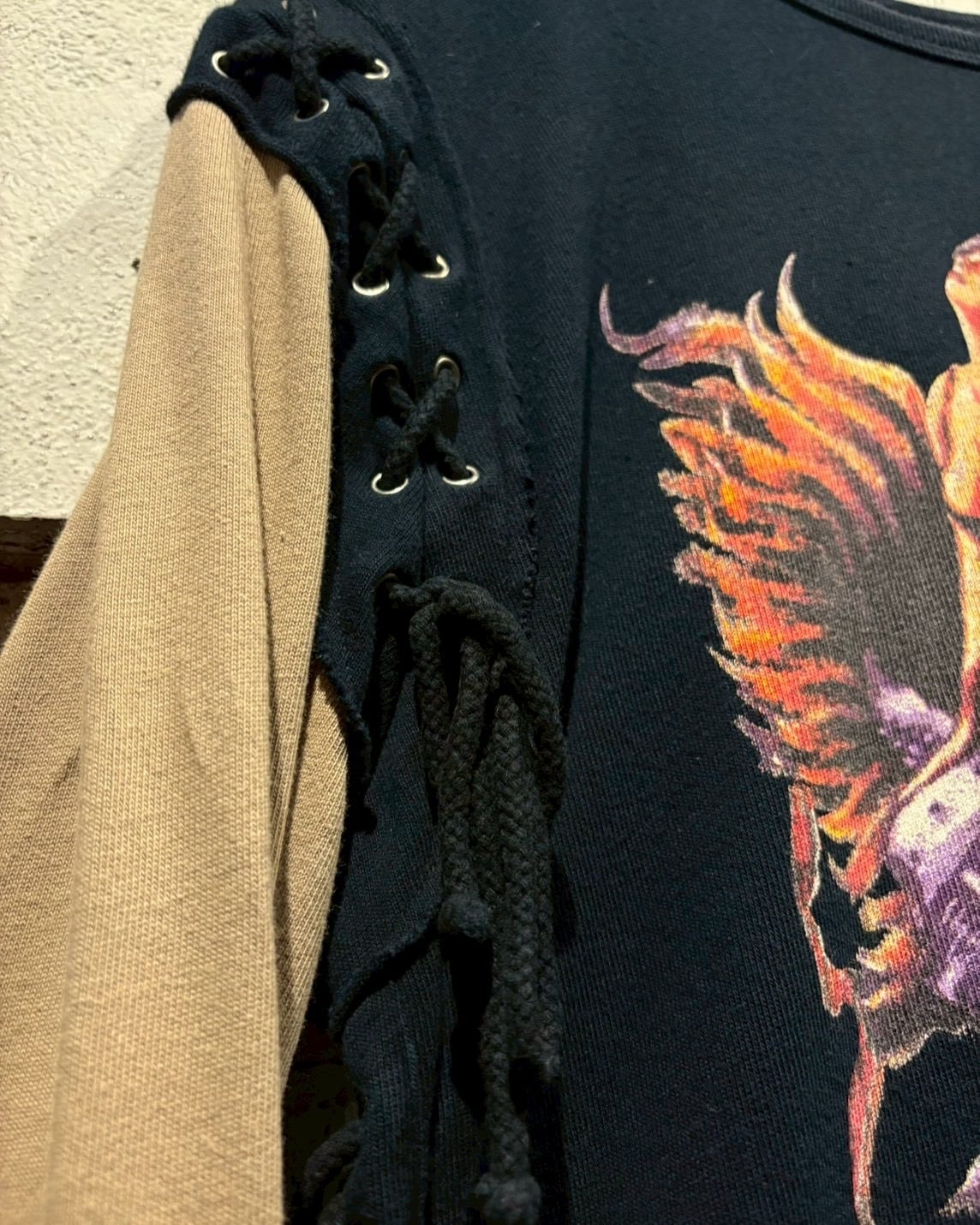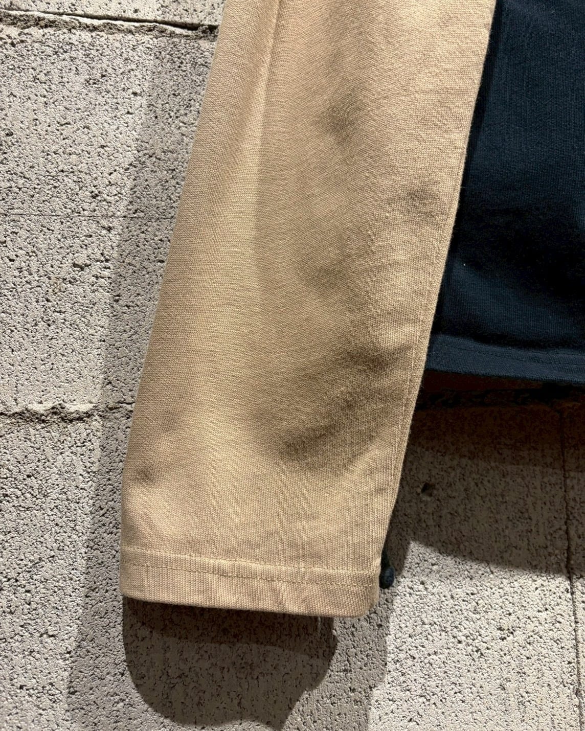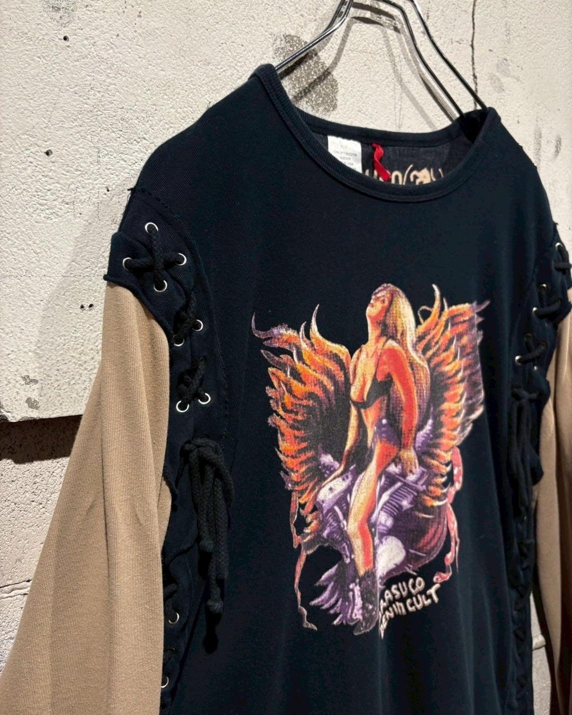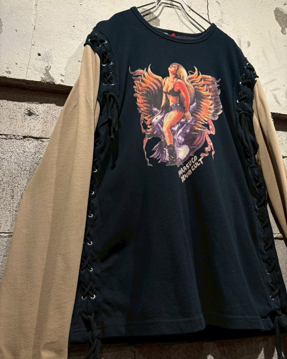 両袖はベージュで切り替えられたレイヤード仕様になっており、1枚で重ね着しているかのような奥行きを演出。サイドにはアイレット×レースアップのギミックを施し、シンプルなロンTの枠に収まらないエッジの効いた佇まいに仕上がっています。