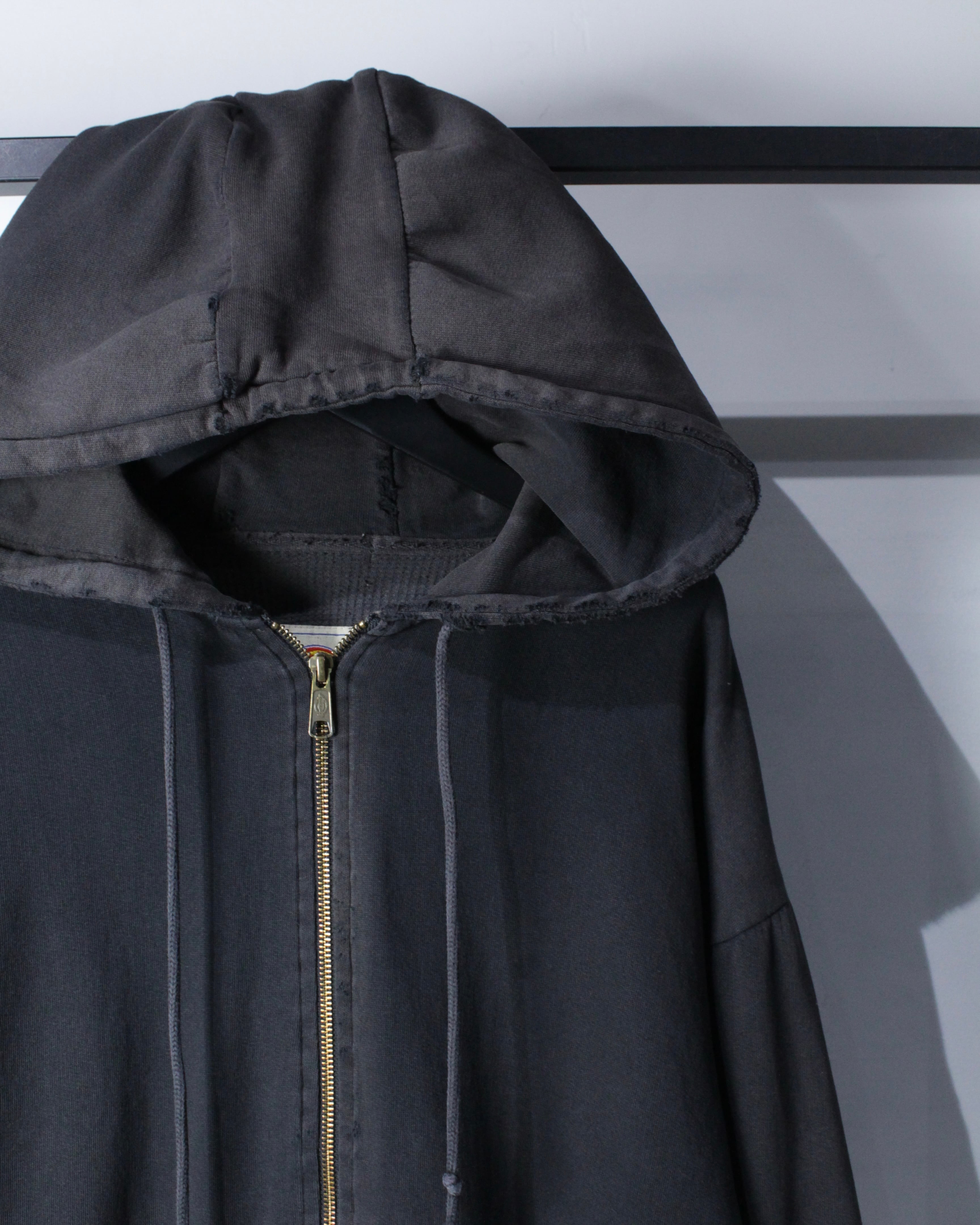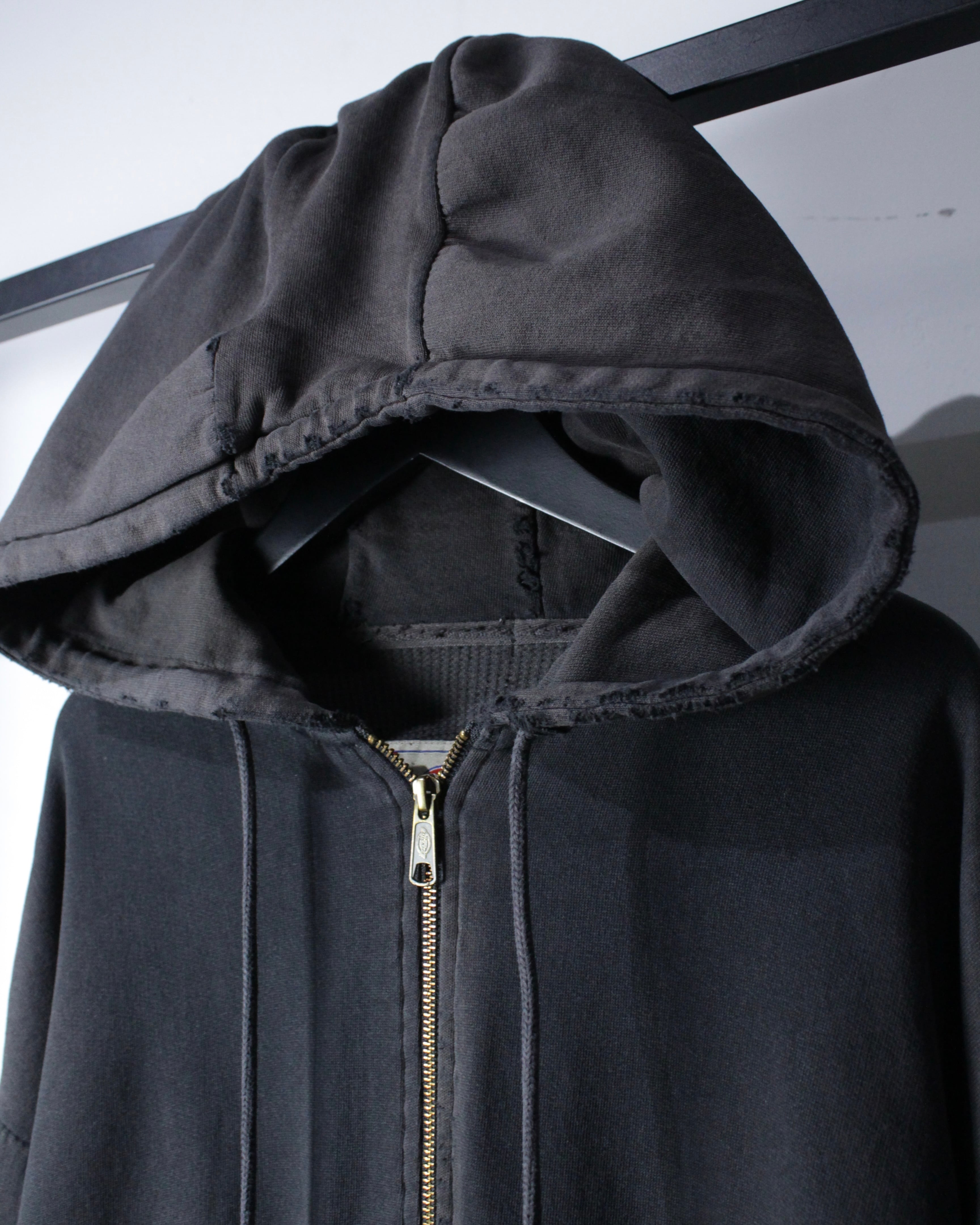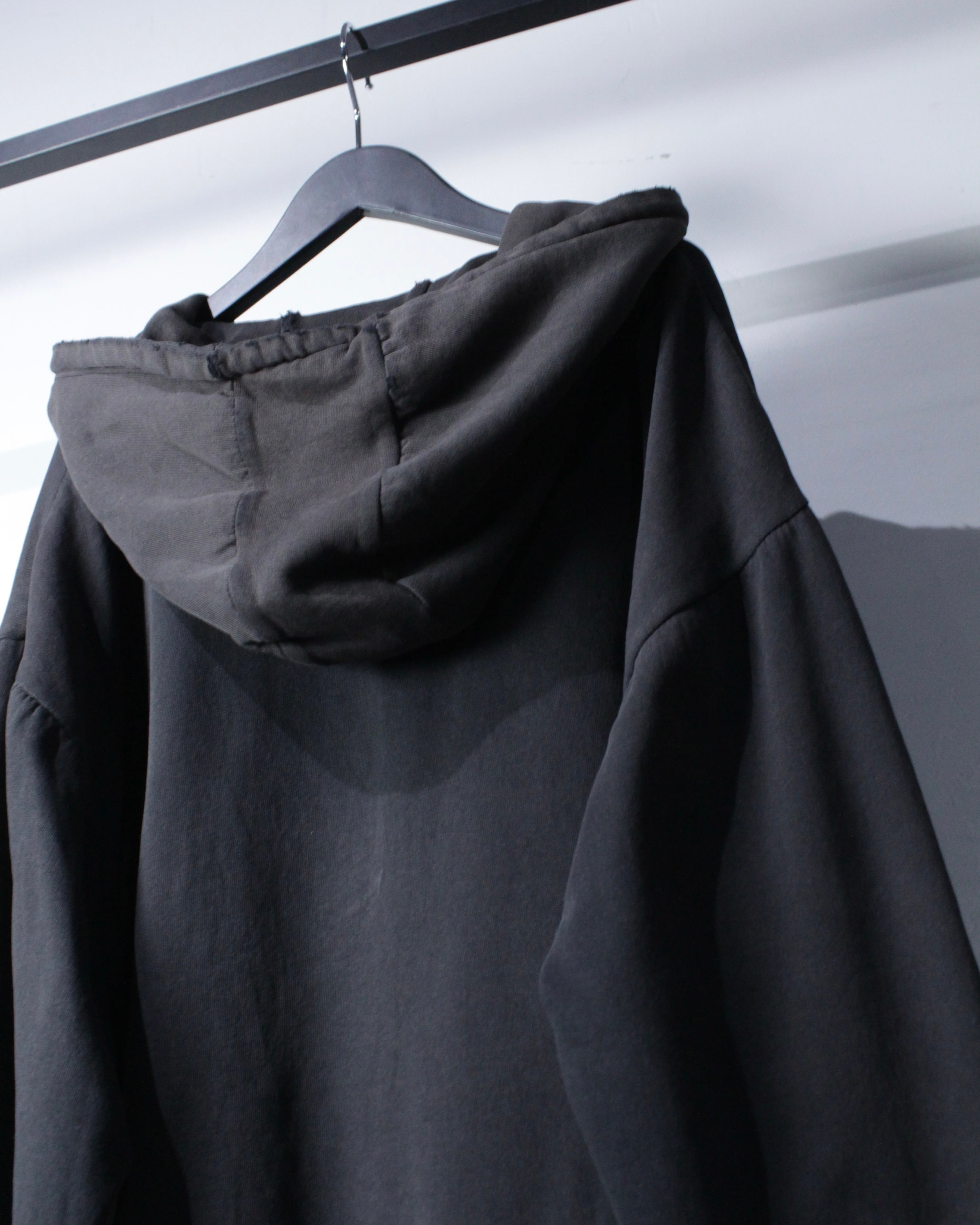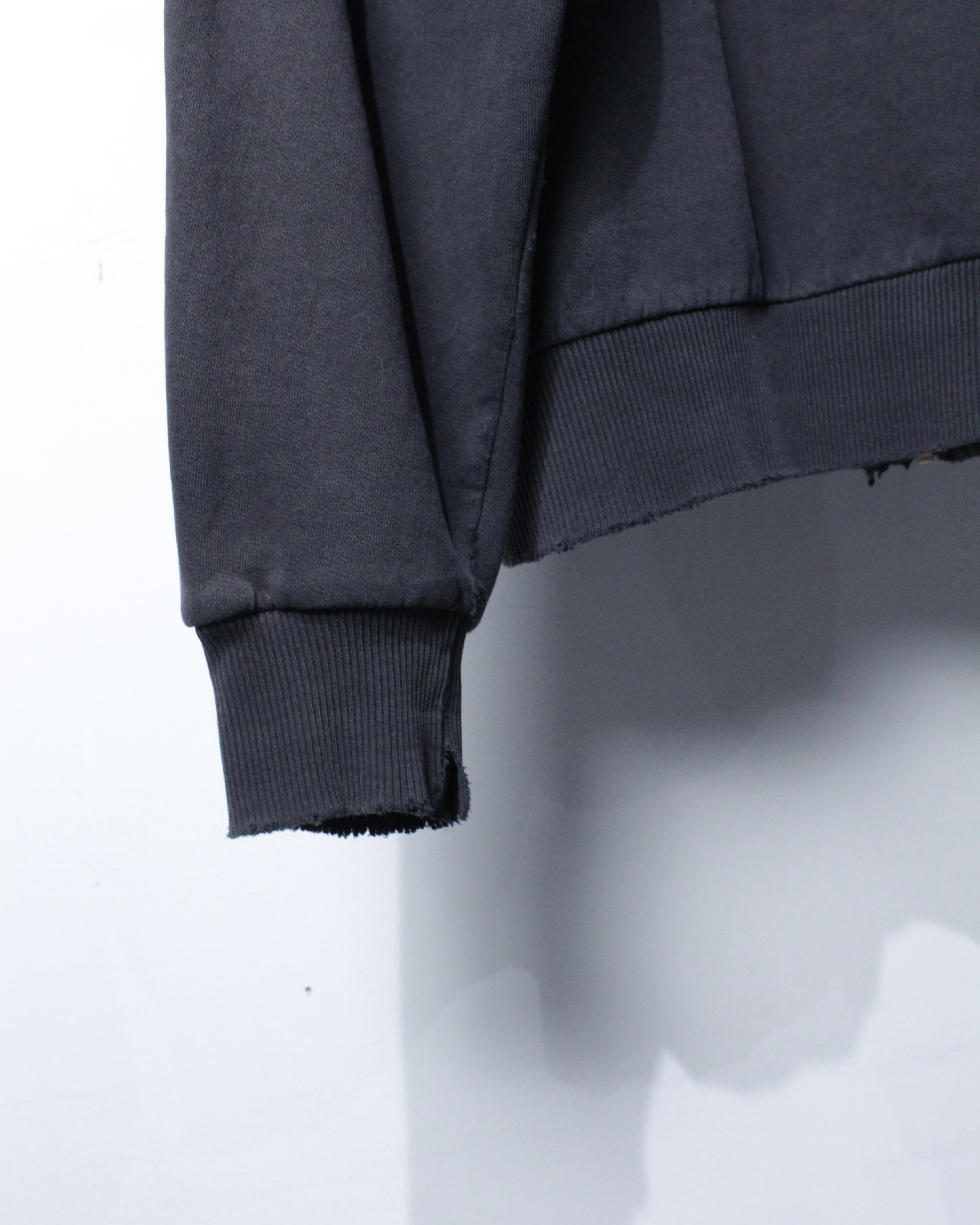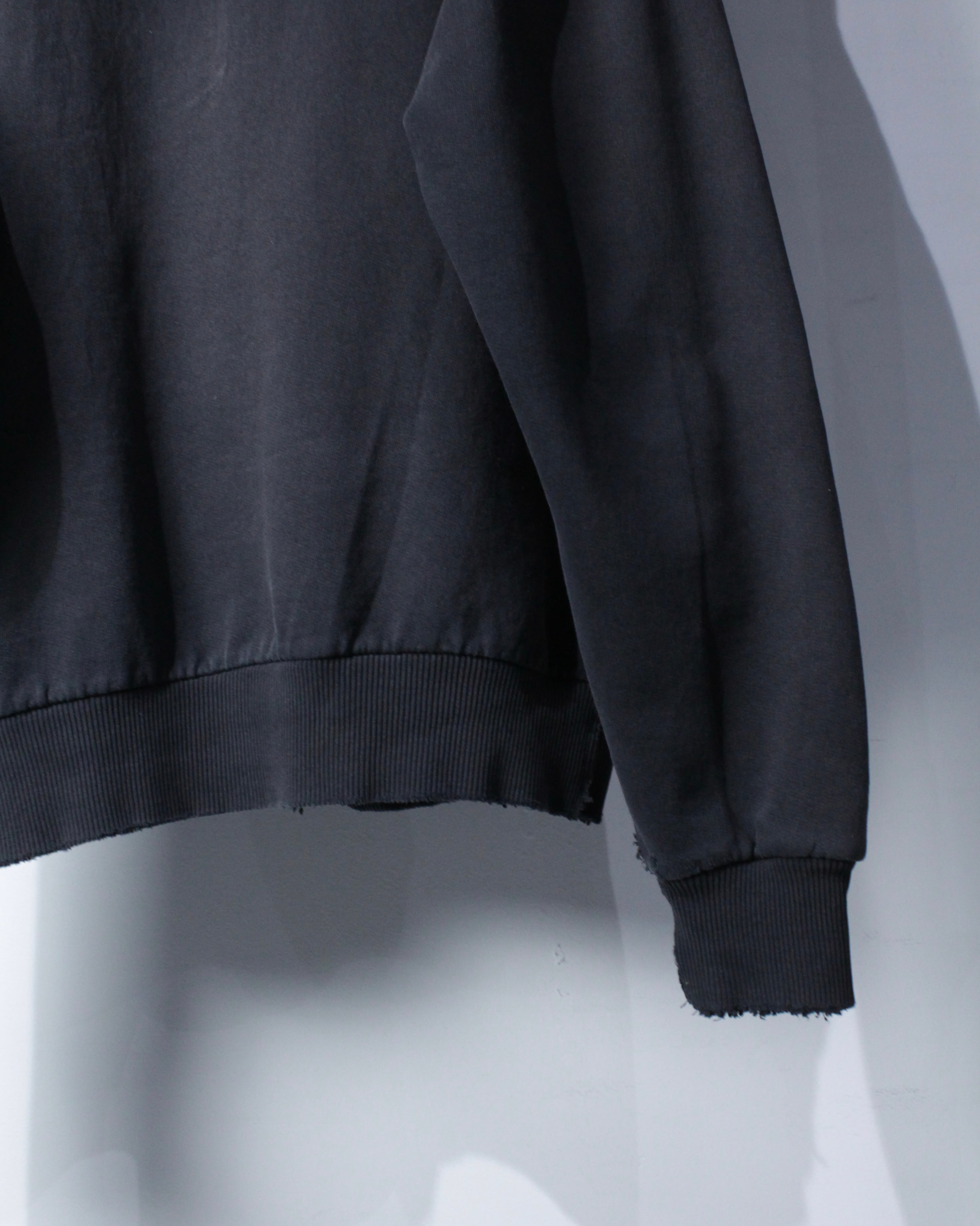 タフなコットンスウェットをベースに、長年の着用によって生まれたサンフェードの墨黒カラー。均一ではない色落ちが奥行きを生み、退廃的な表情に仕上がっています。