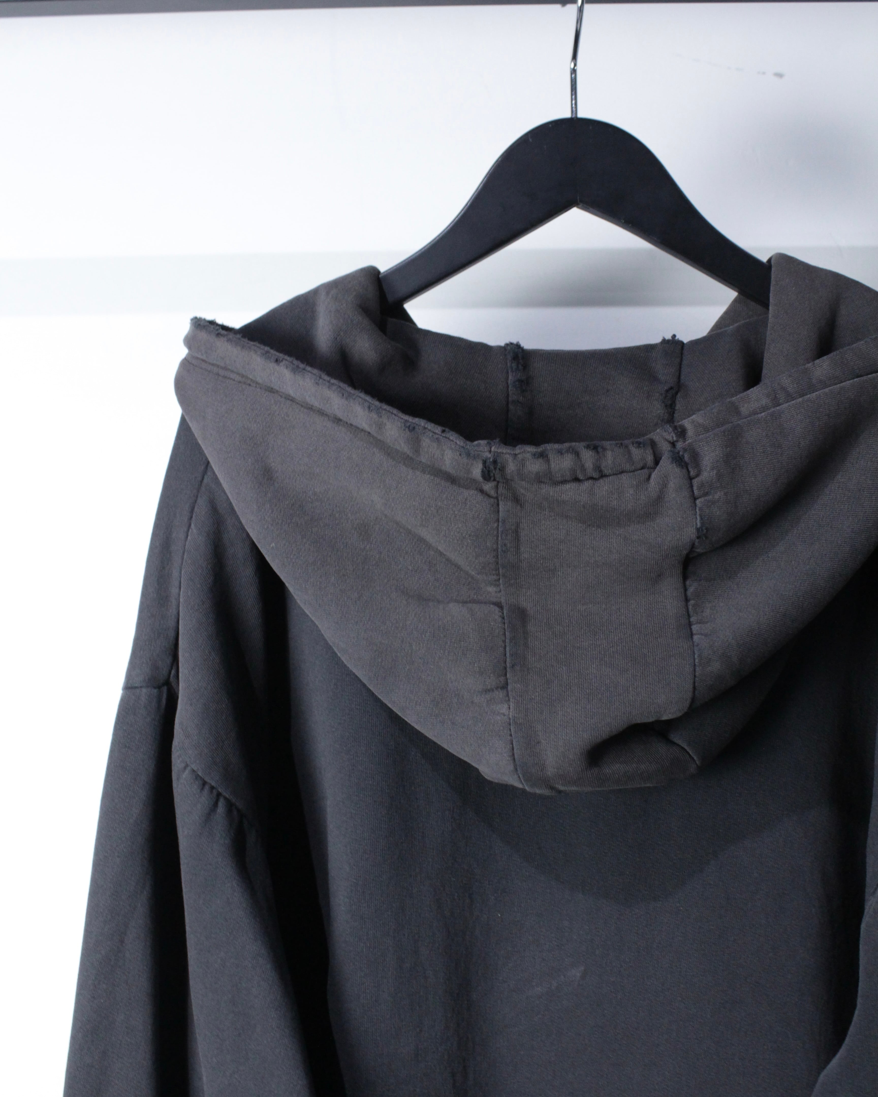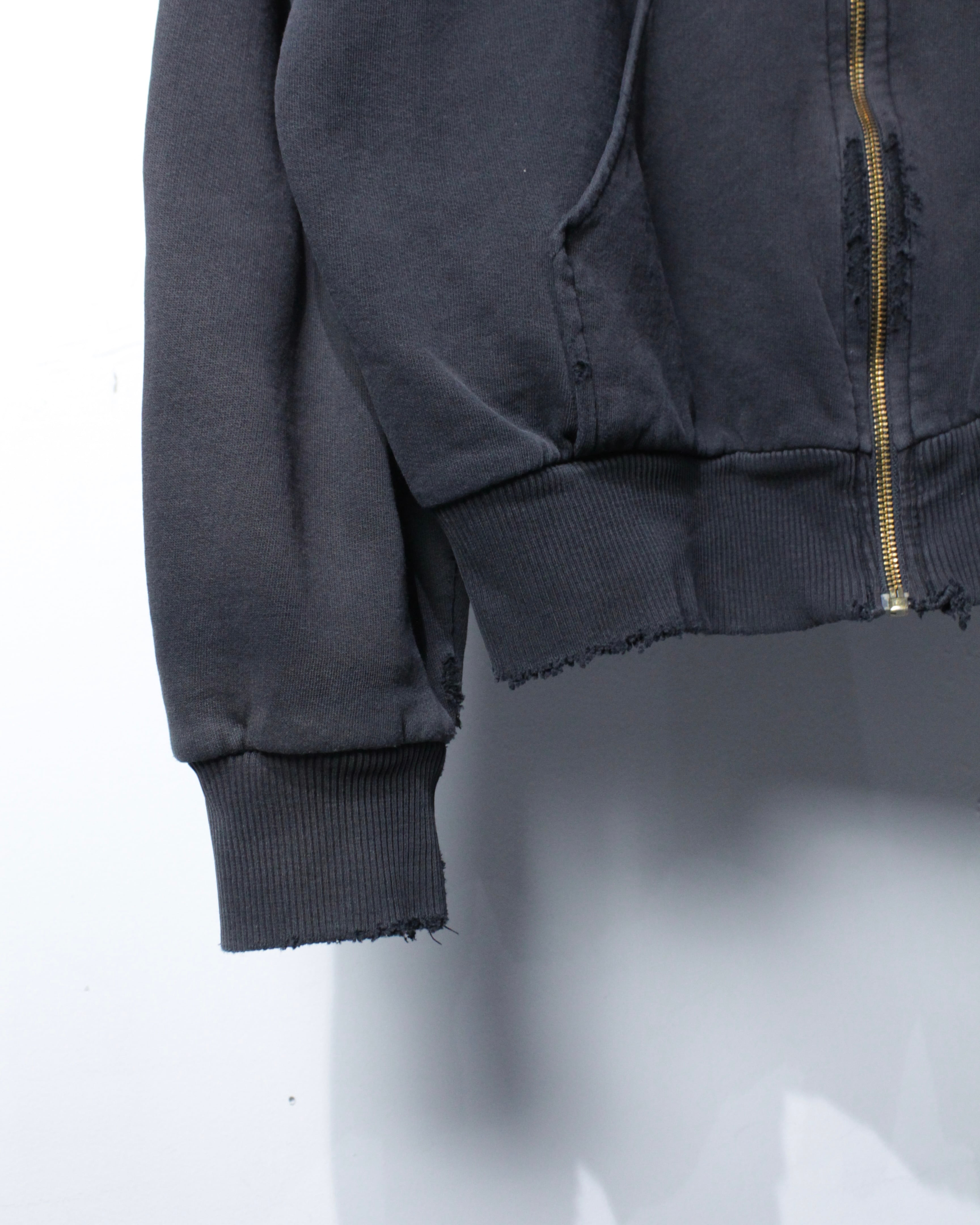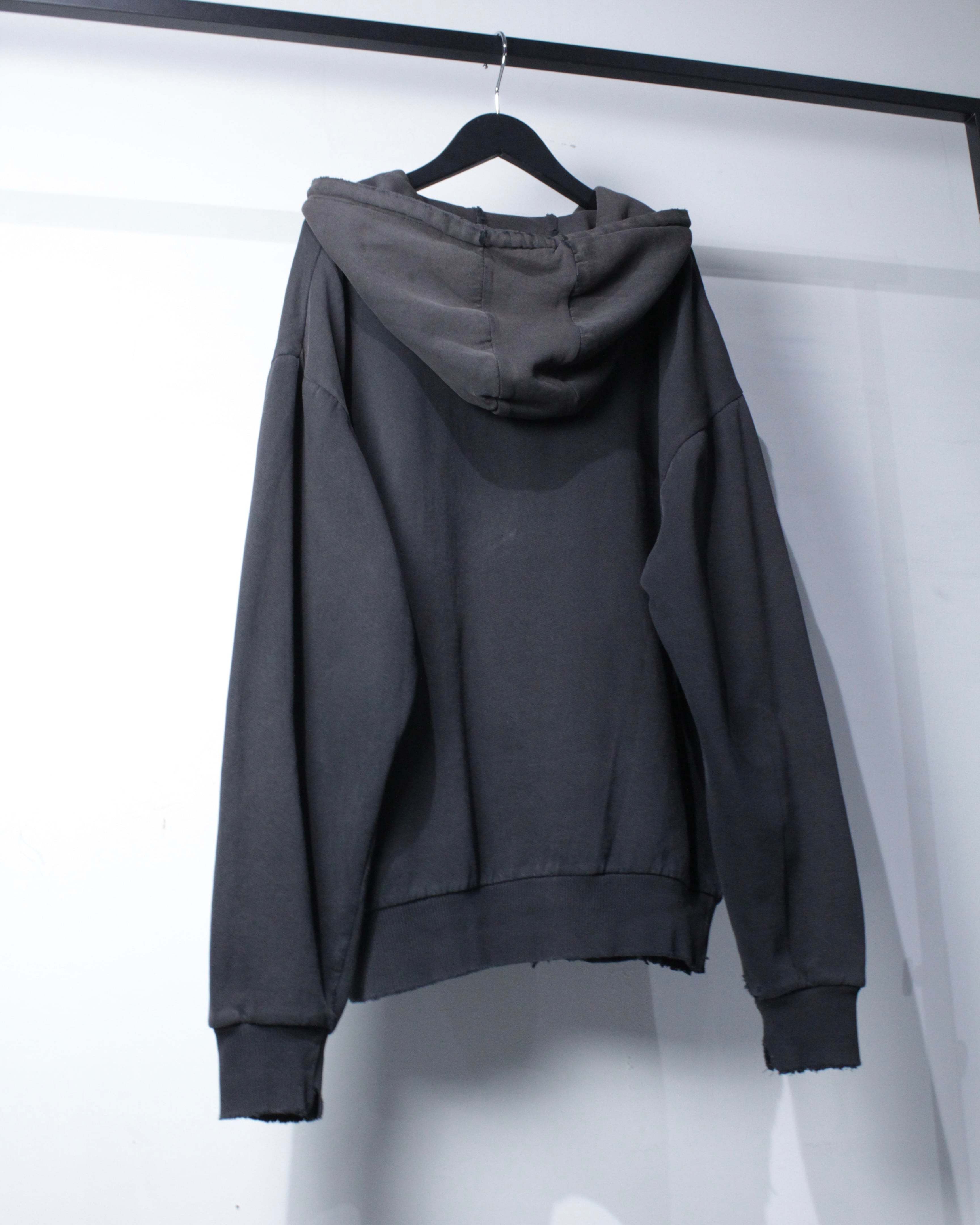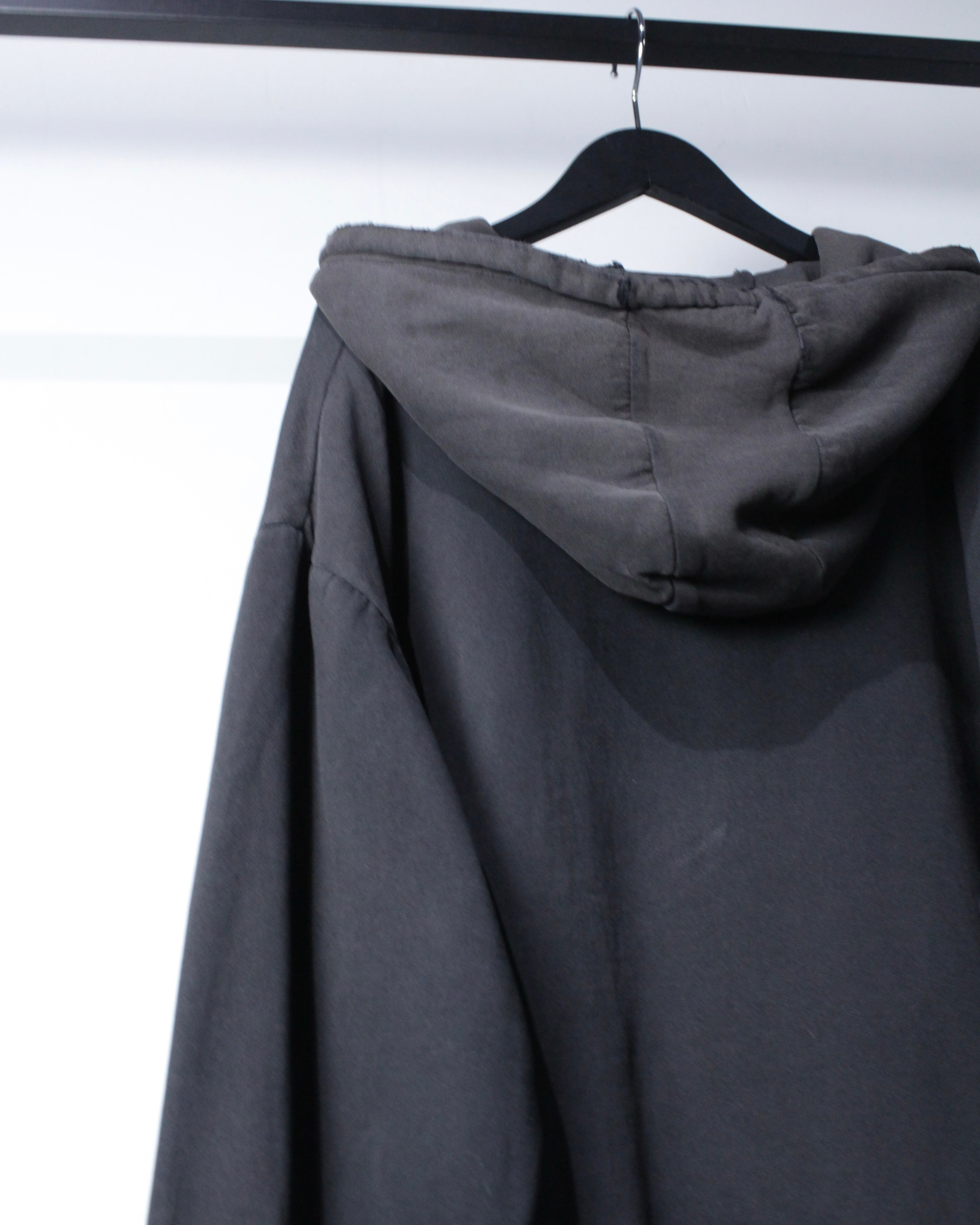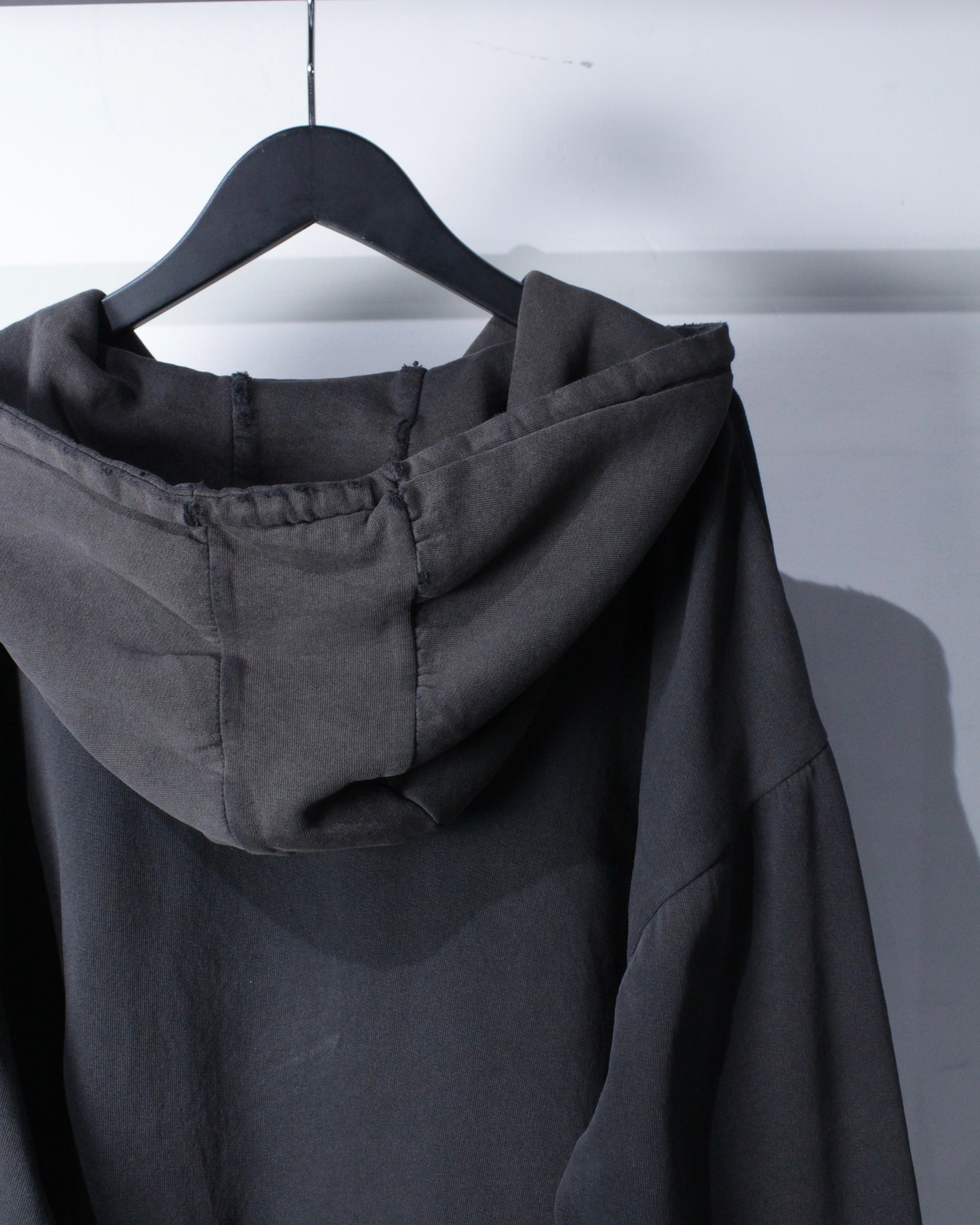 タフなコットンスウェットをベースに、長年の着用によって生まれたサンフェードの墨黒カラー。均一ではない色落ちが奥行きを生み、退廃的な表情に仕上がっています。