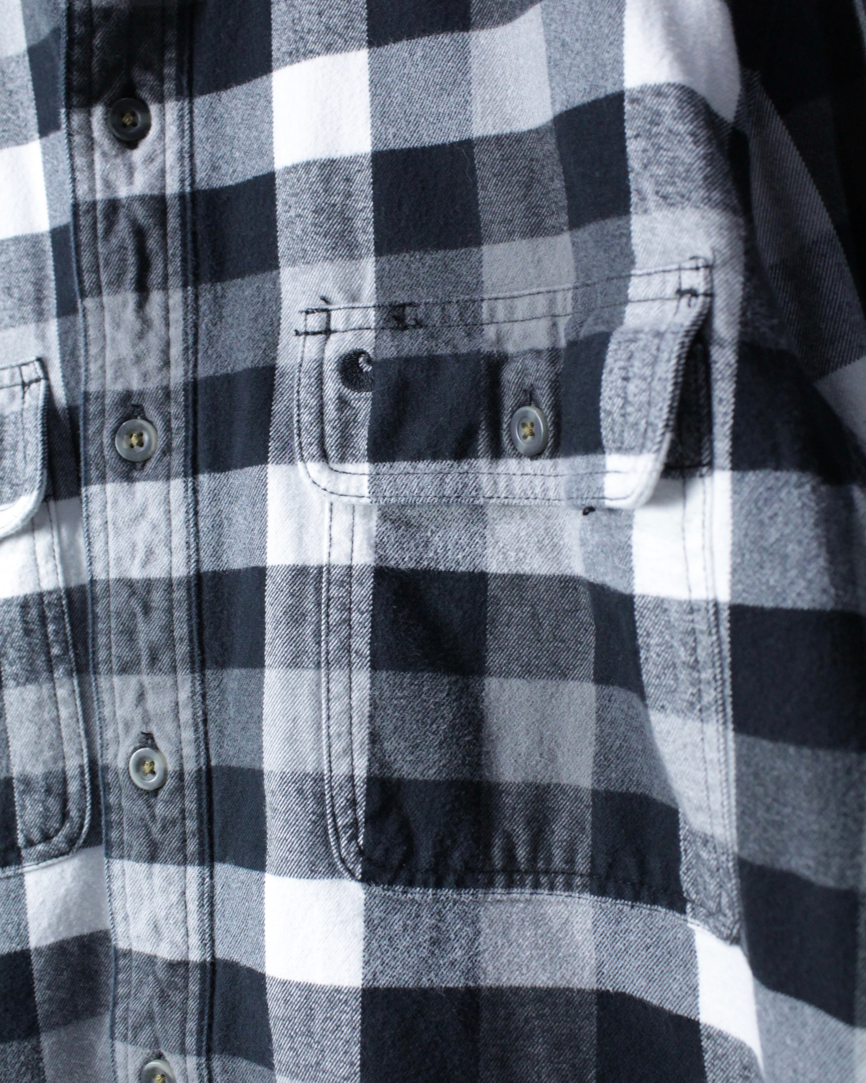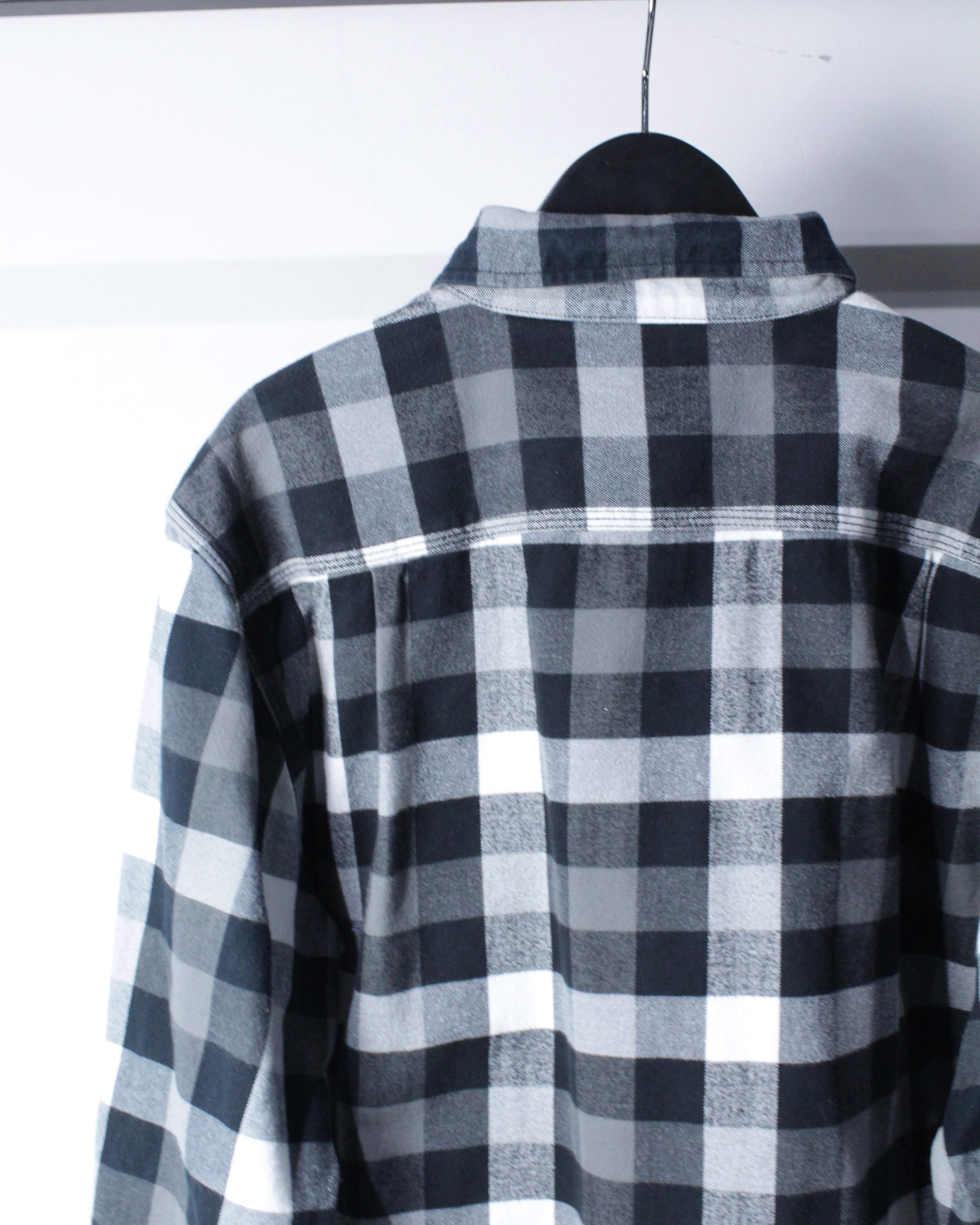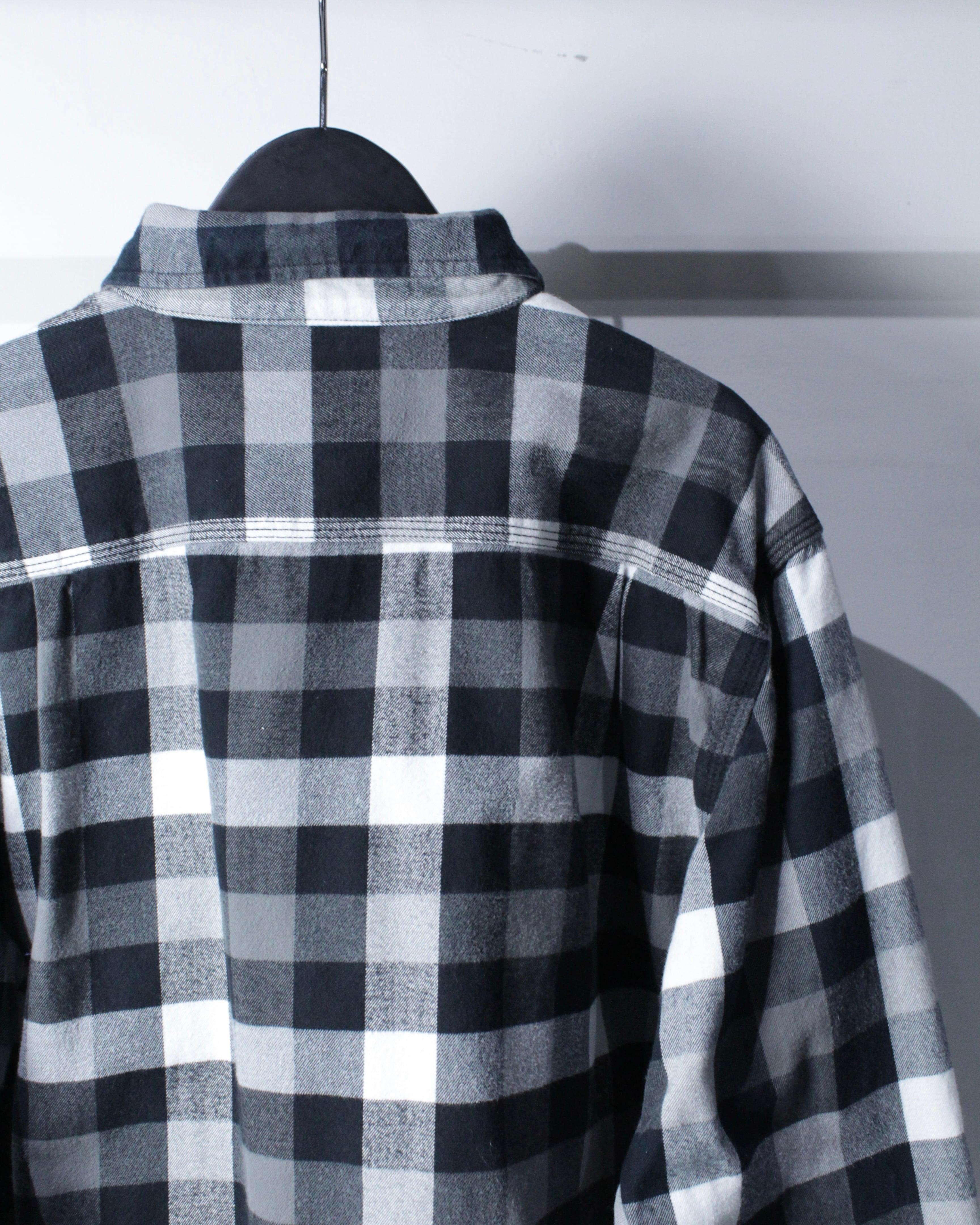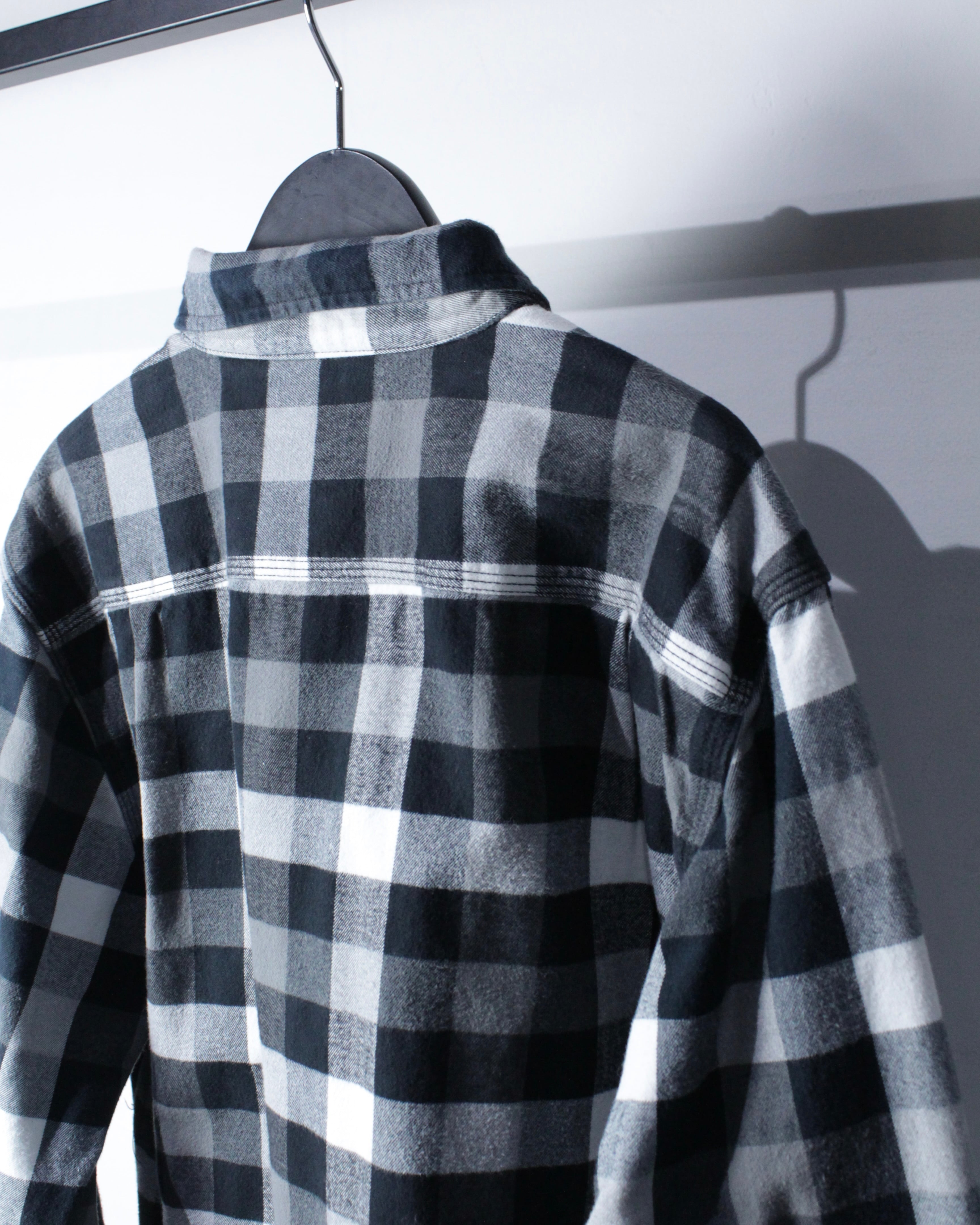 肉厚でタフなコットンフランネルを採用し、起毛感のある生地が柔らかさと保温性を両立。ブラック×ホワイトのモノトーンチェックは、ワークの力強さを残しながらも洗練された印象へと昇華されています。
