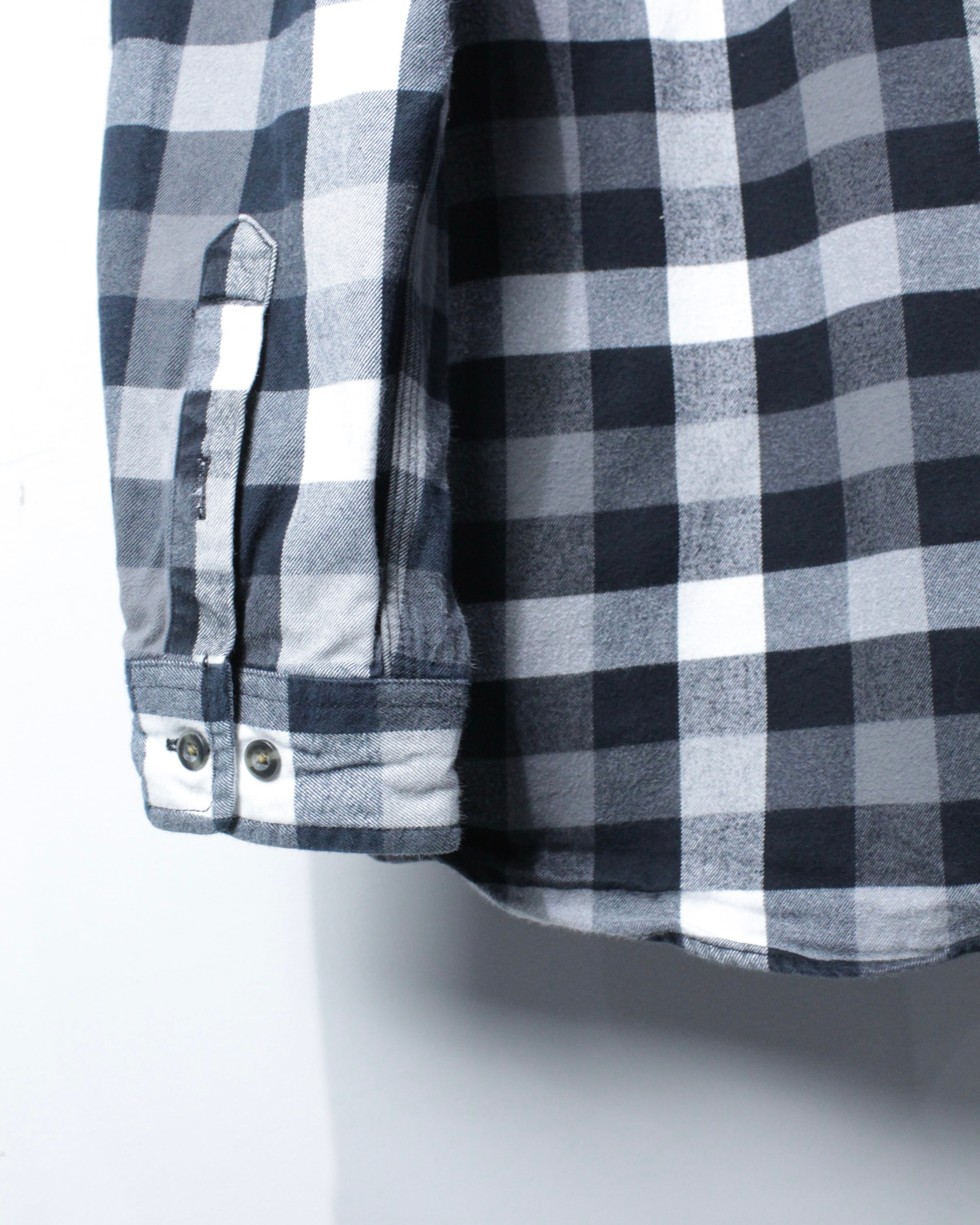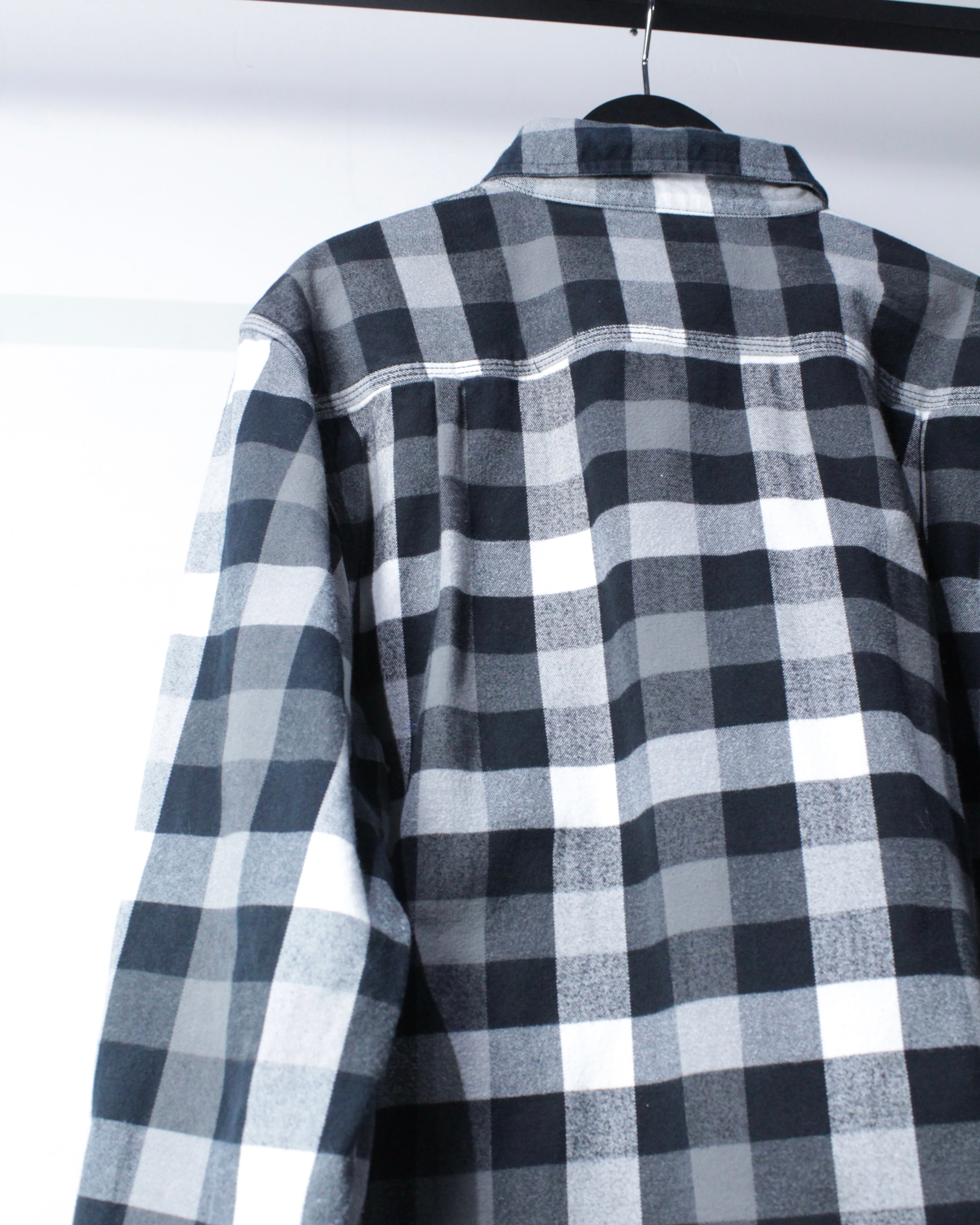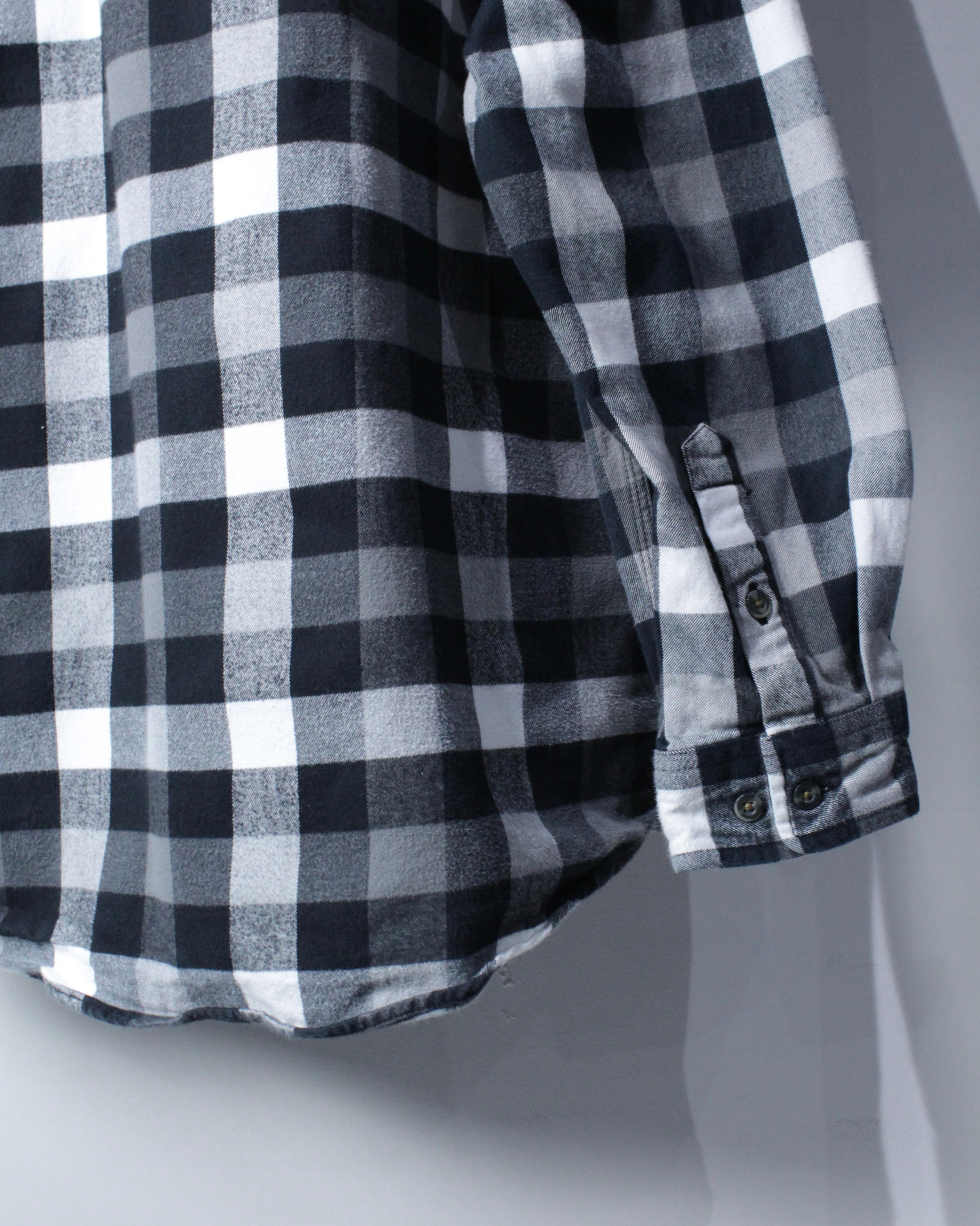 肉厚でタフなコットンフランネルを採用し、起毛感のある生地が柔らかさと保温性を両立。ブラック×ホワイトのモノトーンチェックは、ワークの力強さを残しながらも洗練された印象へと昇華されています。