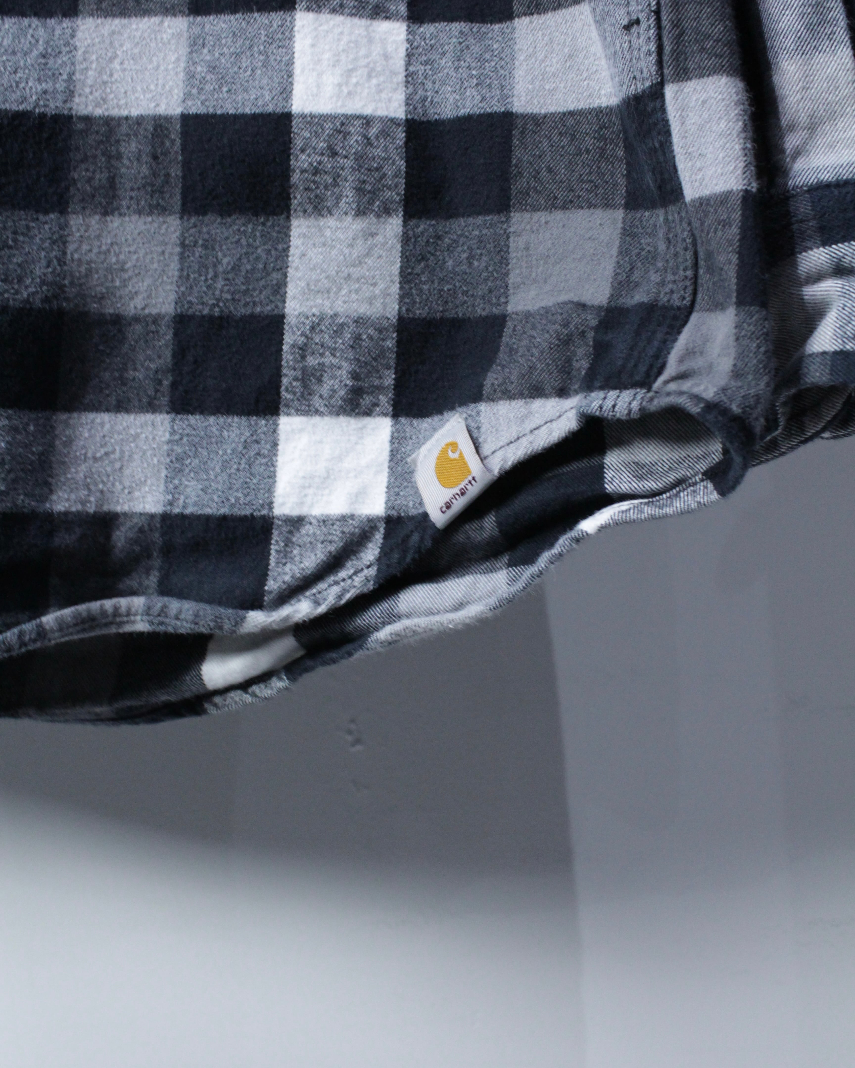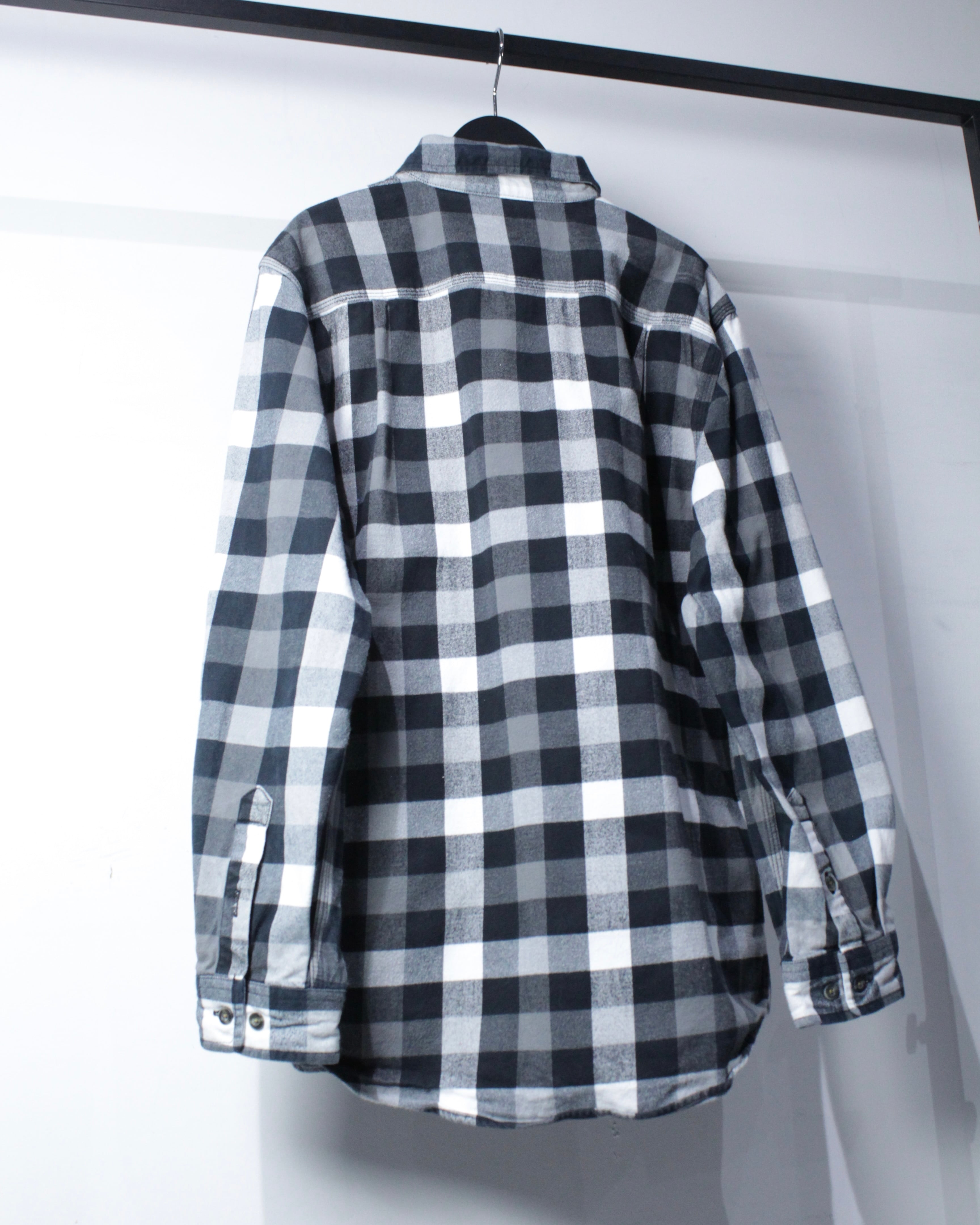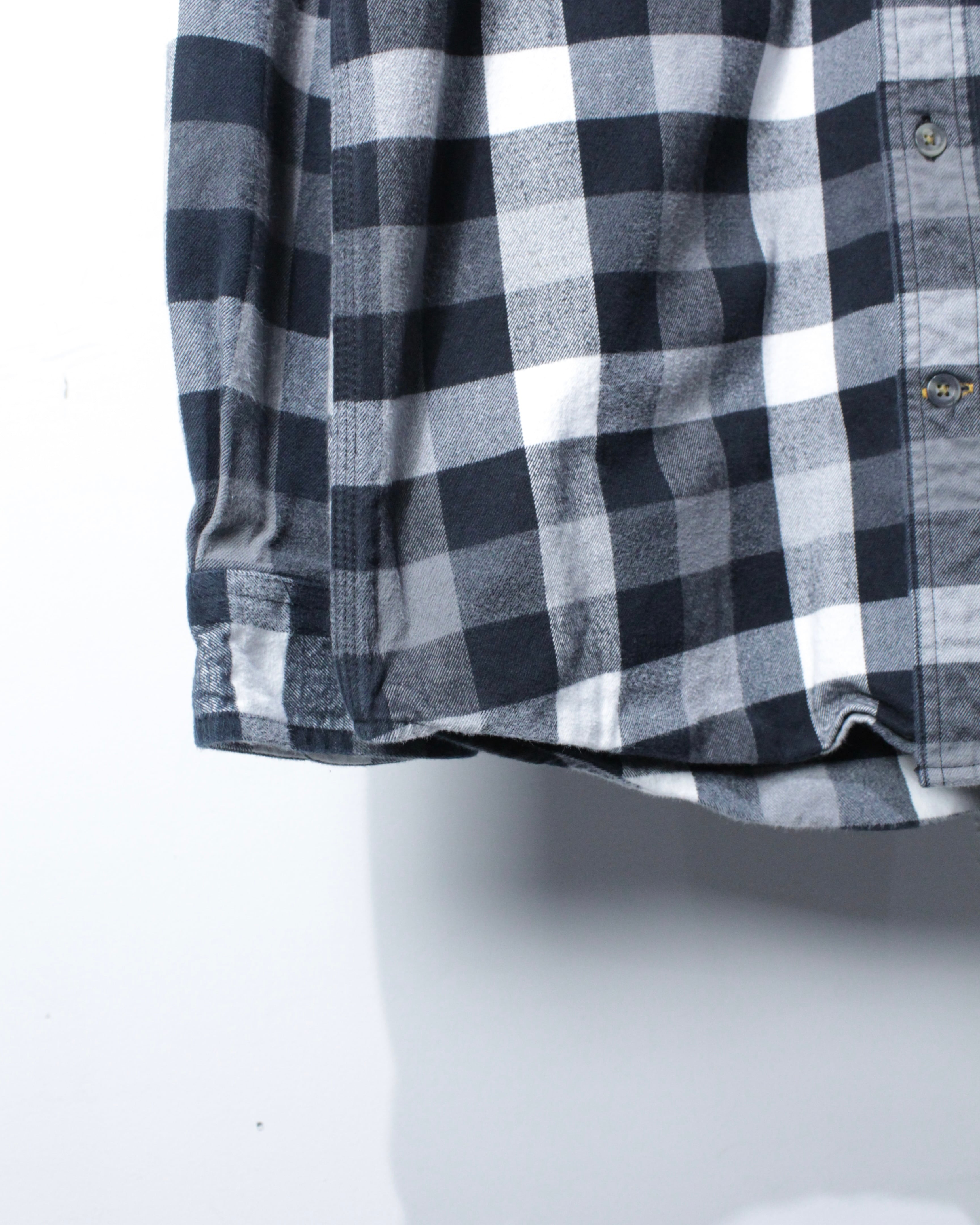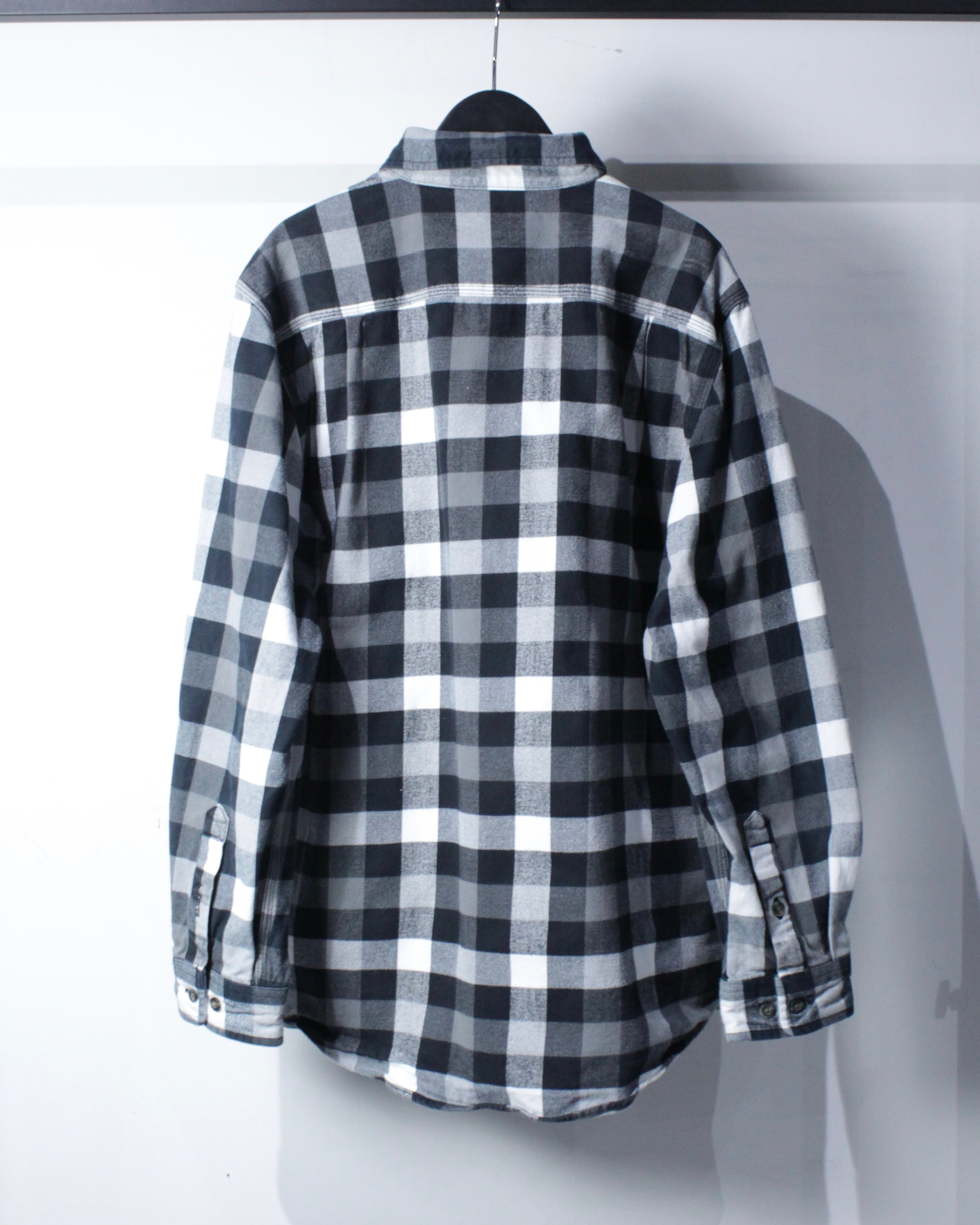 肉厚でタフなコットンフランネルを採用し、起毛感のある生地が柔らかさと保温性を両立。ブラック×ホワイトのモノトーンチェックは、ワークの力強さを残しながらも洗練された印象へと昇華されています。