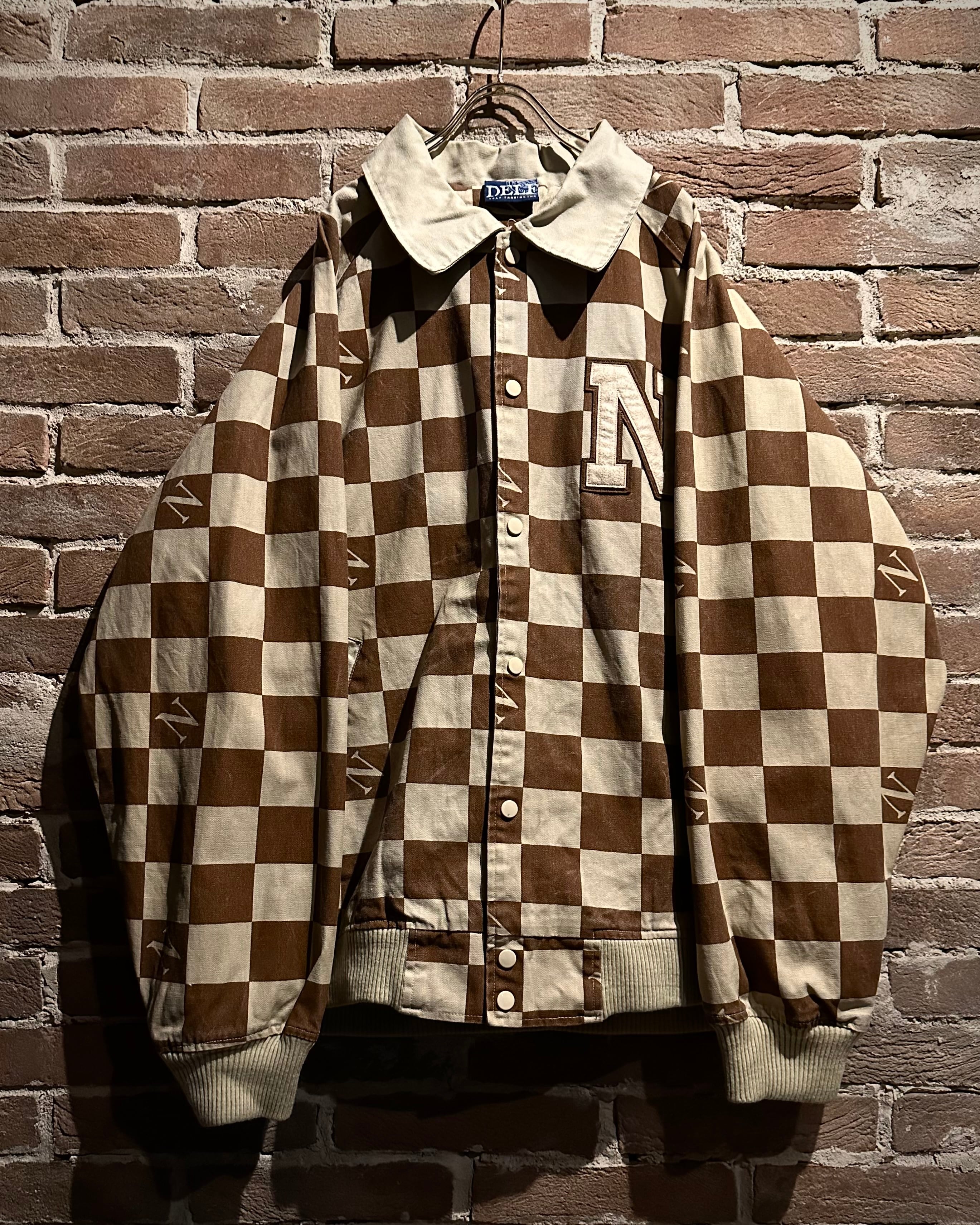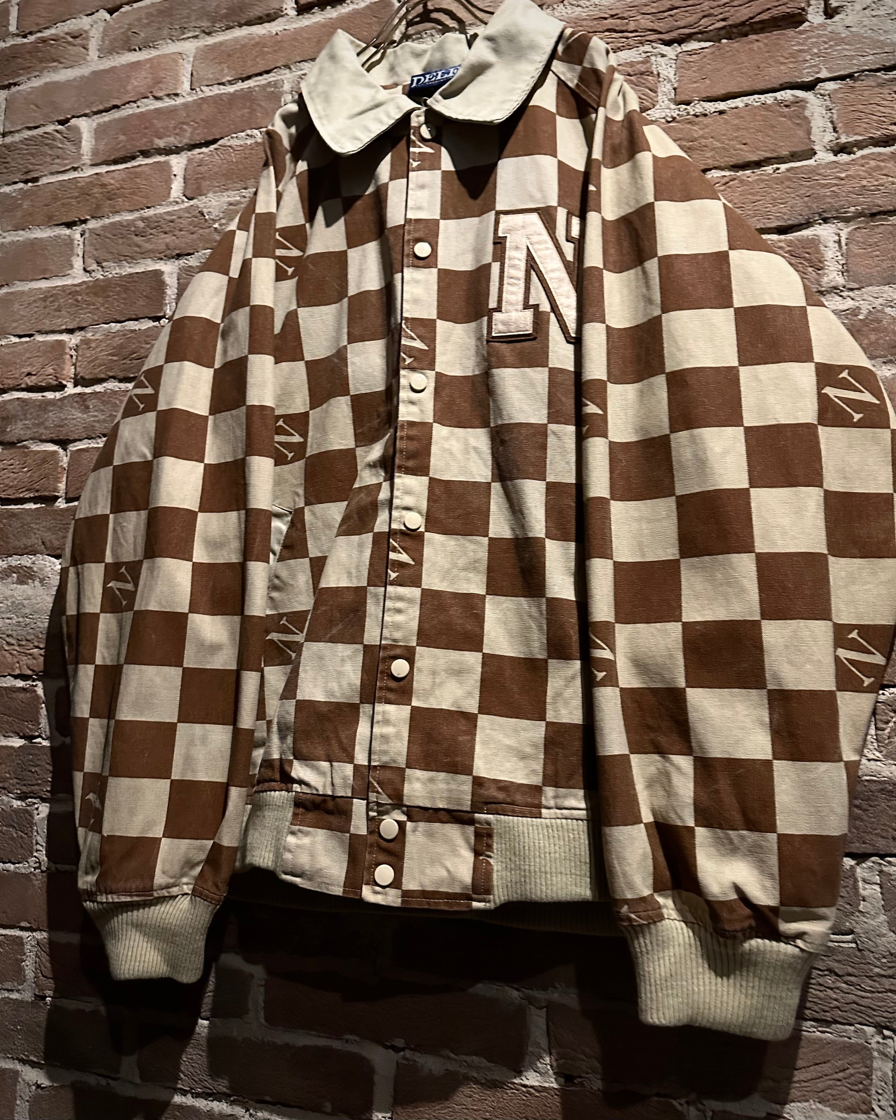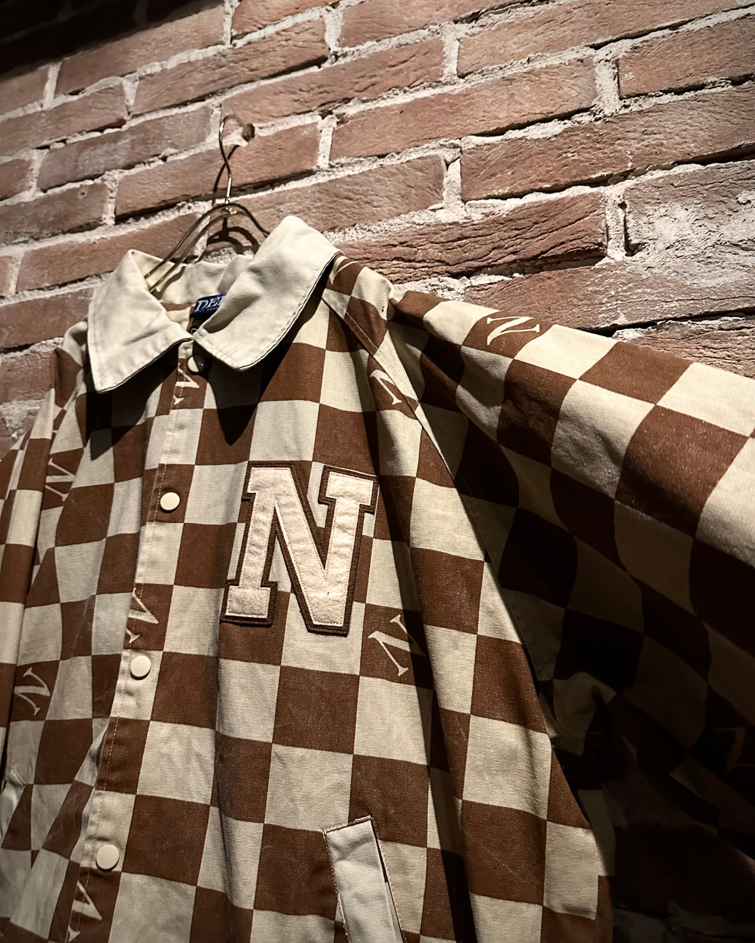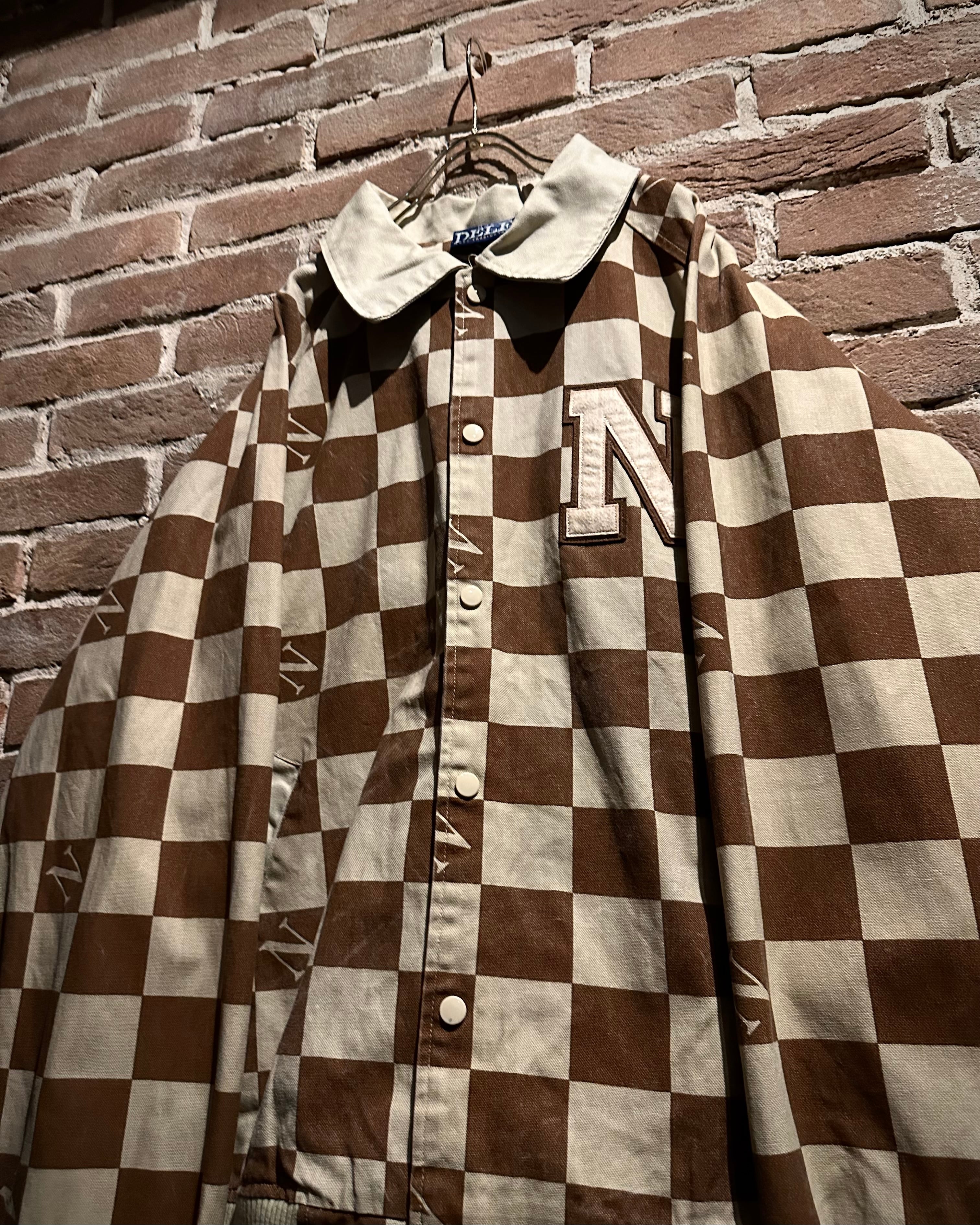 ブラウン×ベージュの落ち着いた配色は、主張がありながらも上品な印象。左胸にはロゴワッペンを施し、どこかスタジャンライクなムードをプラスしています。総柄でありながらバランスの取れたデザインで、ストリートとラグジュアリーの要素が絶妙にミックスされた仕上がりに。