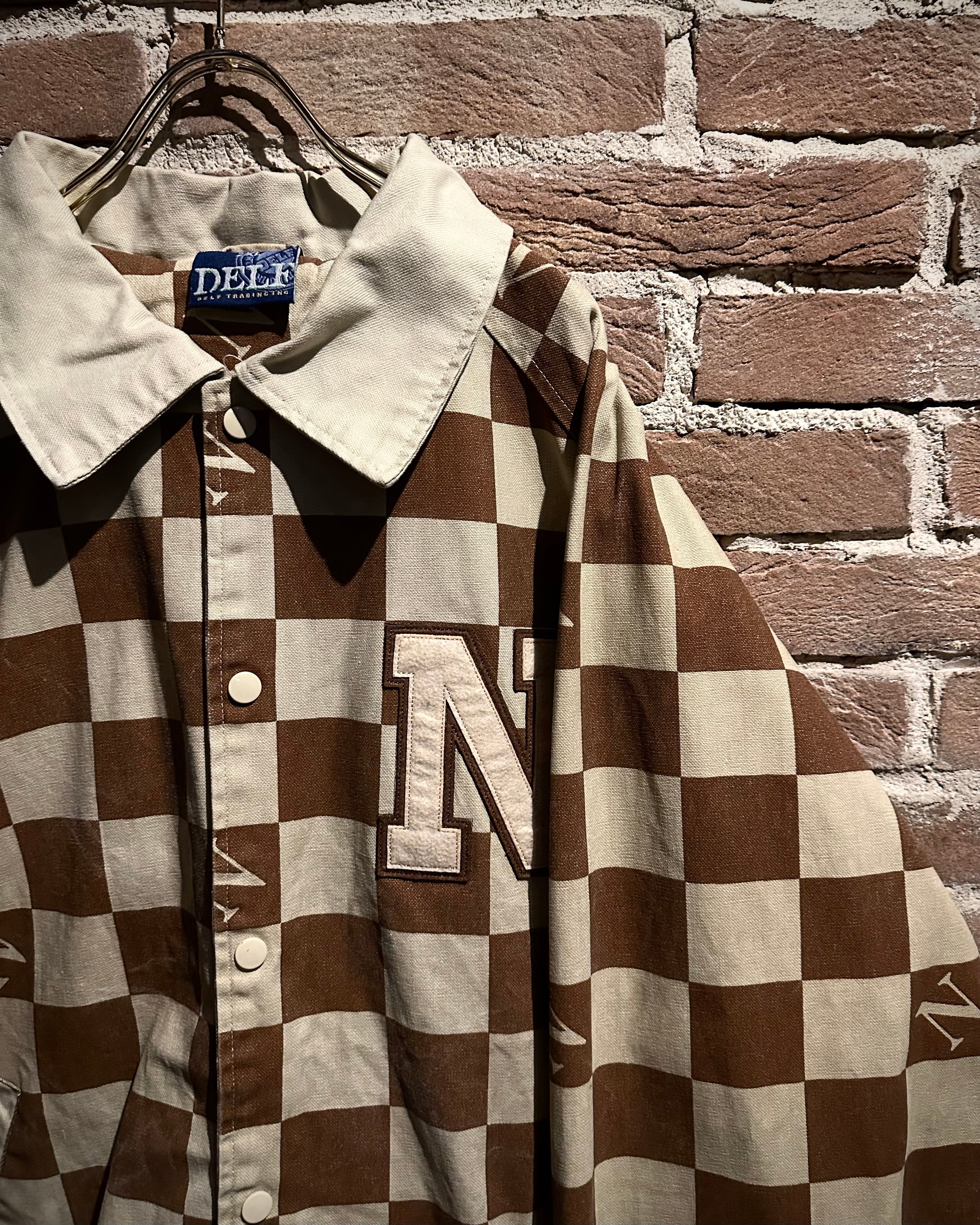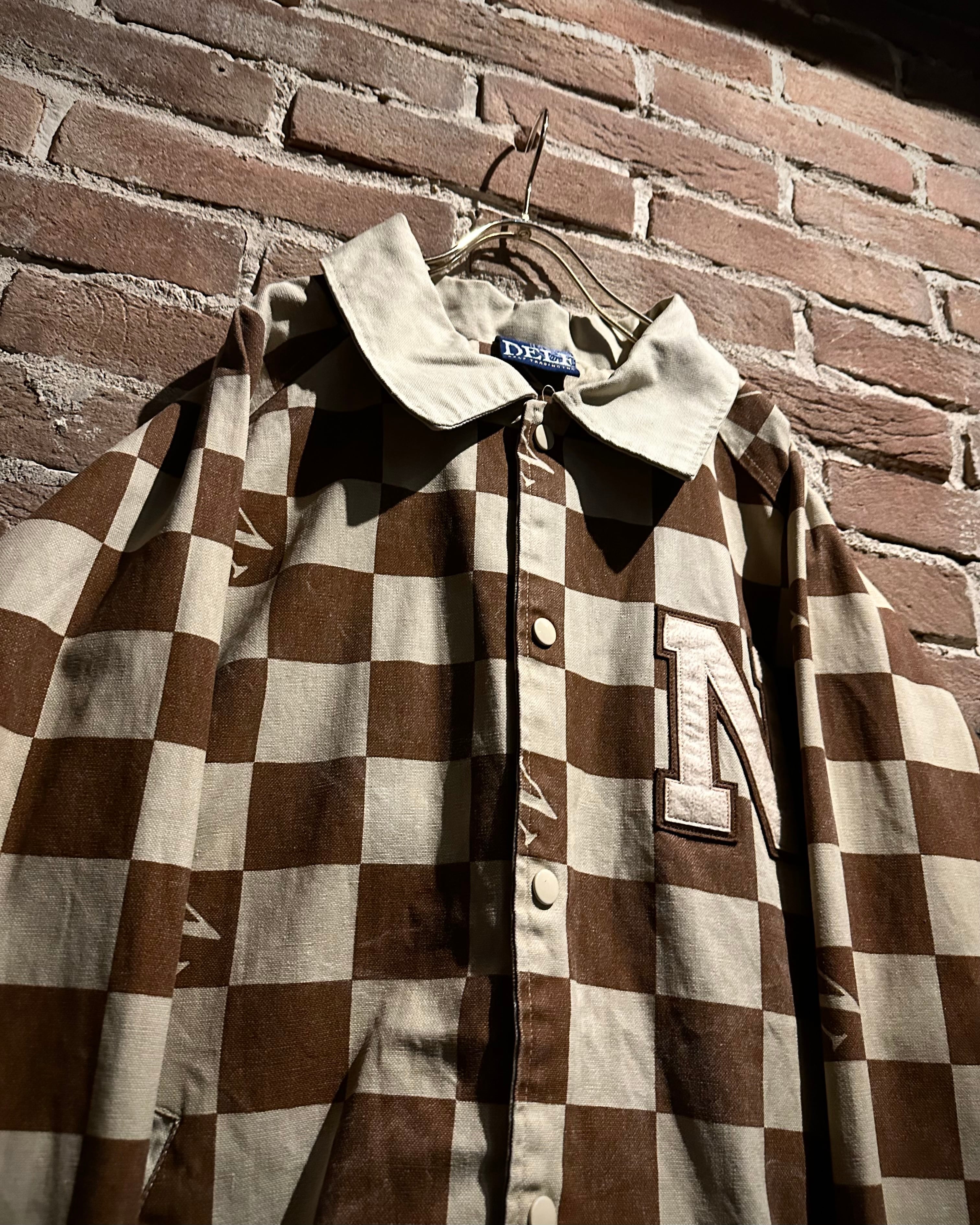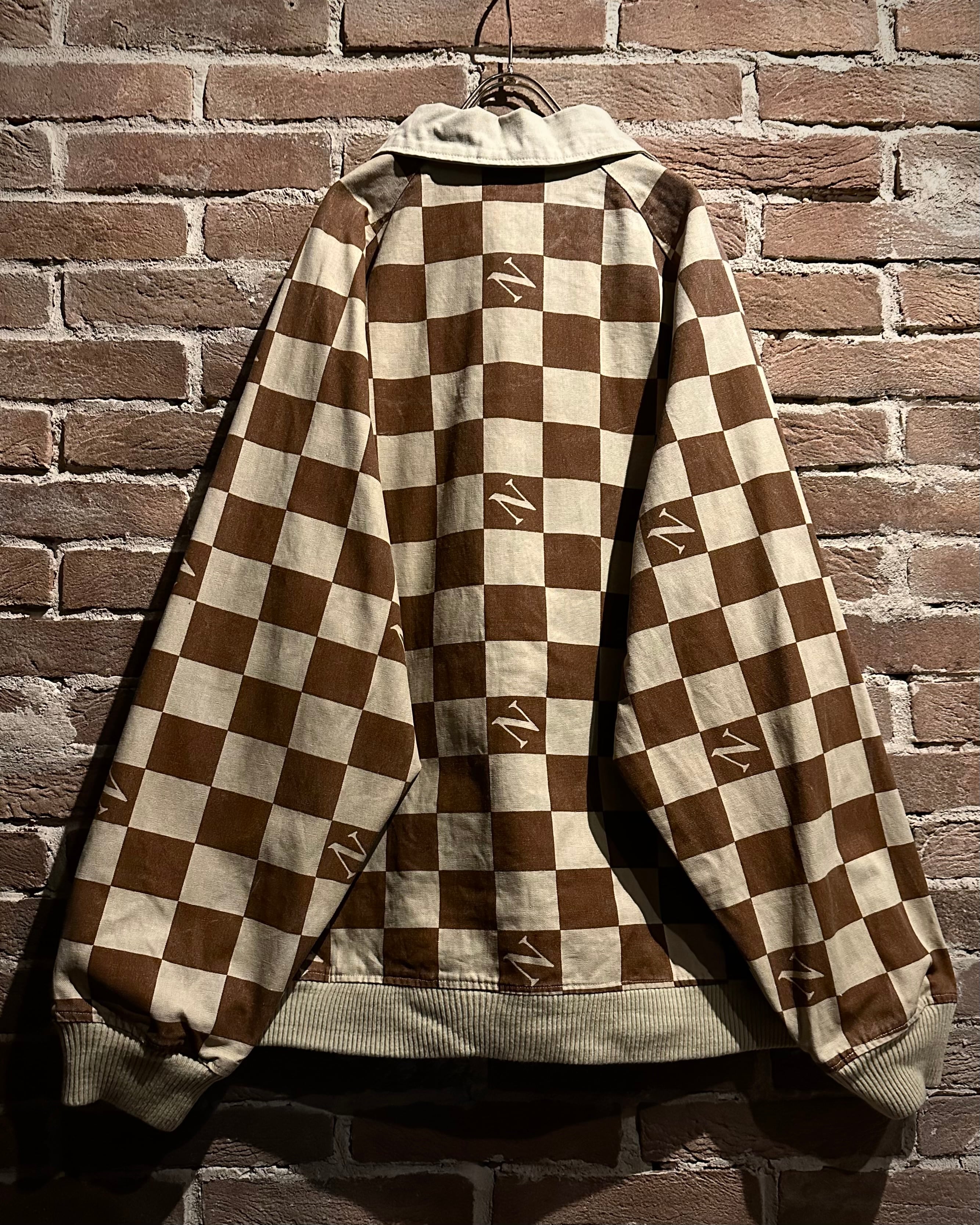 ブラウン×ベージュの落ち着いた配色は、主張がありながらも上品な印象。左胸にはロゴワッペンを施し、どこかスタジャンライクなムードをプラスしています。総柄でありながらバランスの取れたデザインで、ストリートとラグジュアリーの要素が絶妙にミックスされた仕上がりに。