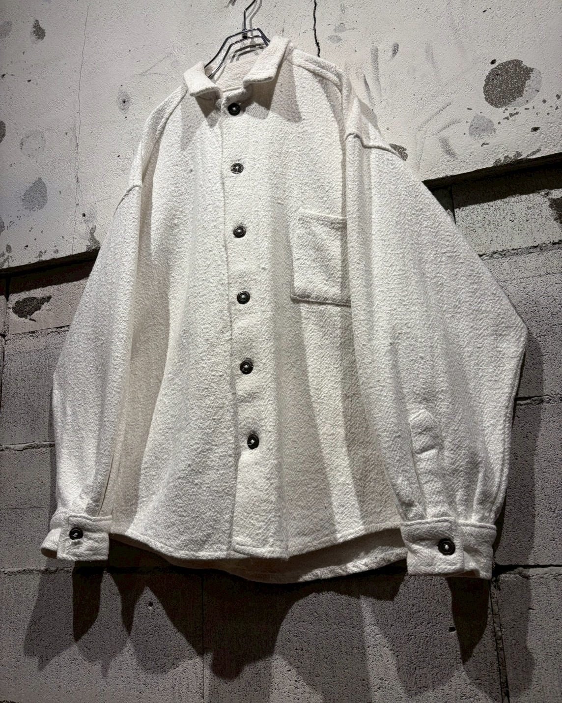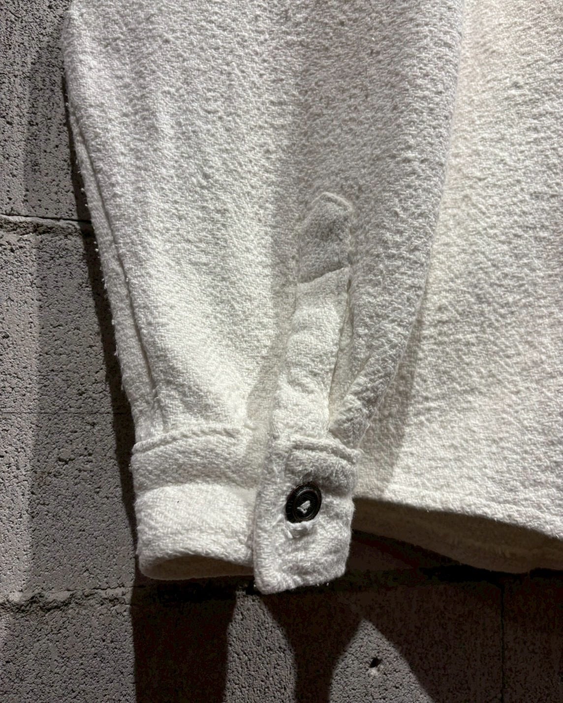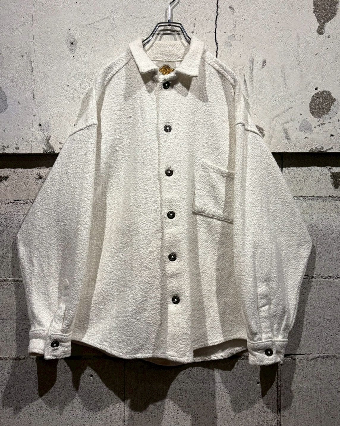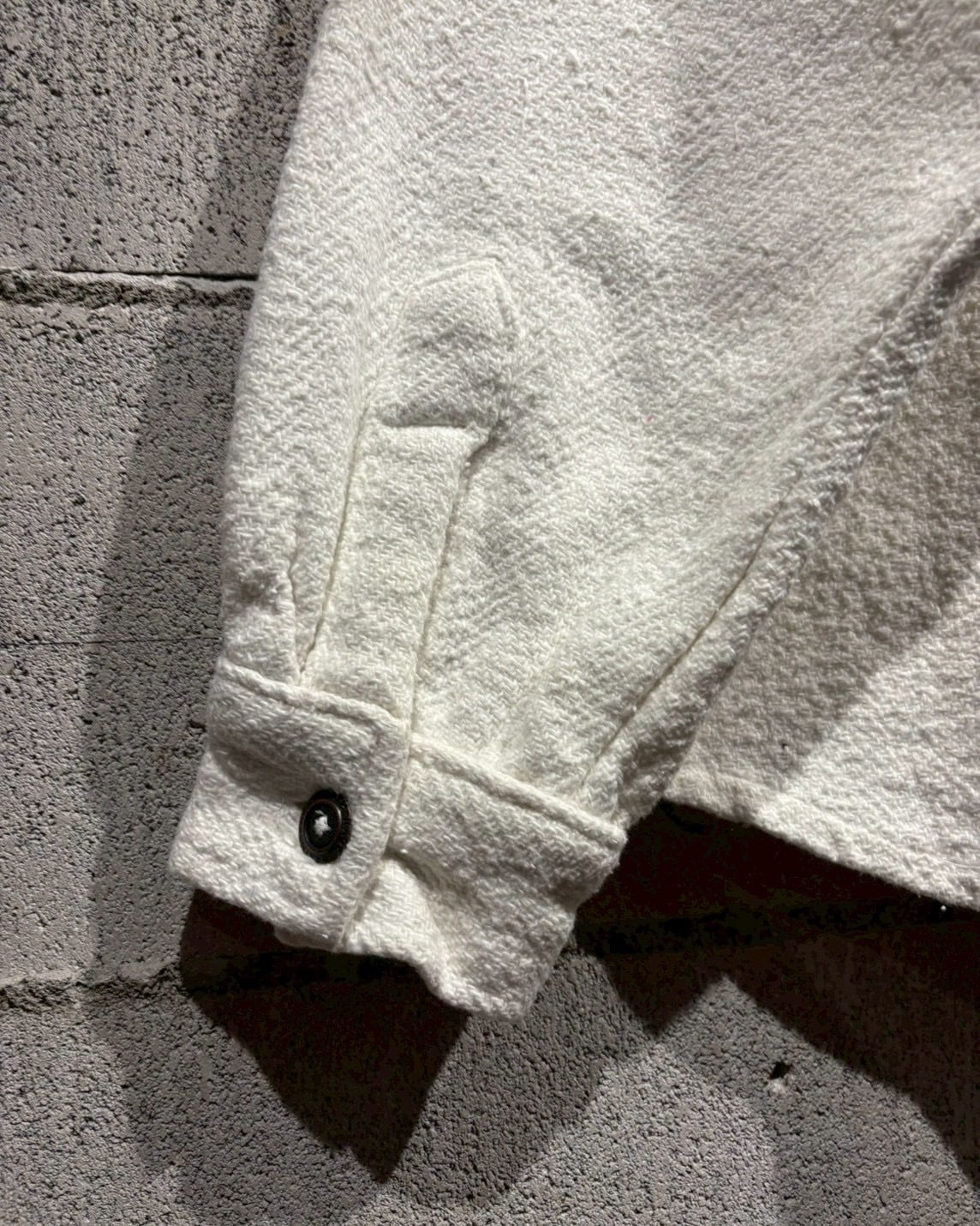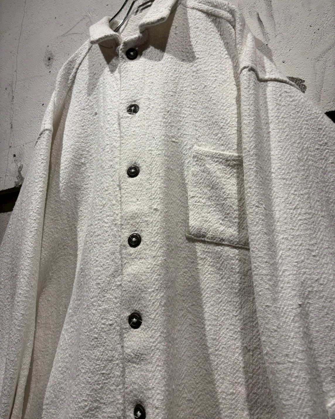 生成りがかったホワイトカラーの長袖シャツ。100%コットンのファブリックは、ざっくりとした織り目が際立つ独特のテクスチャーで、柔らかさと温もりを併せ持つ表情が魅力。再生素材ならではの素朴なムラが、均一ではない奥行きある風合いを生み出しています。