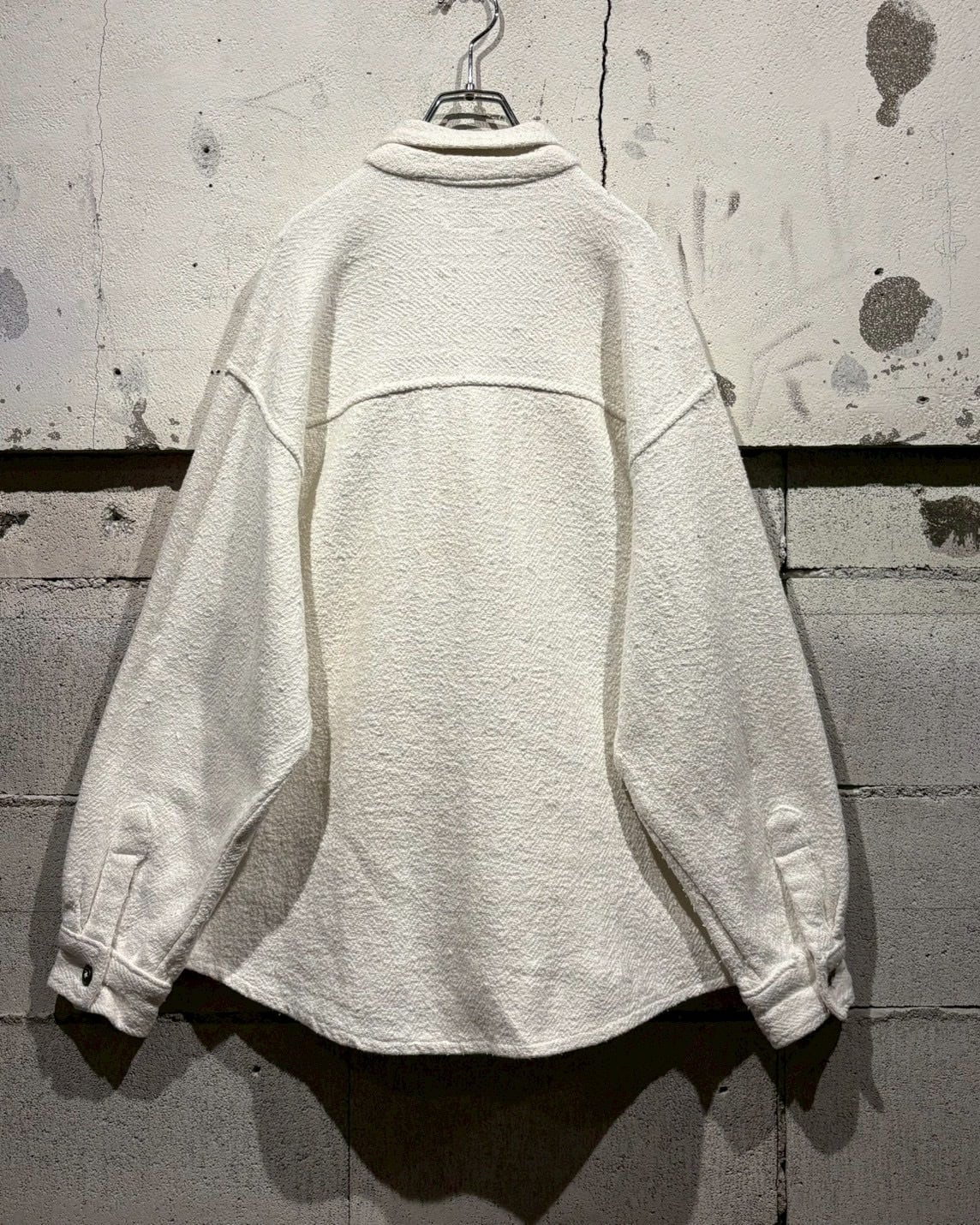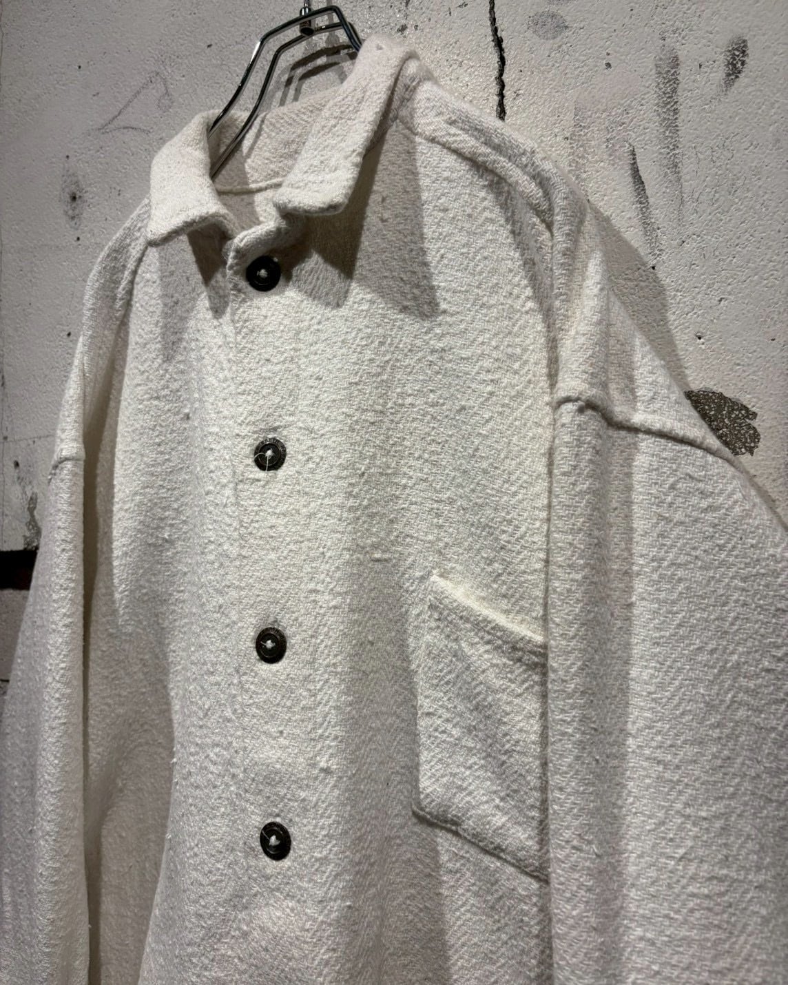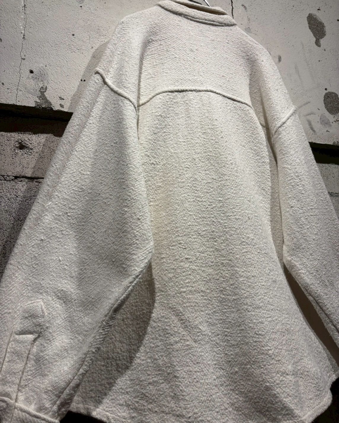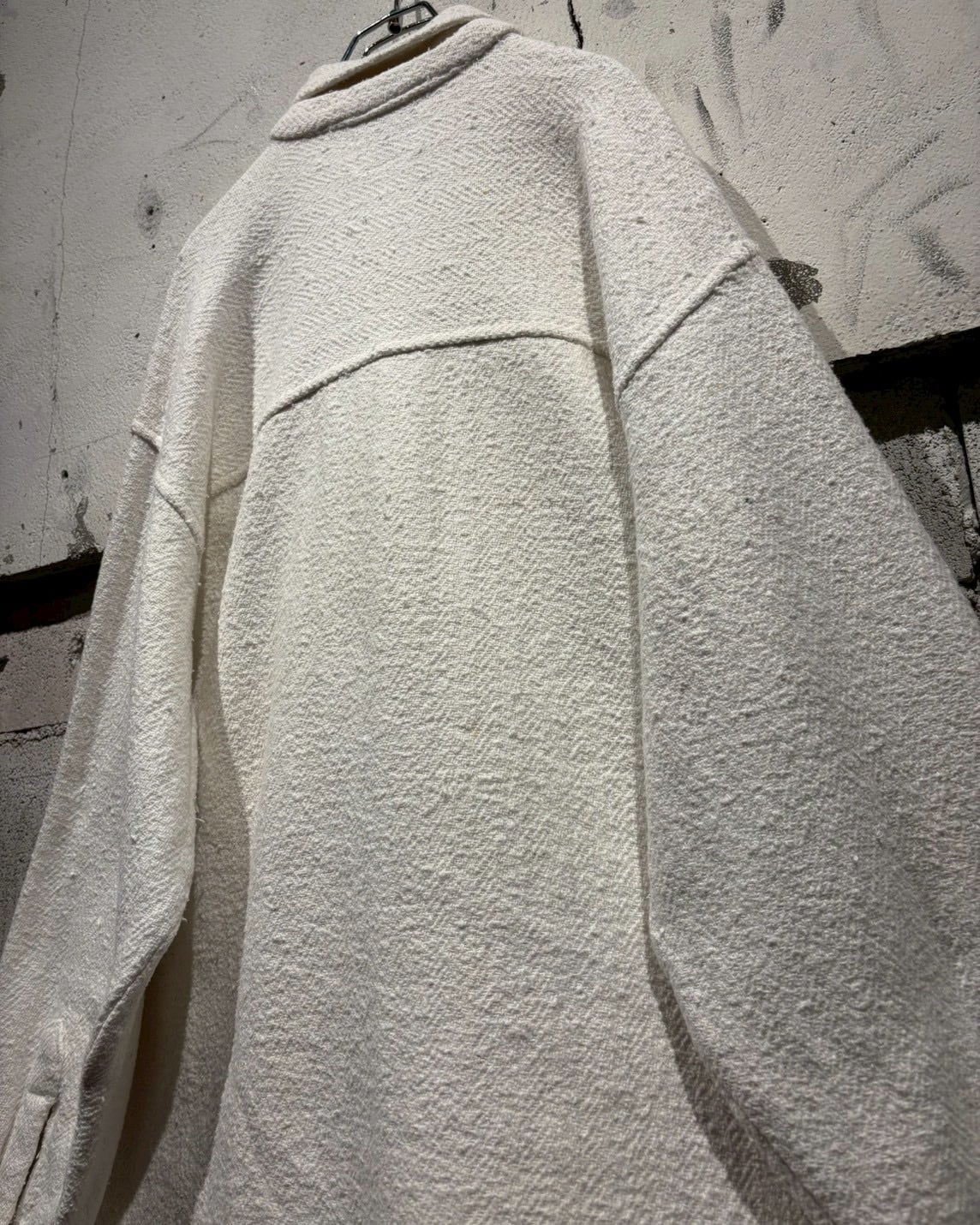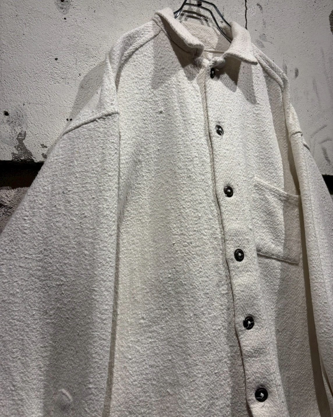 生成りがかったホワイトカラーの長袖シャツ。100%コットンのファブリックは、ざっくりとした織り目が際立つ独特のテクスチャーで、柔らかさと温もりを併せ持つ表情が魅力。再生素材ならではの素朴なムラが、均一ではない奥行きある風合いを生み出しています。