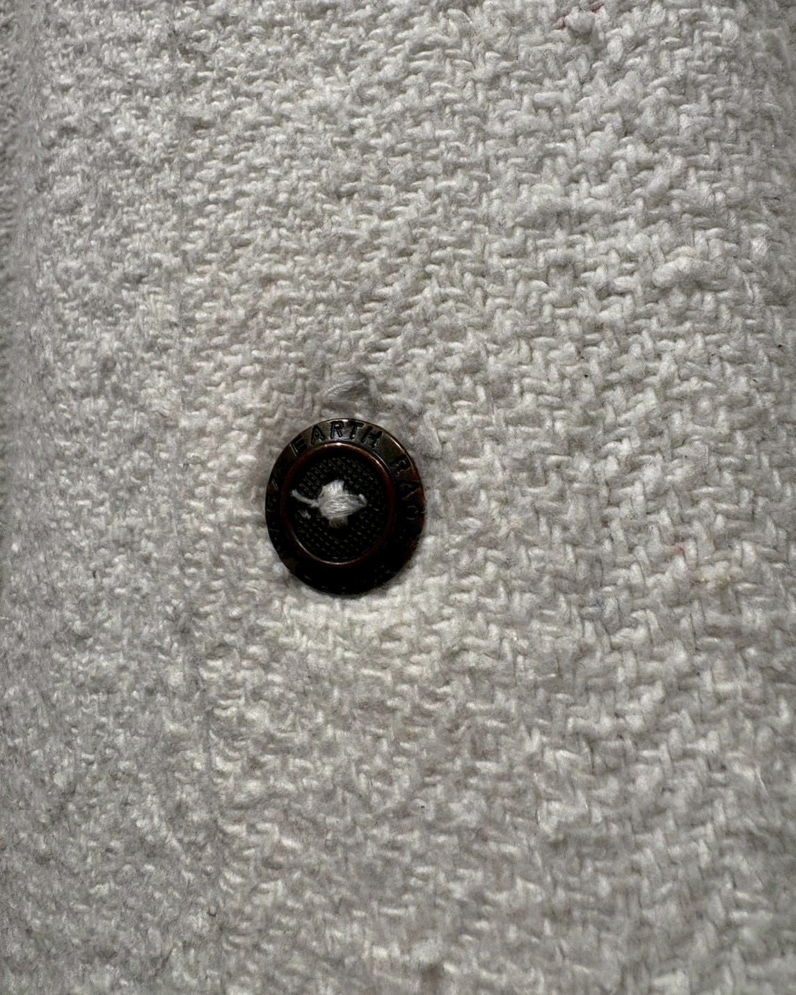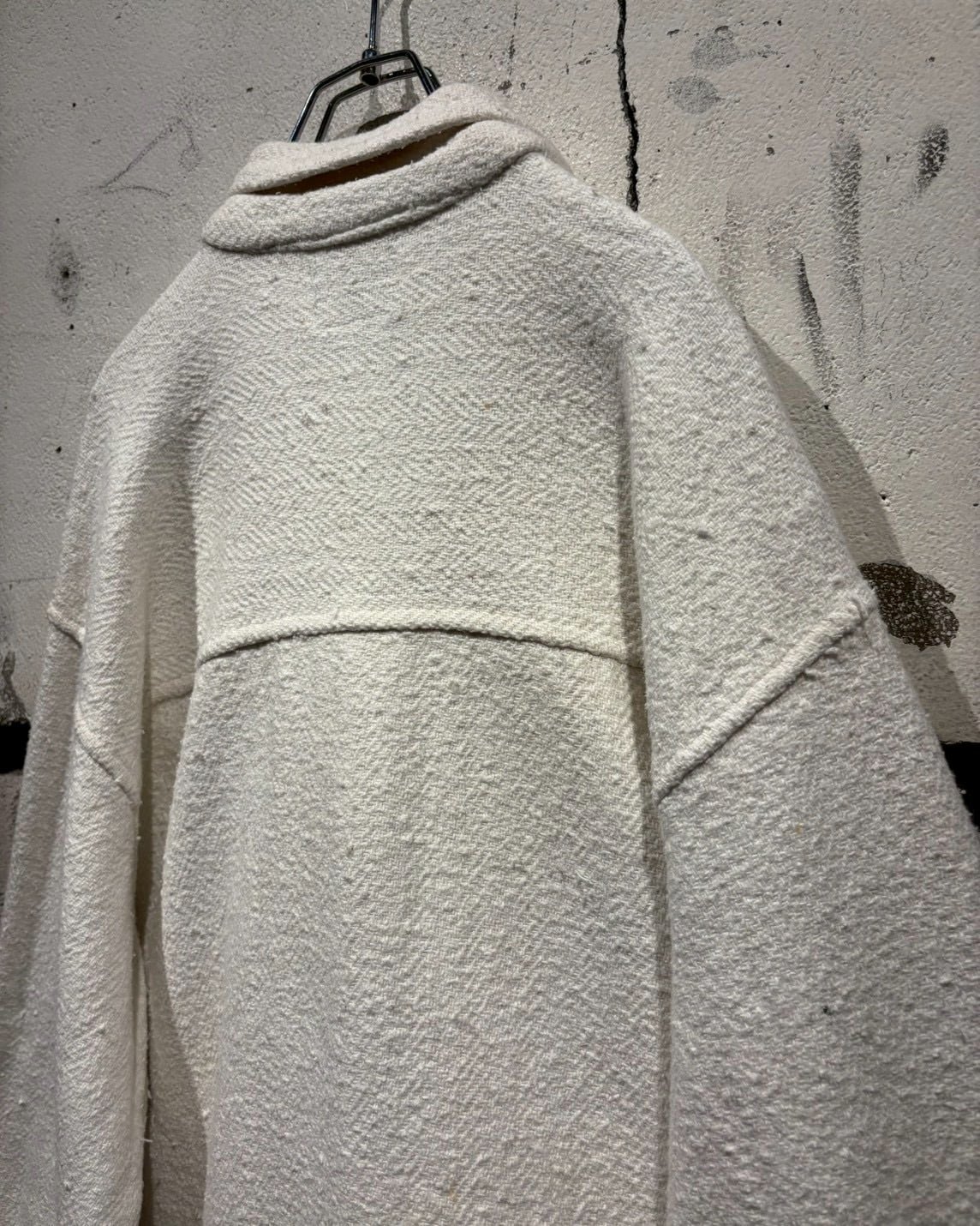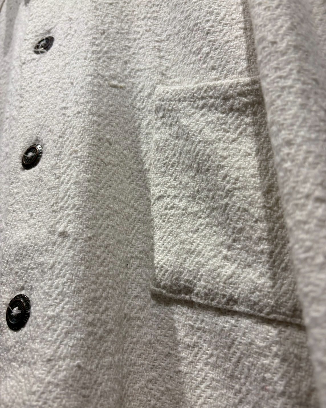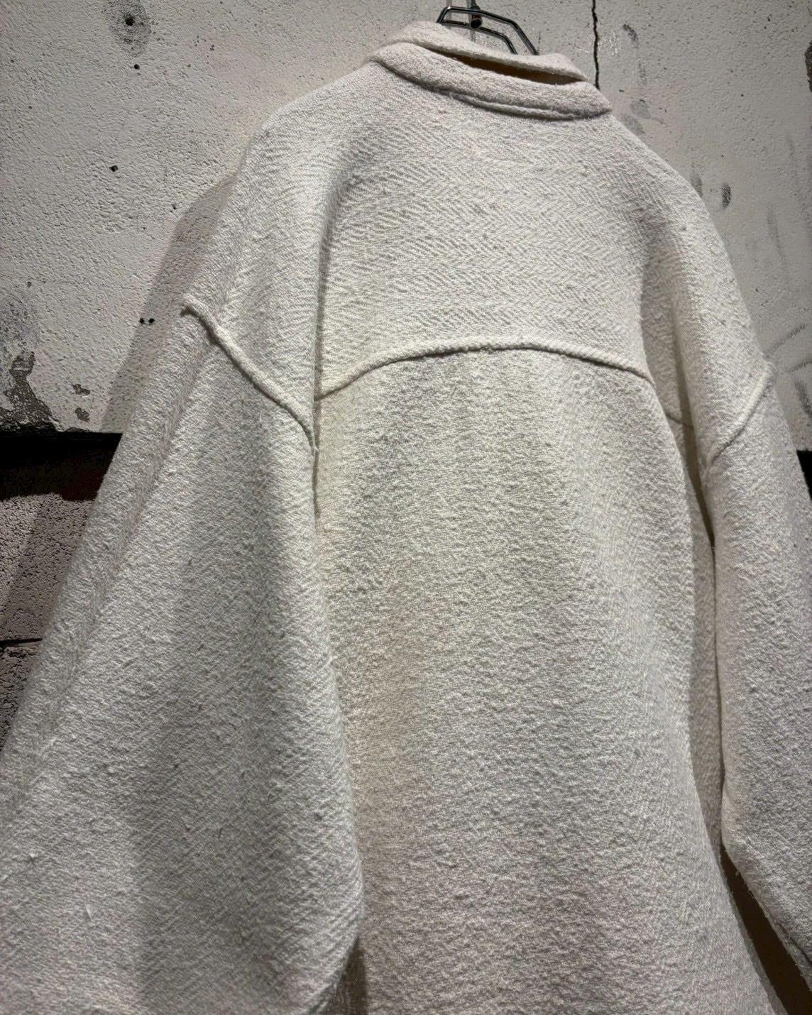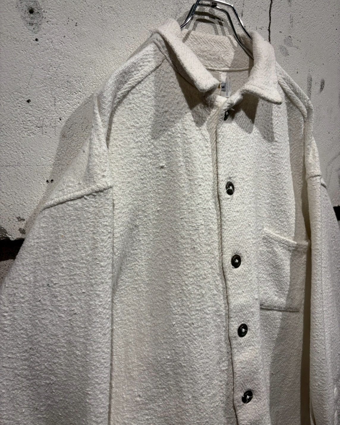 生成りがかったホワイトカラーの長袖シャツ。100%コットンのファブリックは、ざっくりとした織り目が際立つ独特のテクスチャーで、柔らかさと温もりを併せ持つ表情が魅力。再生素材ならではの素朴なムラが、均一ではない奥行きある風合いを生み出しています。