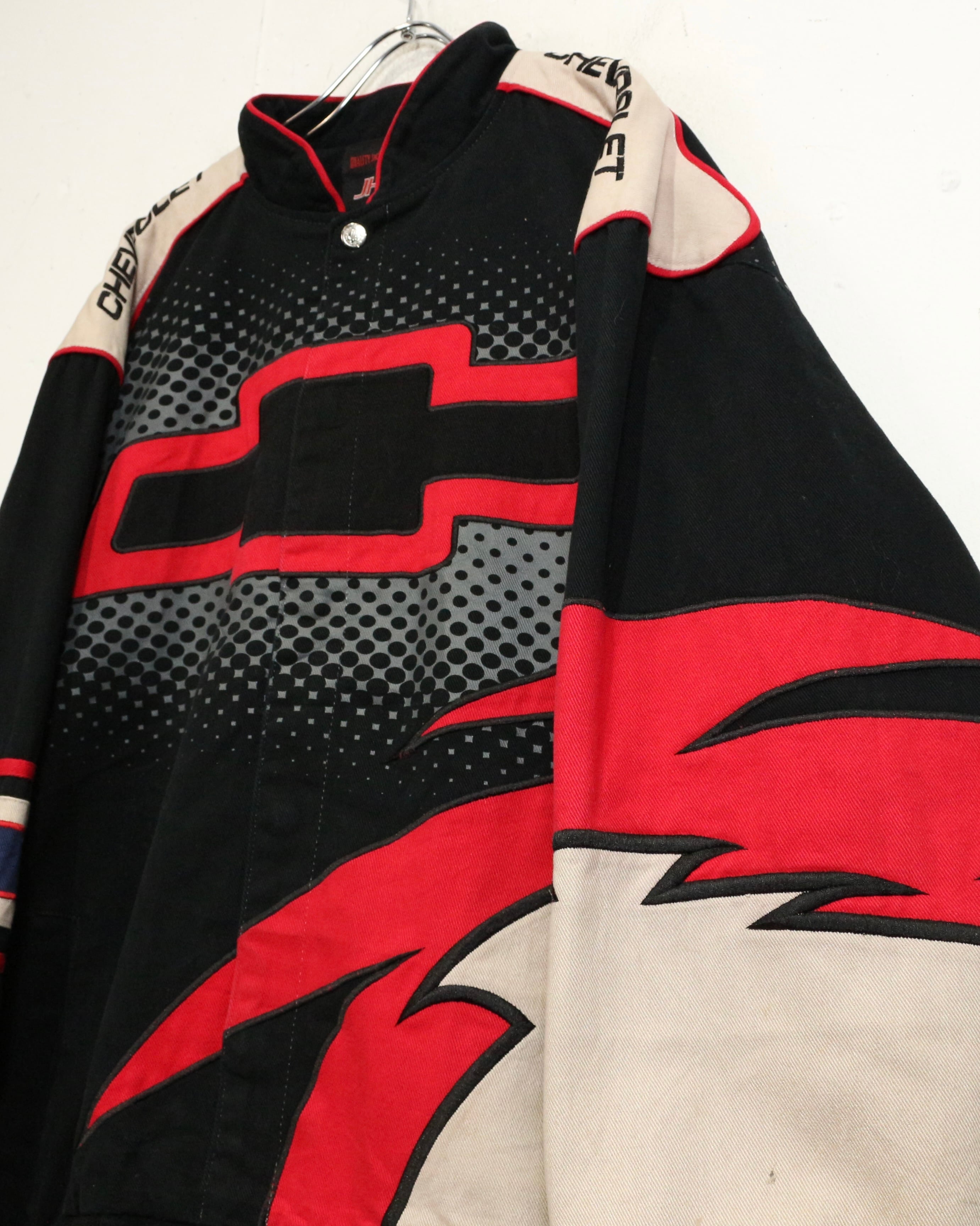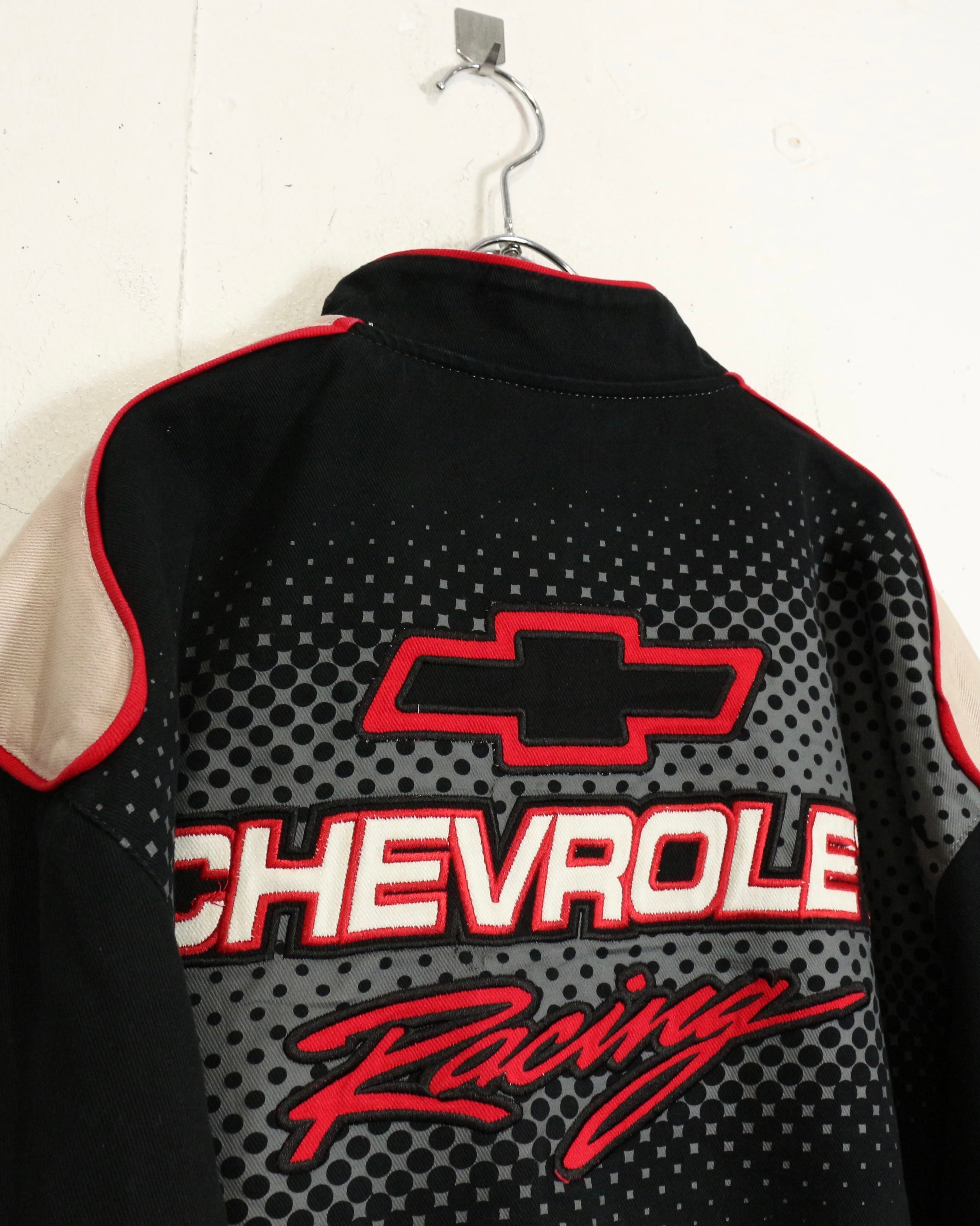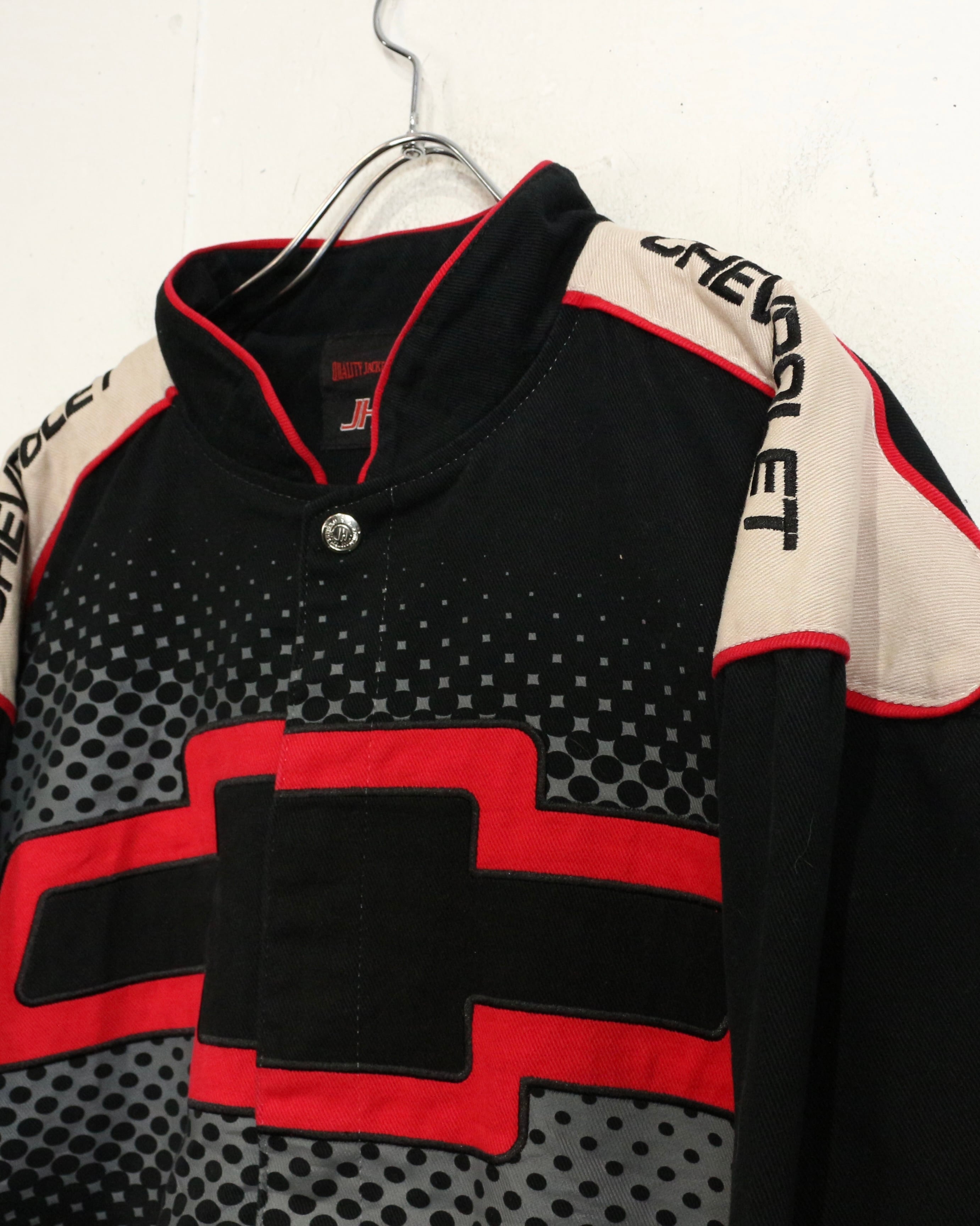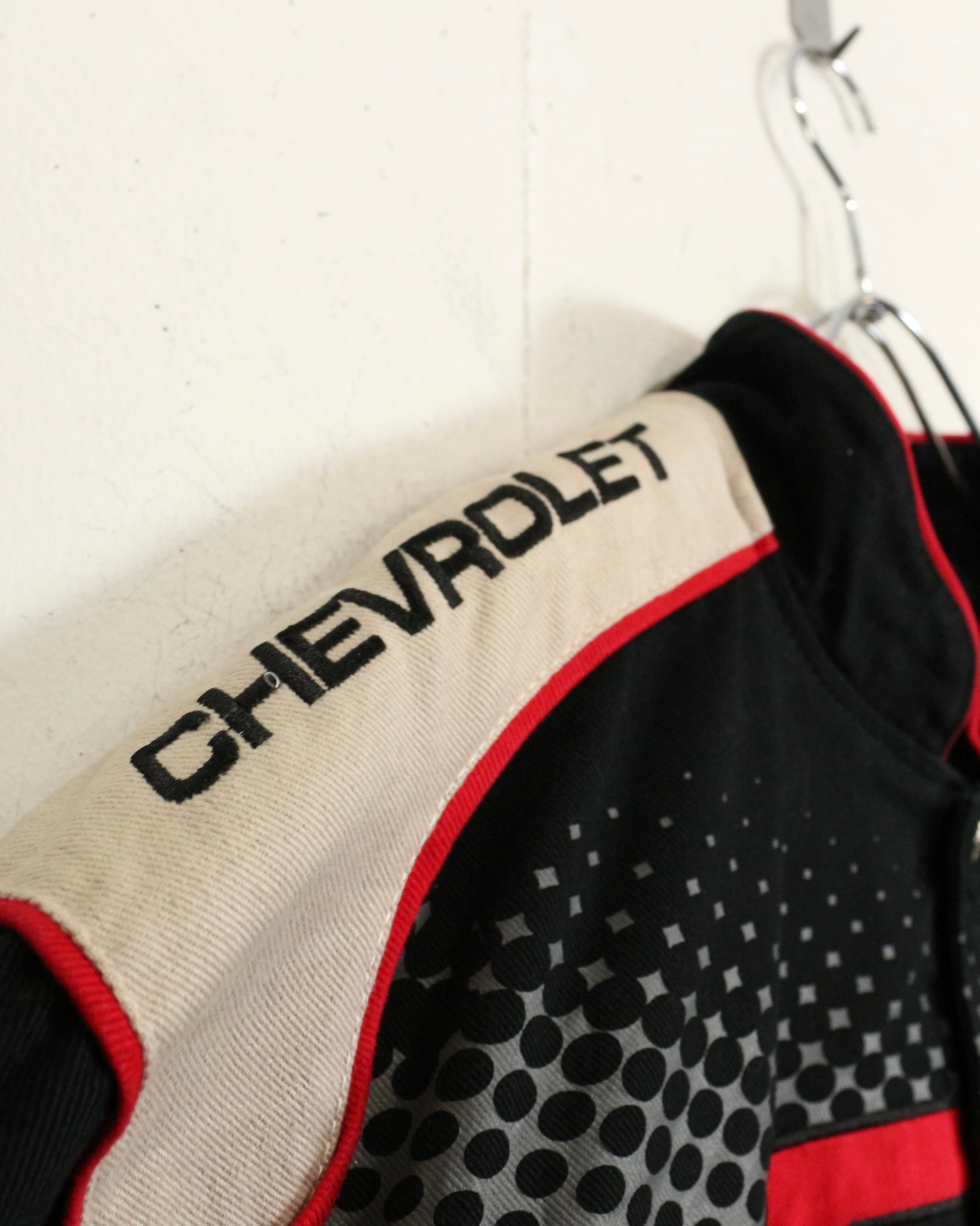 タフでコシのあるツイル織りをベースに、ブラック、ベージュ、レッドを大胆に切り替えた配色。フロントにはCHEVROLETの象徴的なボウタイロゴを大きく配置し、ドットパターンや鋭いカッティングラインがスピード感を演出しています。