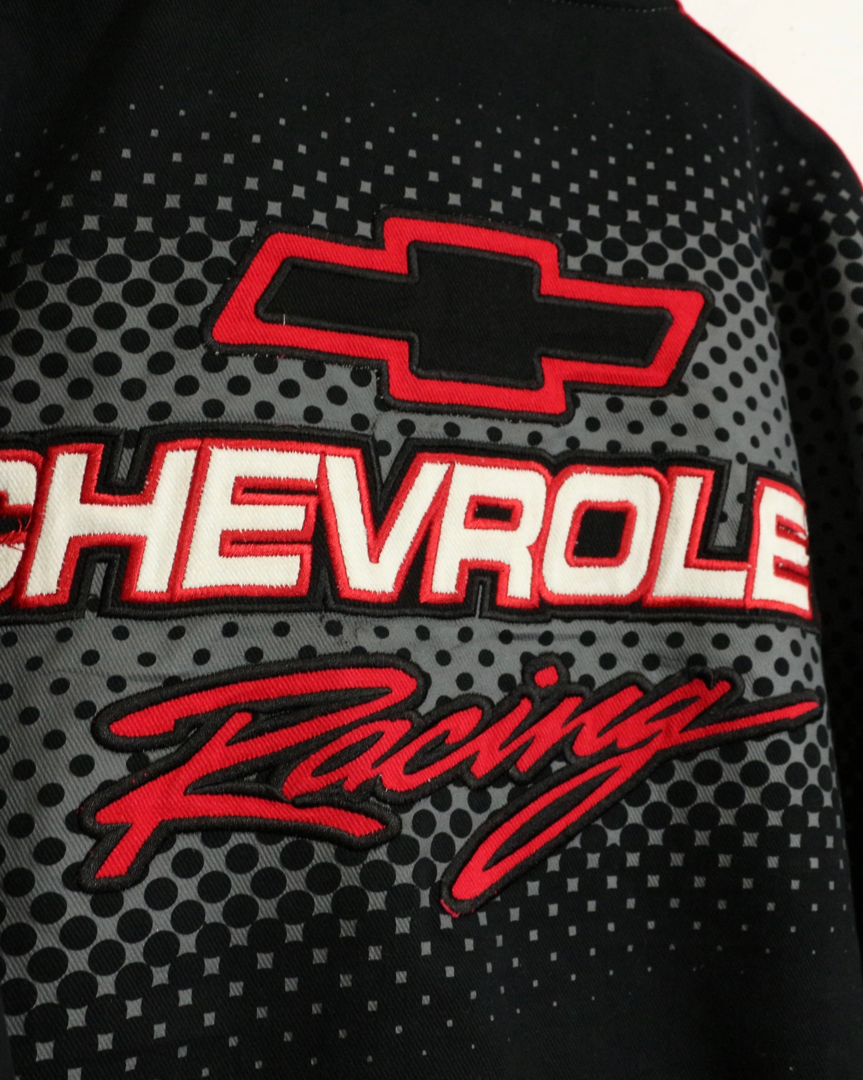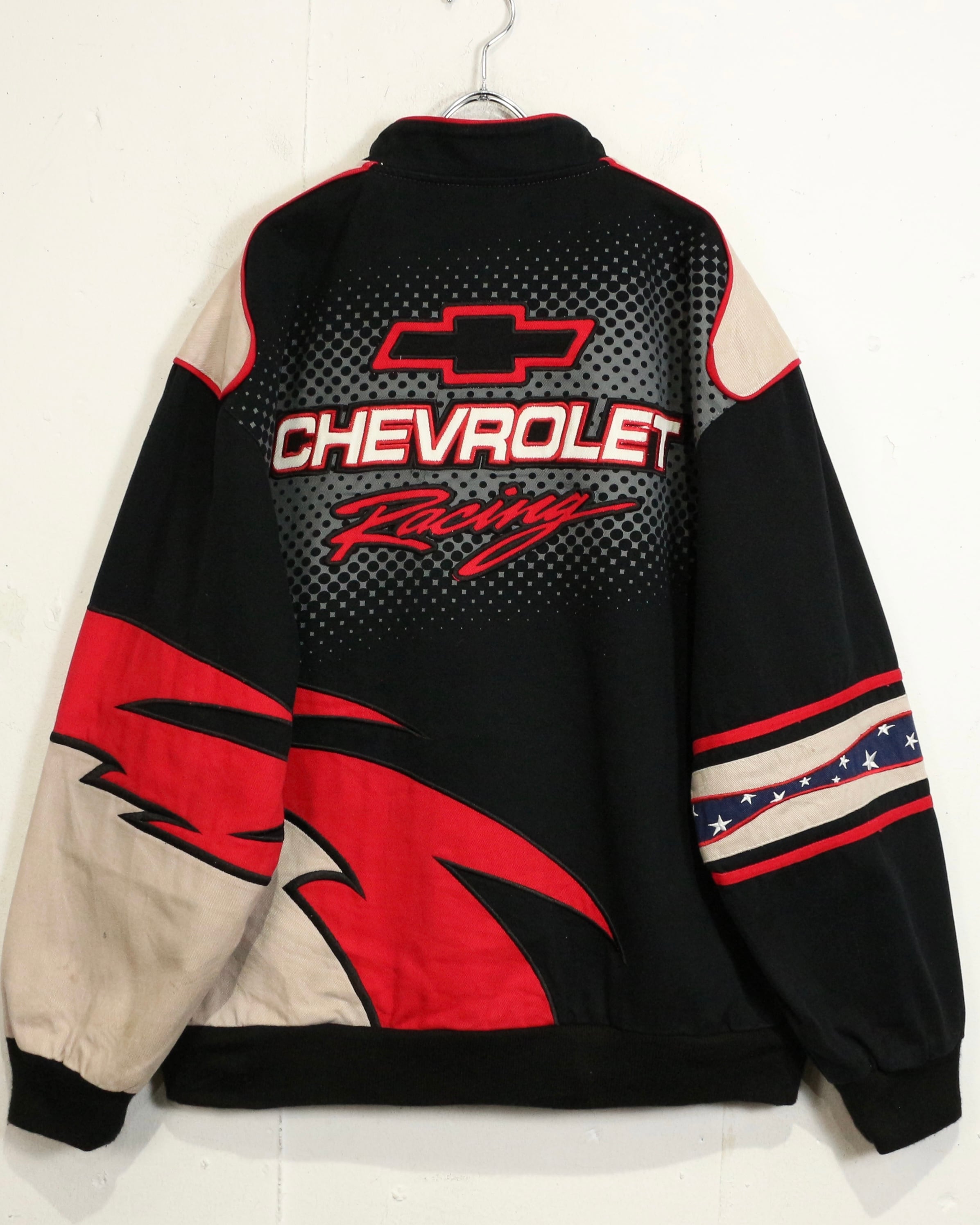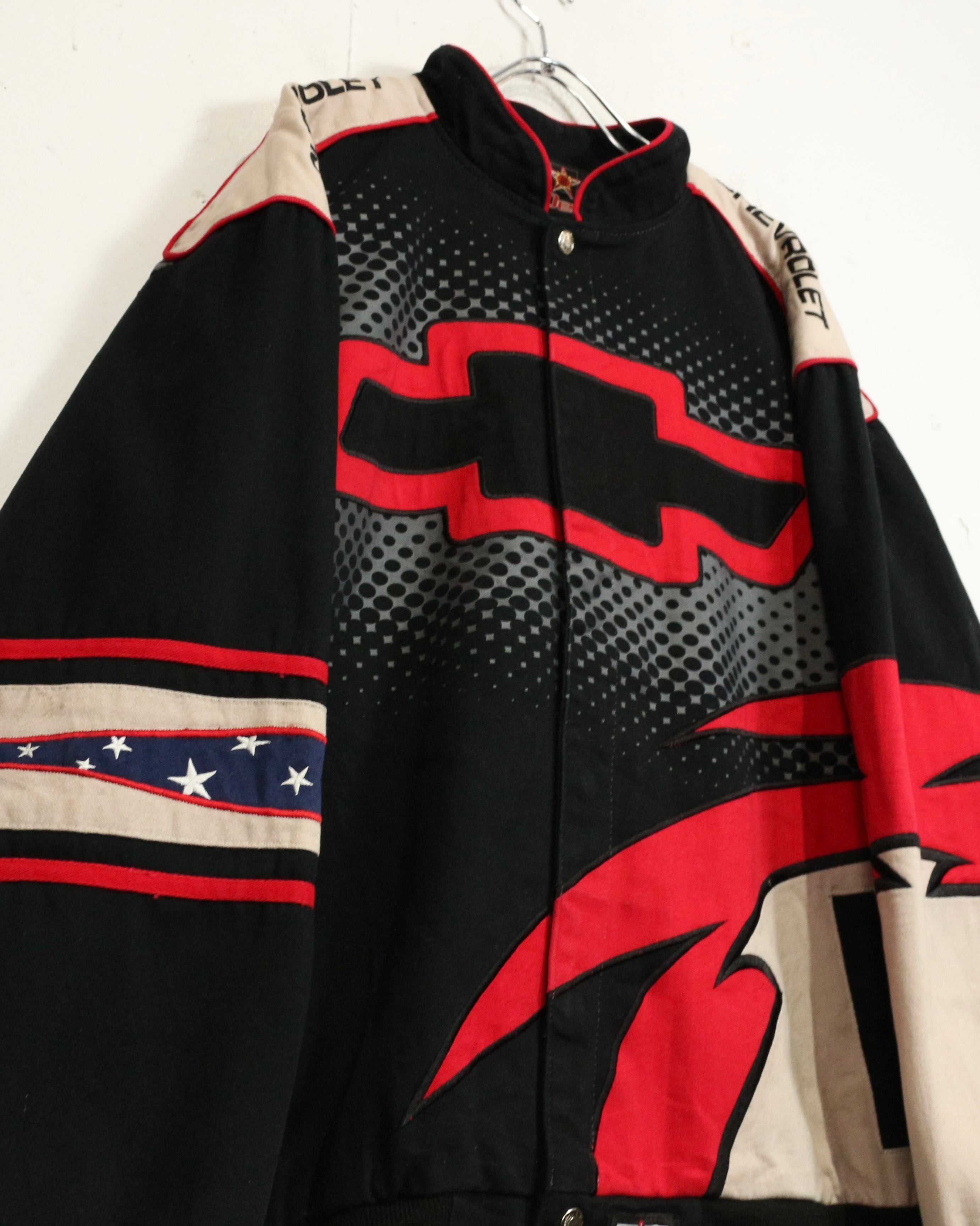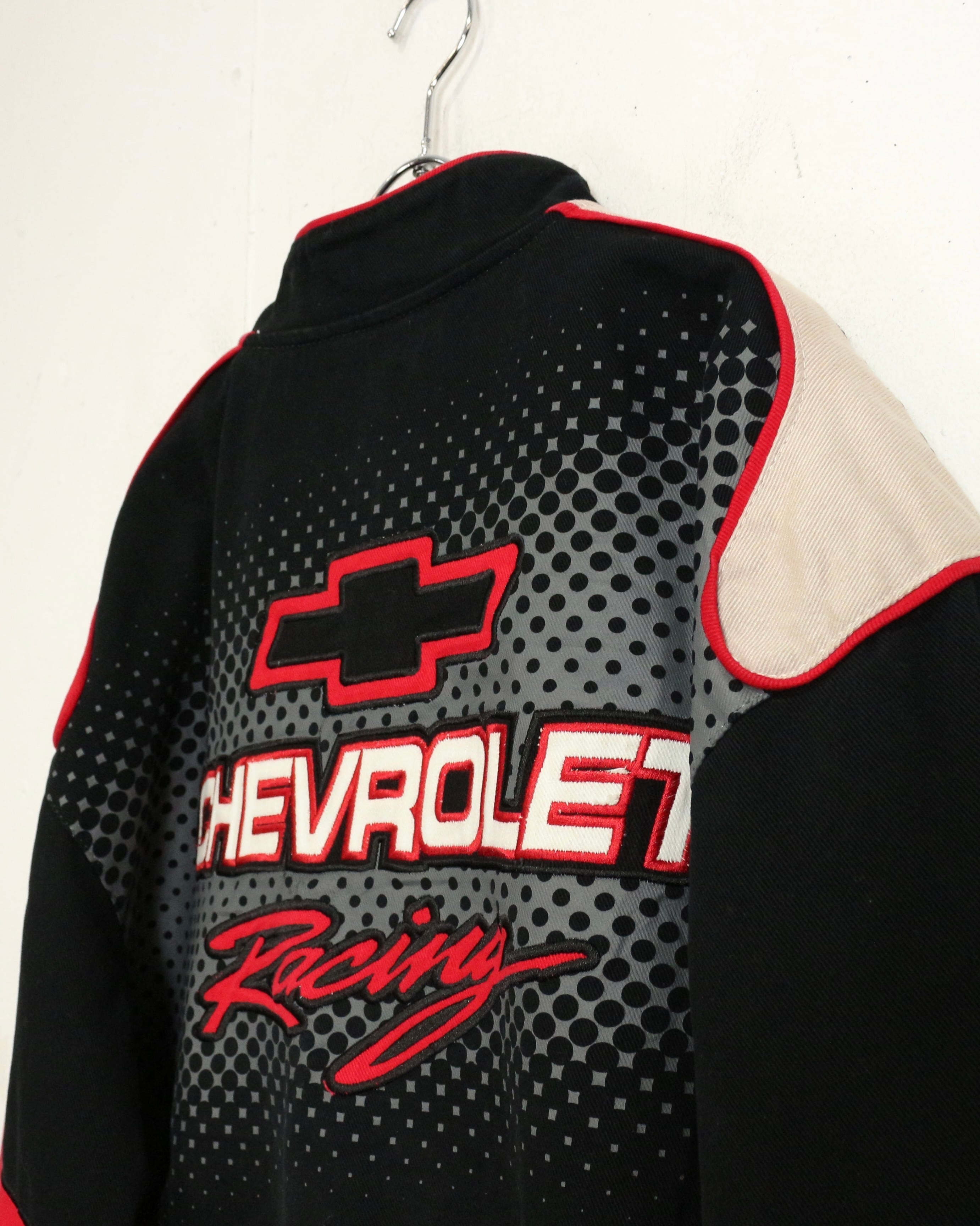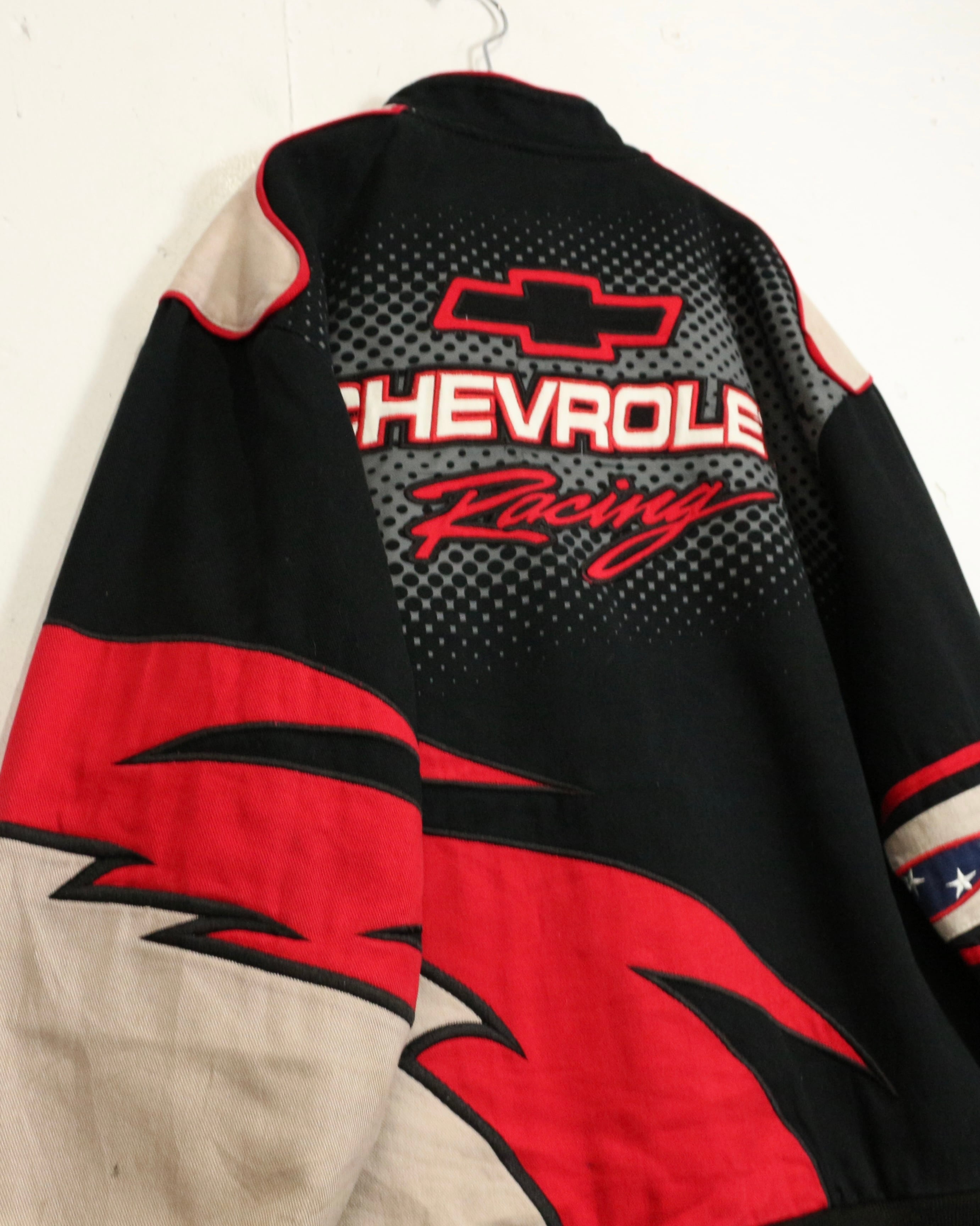 タフでコシのあるツイル織りをベースに、ブラック、ベージュ、レッドを大胆に切り替えた配色。フロントにはCHEVROLETの象徴的なボウタイロゴを大きく配置し、ドットパターンや鋭いカッティングラインがスピード感を演出しています。