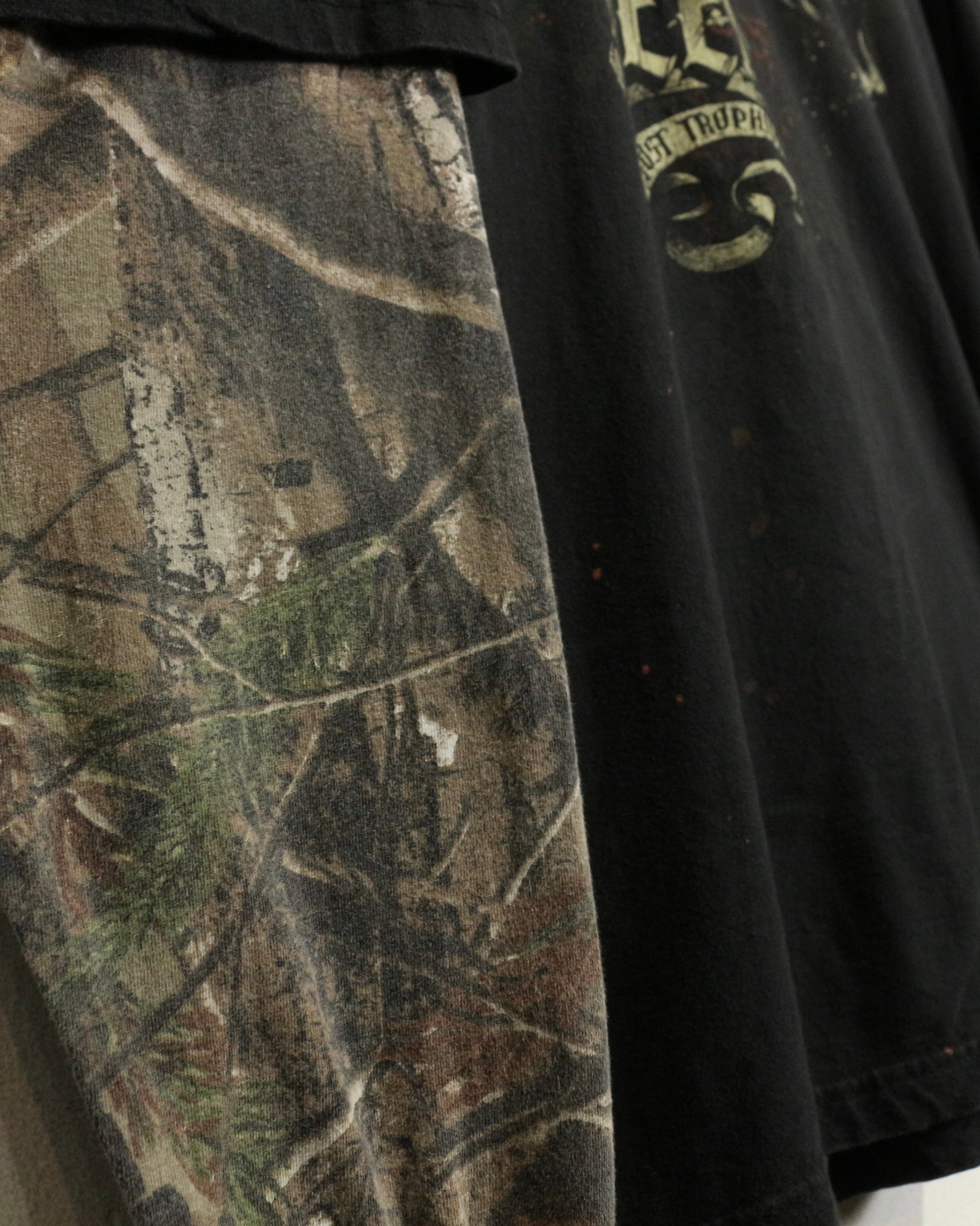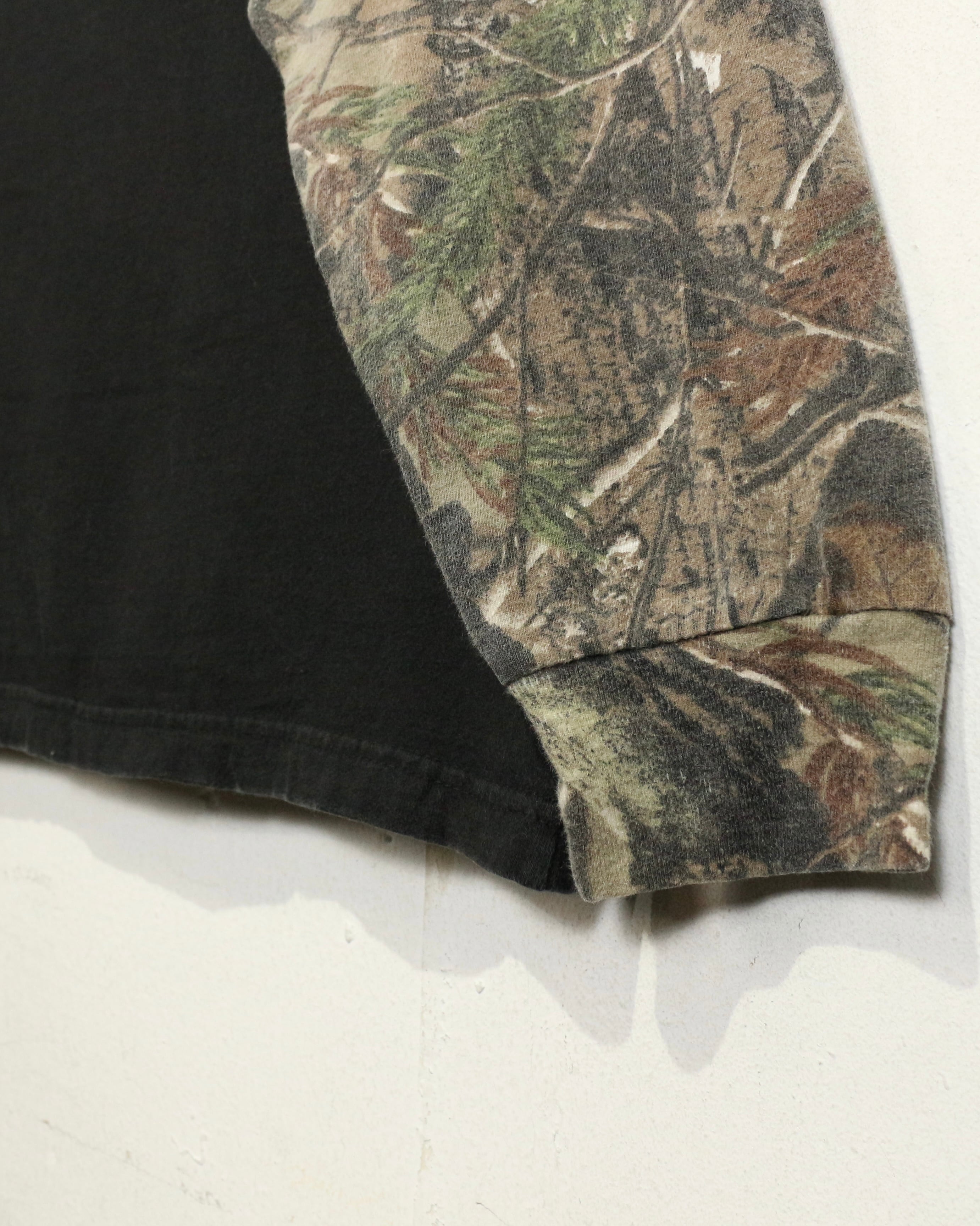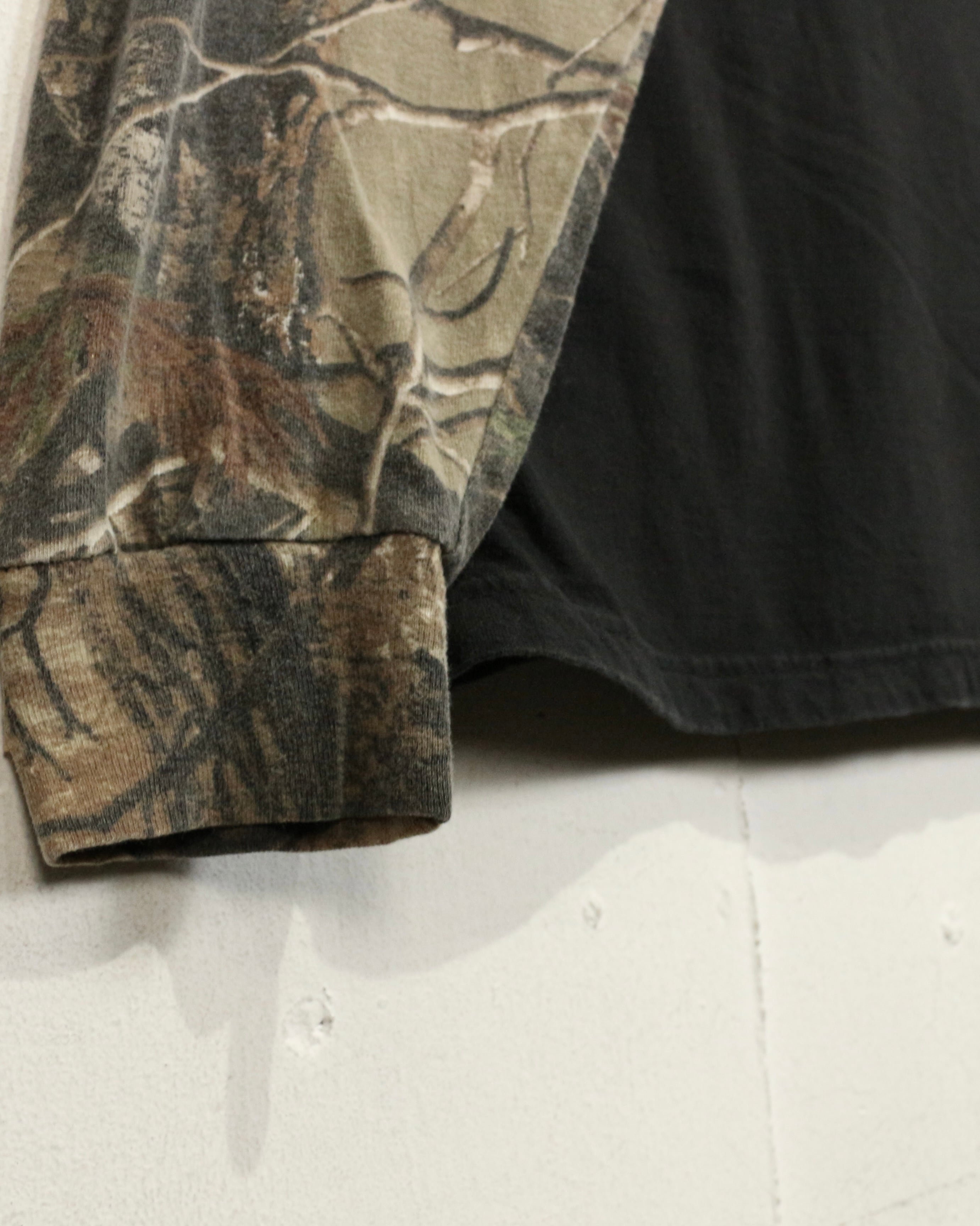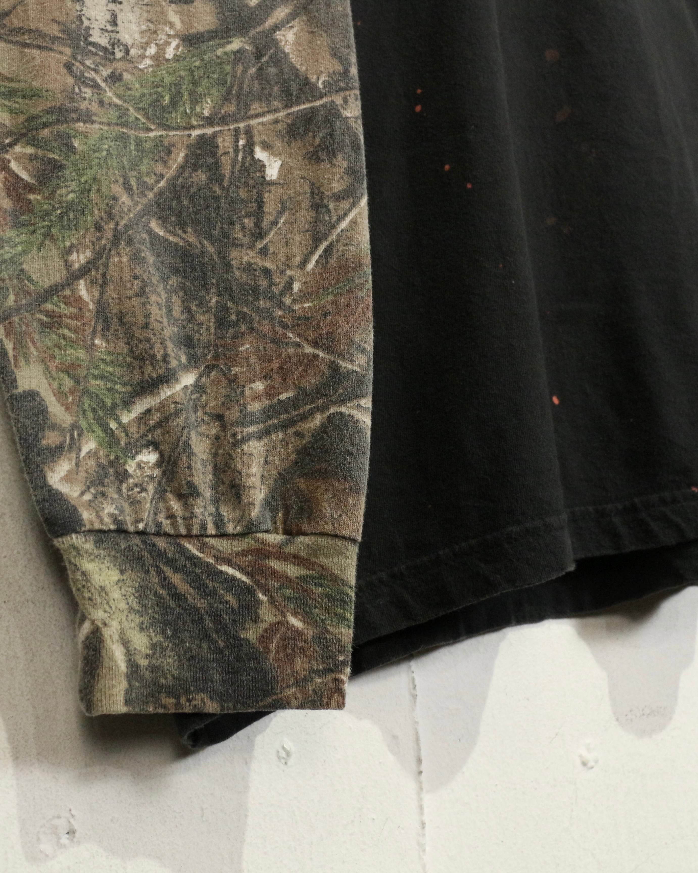 アーム部分にはリアルツリーカモを配したレイヤード風デザインを落とし込み、ブラックボディとのコントラストを強調。ここまでデザインが効いた古着のロンTはそう多くありません。