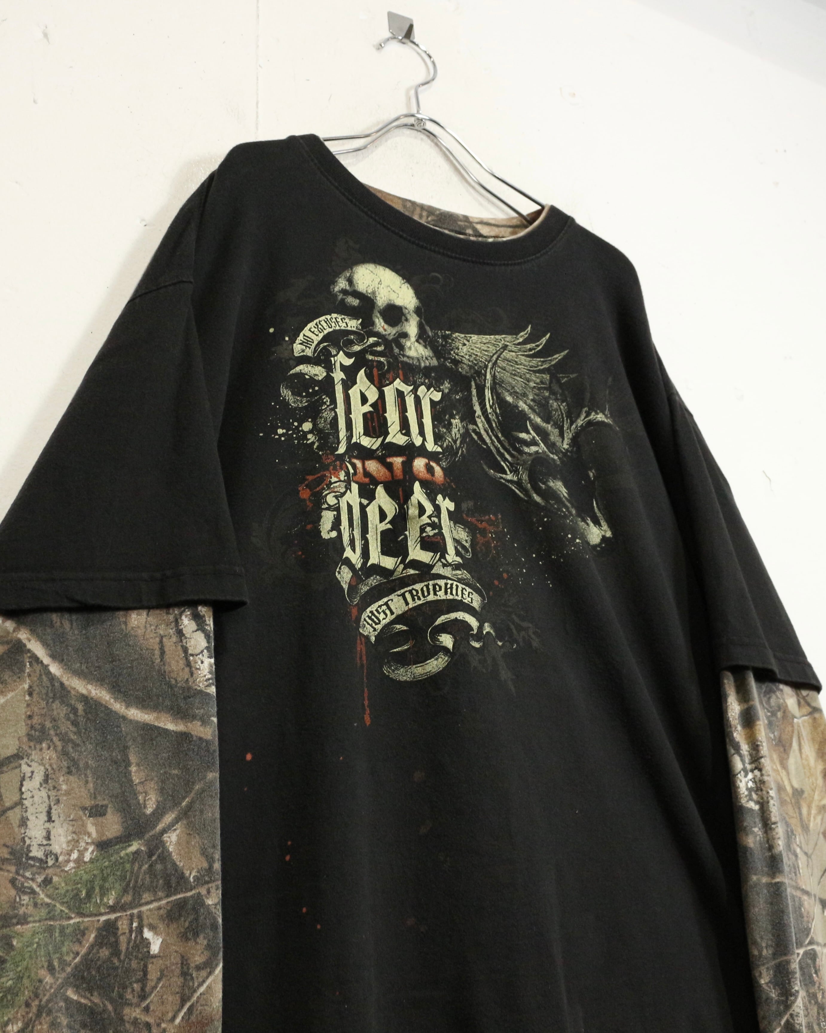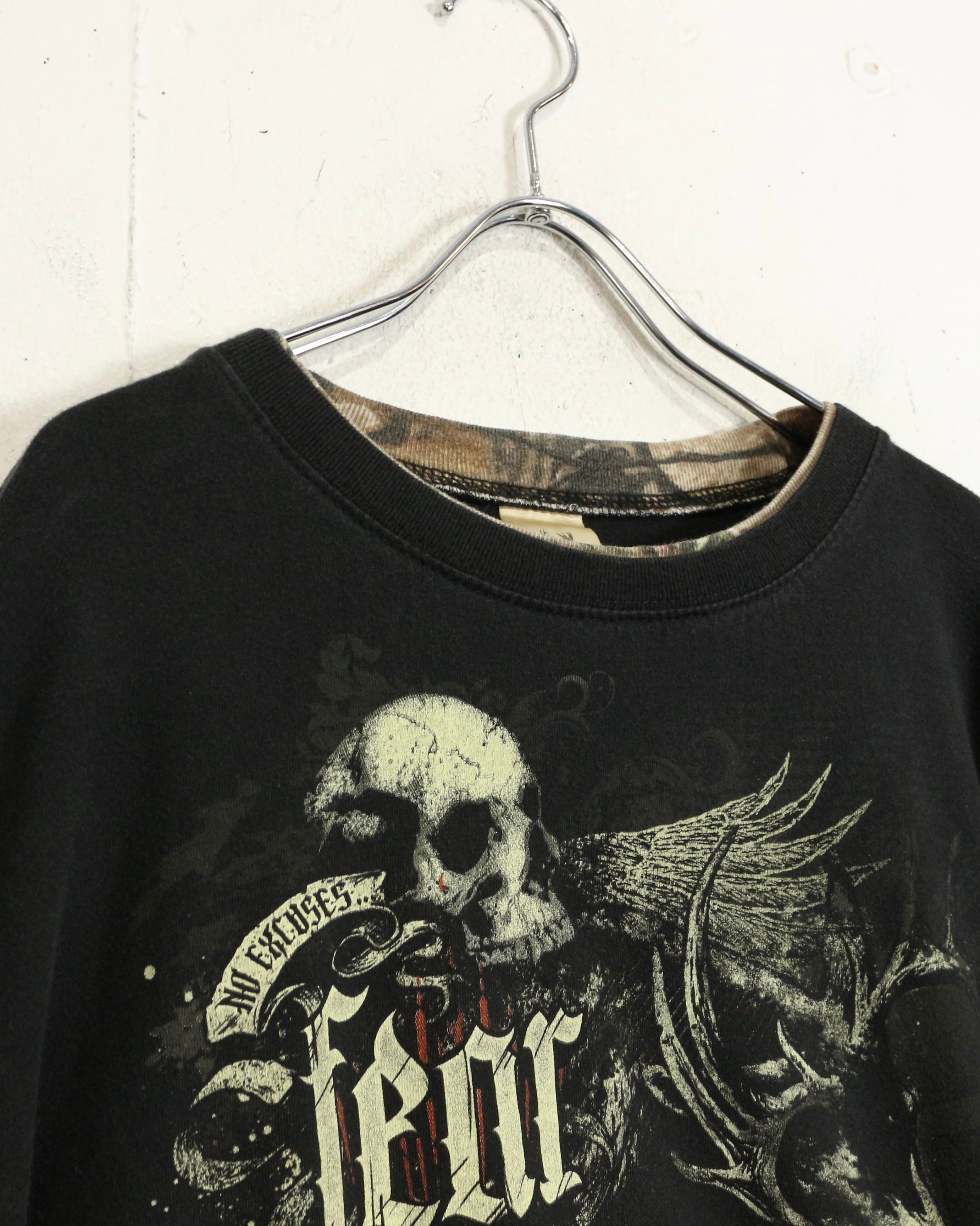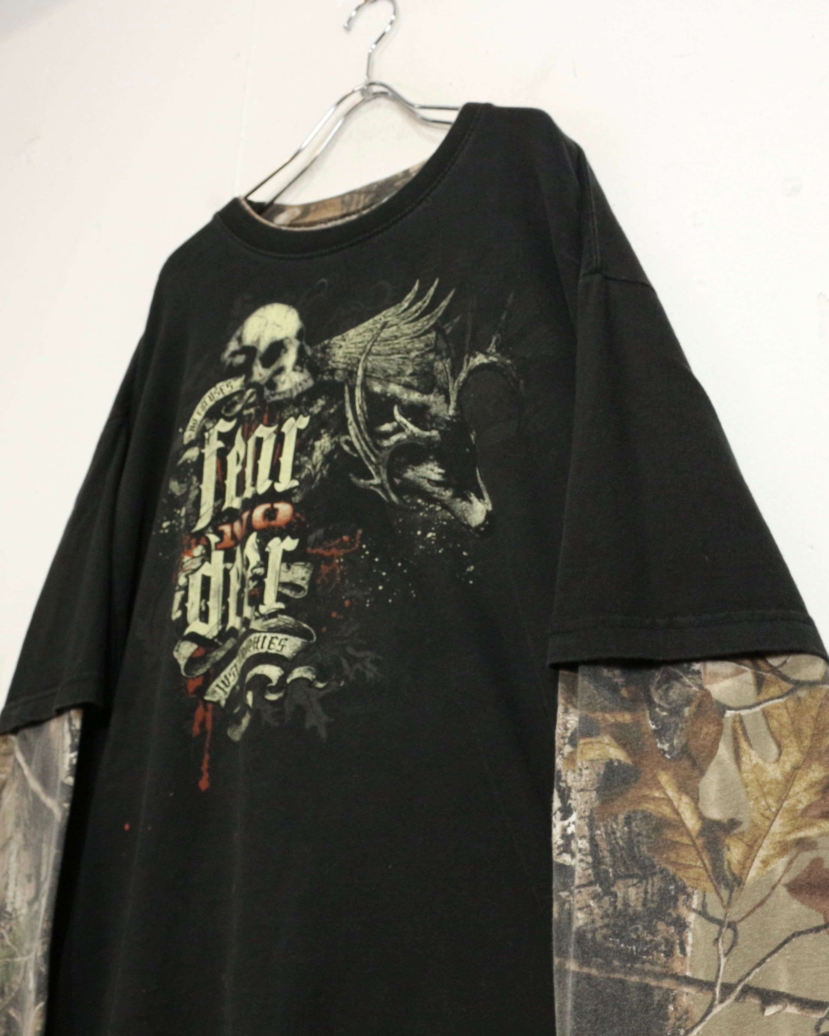 アーム部分にはリアルツリーカモを配したレイヤード風デザインを落とし込み、ブラックボディとのコントラストを強調。ここまでデザインが効いた古着のロンTはそう多くありません。