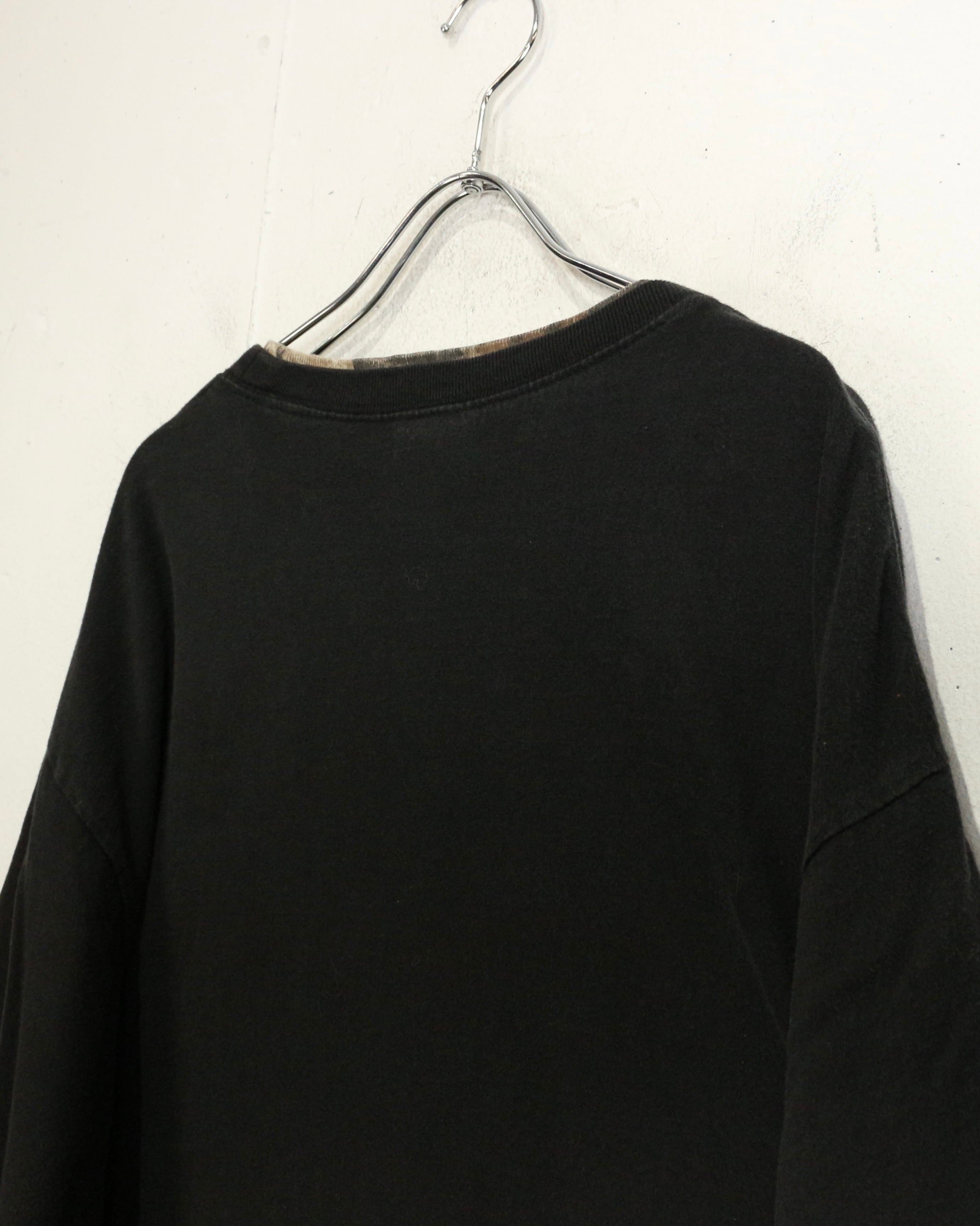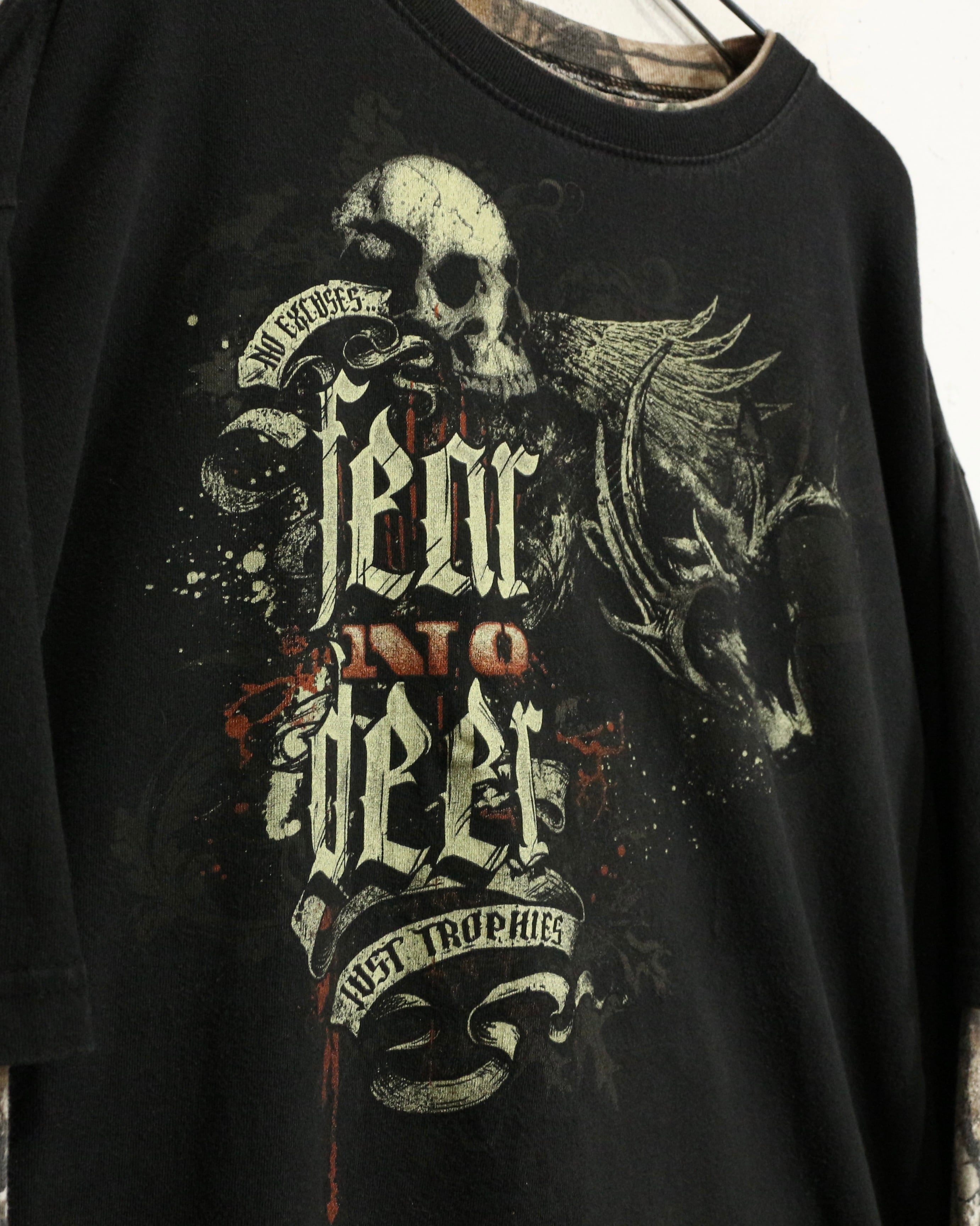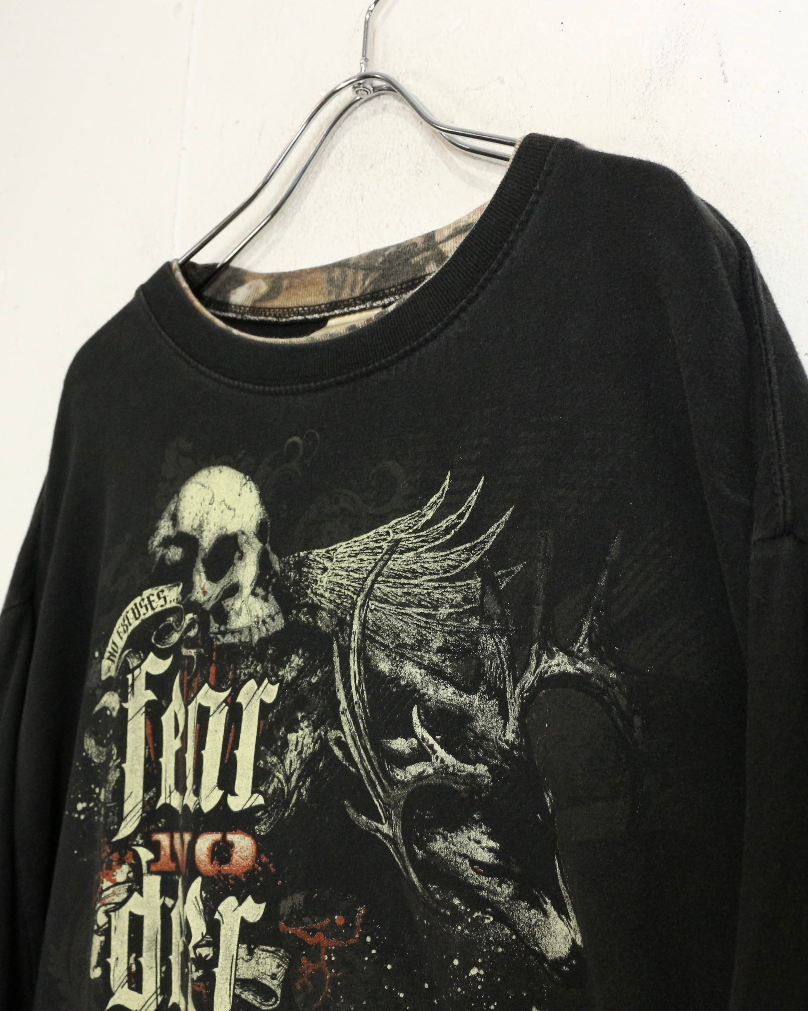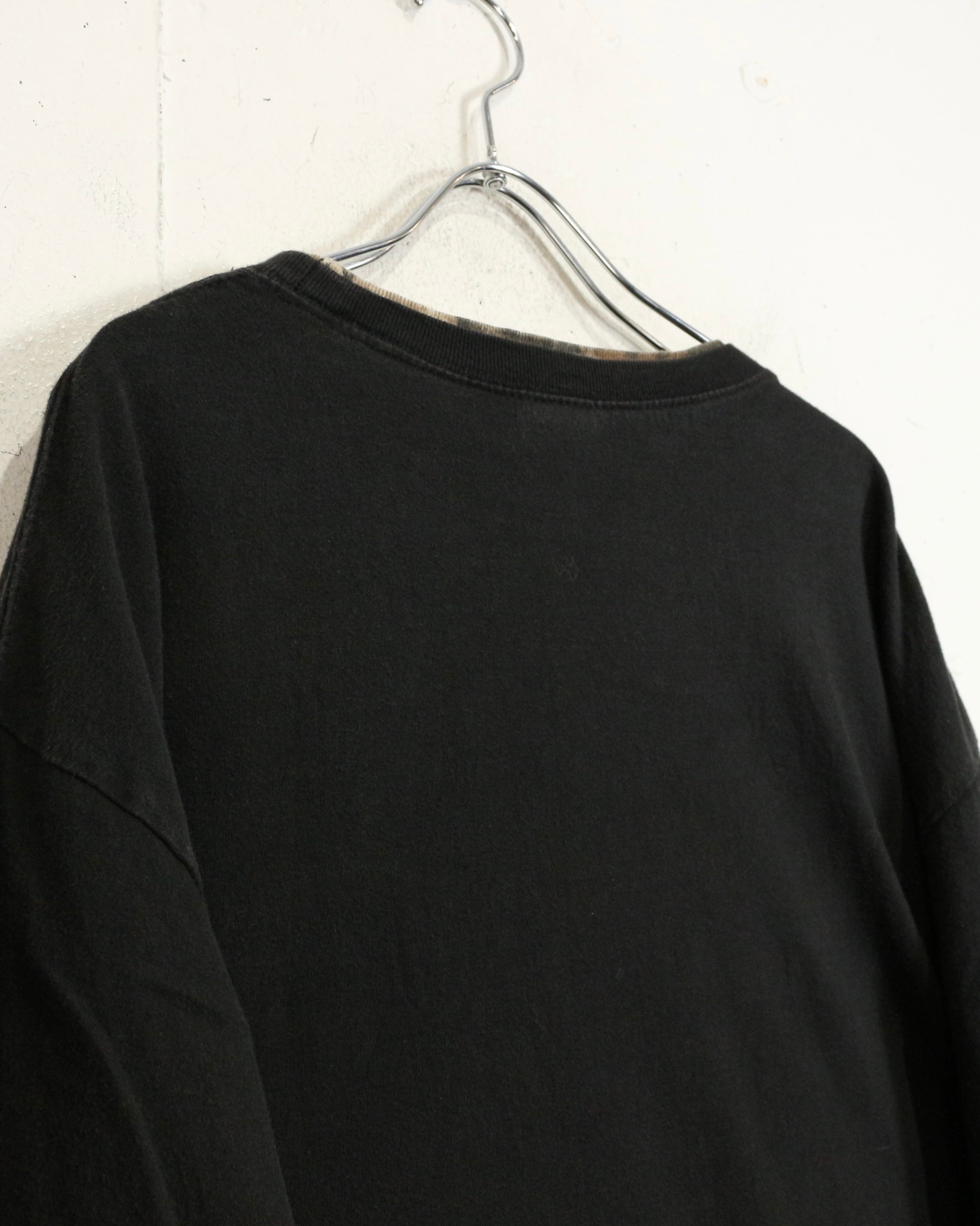 アーム部分にはリアルツリーカモを配したレイヤード風デザインを落とし込み、ブラックボディとのコントラストを強調。ここまでデザインが効いた古着のロンTはそう多くありません。