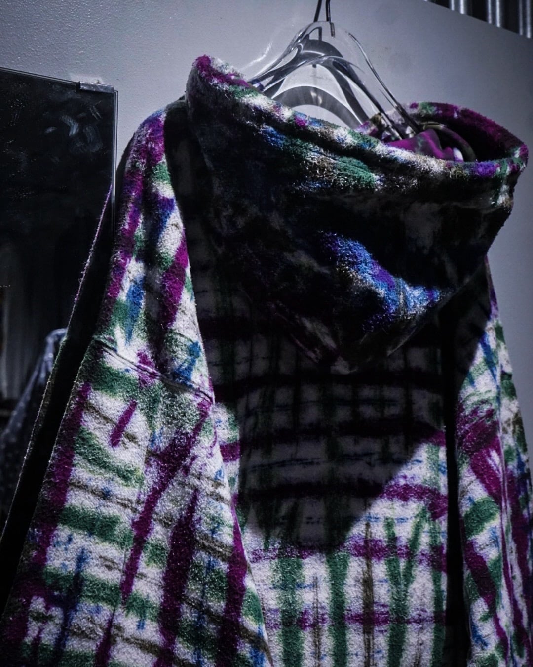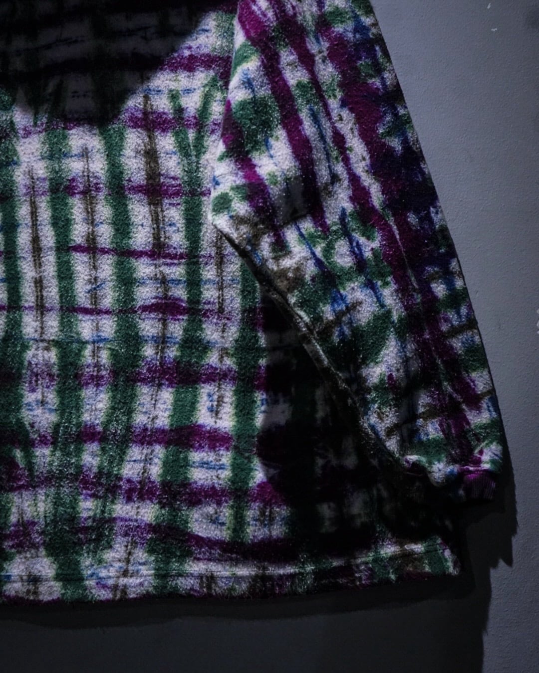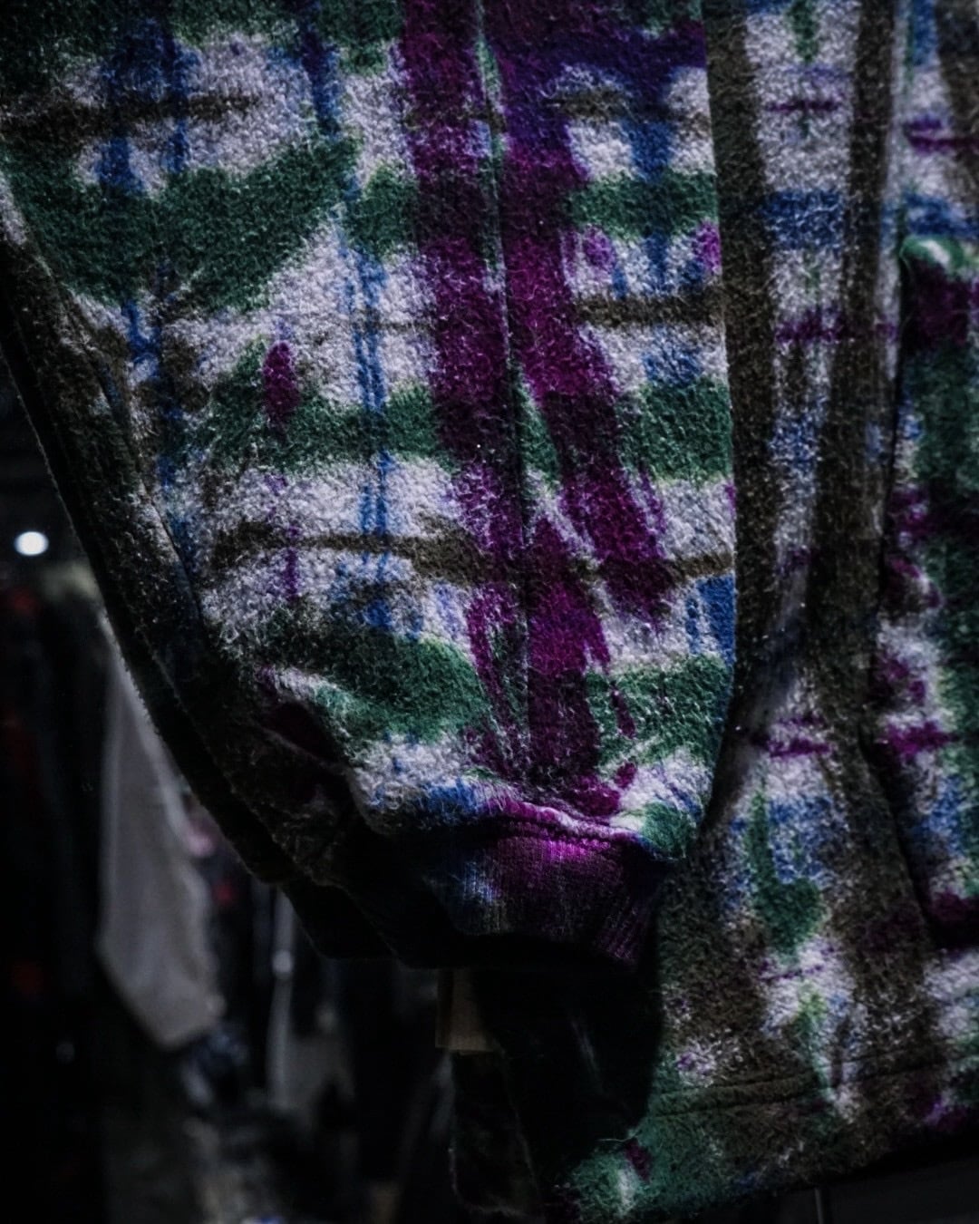ホワイトベースにパープル、グリーン、ブルーといった派手な配色のチェックを手描きのように染めたパターン。起毛感のある柔らかなフリース地は見た目にも暖かく、空気を含んだふっくらとした質感が魅力。
