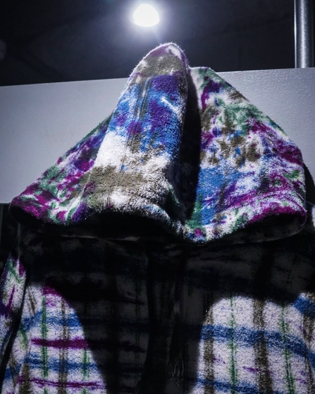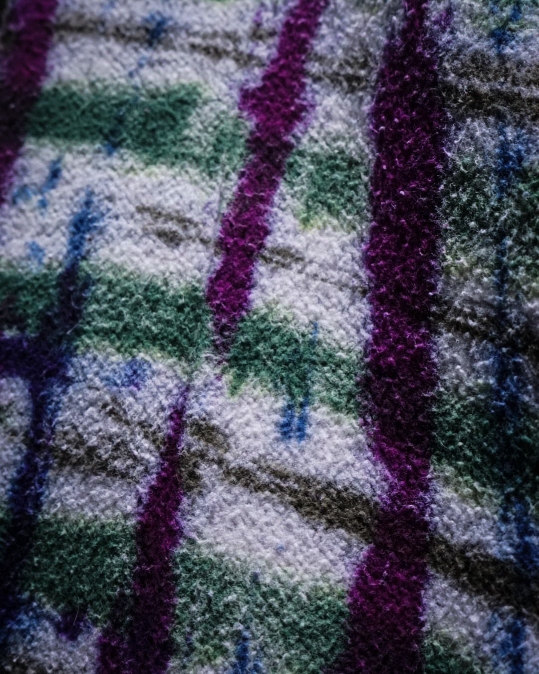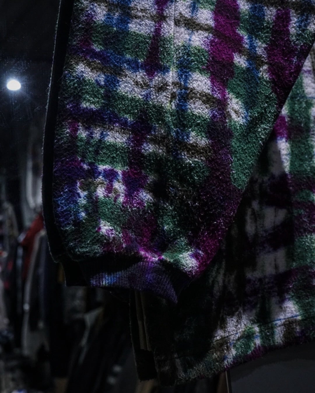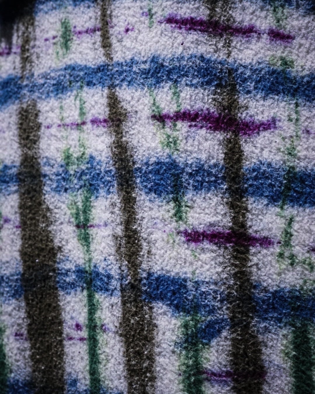 ホワイトベースにパープル、グリーン、ブルーといった派手な配色のチェックを手描きのように染めたパターン。起毛感のある柔らかなフリース地は見た目にも暖かく、空気を含んだふっくらとした質感が魅力。
