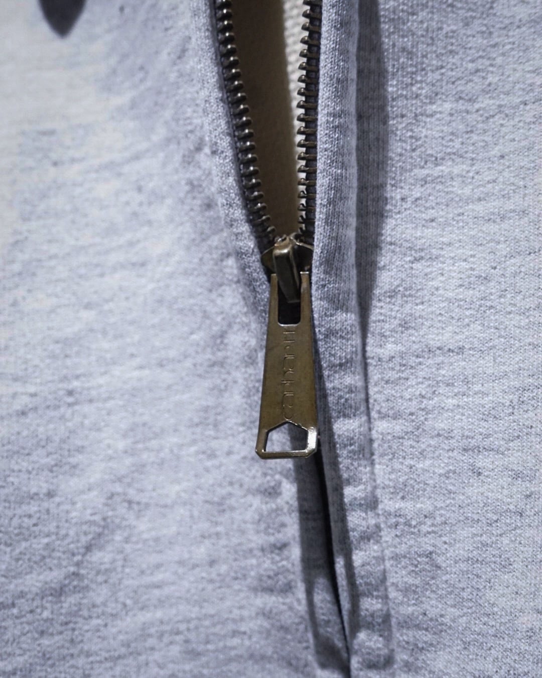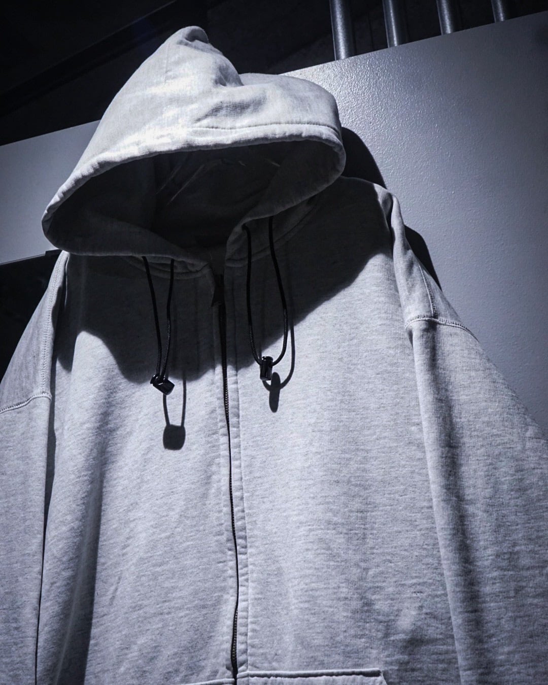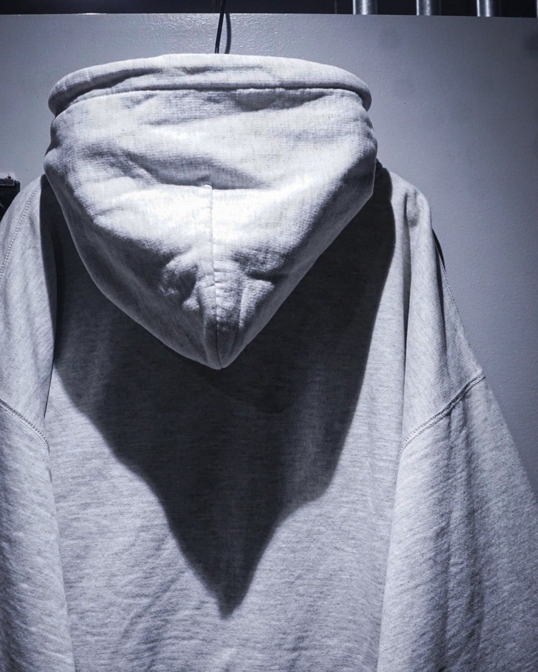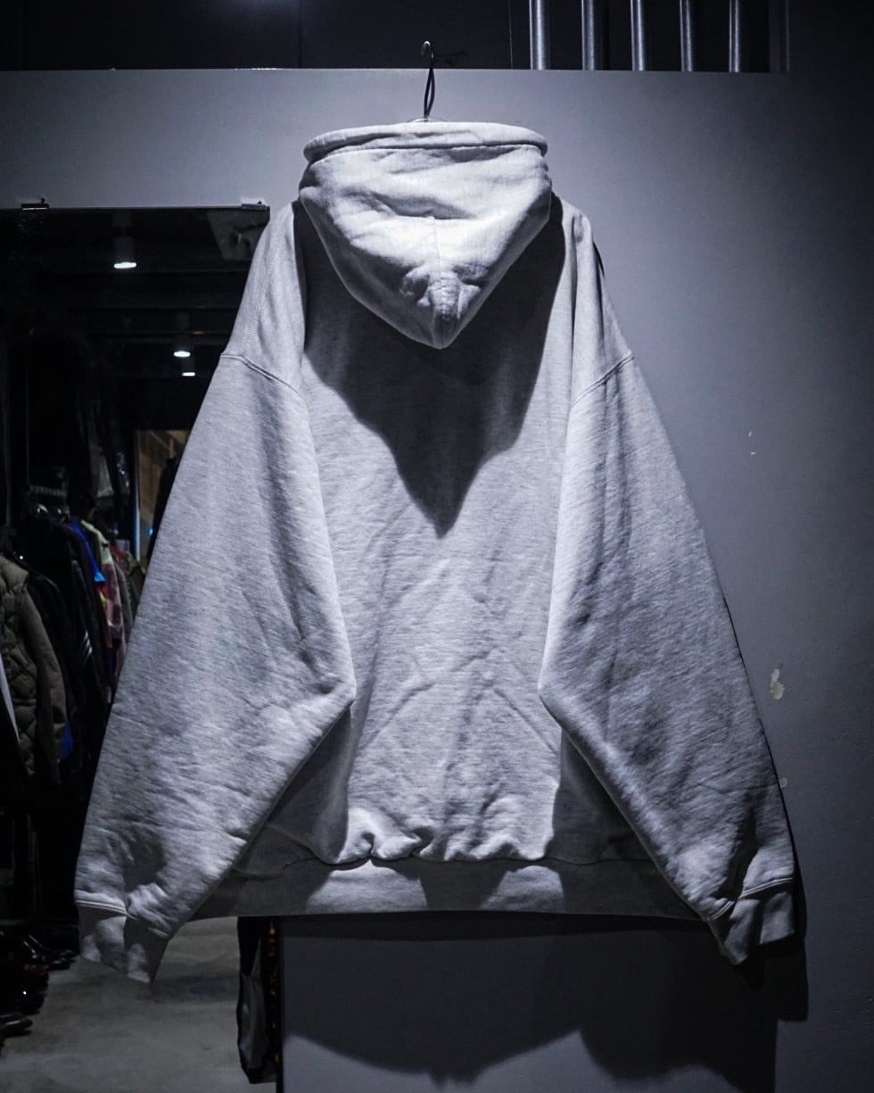 ボディは柔らかなグレーカラー。肉厚なコットンスウェット生地は程よい重量感がありつつ、裏地はサーマルで保温性も確保。フロントはジップ仕様、カンガルーポケット付きの王道ディテール。ポケット付近にはブランドロゴをちっちゃくさりげなく携えており、オーバーなサイズ感とのギャップが非常にキュート。