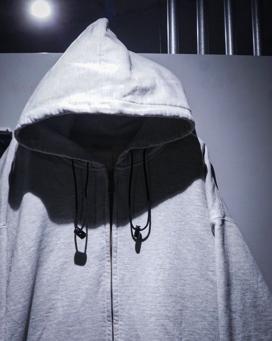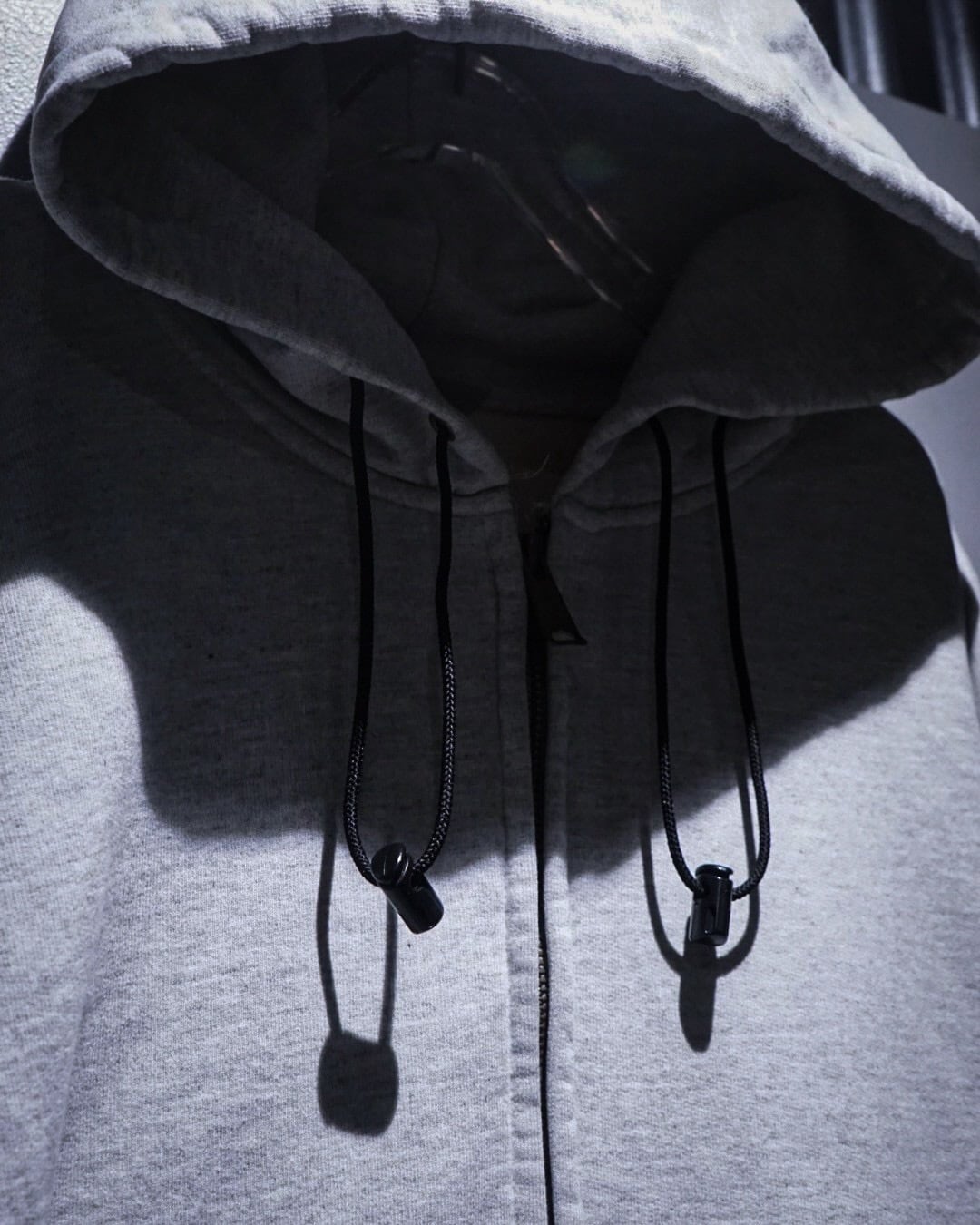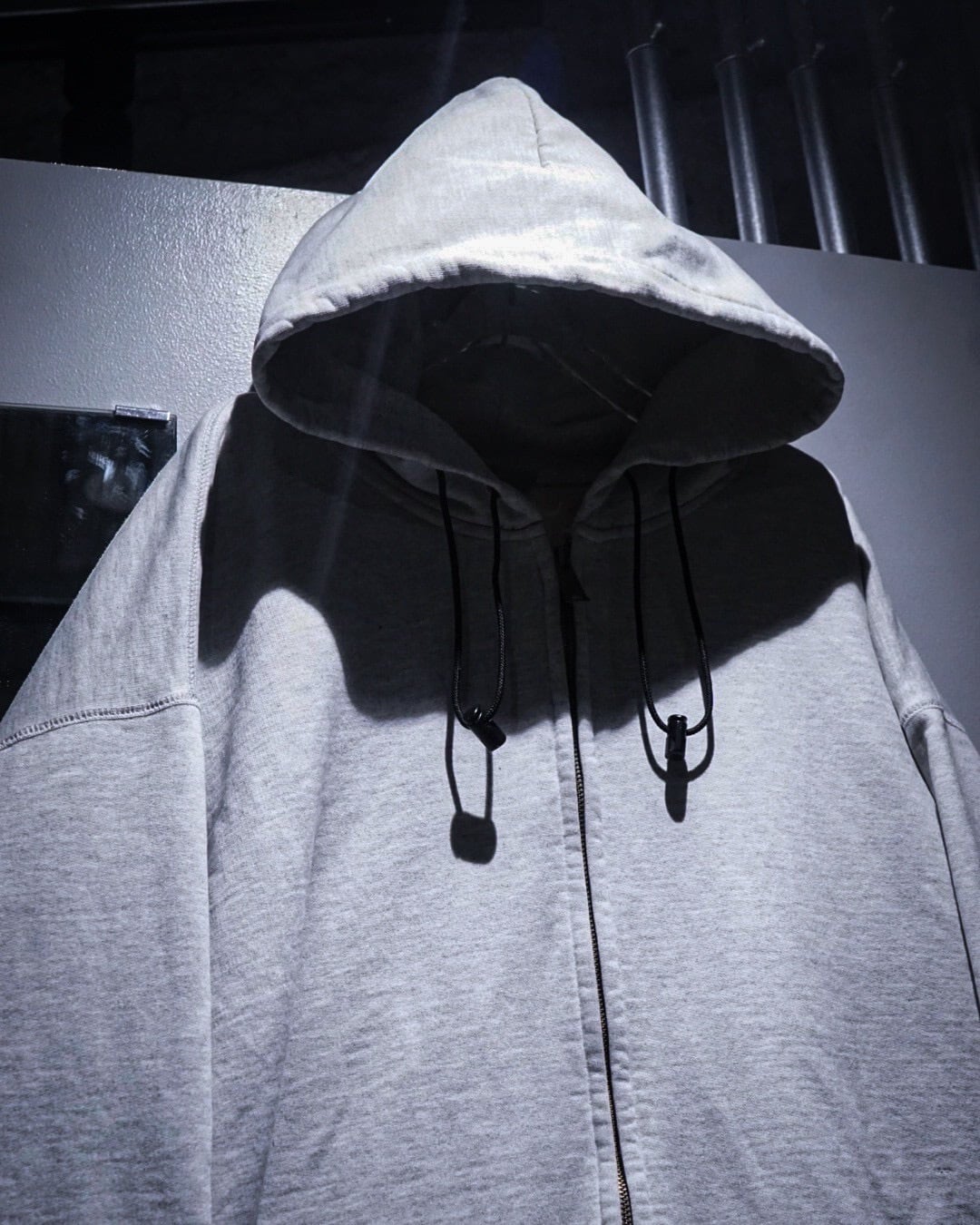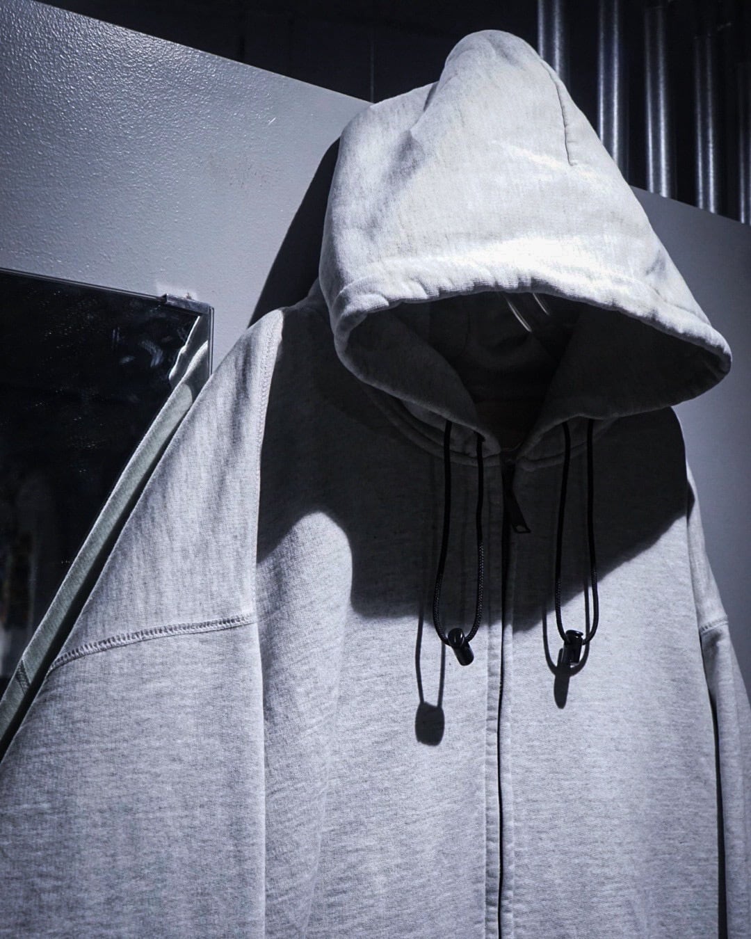 ボディは柔らかなグレーカラー。肉厚なコットンスウェット生地は程よい重量感がありつつ、裏地はサーマルで保温性も確保。フロントはジップ仕様、カンガルーポケット付きの王道ディテール。ポケット付近にはブランドロゴをちっちゃくさりげなく携えており、オーバーなサイズ感とのギャップが非常にキュート。