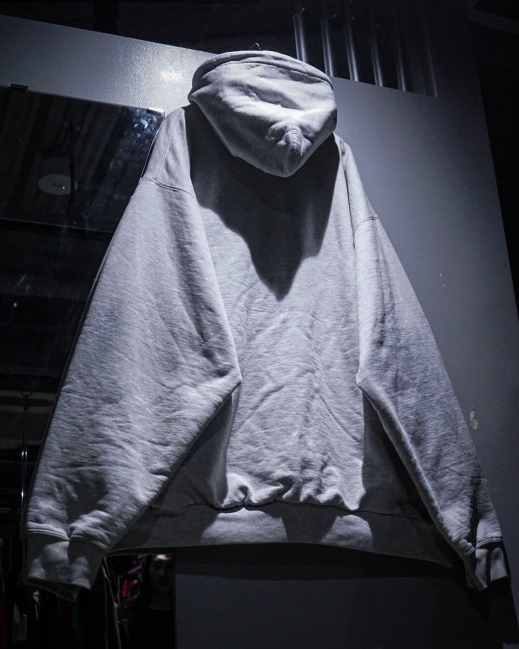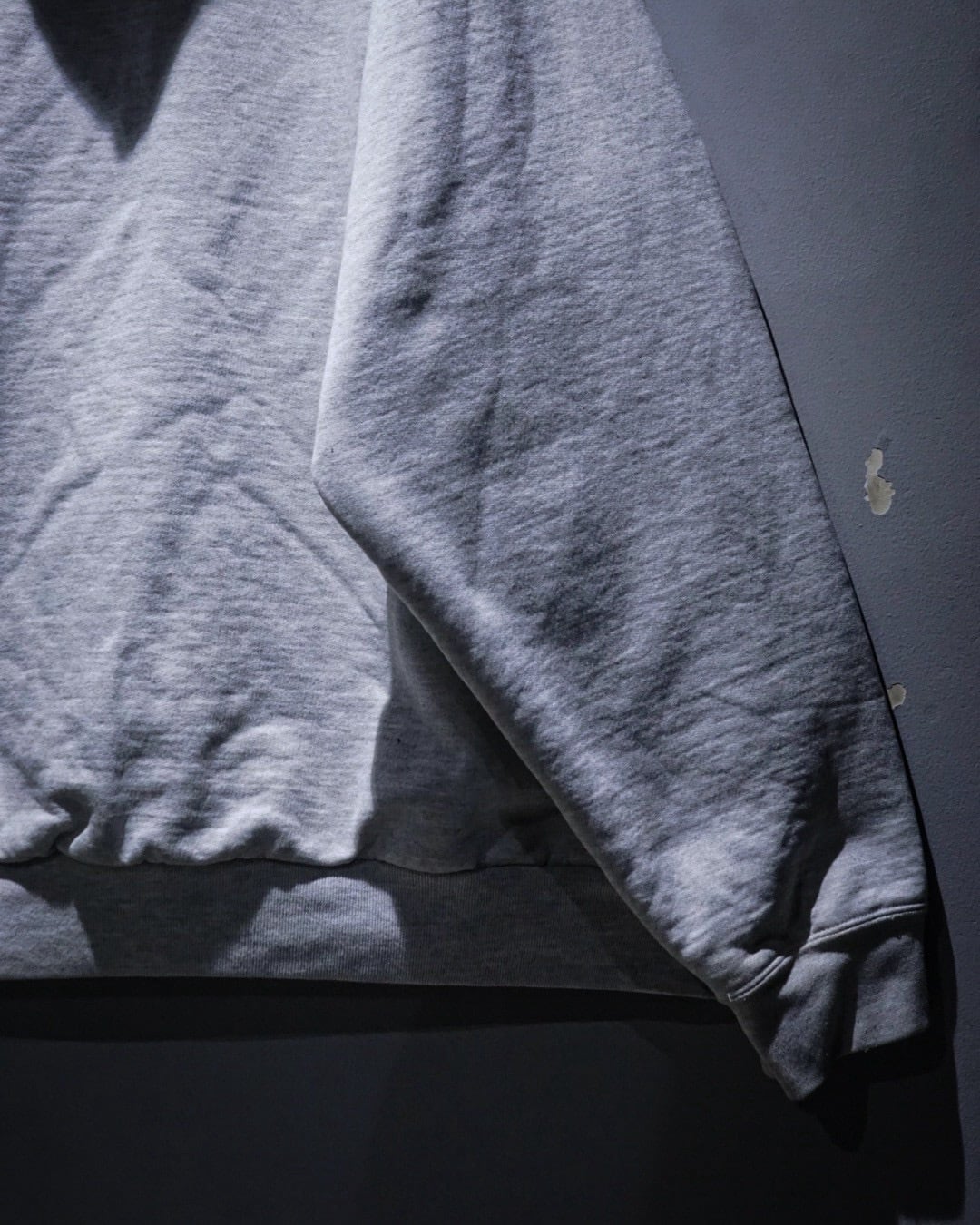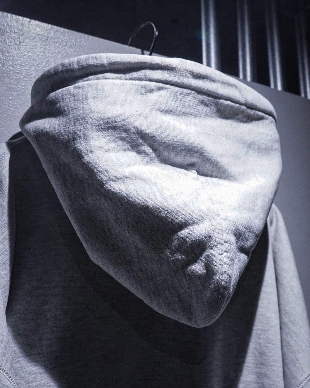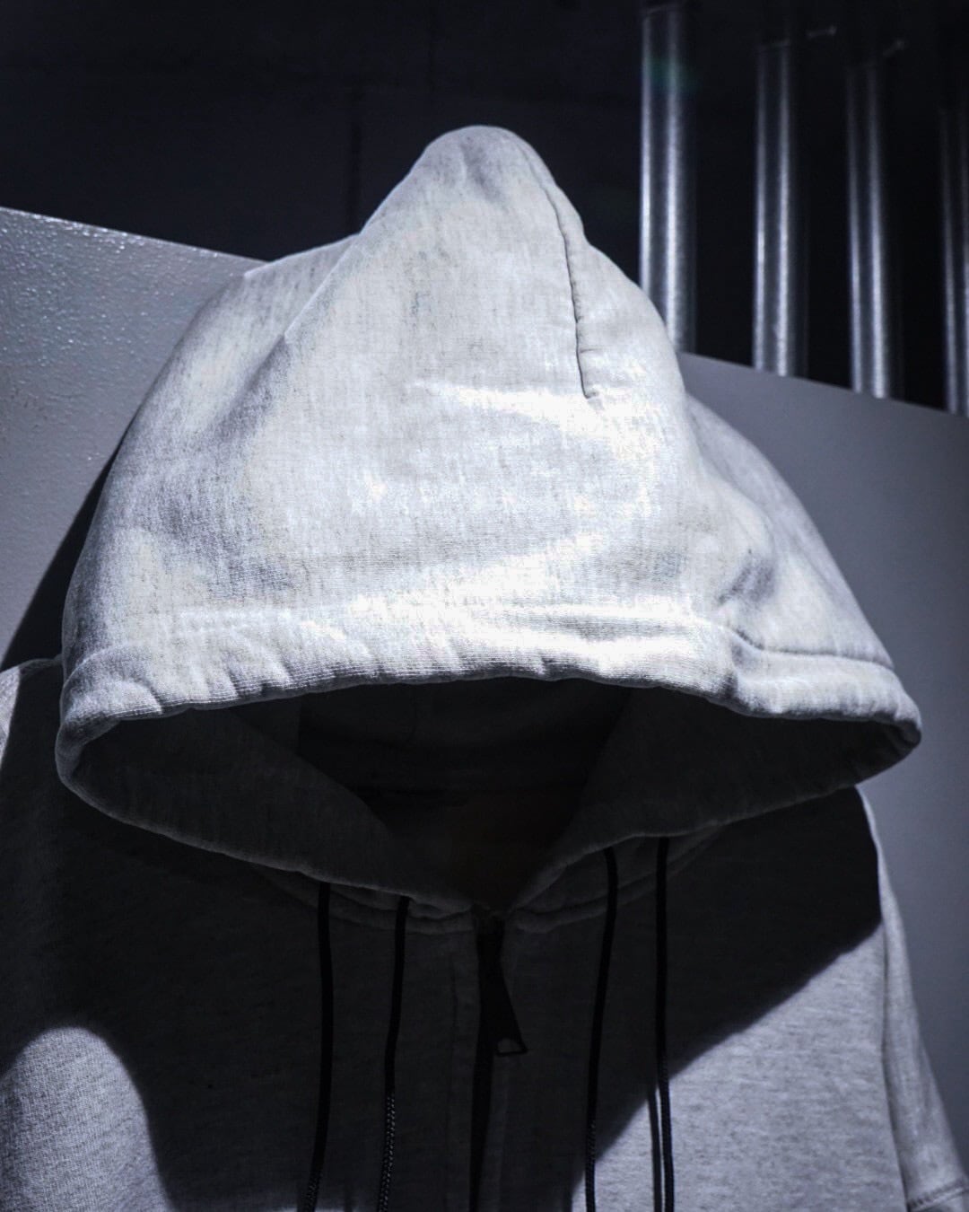 ボディは柔らかなグレーカラー。肉厚なコットンスウェット生地は程よい重量感がありつつ、裏地はサーマルで保温性も確保。フロントはジップ仕様、カンガルーポケット付きの王道ディテール。ポケット付近にはブランドロゴをちっちゃくさりげなく携えており、オーバーなサイズ感とのギャップが非常にキュート。