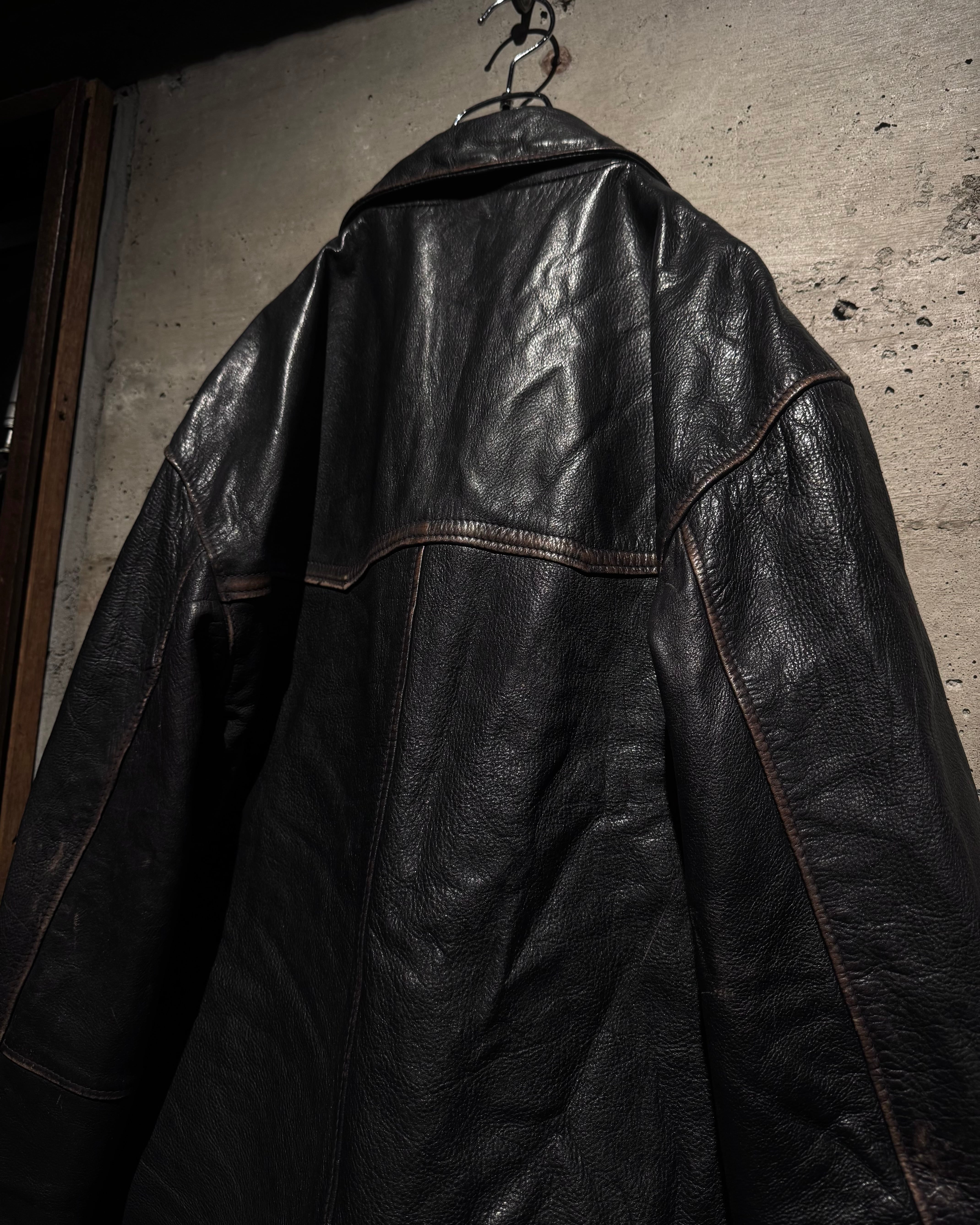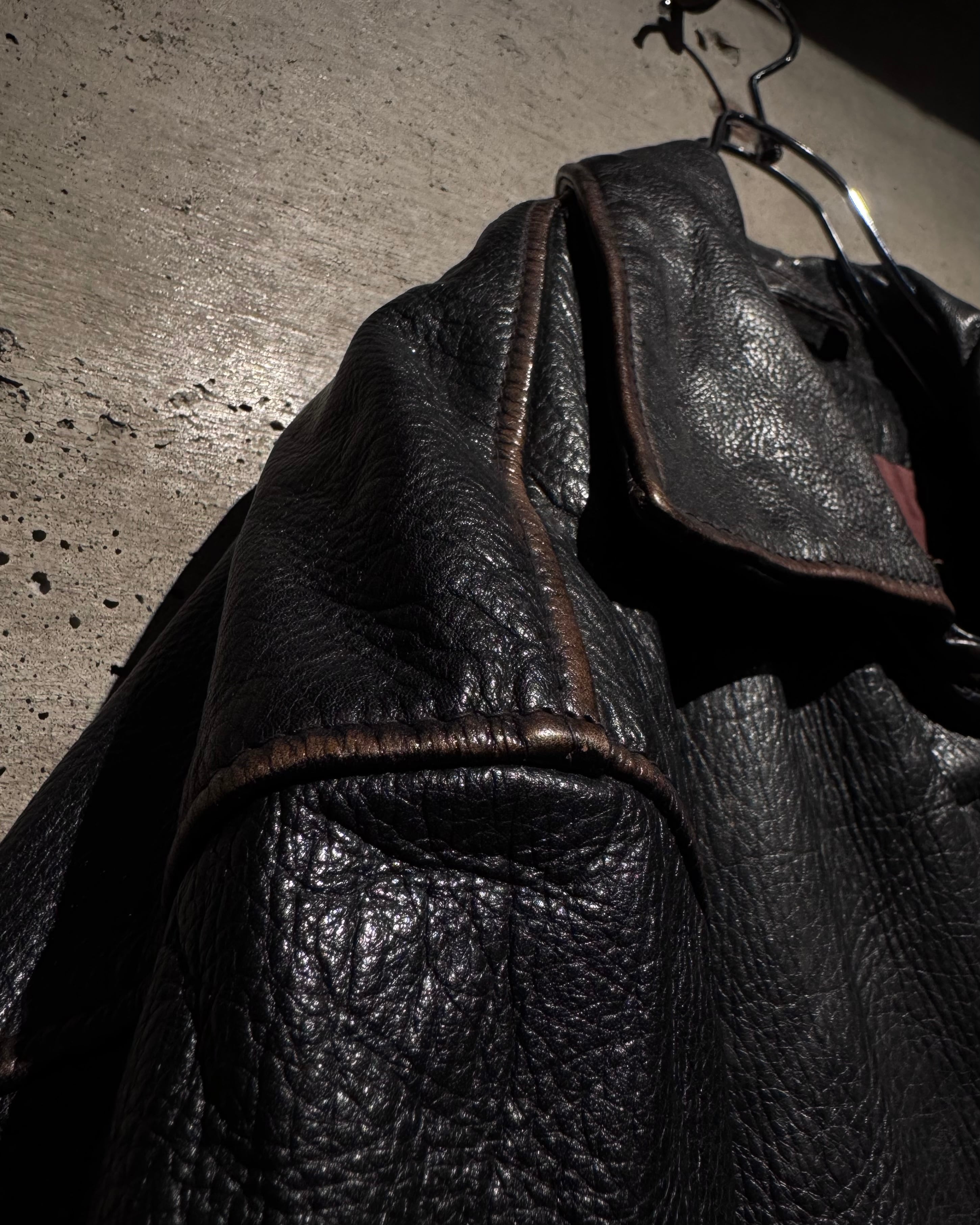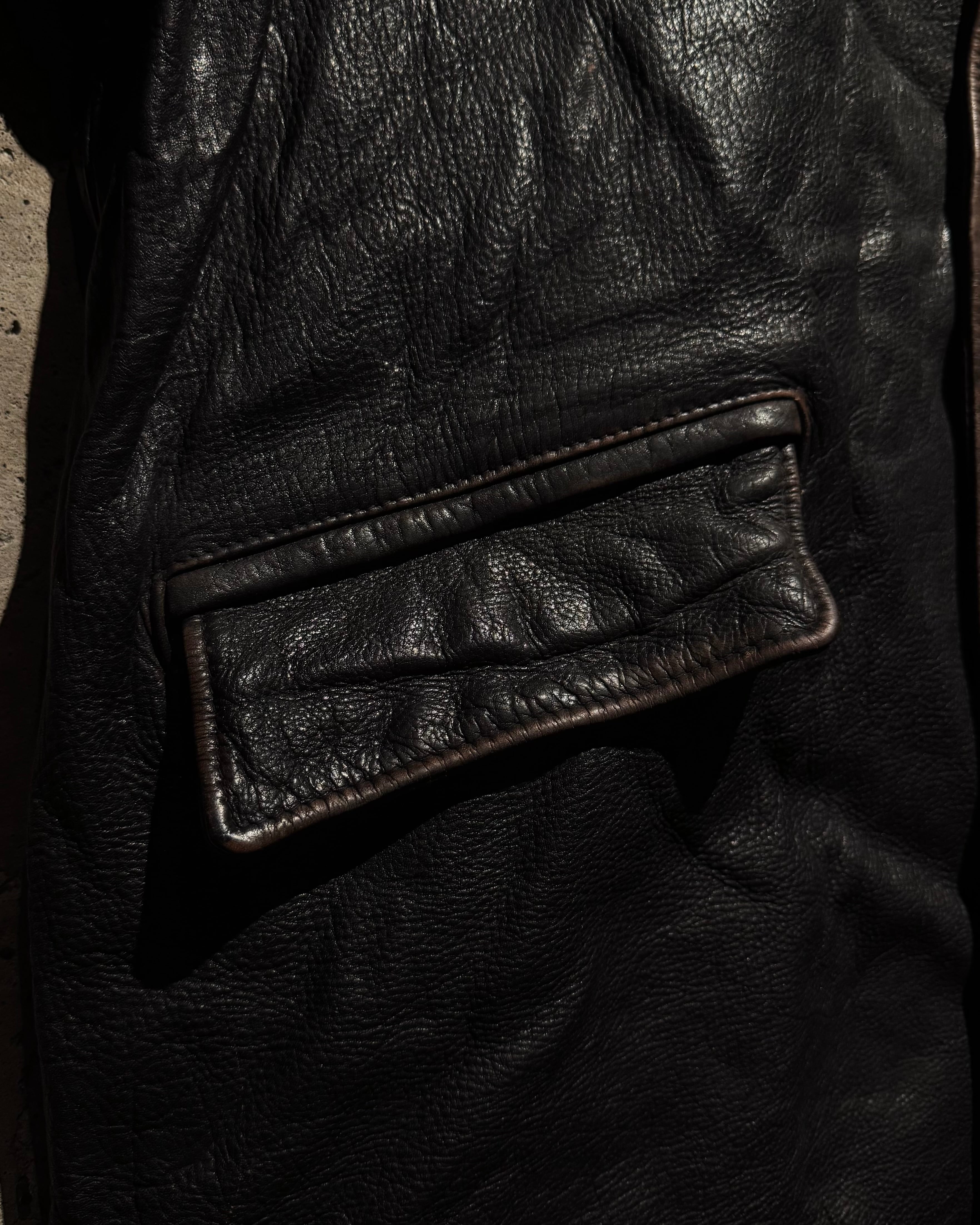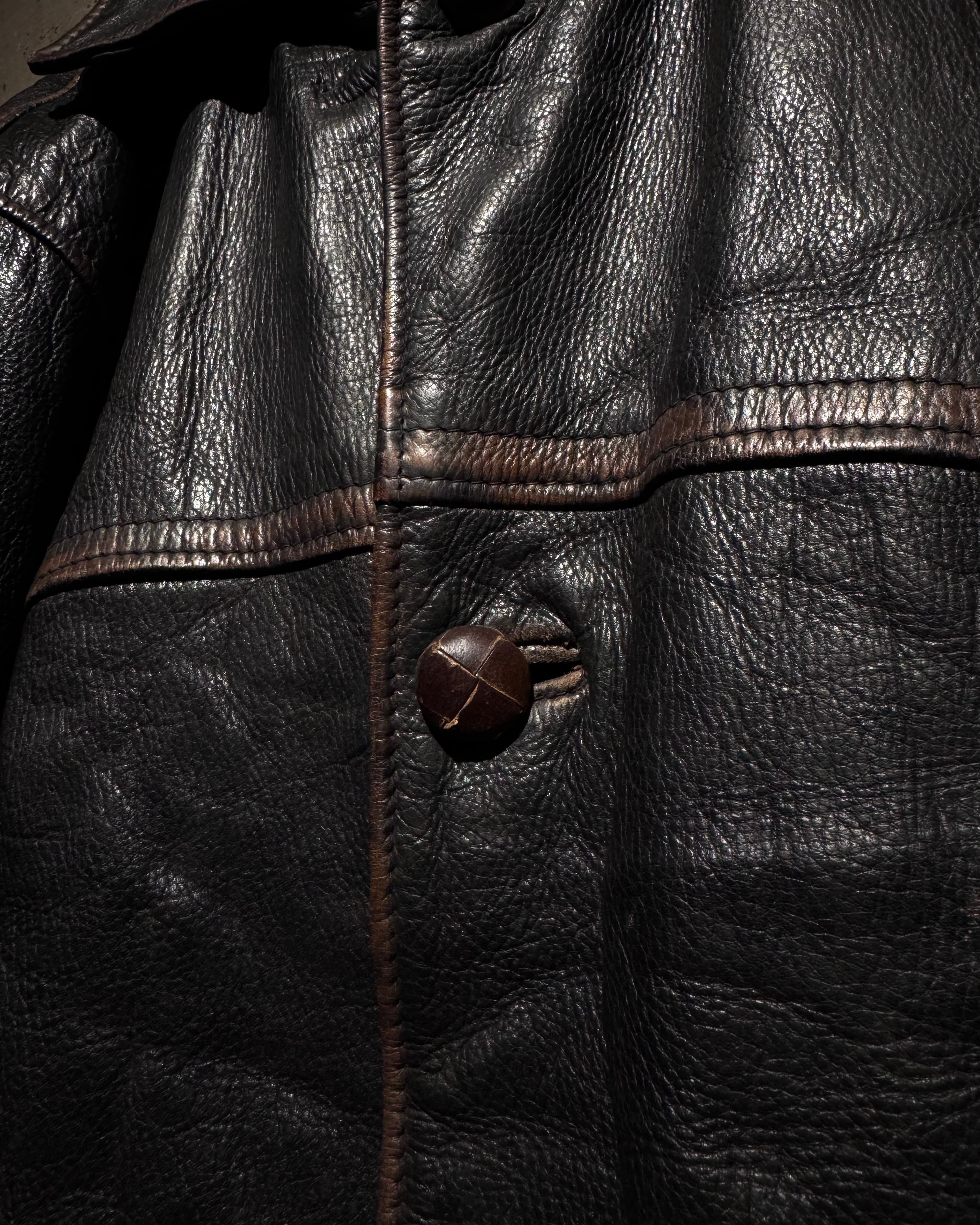革の芯に茶色を仕込んだ“茶芯”レザーを使用した、奥行きと立体感のある表情を見せる重厚なレザーカーコート。