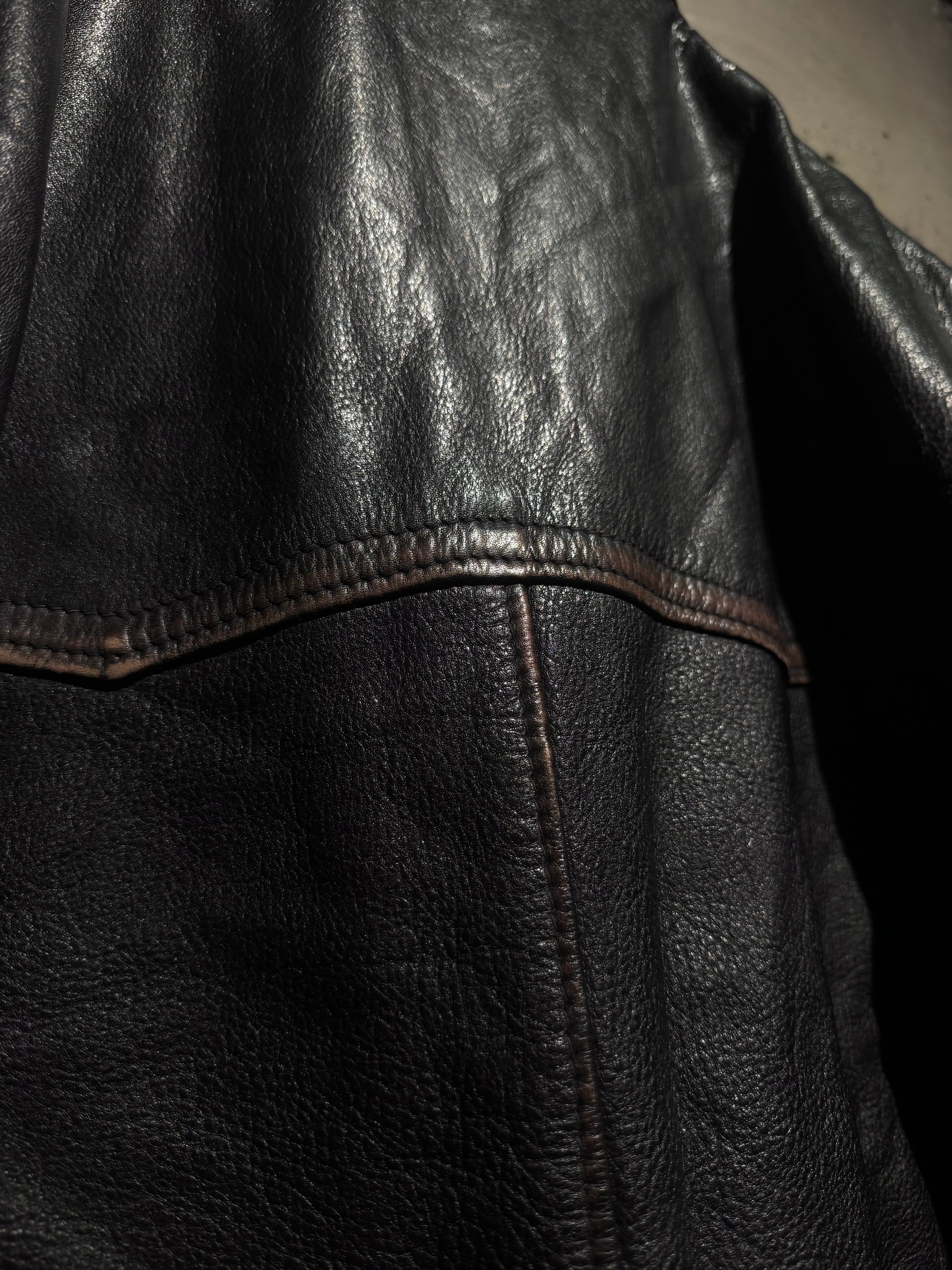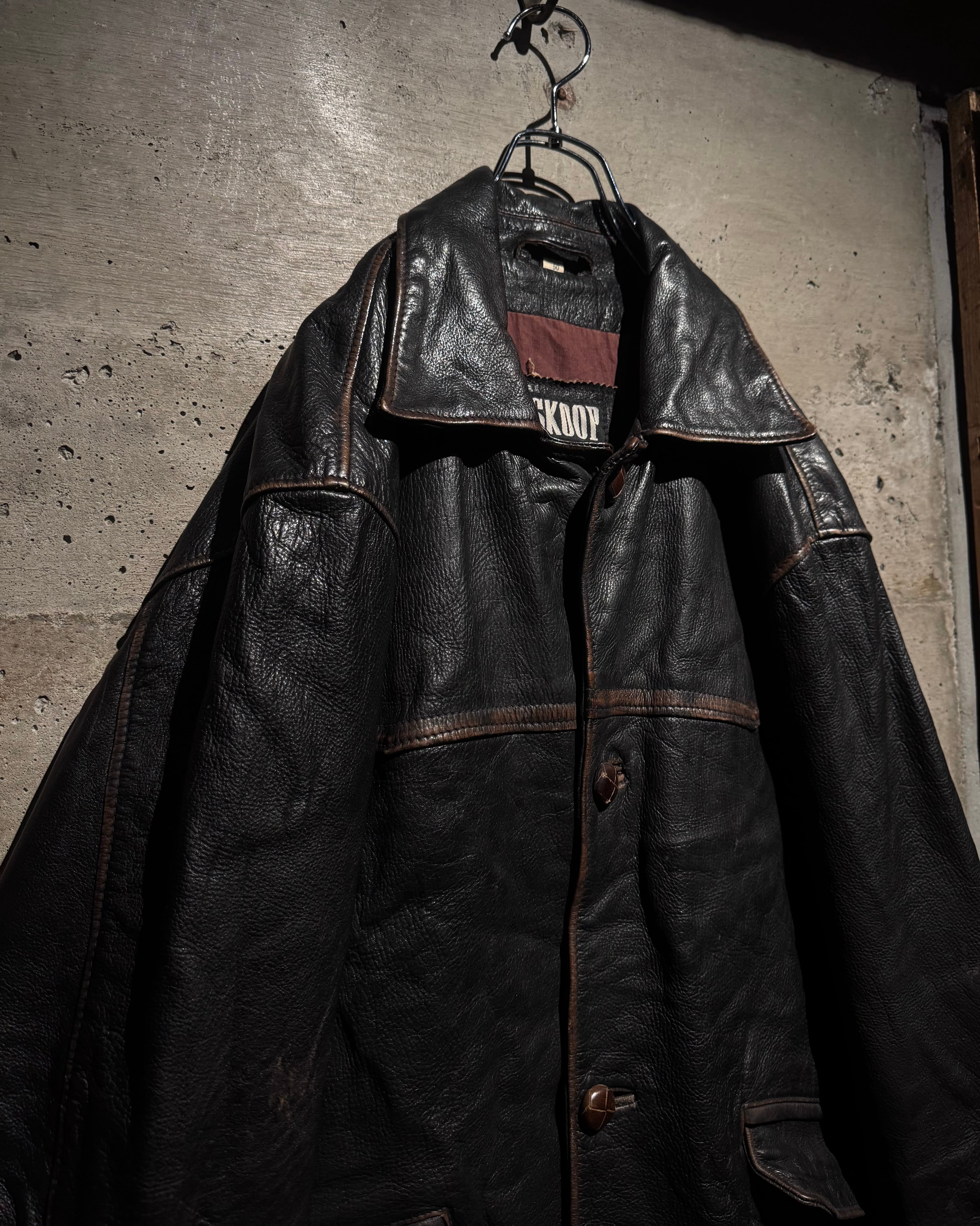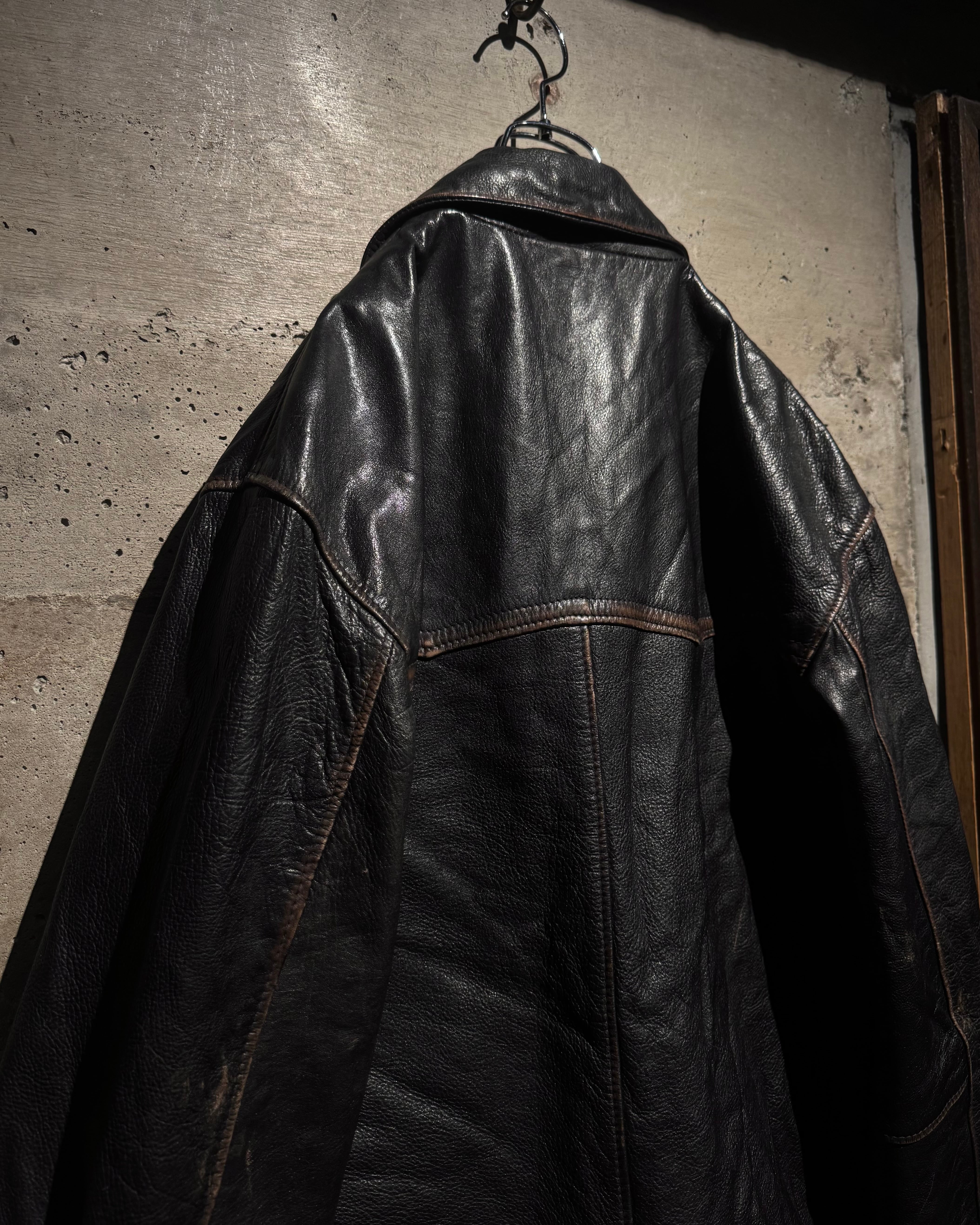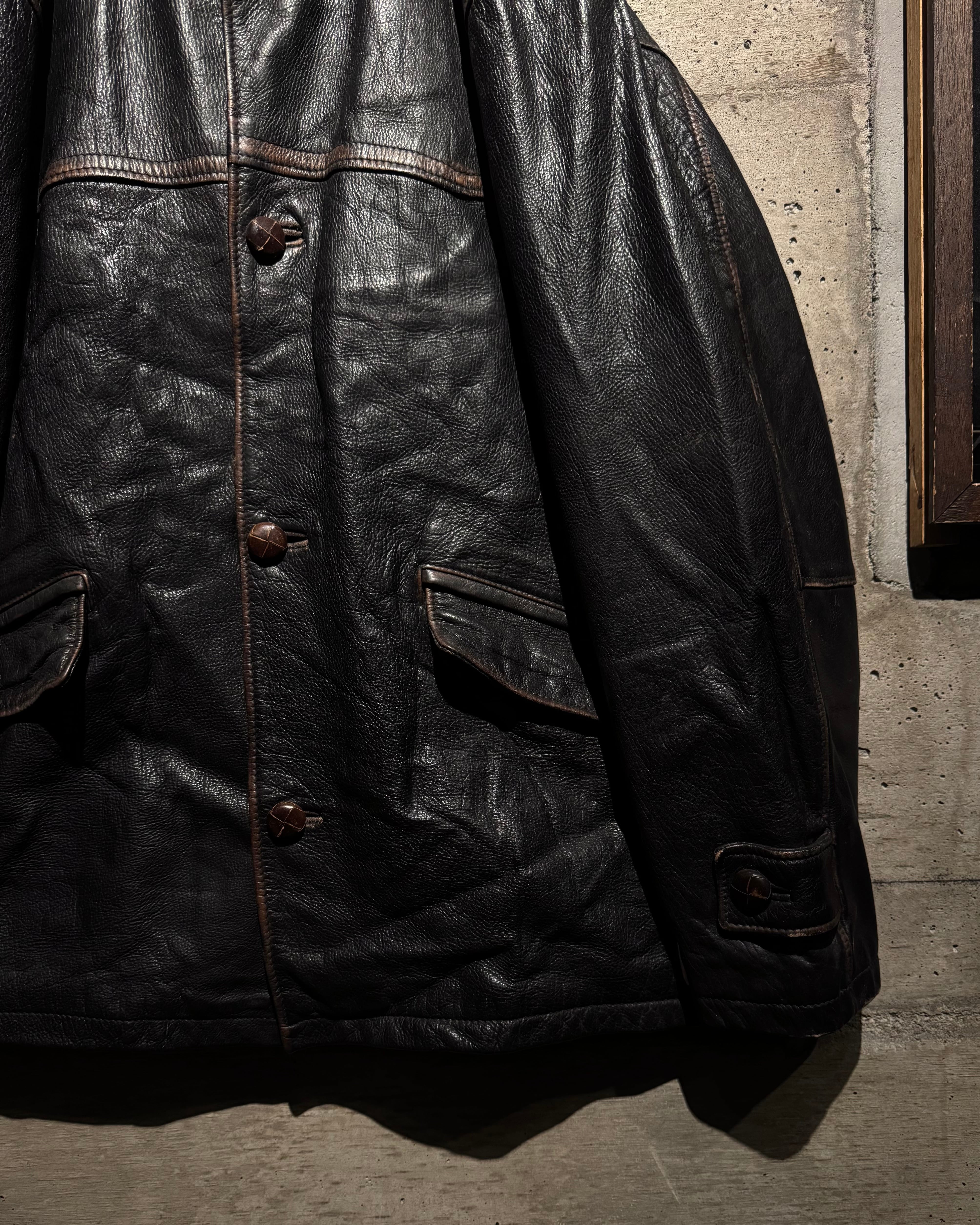 革の芯に茶色を仕込んだ“茶芯”レザーを使用した、奥行きと立体感のある表情を見せる重厚なレザーカーコート。