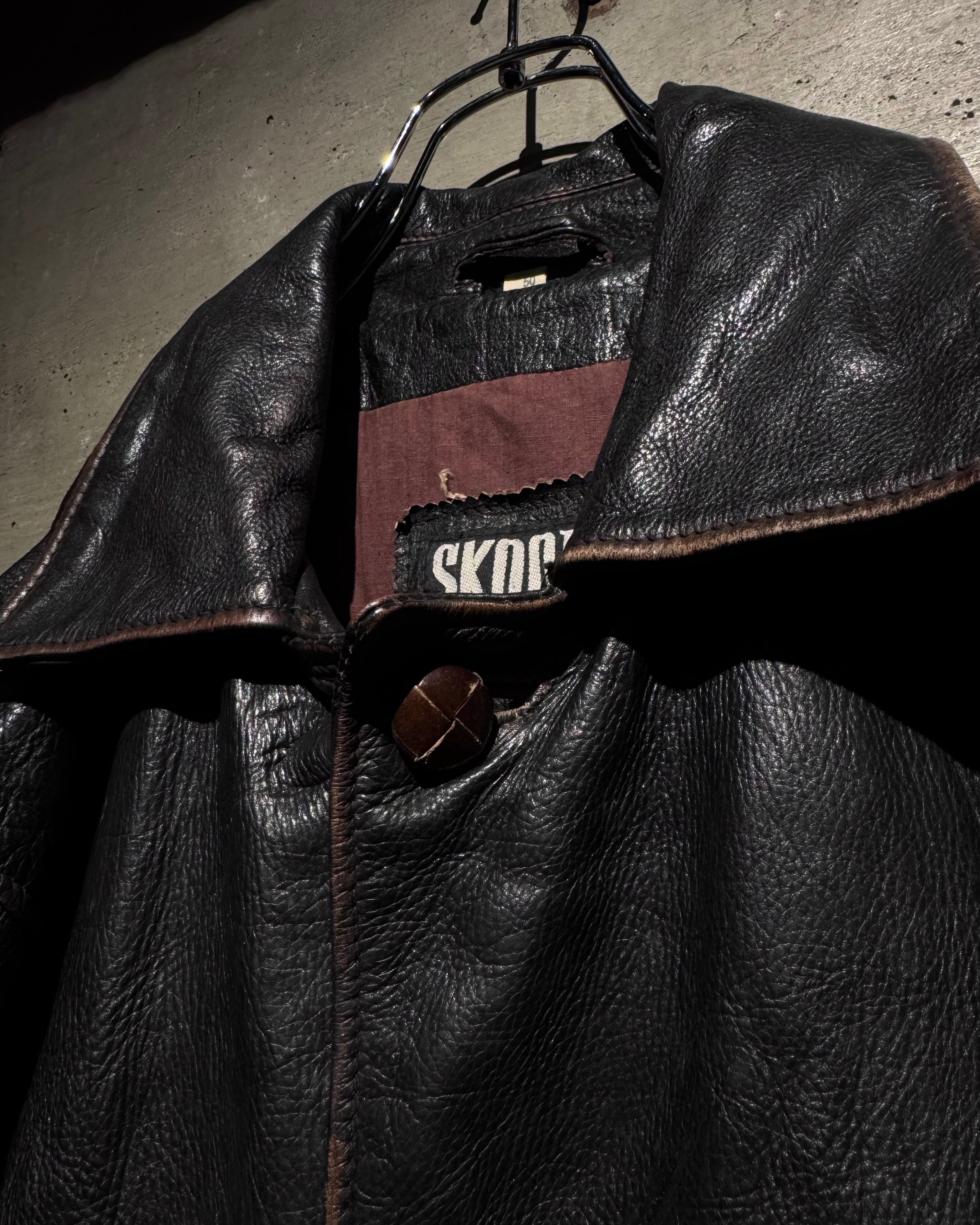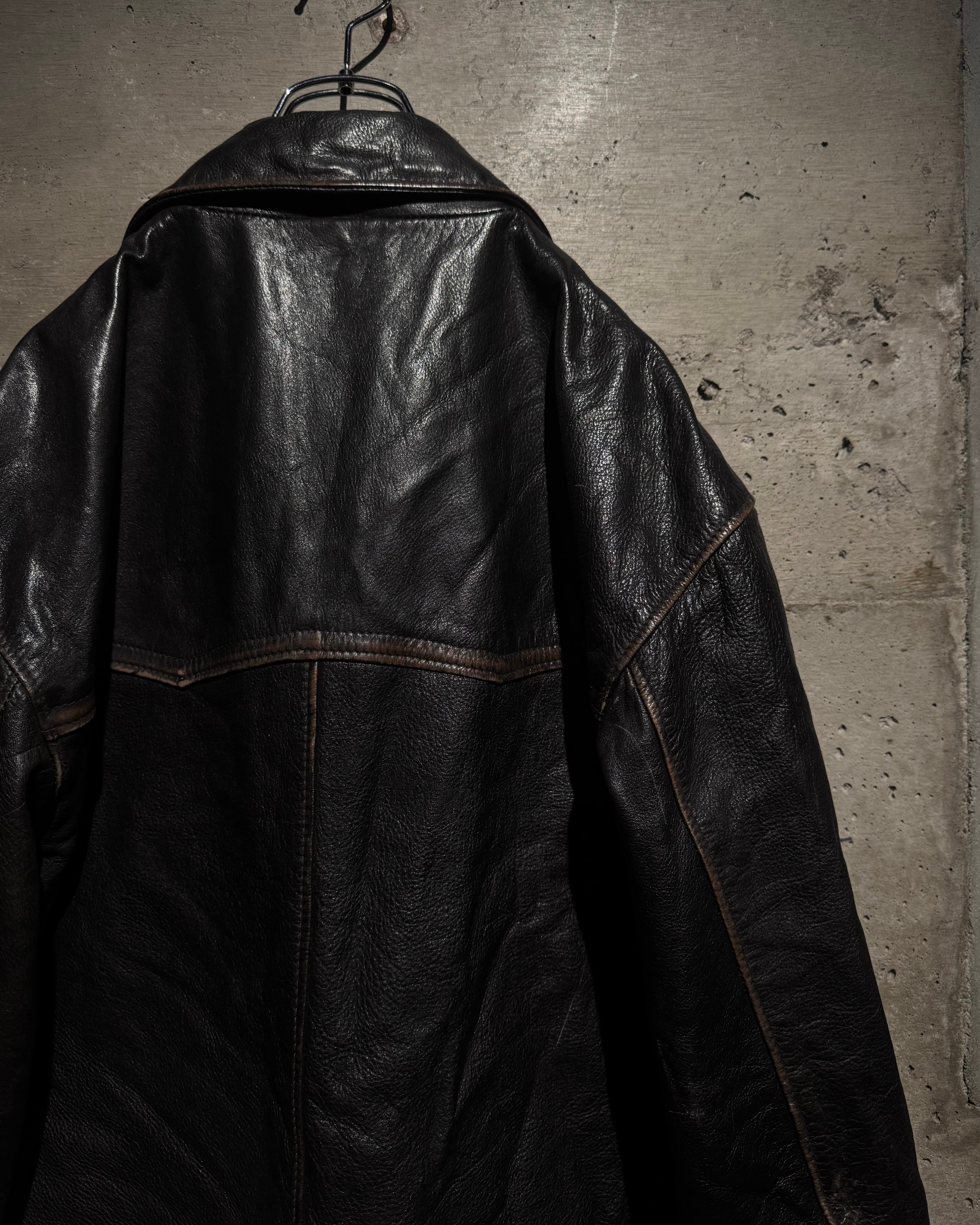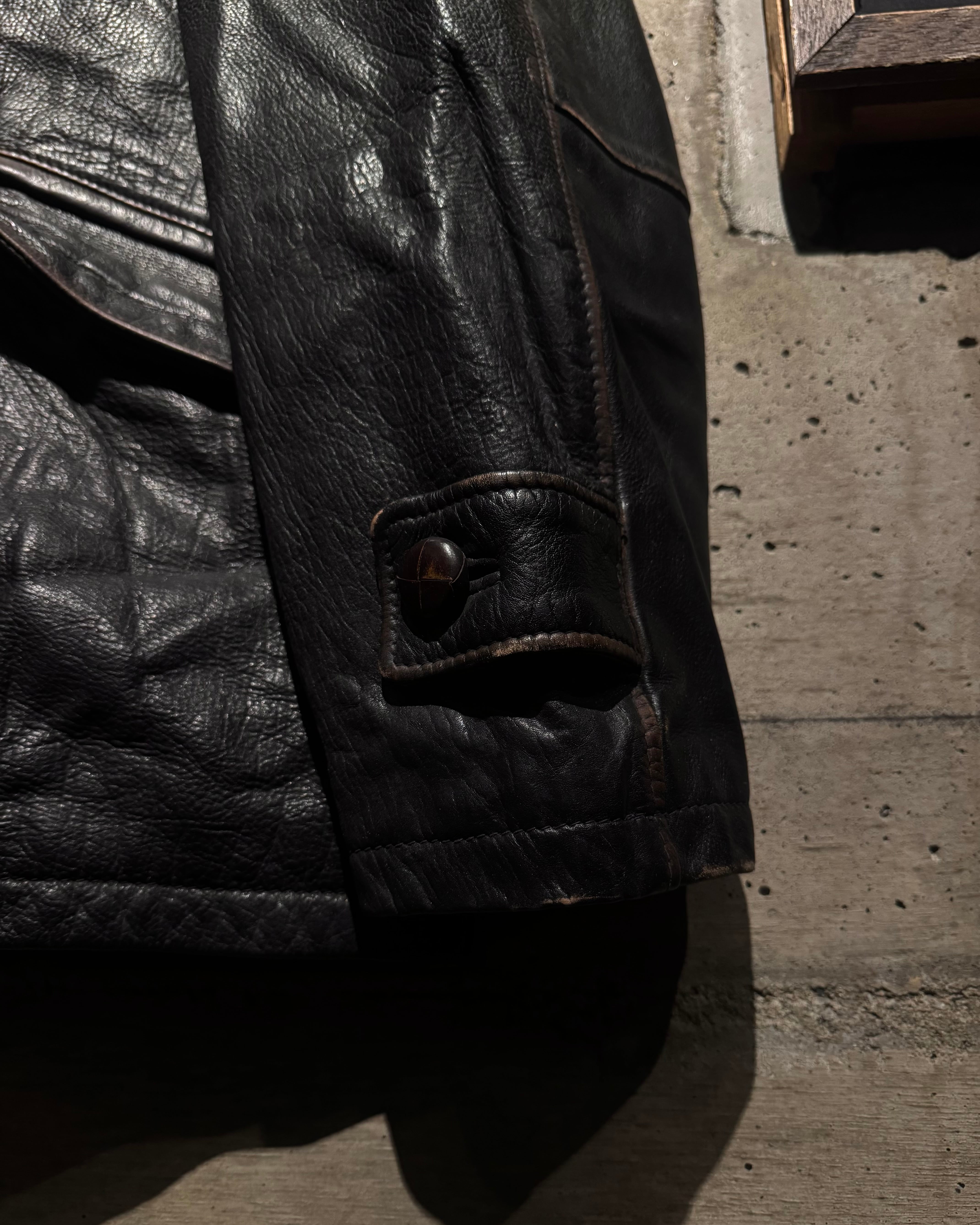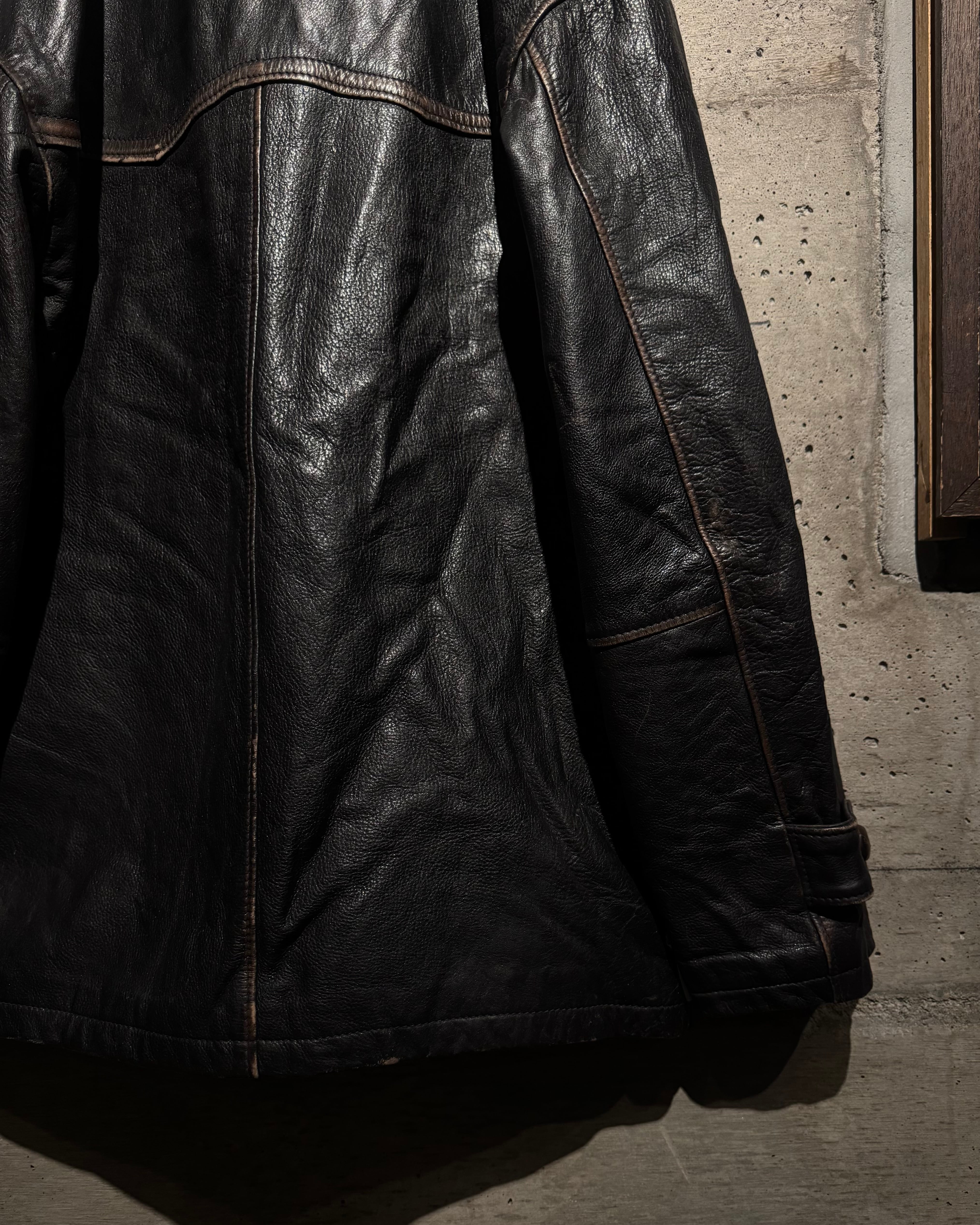 革の芯に茶色を仕込んだ“茶芯”レザーを使用した、奥行きと立体感のある表情を見せる重厚なレザーカーコート。