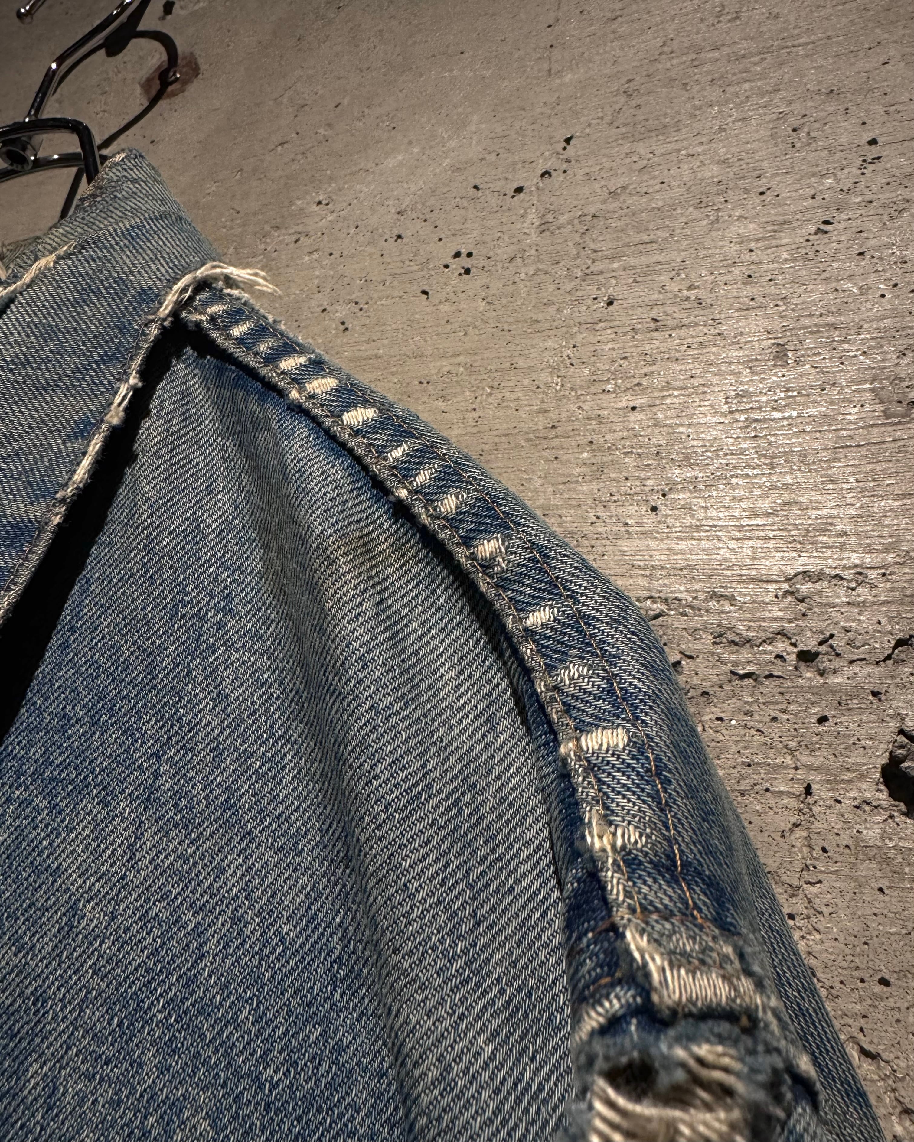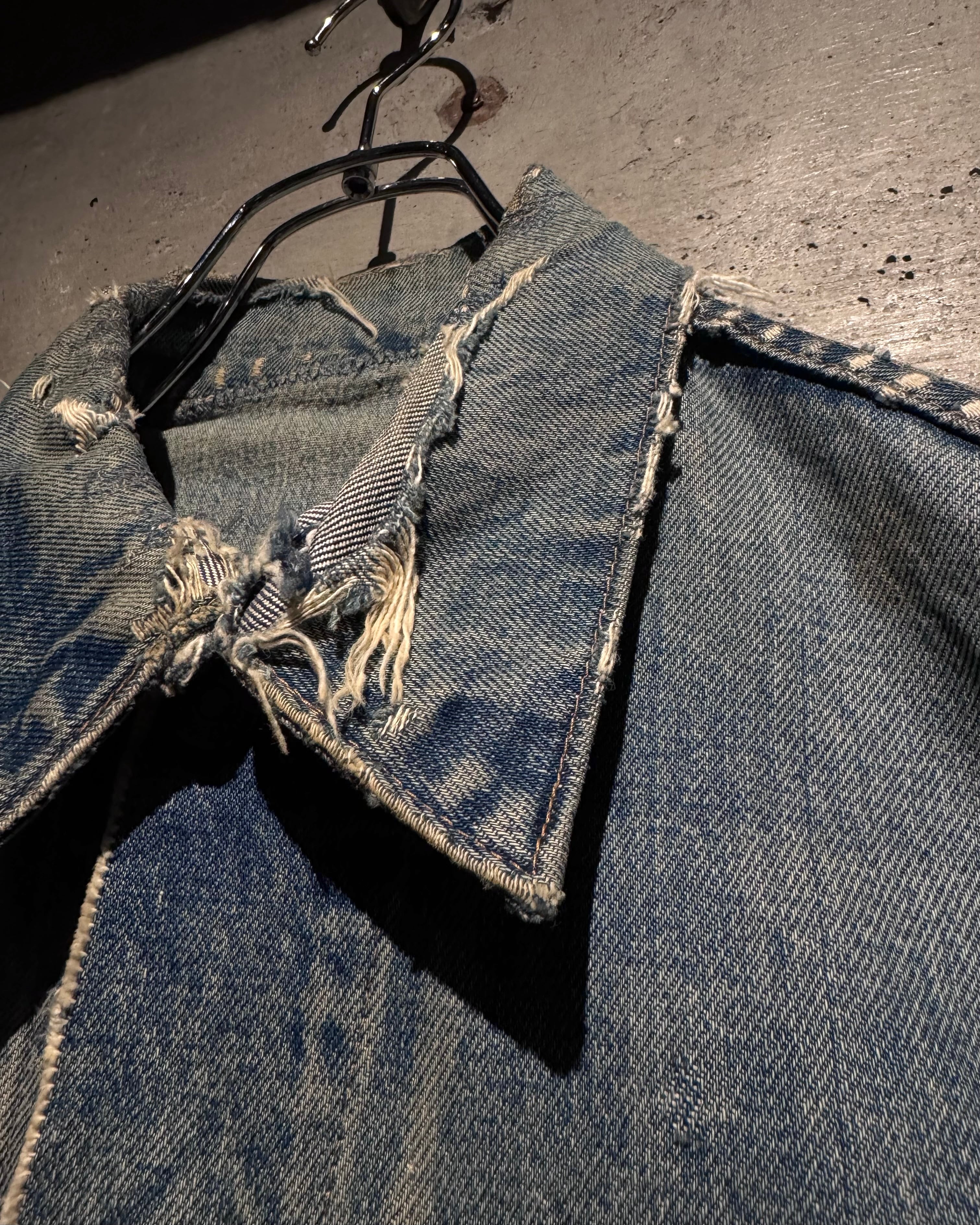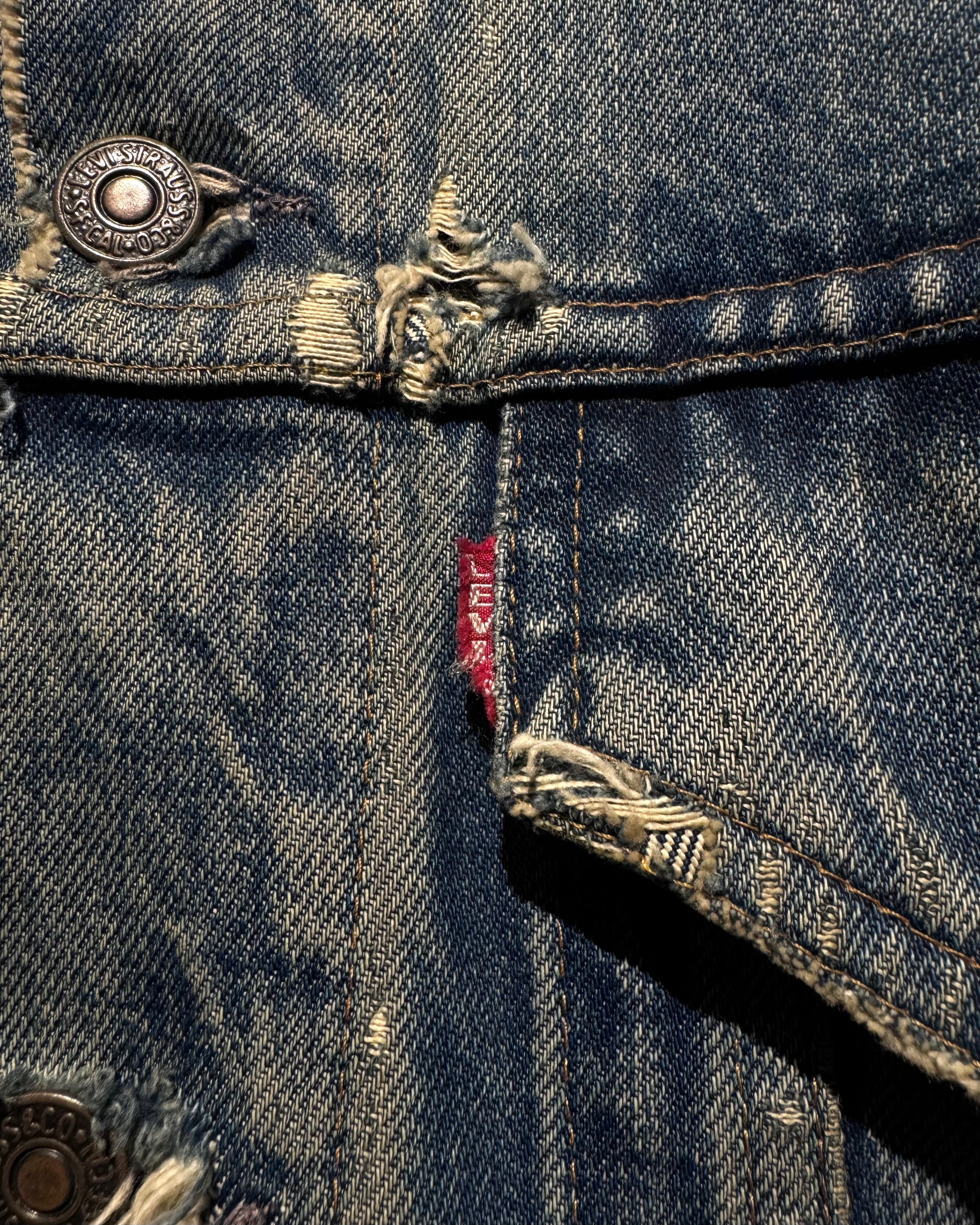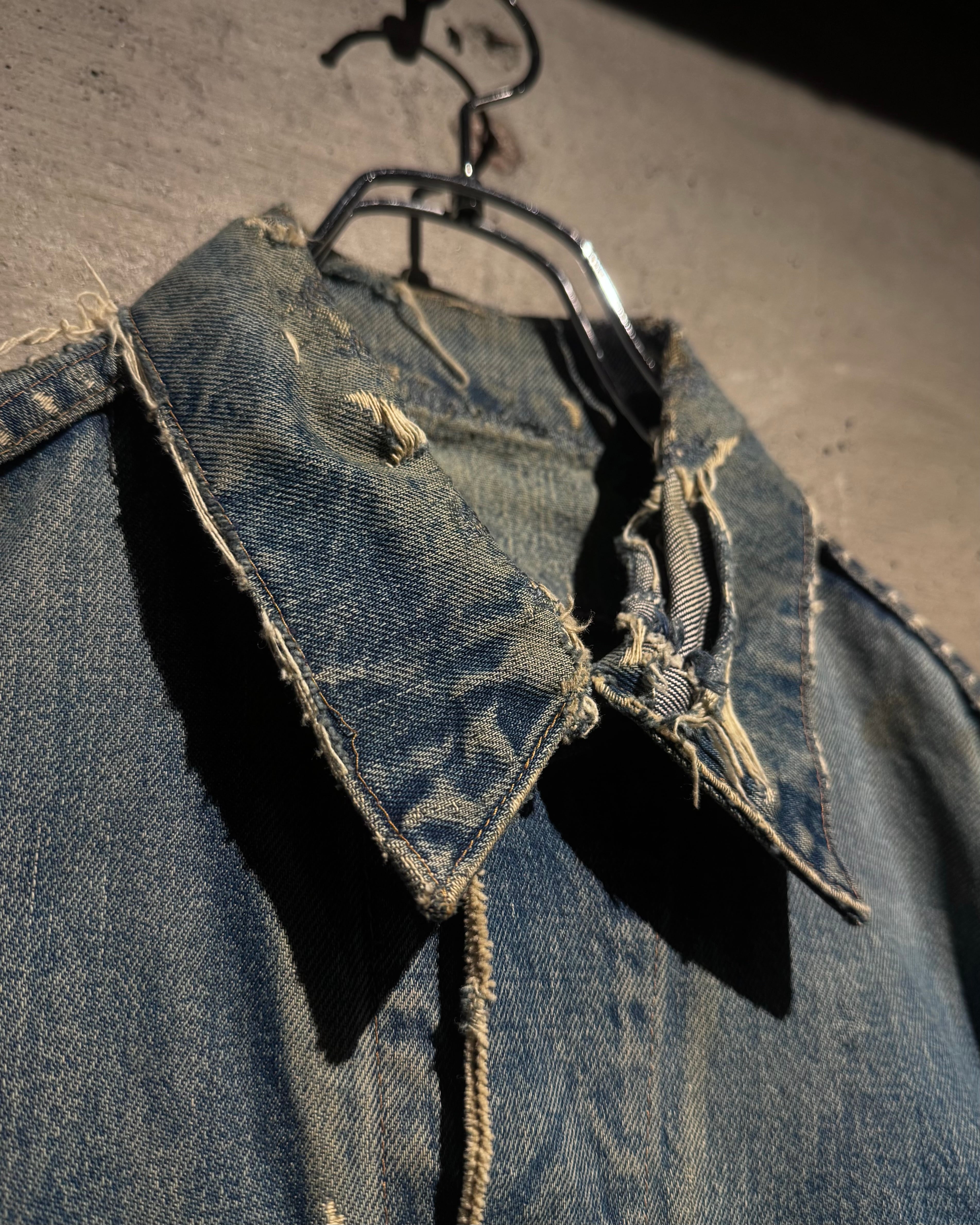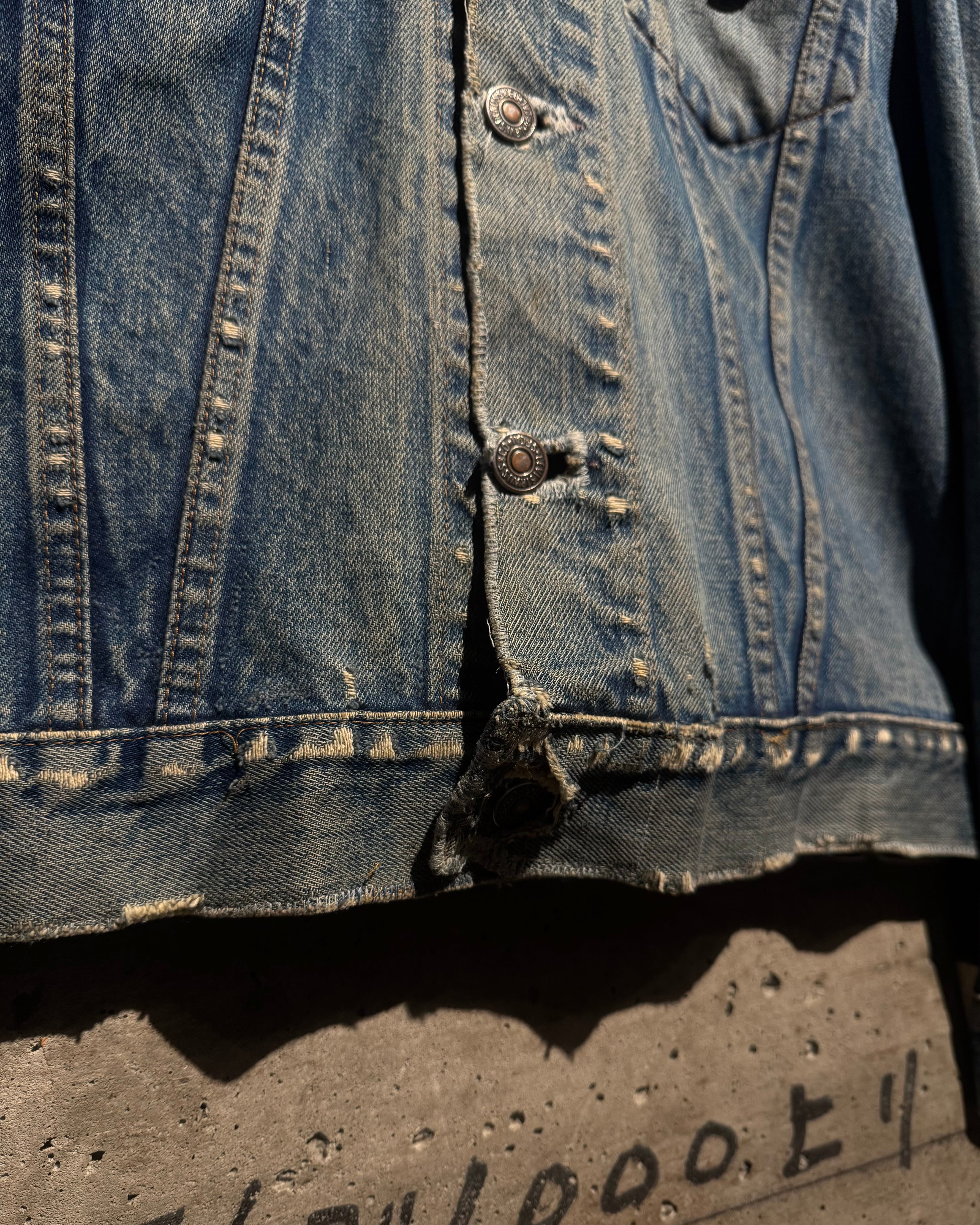 長い年月をかけて育ったリアルなエイジング。縦に流れるフェード、擦れたエッジ、自然に生まれたダメージ感。現行ブランドでもエイジング加工は見られますが、本個体のような至極のボロには確かなバックグラウンドを感じ、この一着だけで晩酌できてしまうほどの魅力があります。