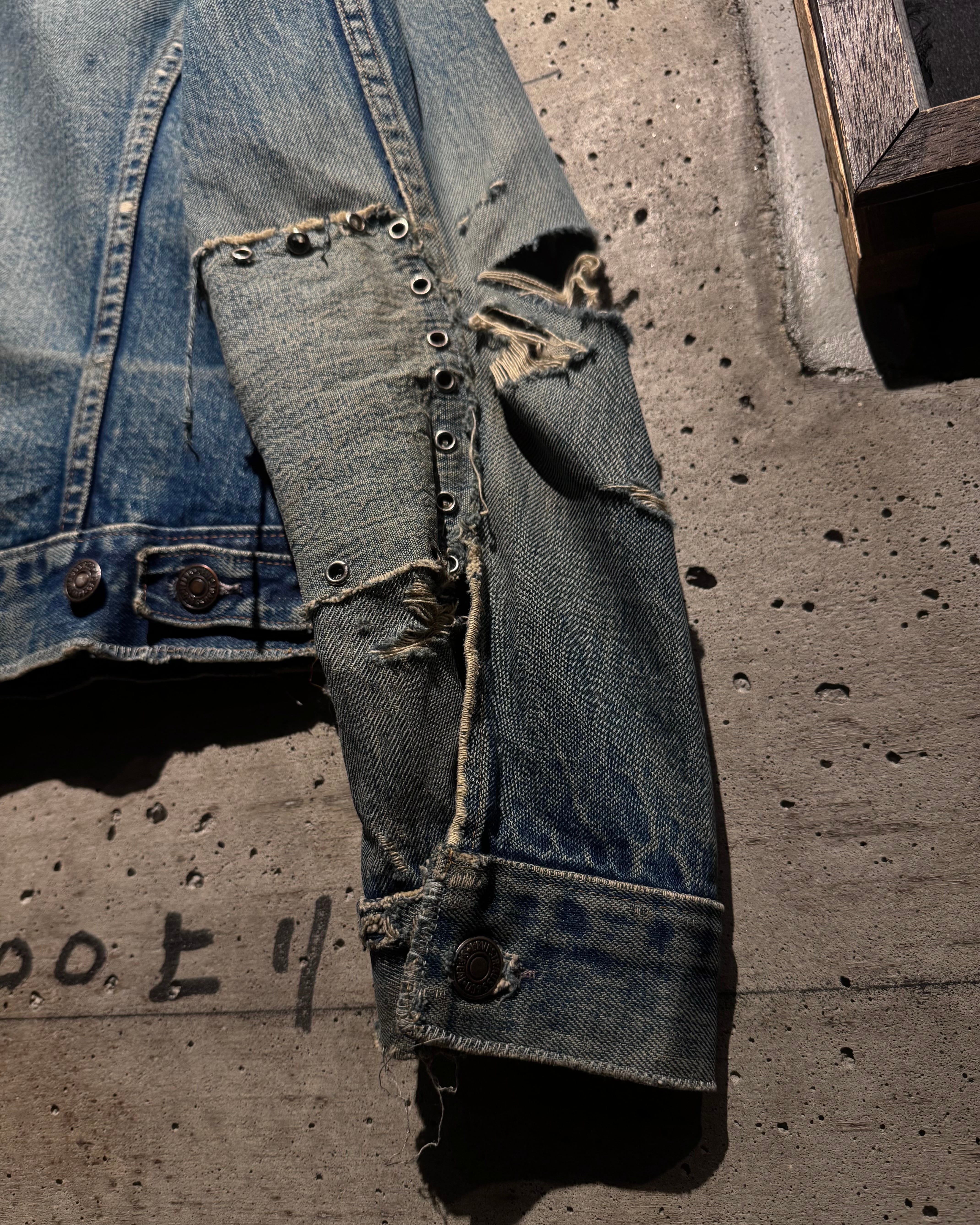 エイジングが進んだダメージ箇所には当て布補強が施され、その上からハトメで固定されたカスタム仕様。背面にも同様のディテールが入り、実用から生まれた仕様がそのままデザインへと昇華されています。