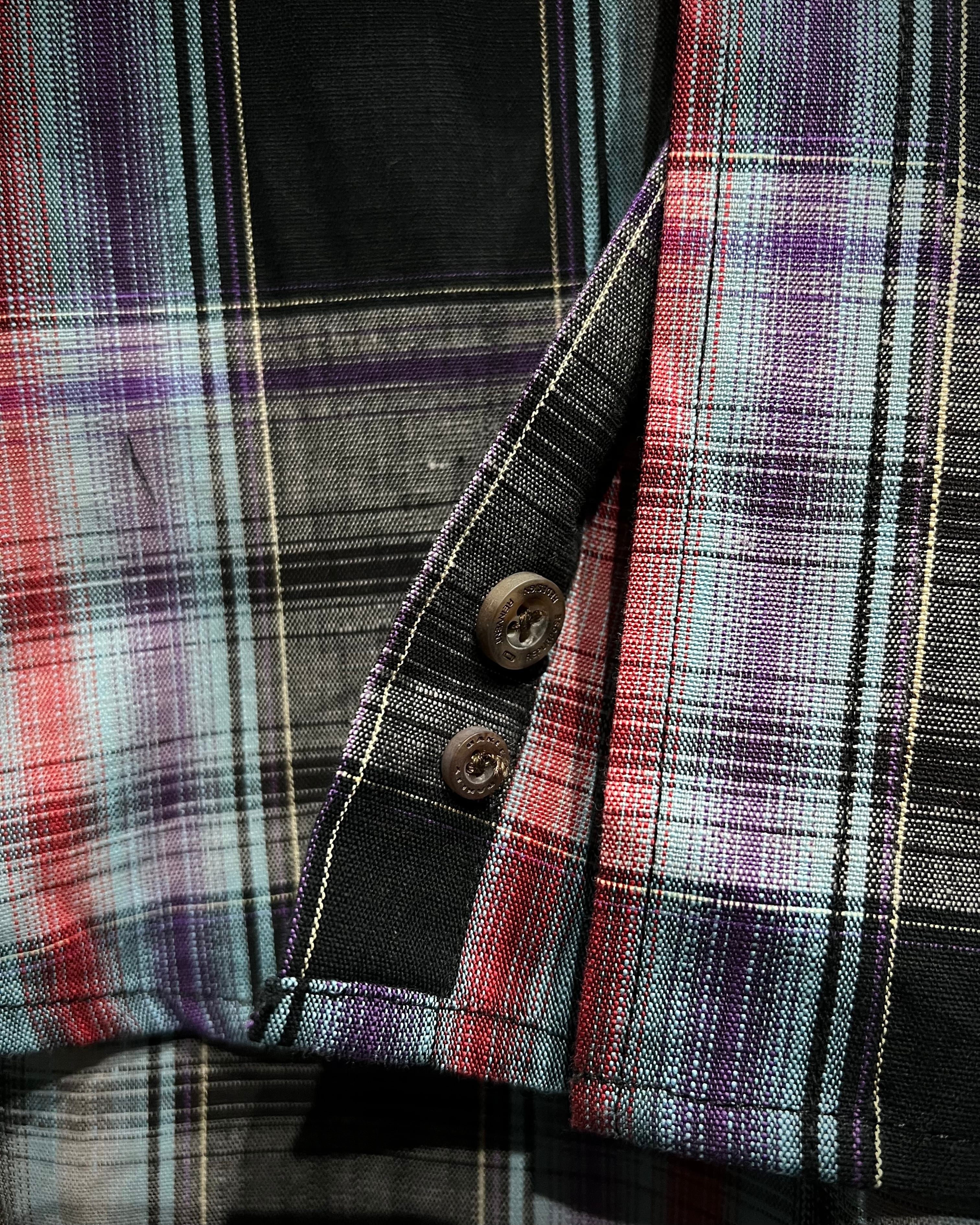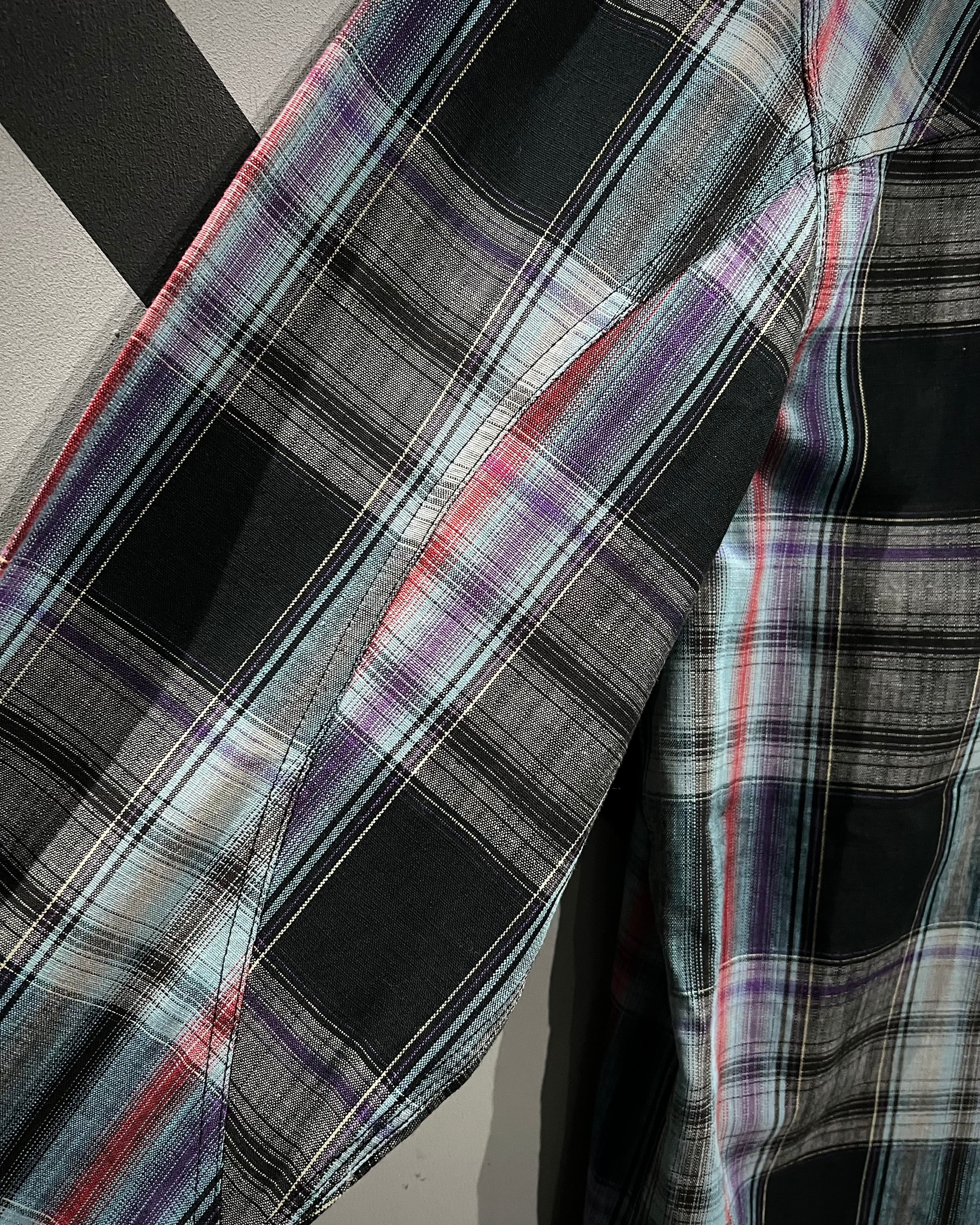 ライトブルーを基調に、パープル、ネイビー、レッドを織り交ぜたタータンチェックの1着。寒色をベースにしながらも奥行きのあるマルチカラーで、クラシカルな中にモダンな空気を感じさせる配色バランスが洒落てます。
