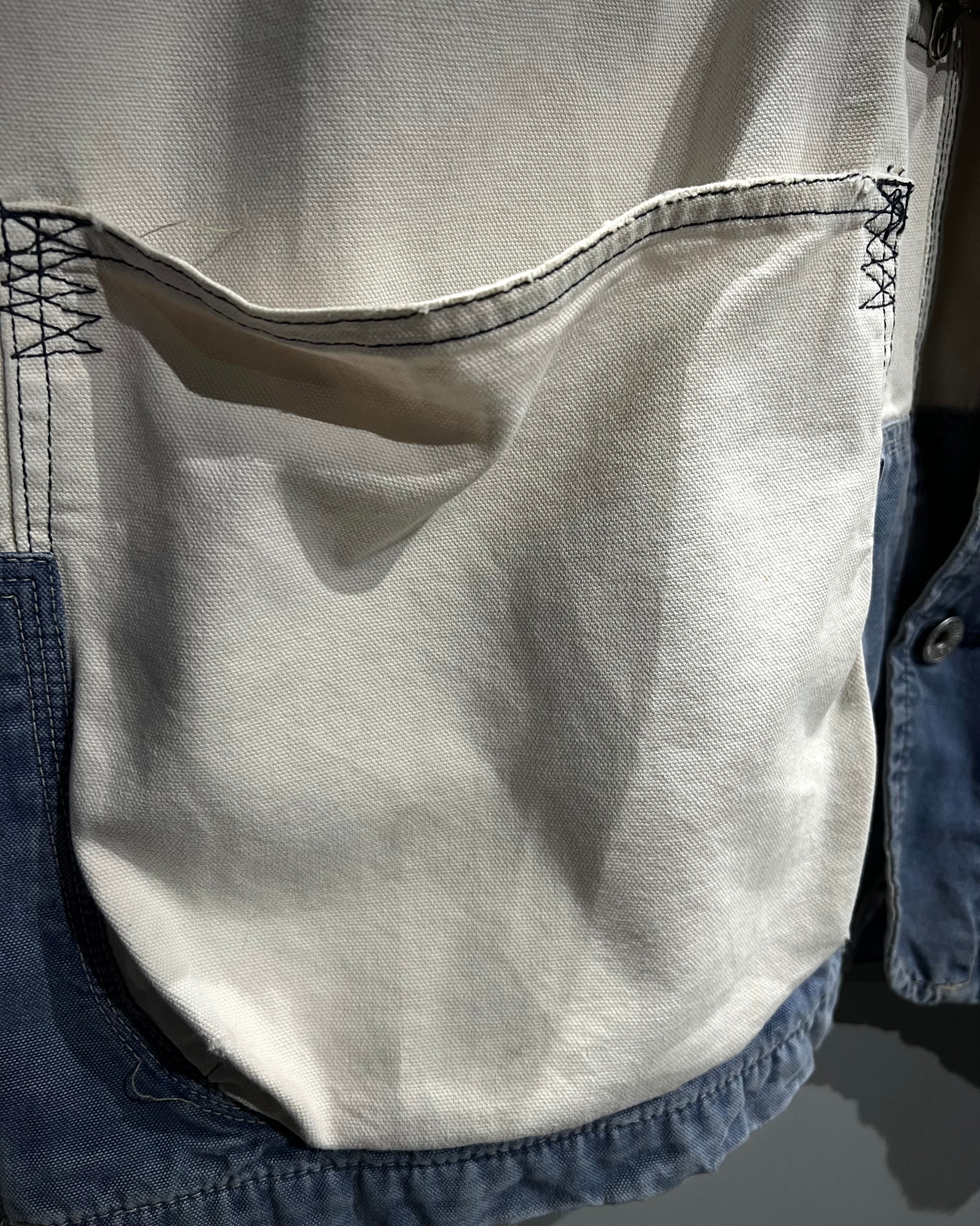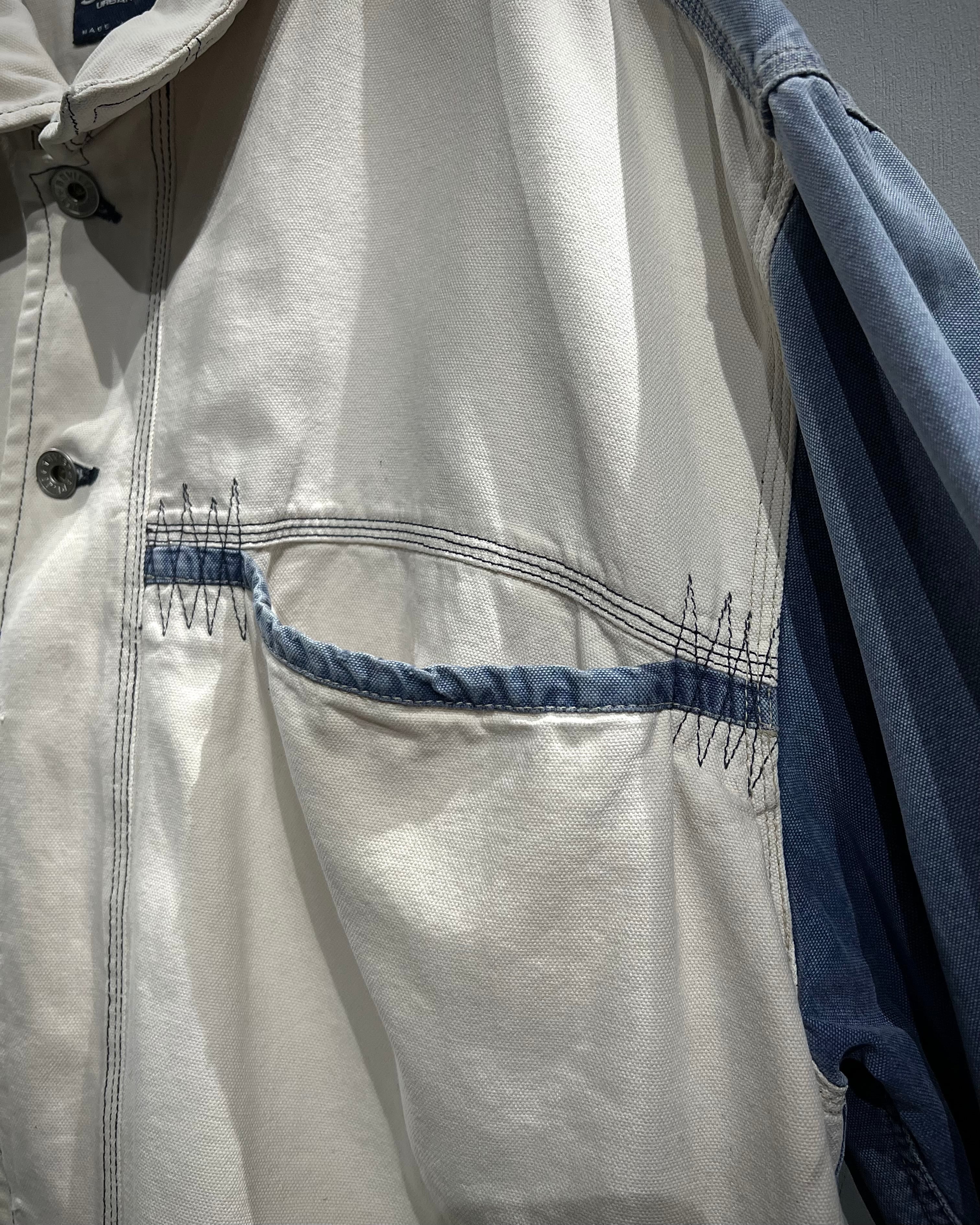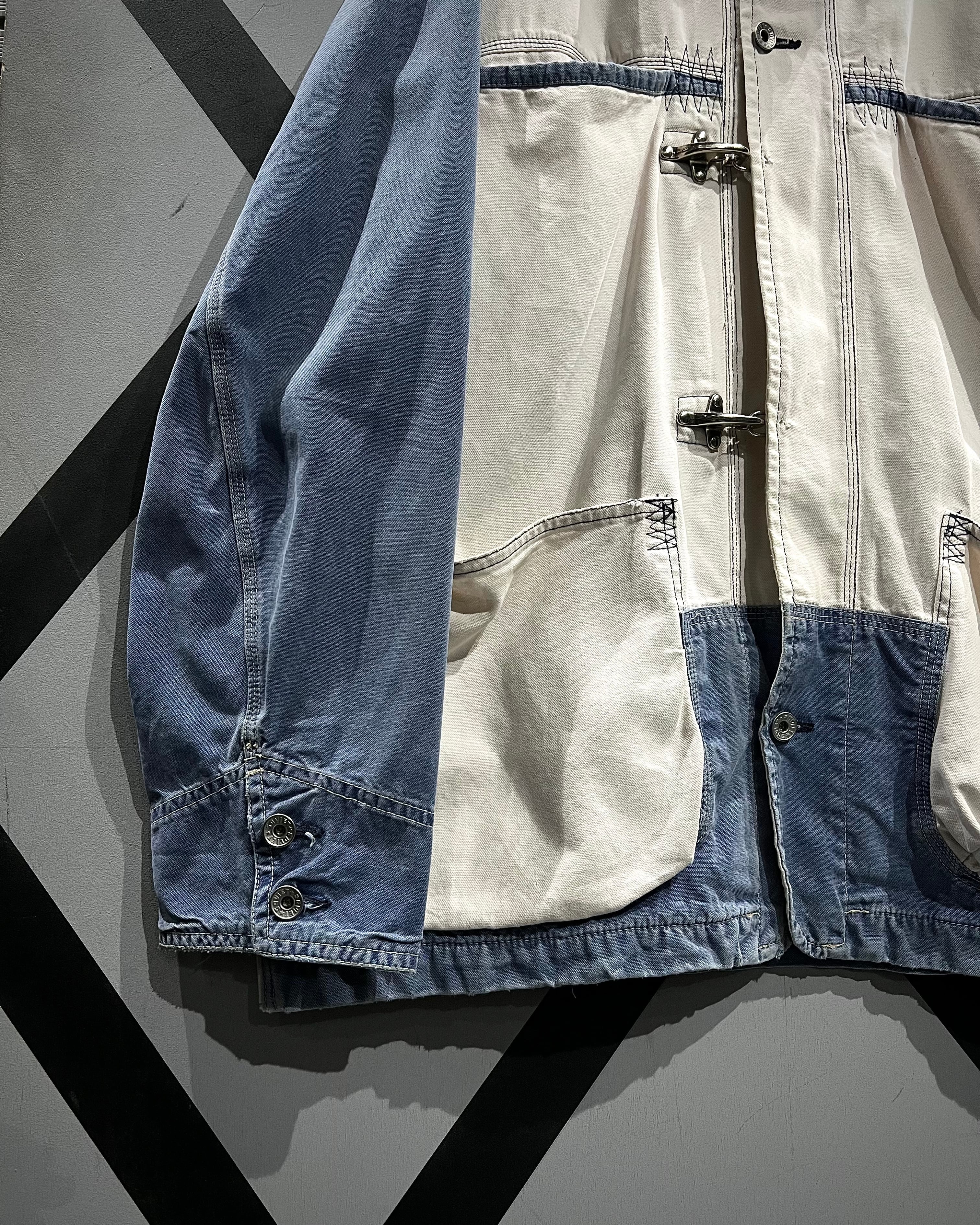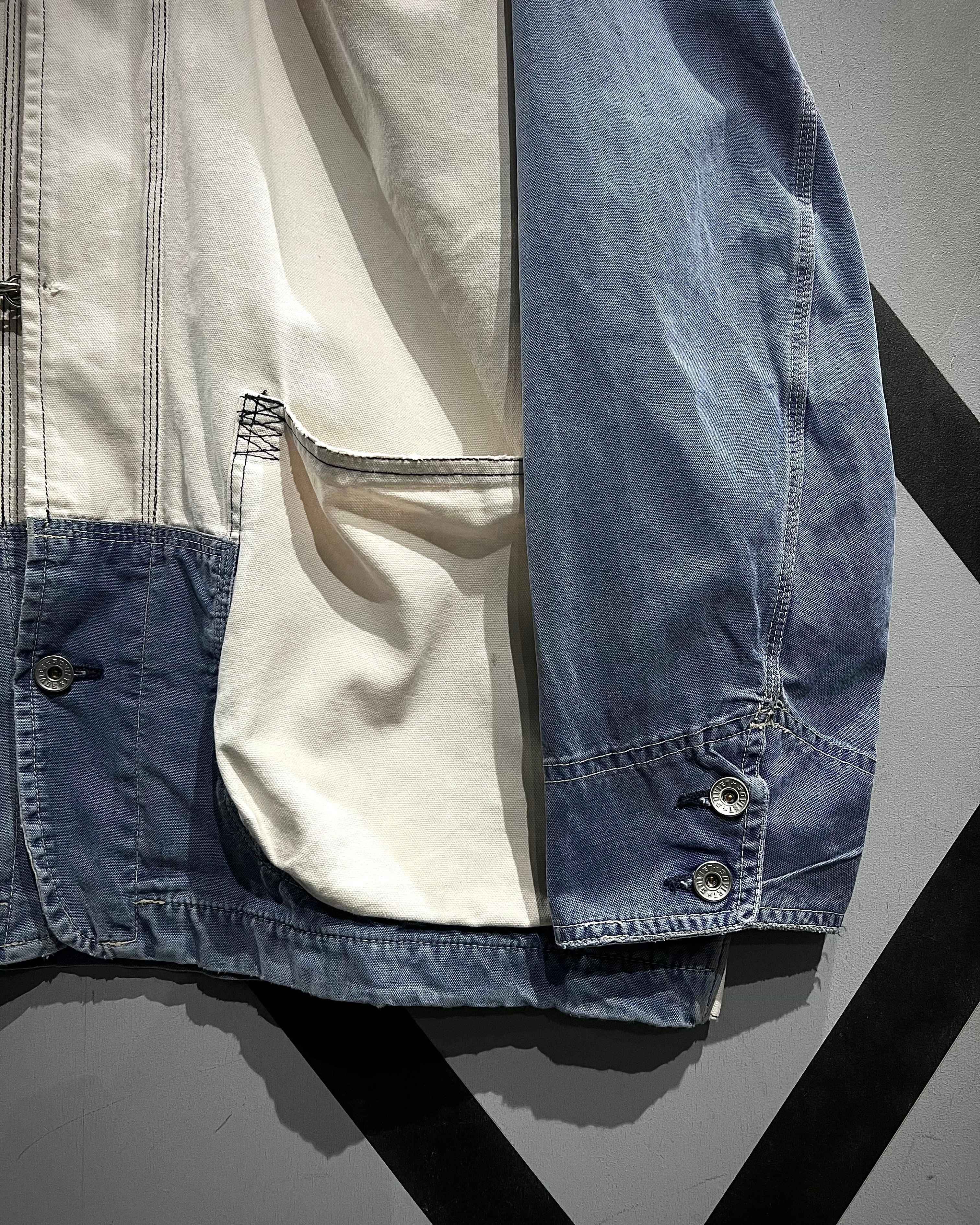 ブルーとホワイトにフェードしたダック地を大胆に切り替えたボディに、フロントには名だたるブランドがデザインソースとしてサンプリングしてきたファイヤーマンバックルを搭載したダックジャケット。