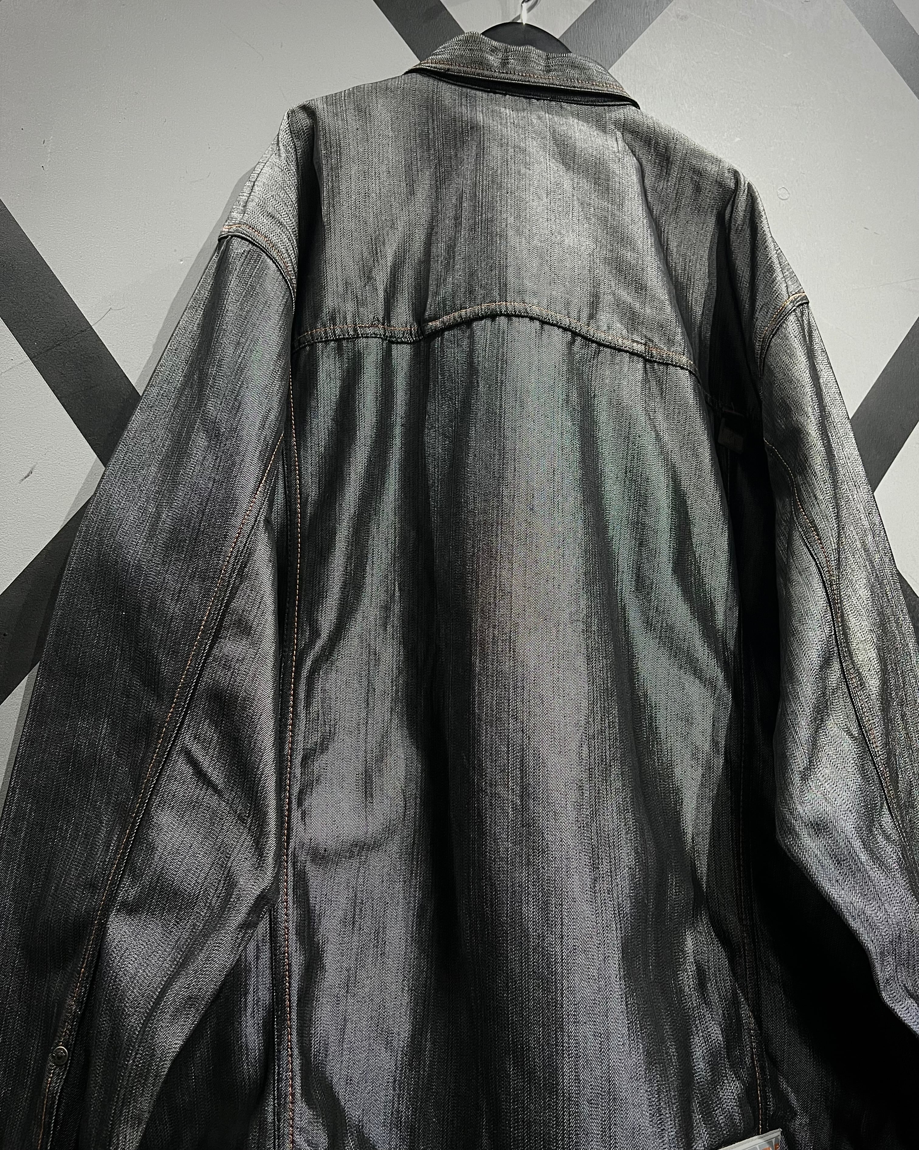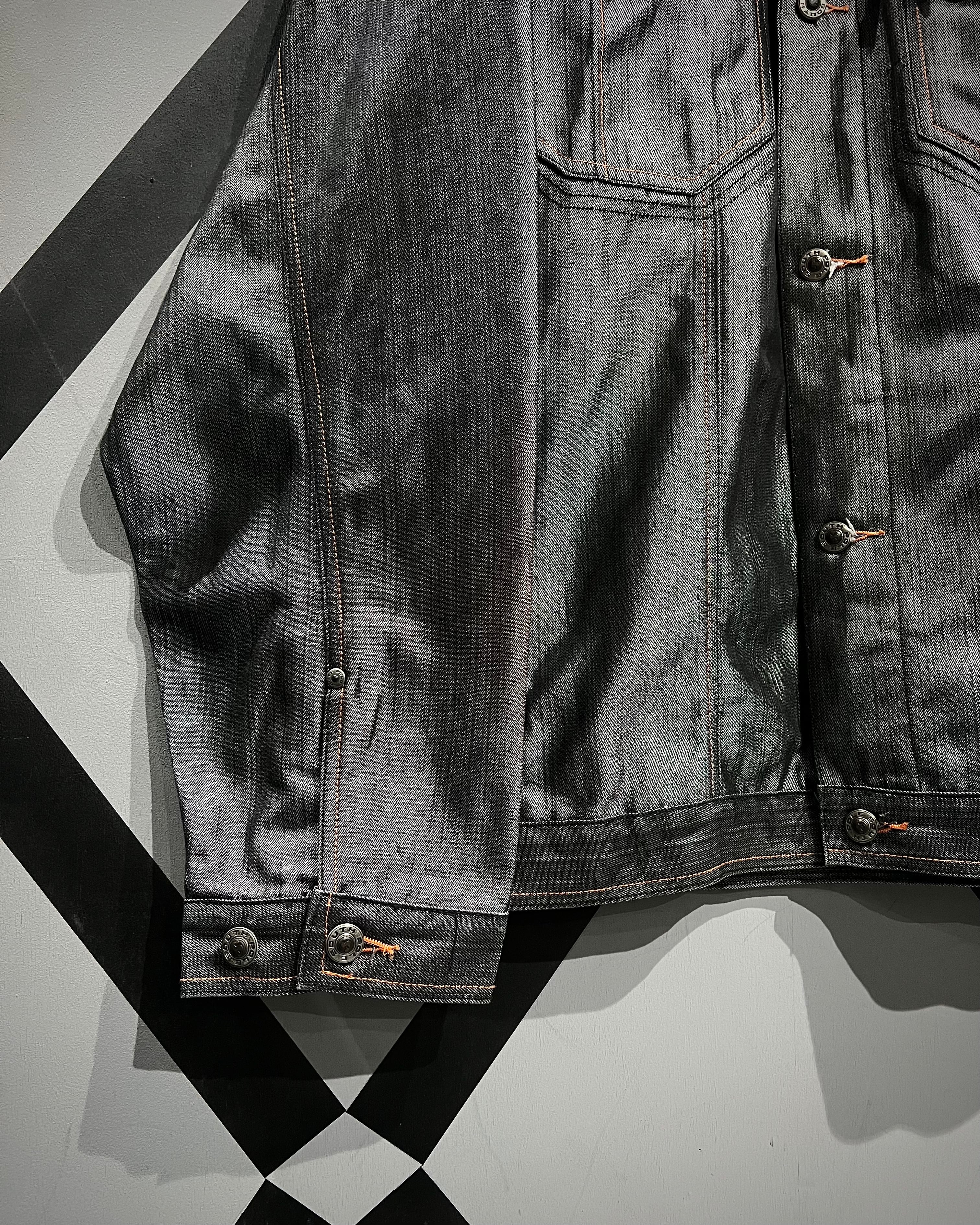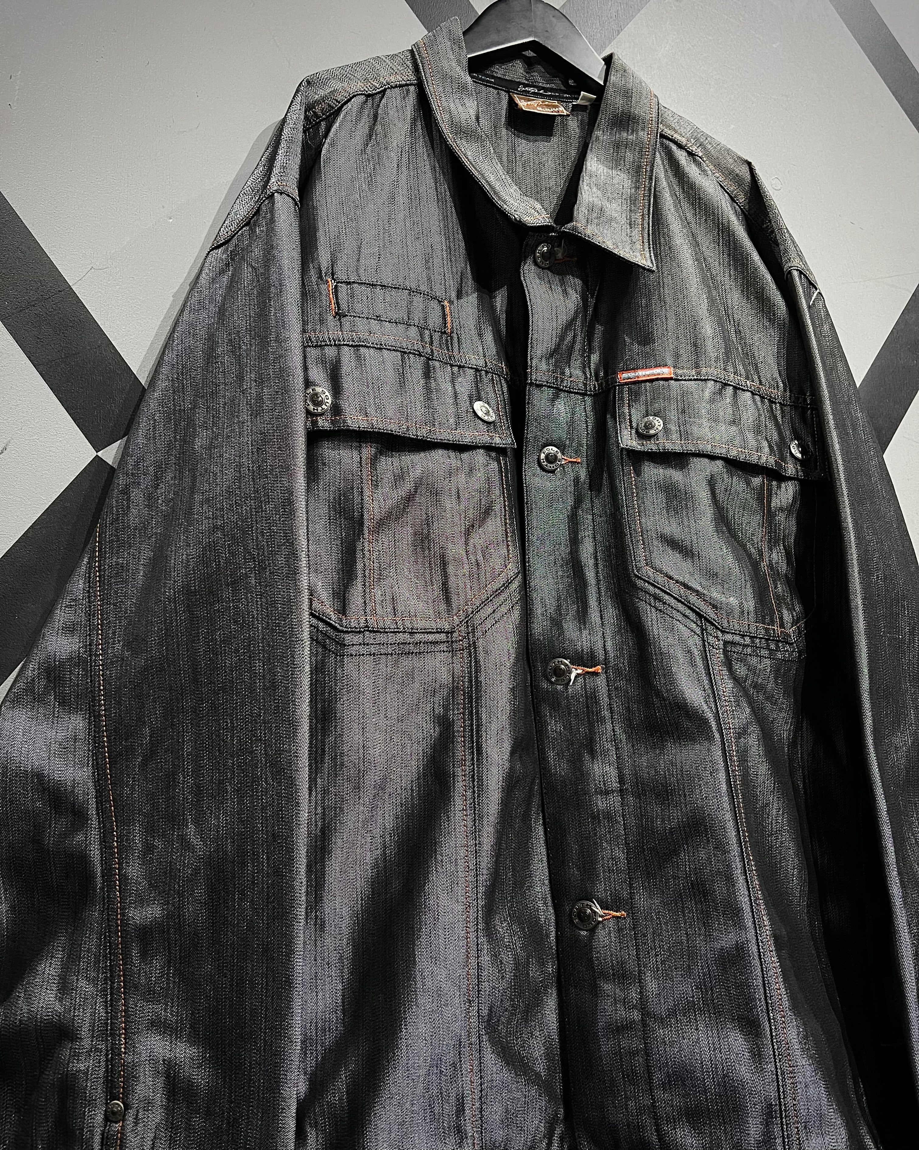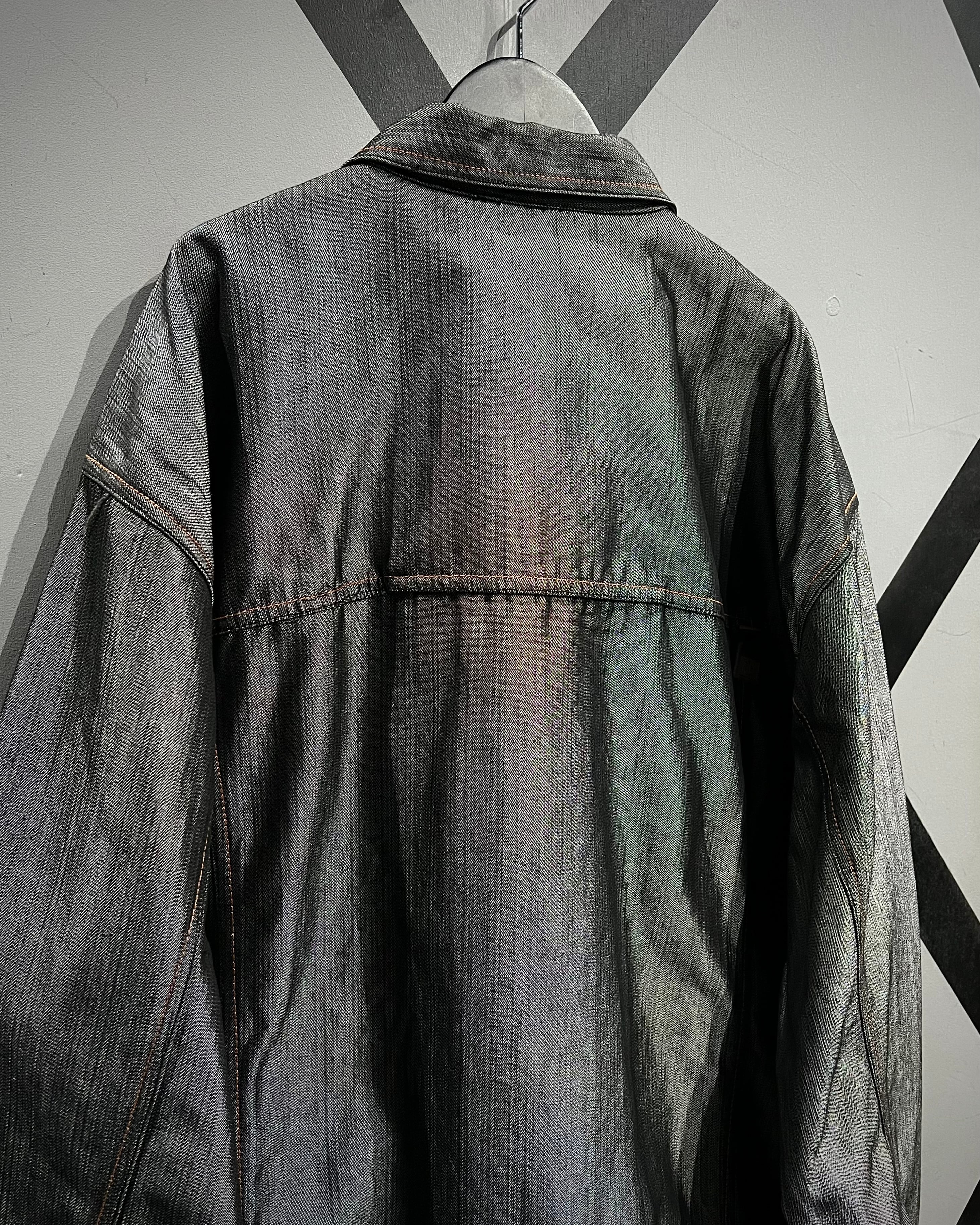 コットンデニムをベースに、メタリックなポリエステル繊維を織り交ぜた独特のファブリックを用いた1着。光の当たり方で鈍く、そして鋭く輝く表情は、無骨さの中に煌びやかさを潜ませたハイストリートな空気感が魅力。
