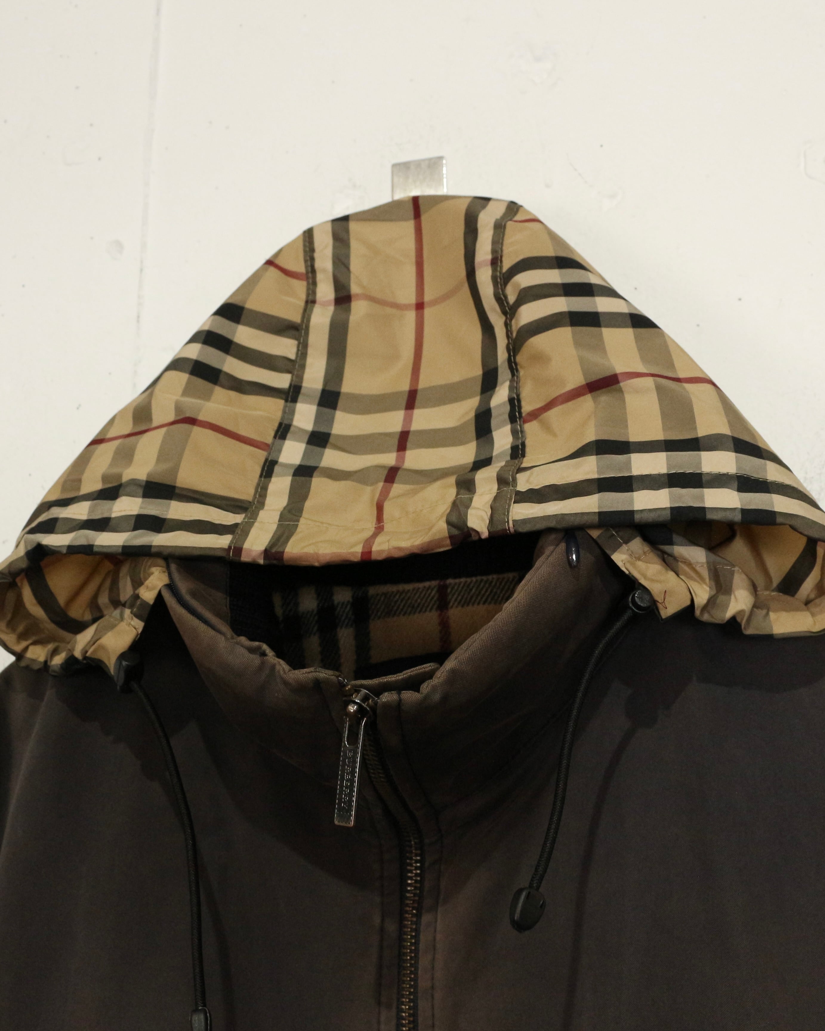 首元はボリュームのあるスタンドカラー仕様。内側にはアイコニックなノバチェックのビルドインフードを内蔵し、シーンに応じて表情を変えられるギミックを搭載。フロントはダブルジップ仕様で、開閉のバランス次第でシルエットに変化をつけられます。