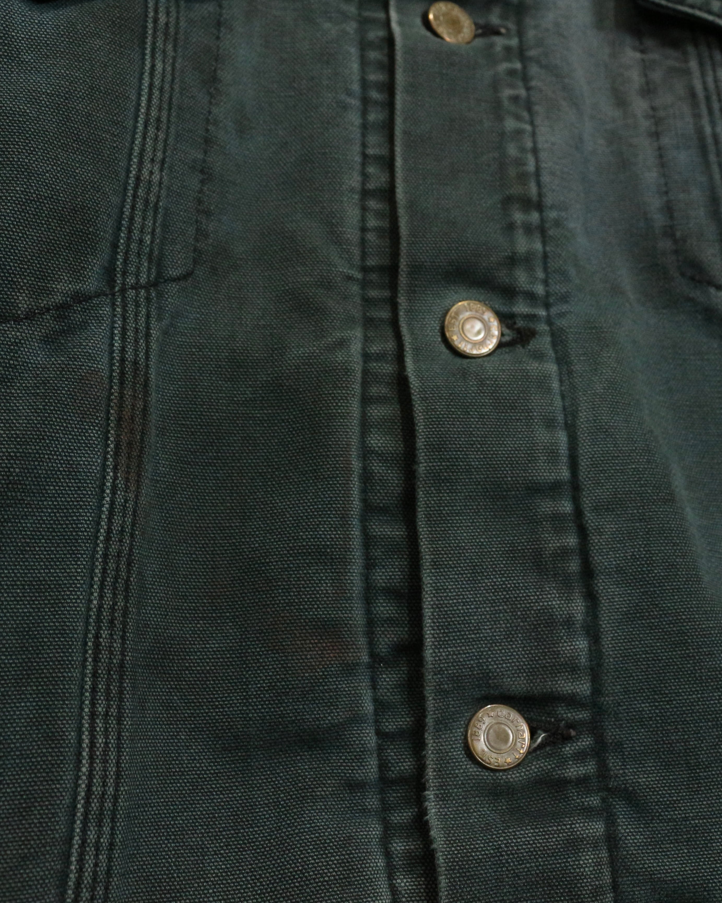 ヘビーオンスのダック地をベースに、フロントのフラップポケットやハンドウォーマーポケット、V字の切り替えなど、トラッカーならではのディテールをしっかりと踏襲。随所に走るトリプルステッチなどワークブランドとして培われてきたCarharttの堅牢さが、細部からもはっきりと感じ取れます。