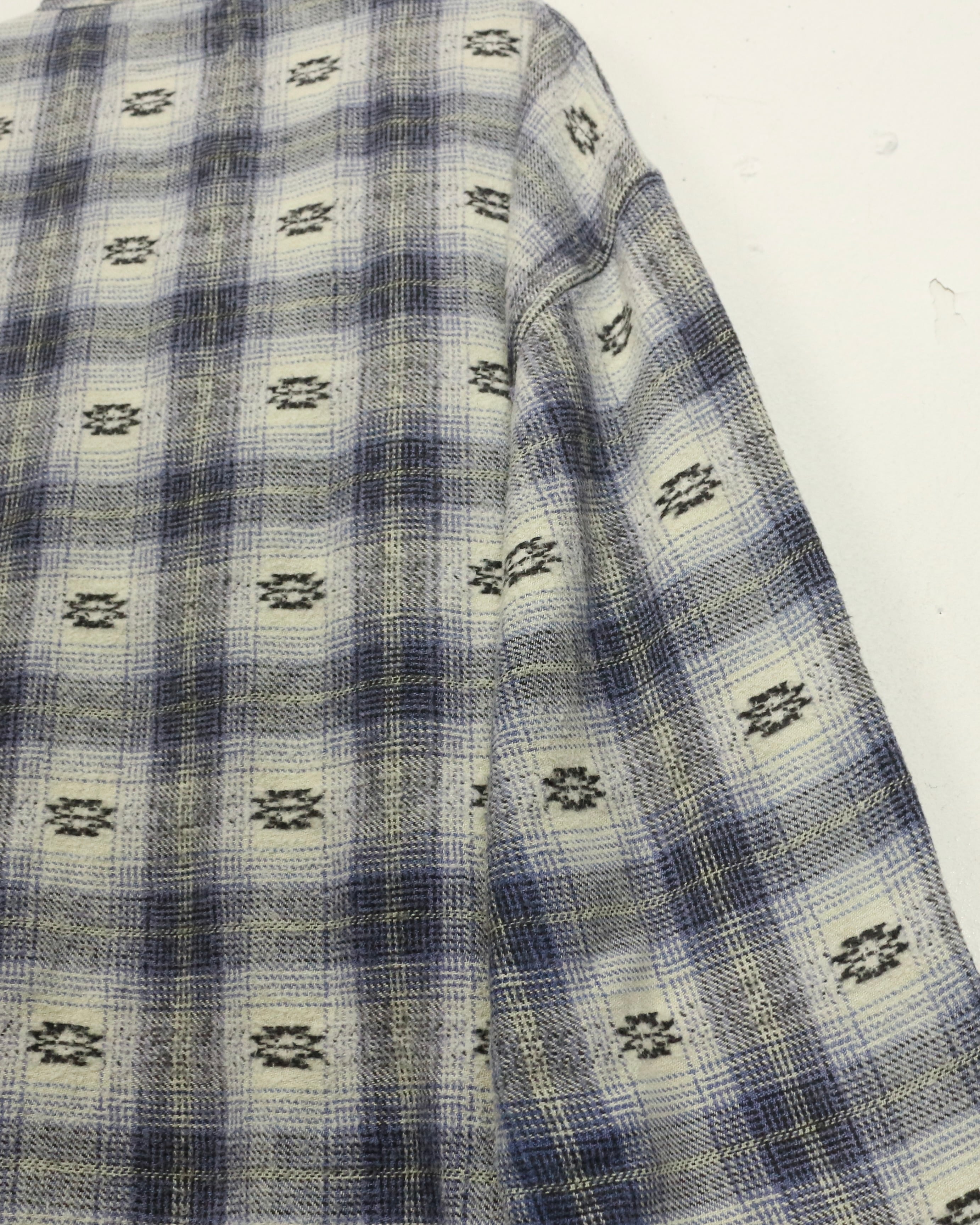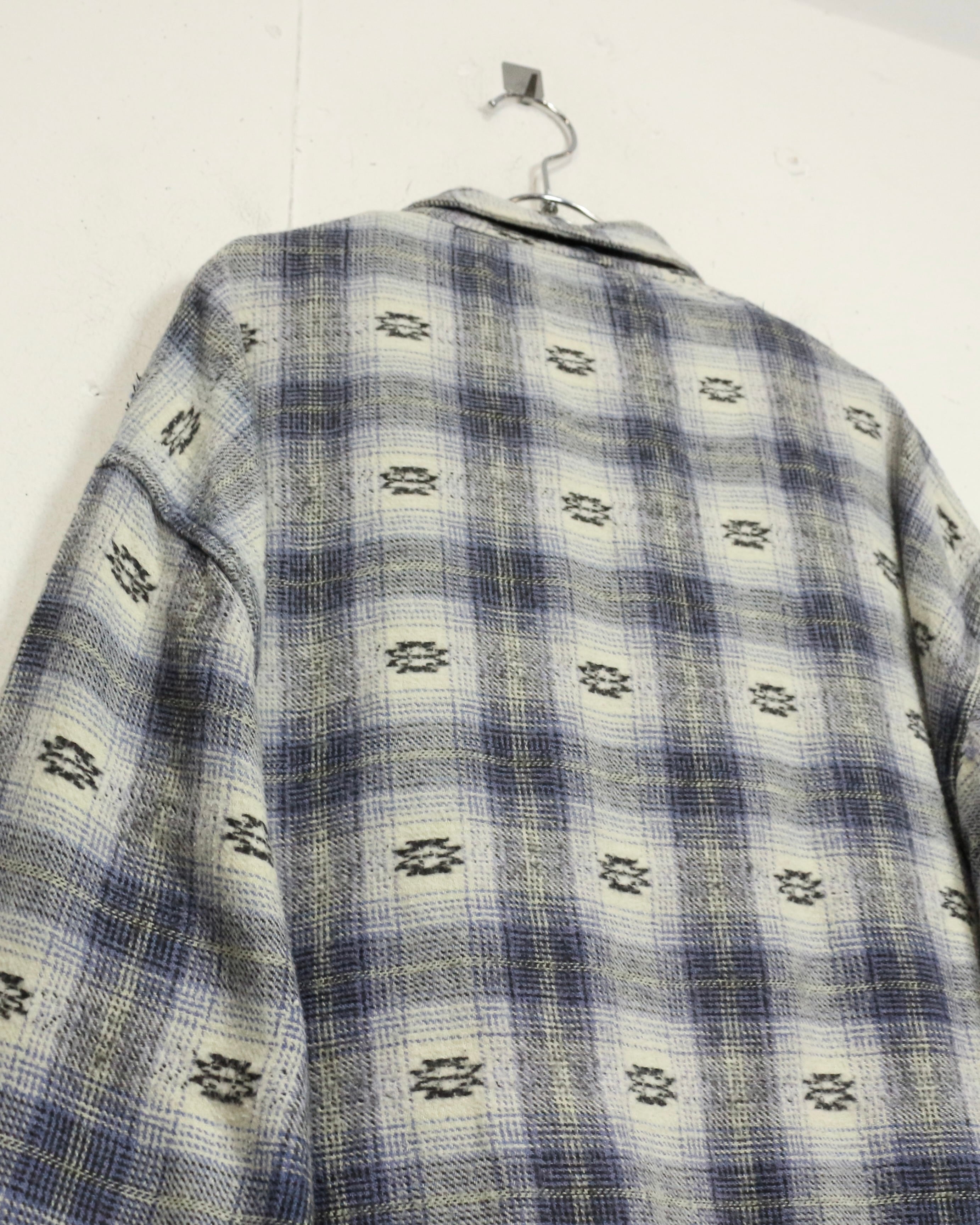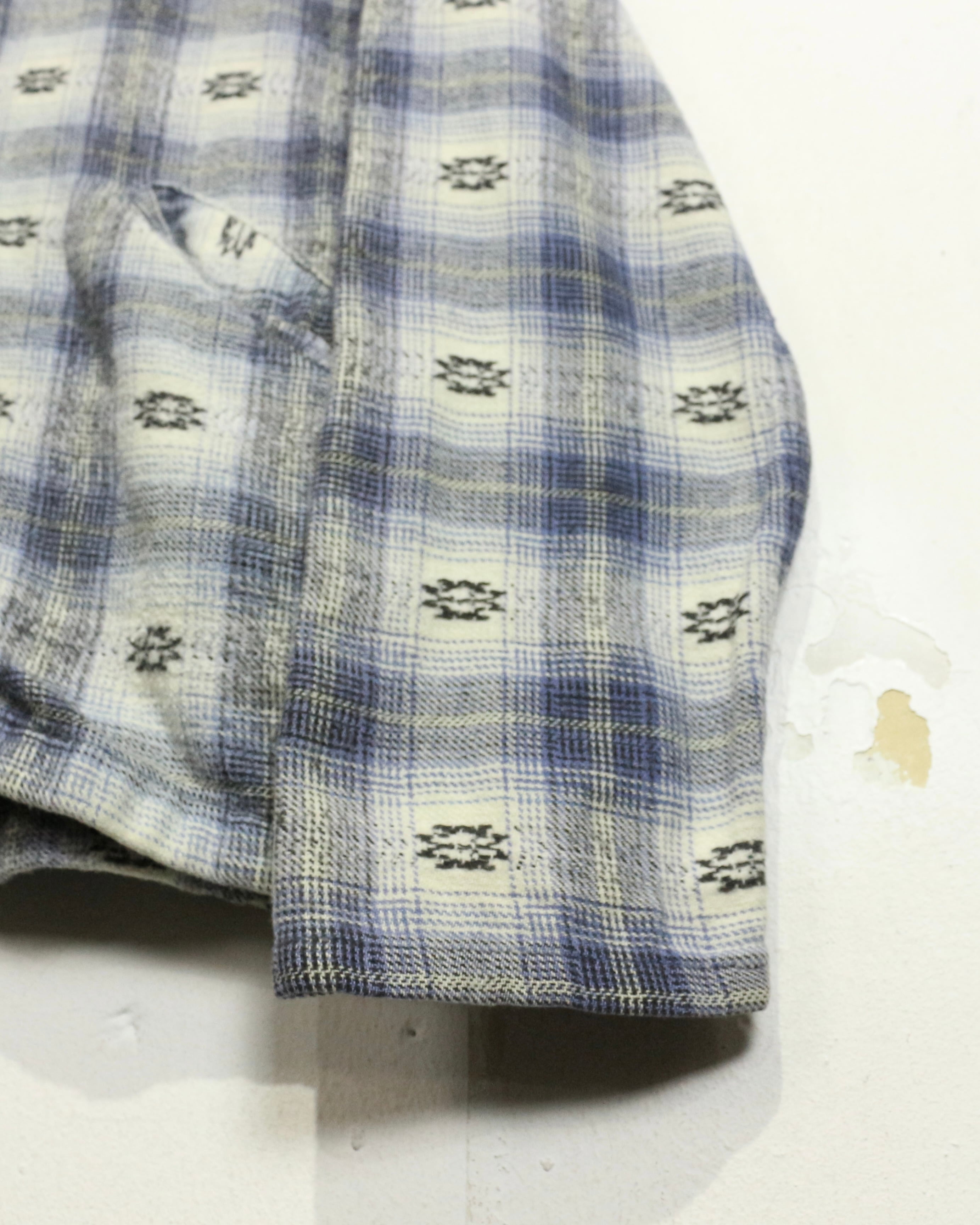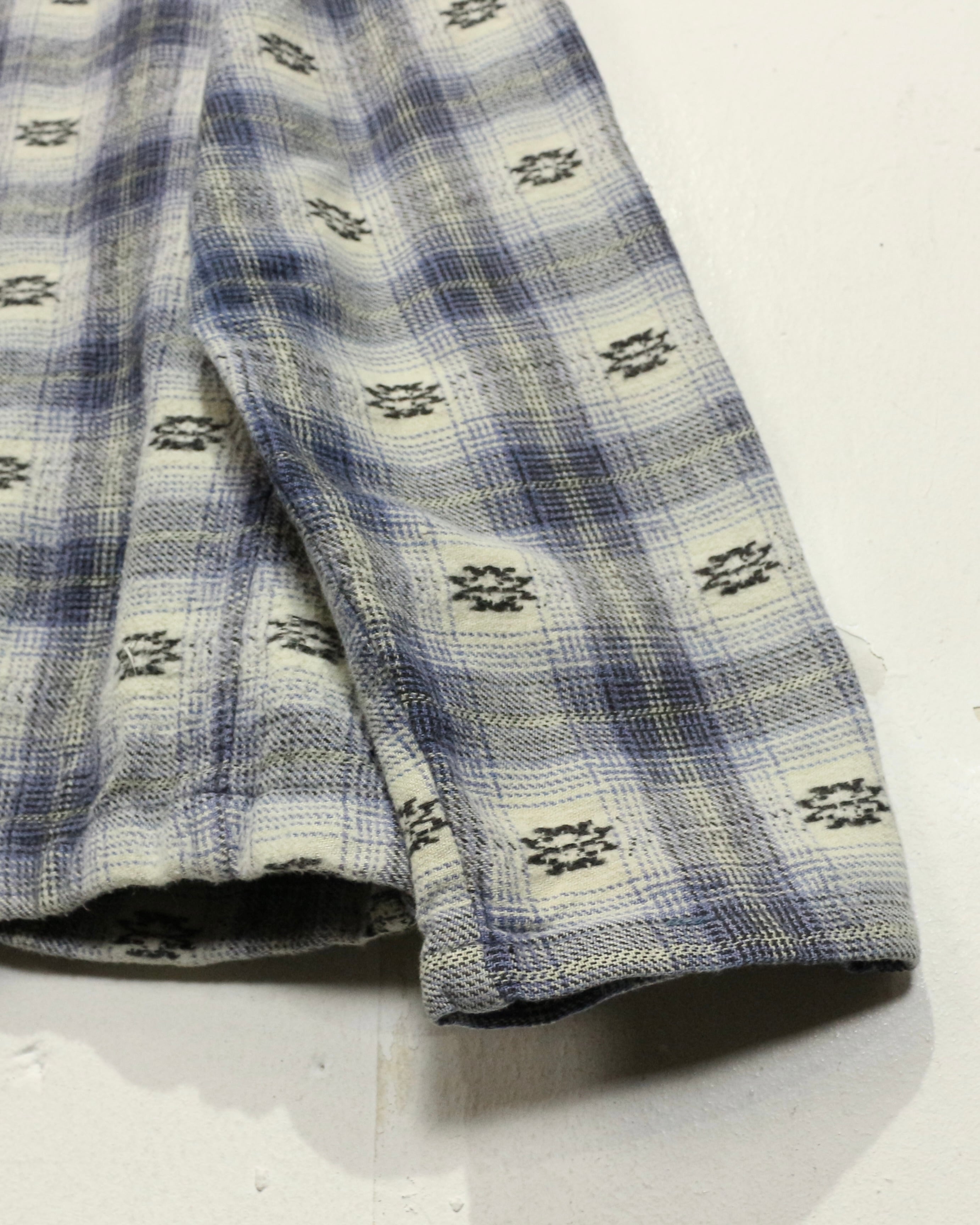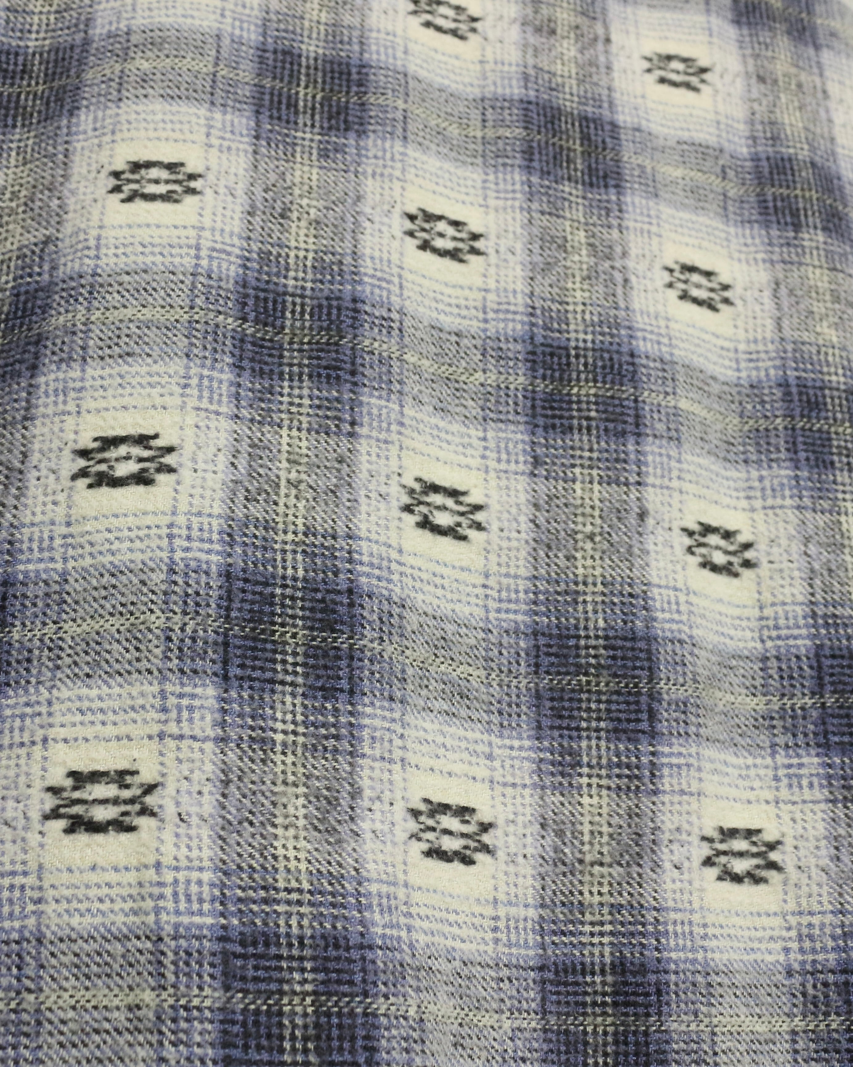 ブルー×ホワイトを基調とした柔らかなチェックパターンに、さりげなく織り込まれたネイティブ調の小紋柄が目を引くネルシャツ。