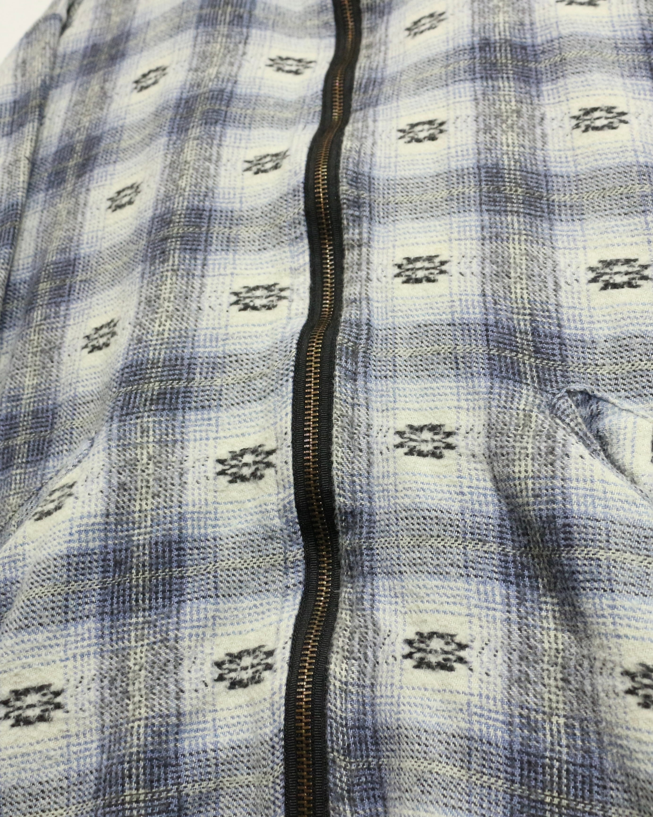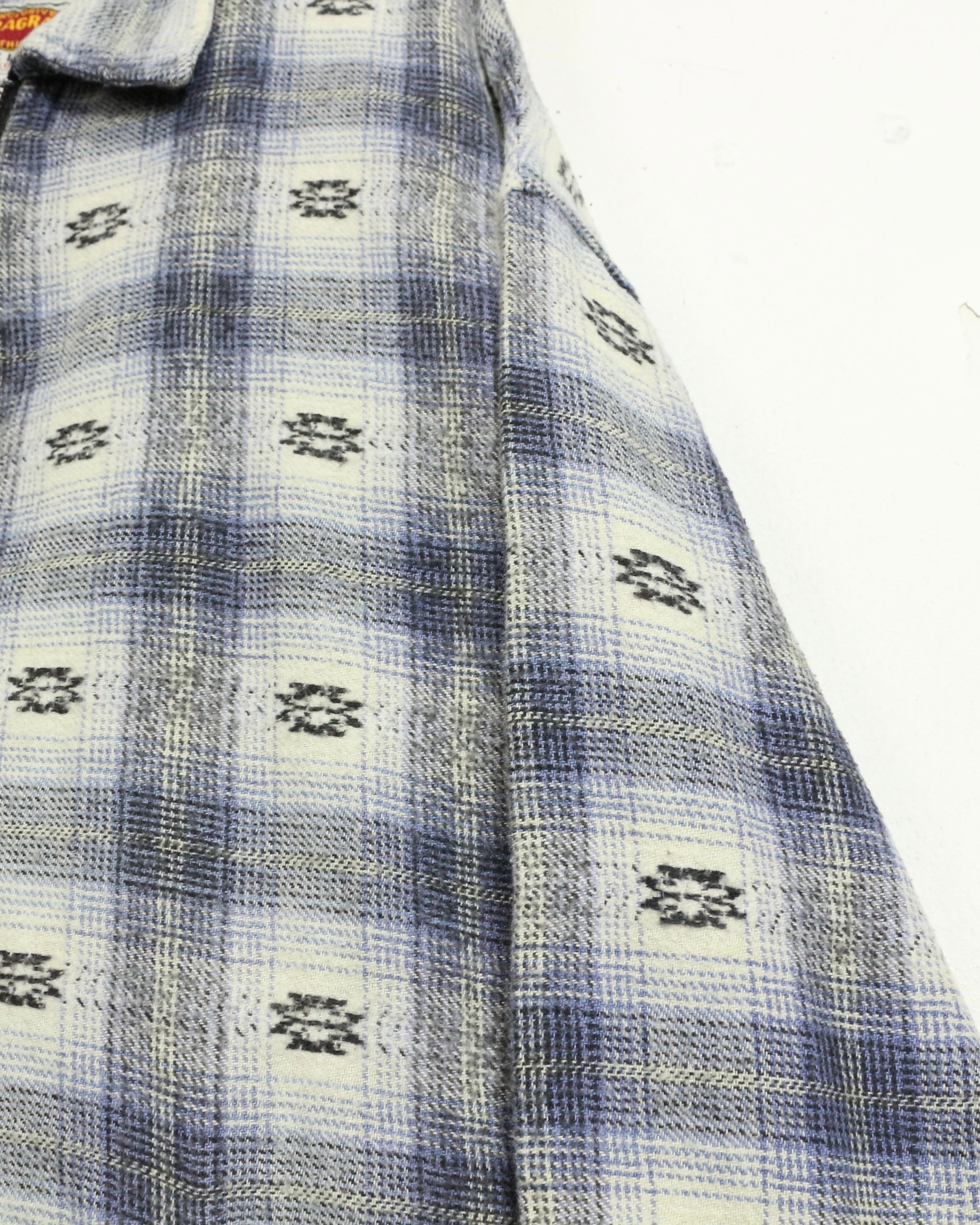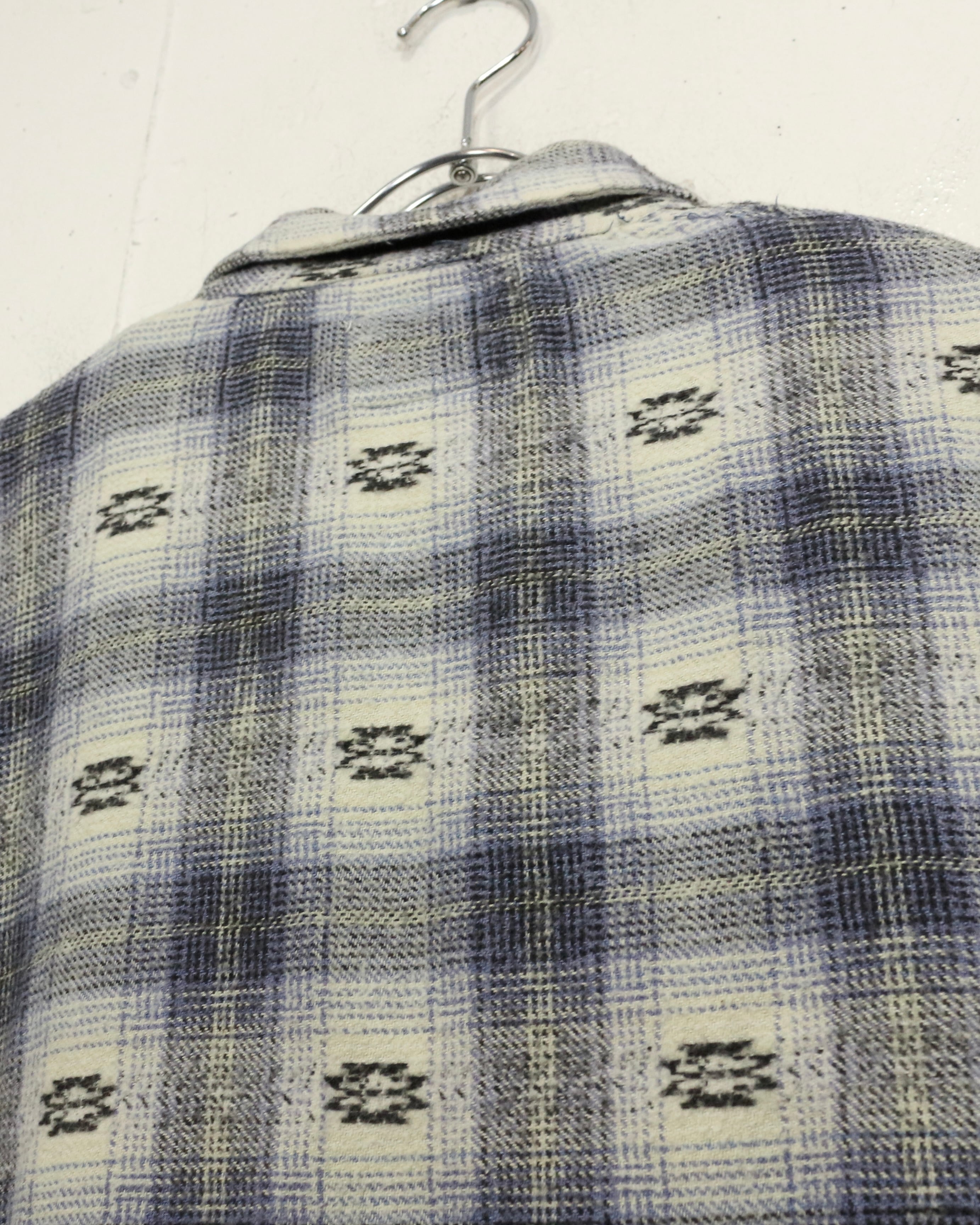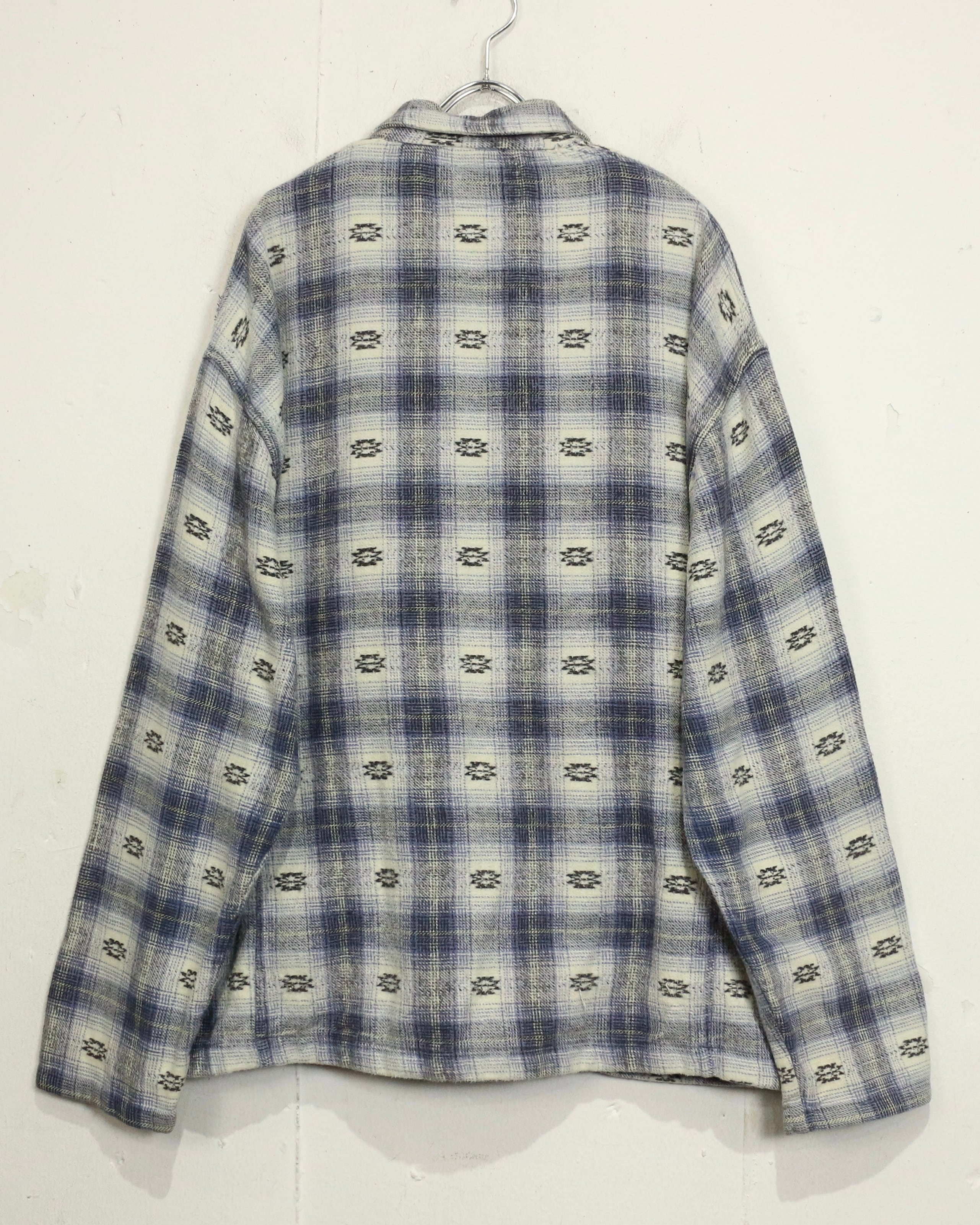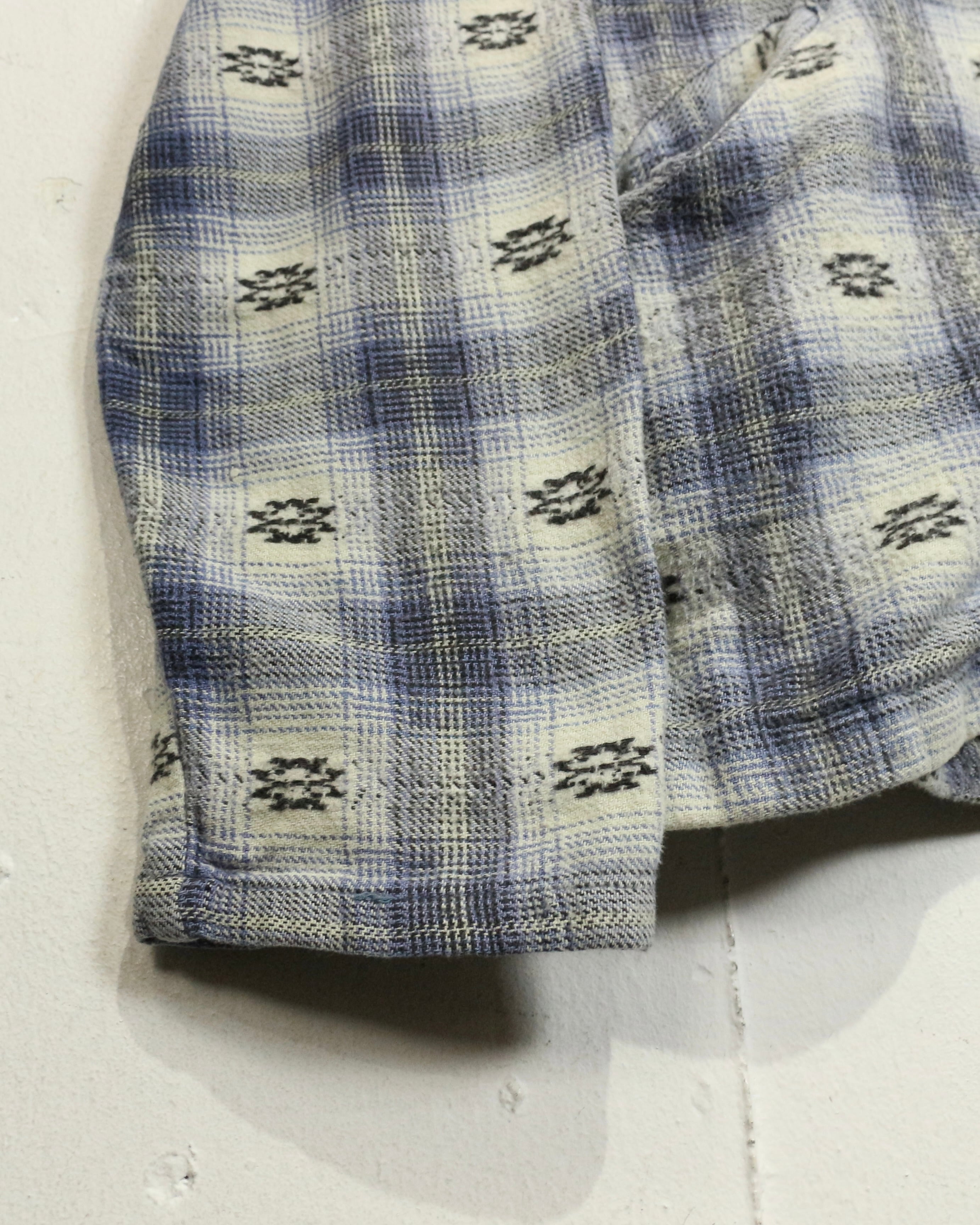 ブルー×ホワイトを基調とした柔らかなチェックパターンに、さりげなく織り込まれたネイティブ調の小紋柄が目を引くネルシャツ。