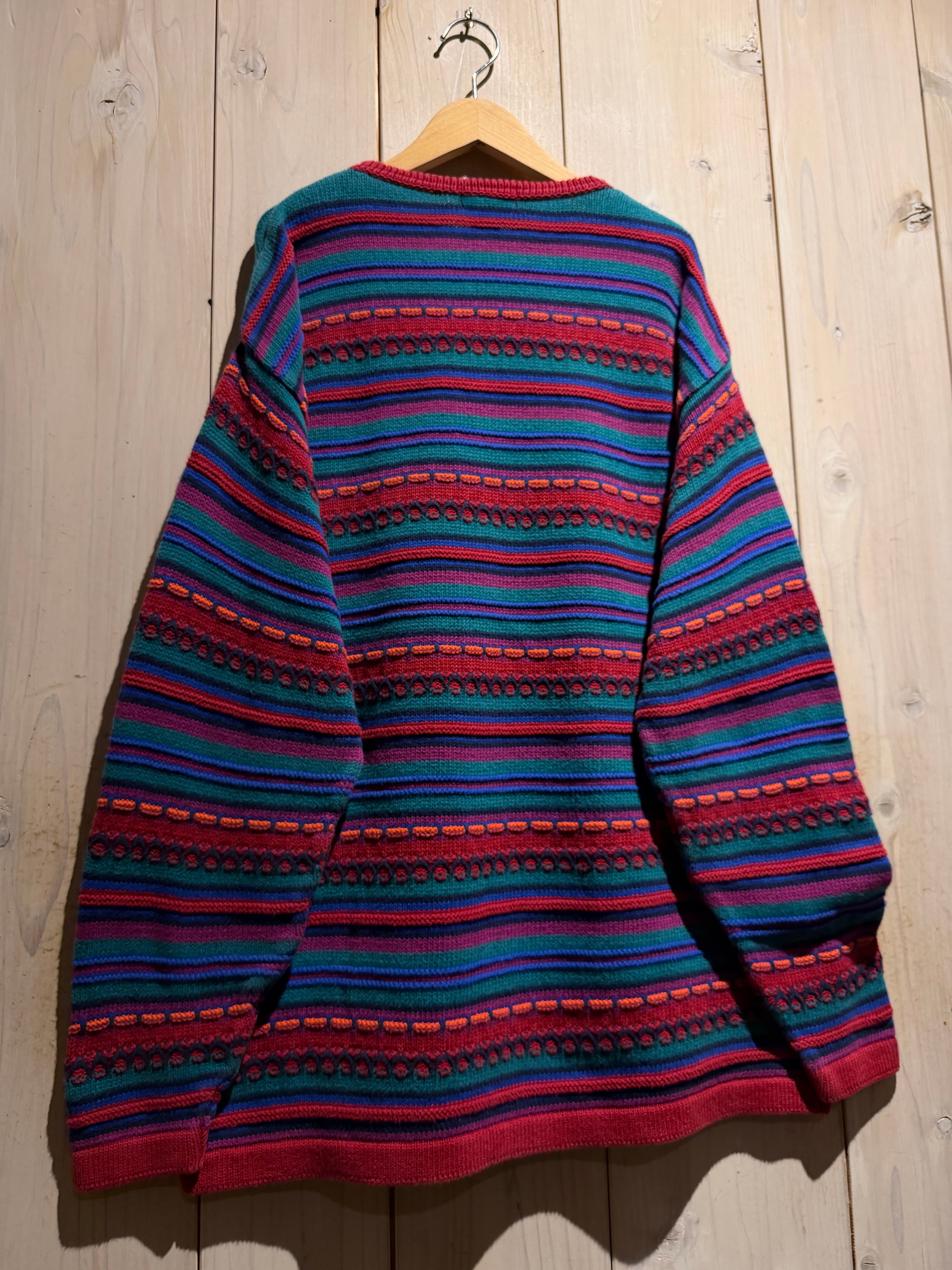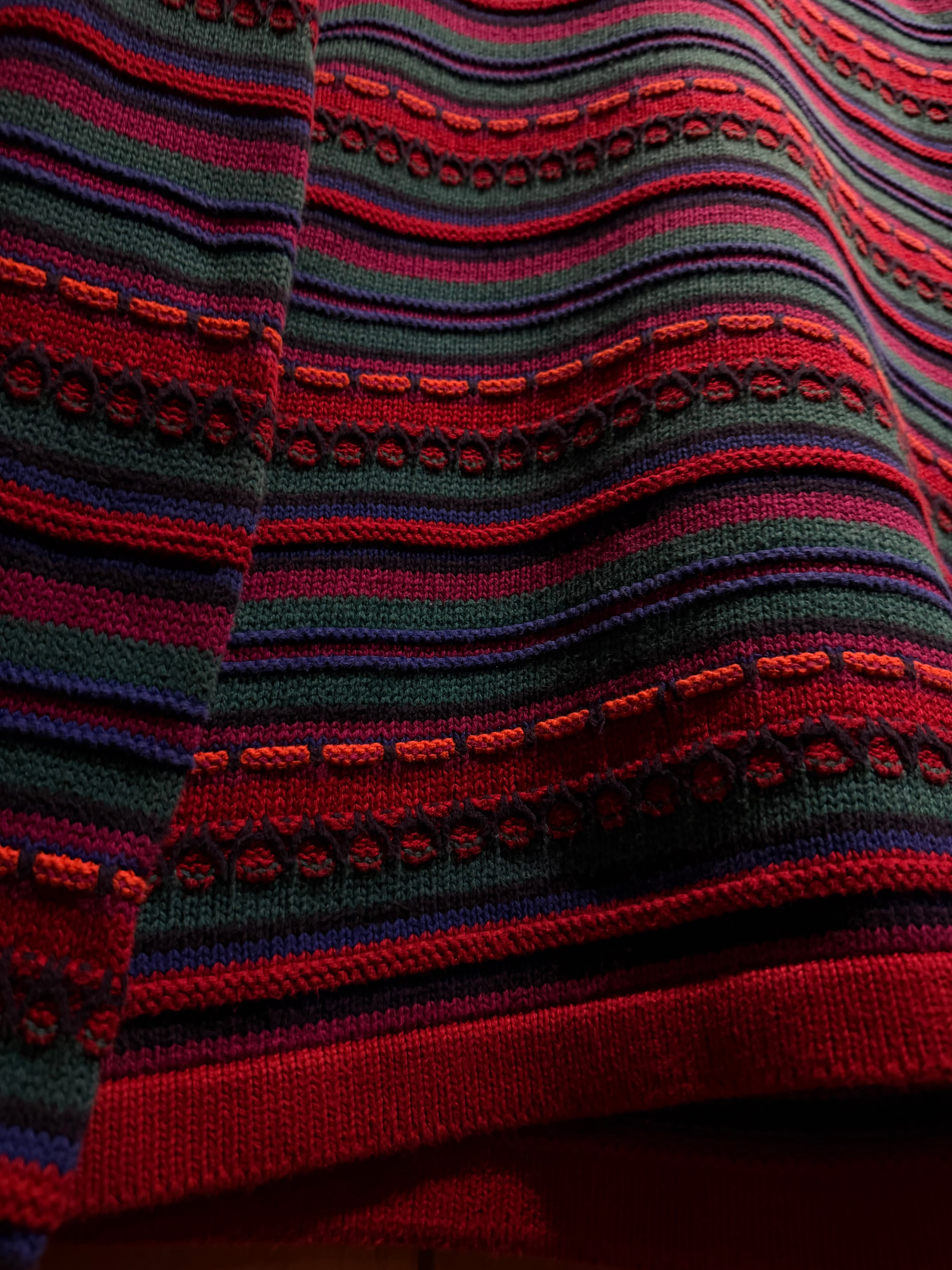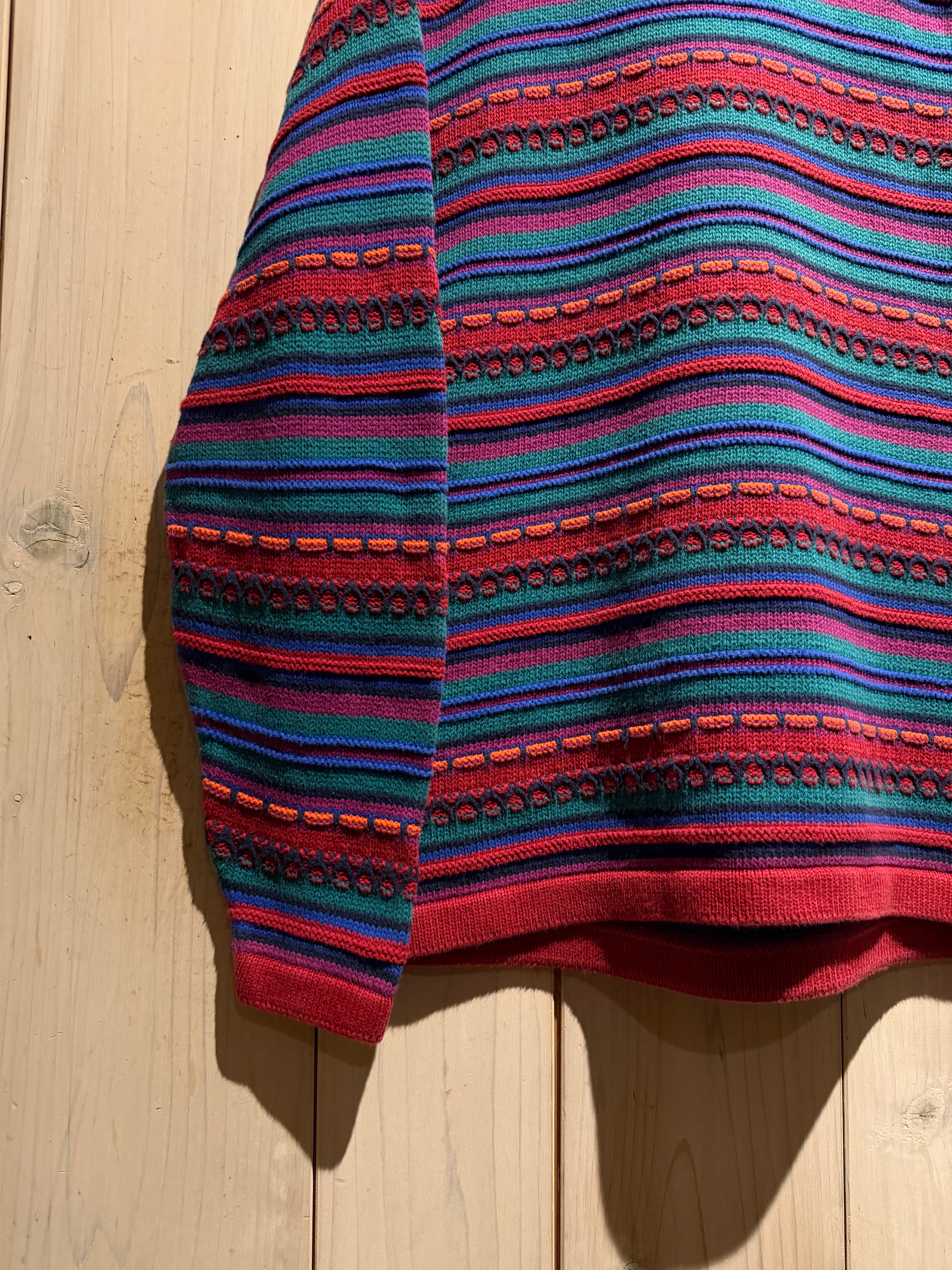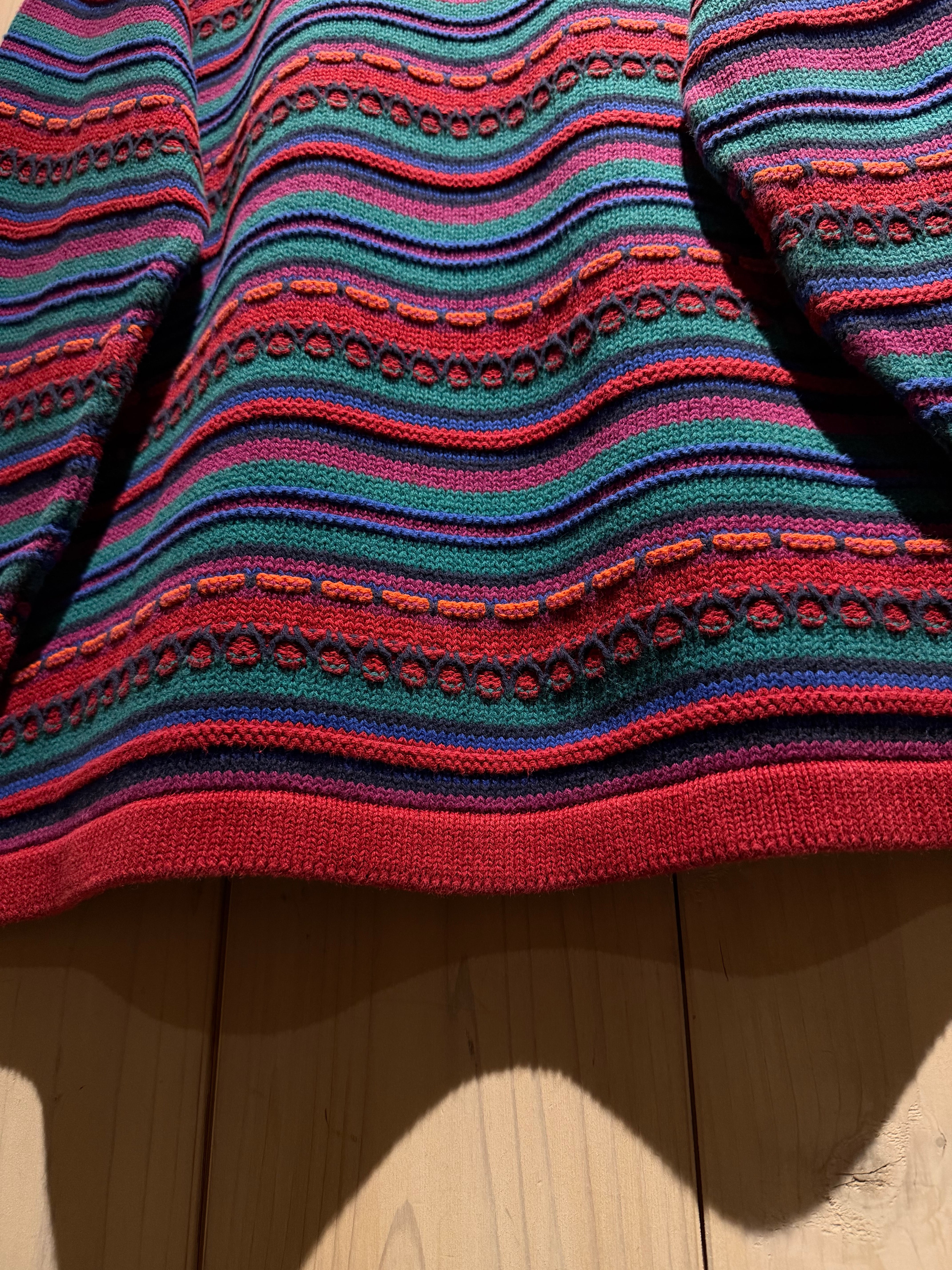 レッド、ターコイズ、パープル、グリーンを織り交ぜた鮮やかなカラーリングに、立体的な編み地で奥行きをプラスした1着。