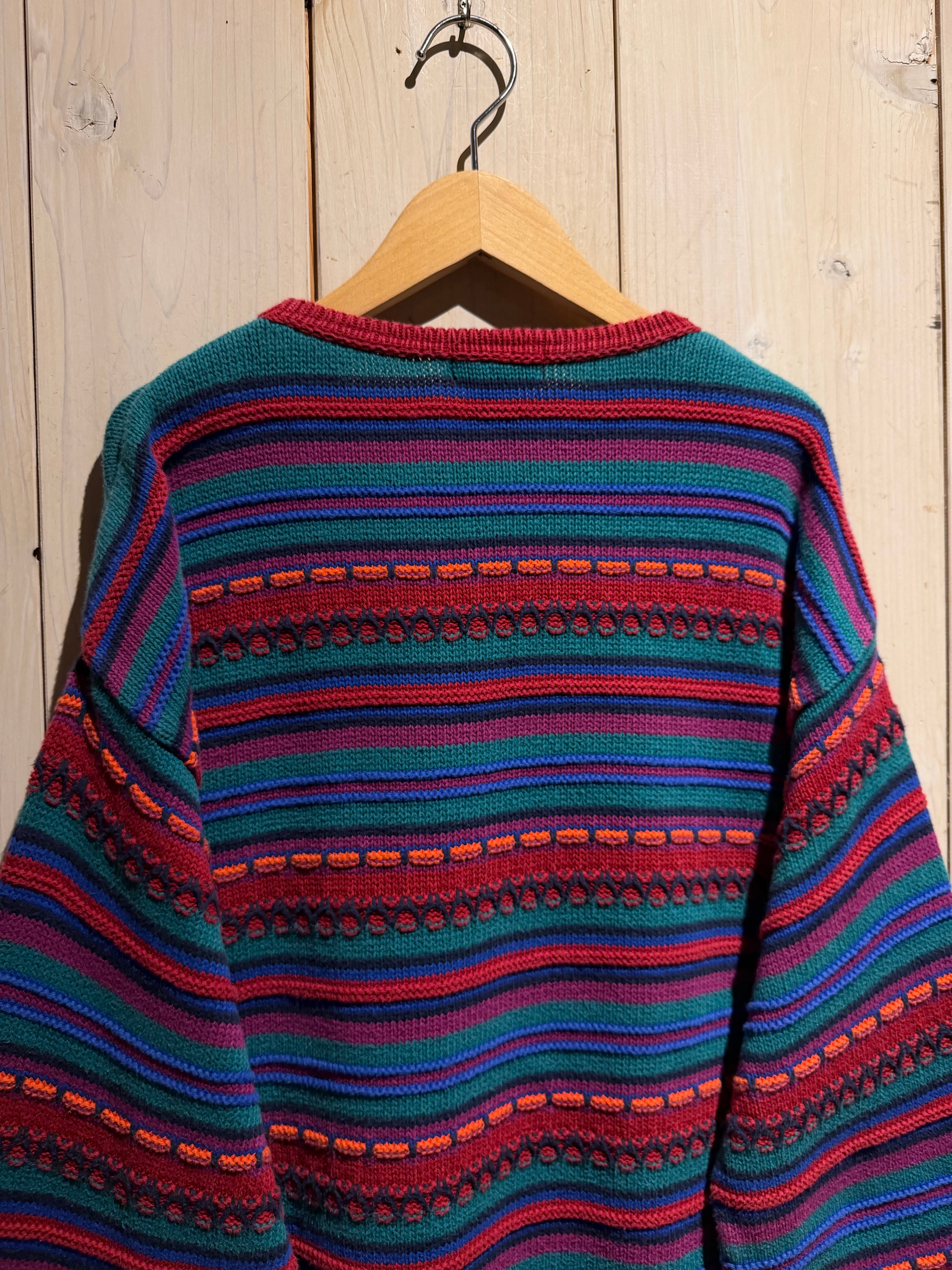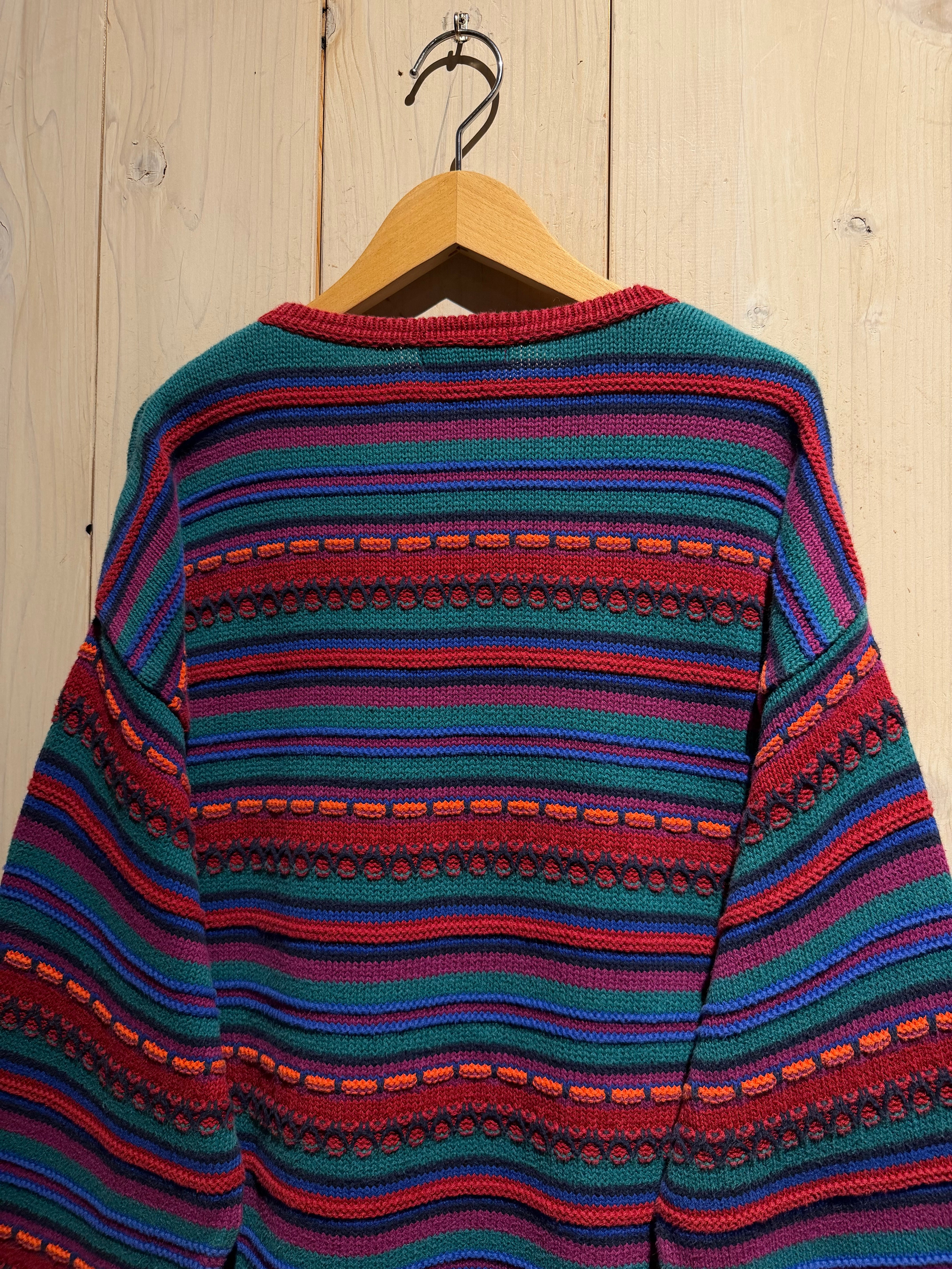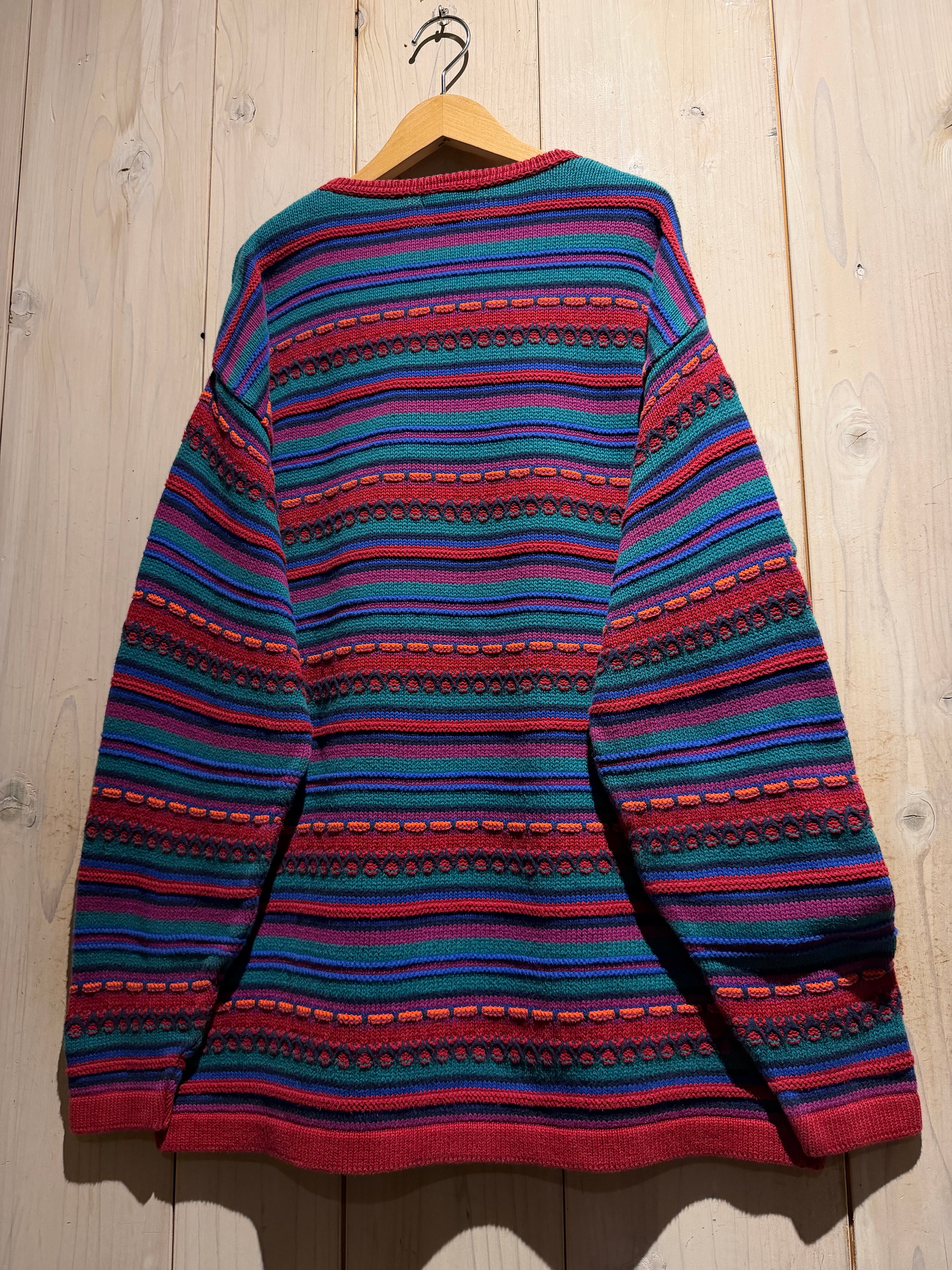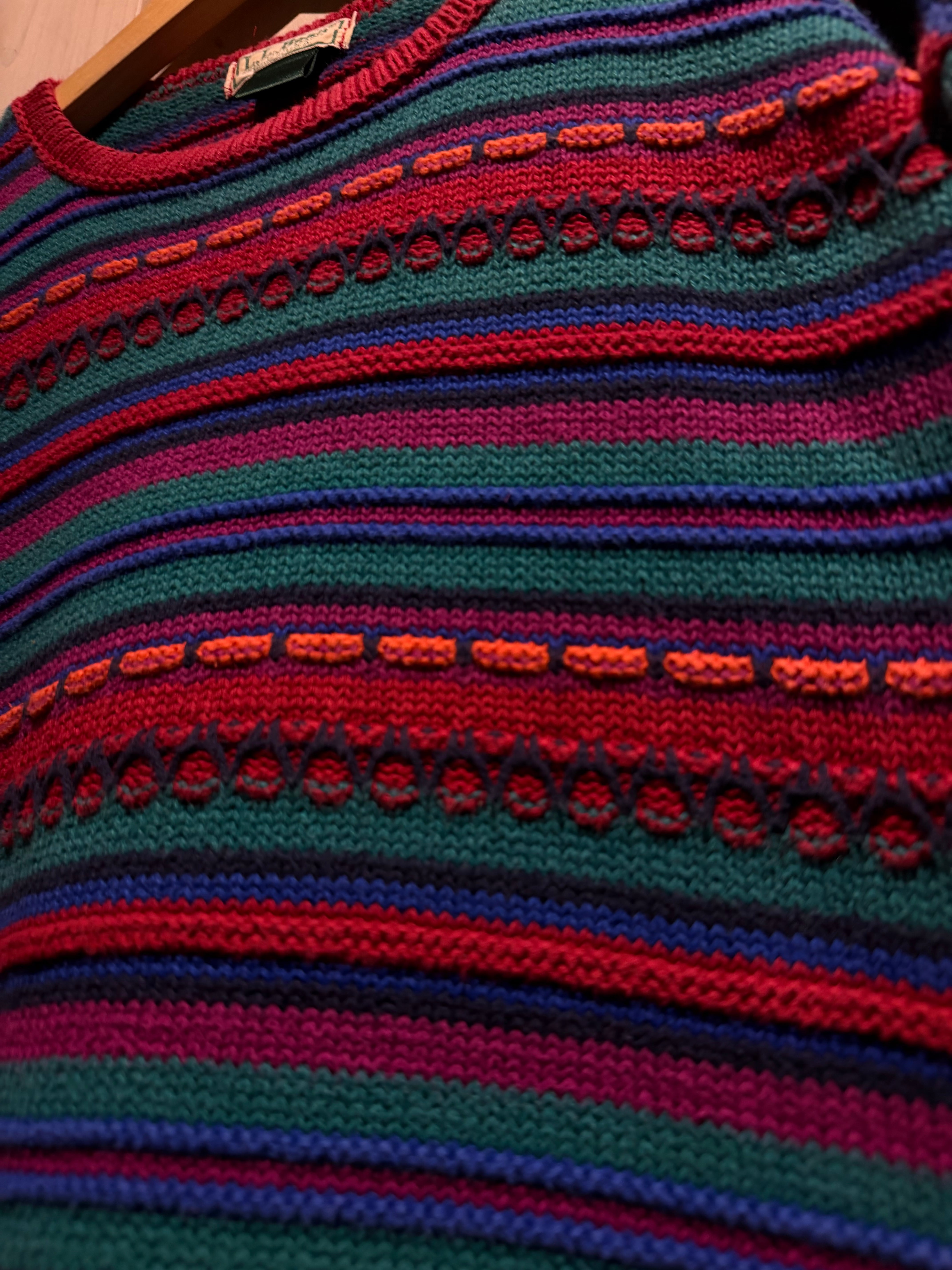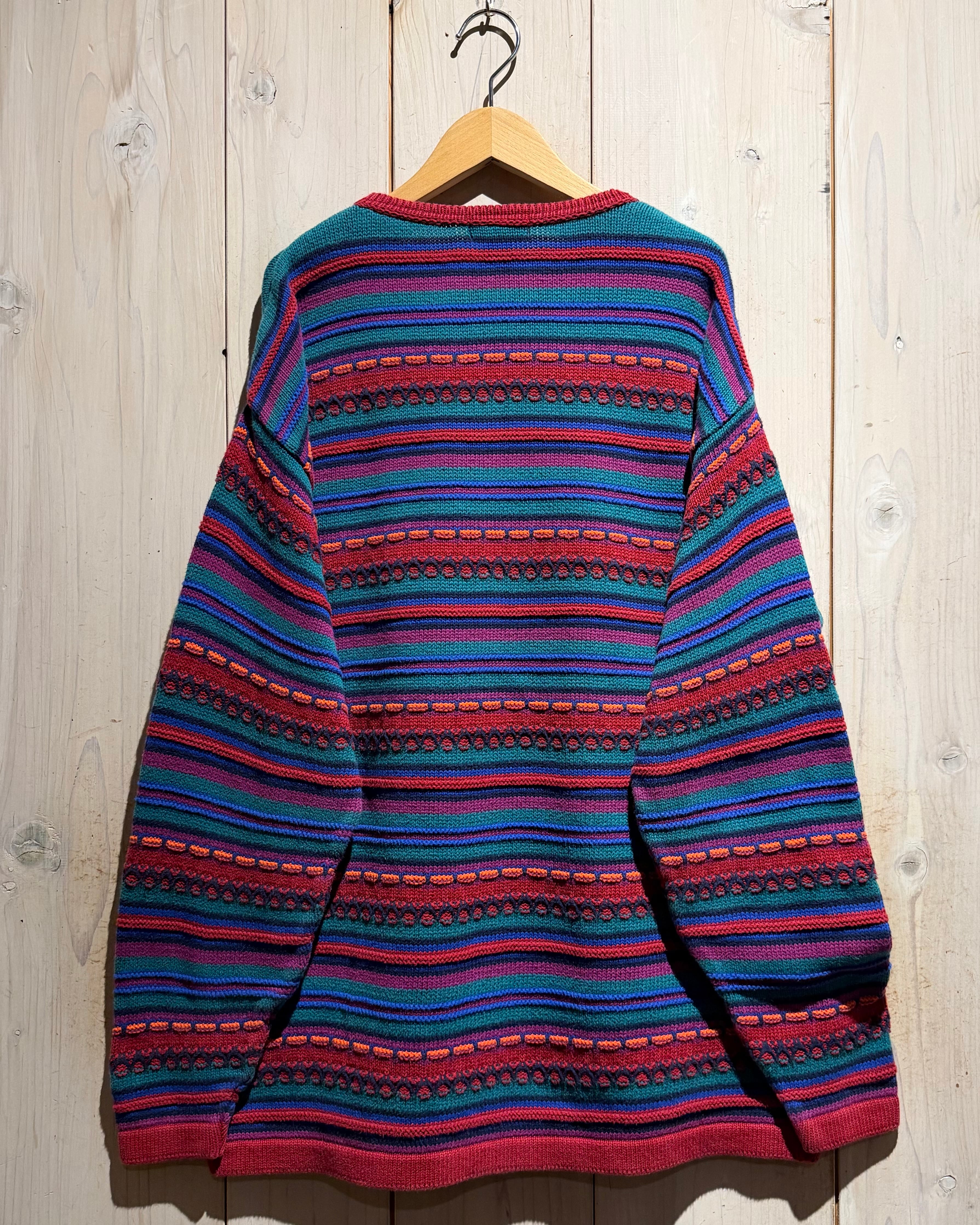 レッド、ターコイズ、パープル、グリーンを織り交ぜた鮮やかなカラーリングに、立体的な編み地で奥行きをプラスした1着。