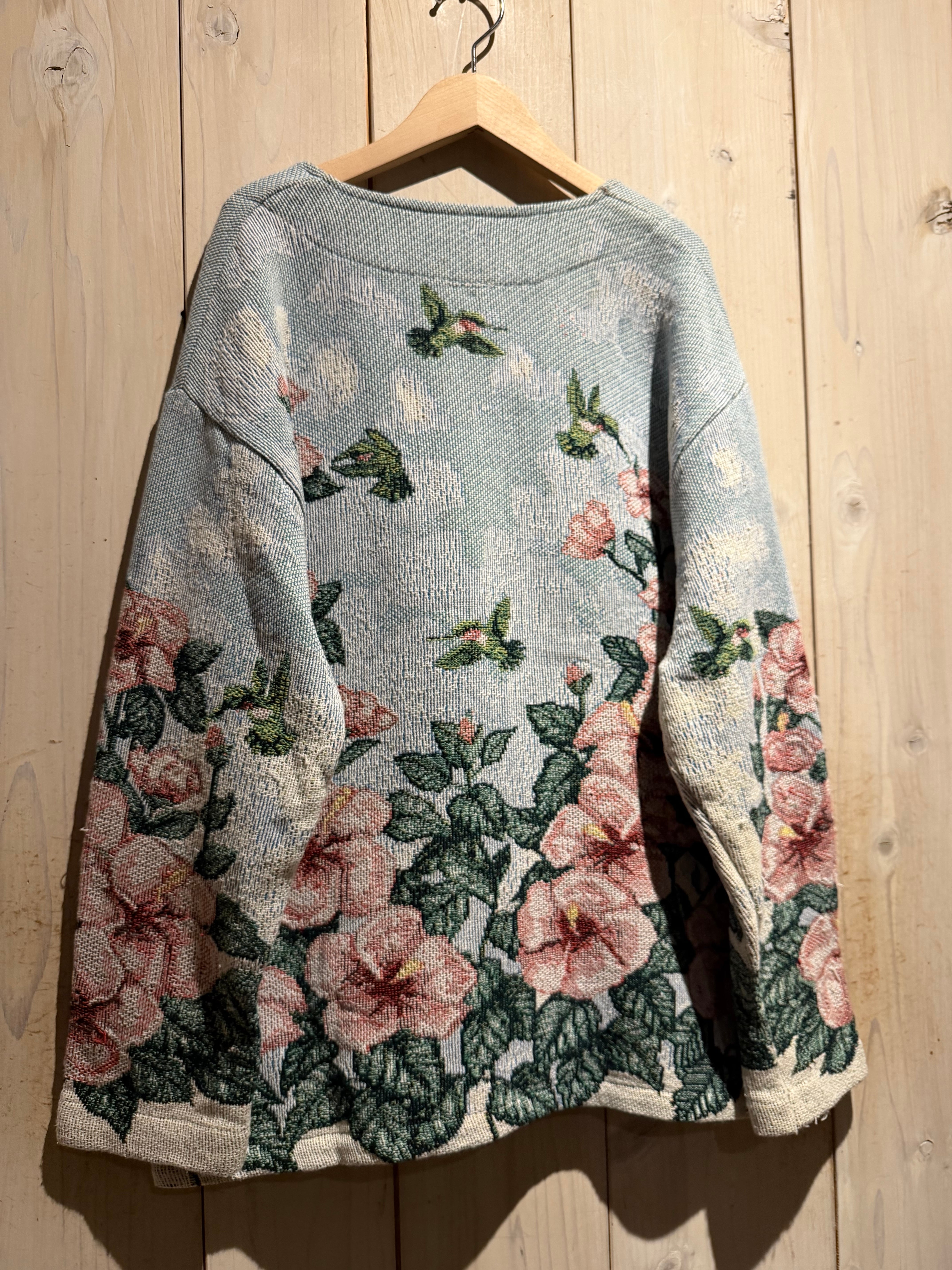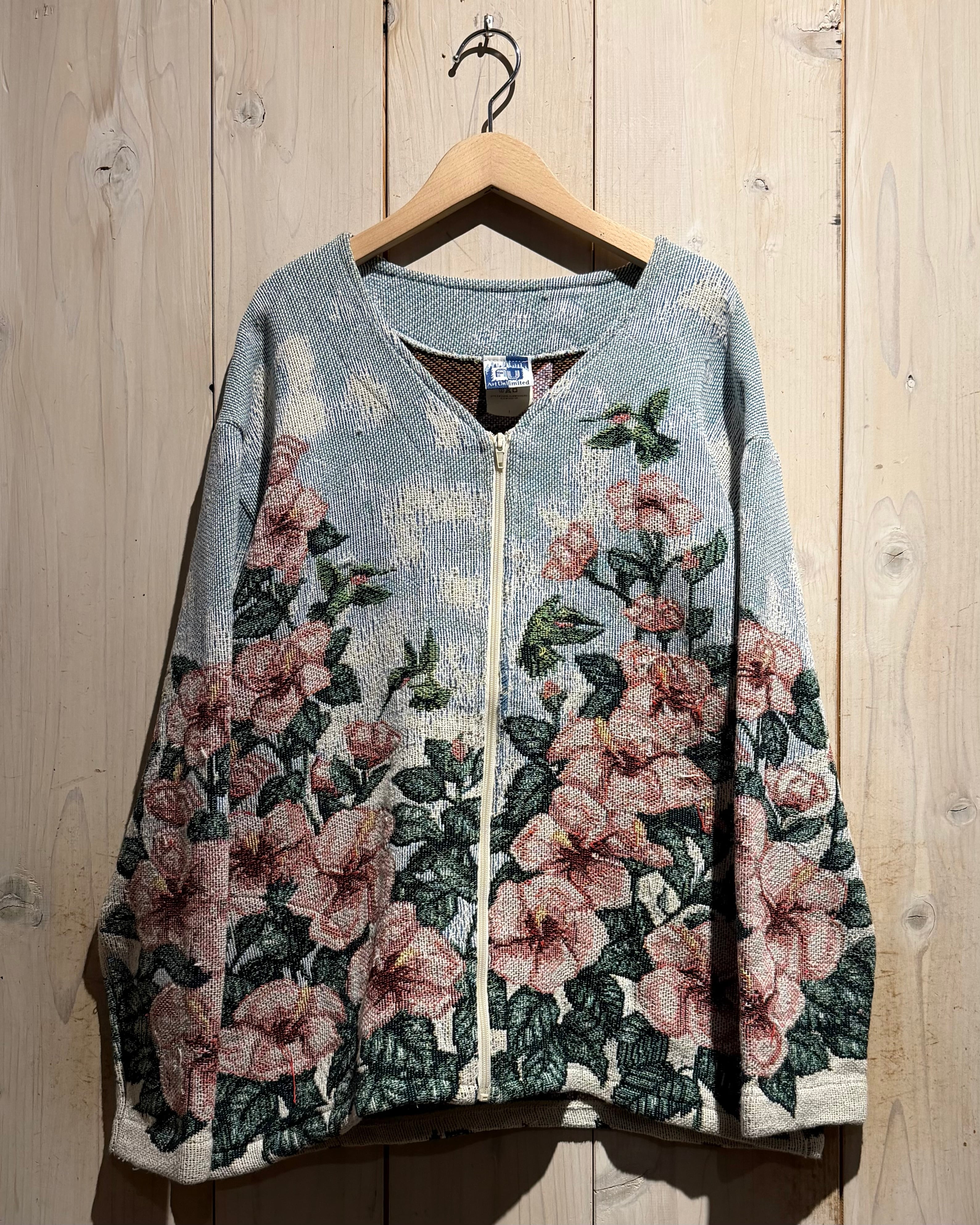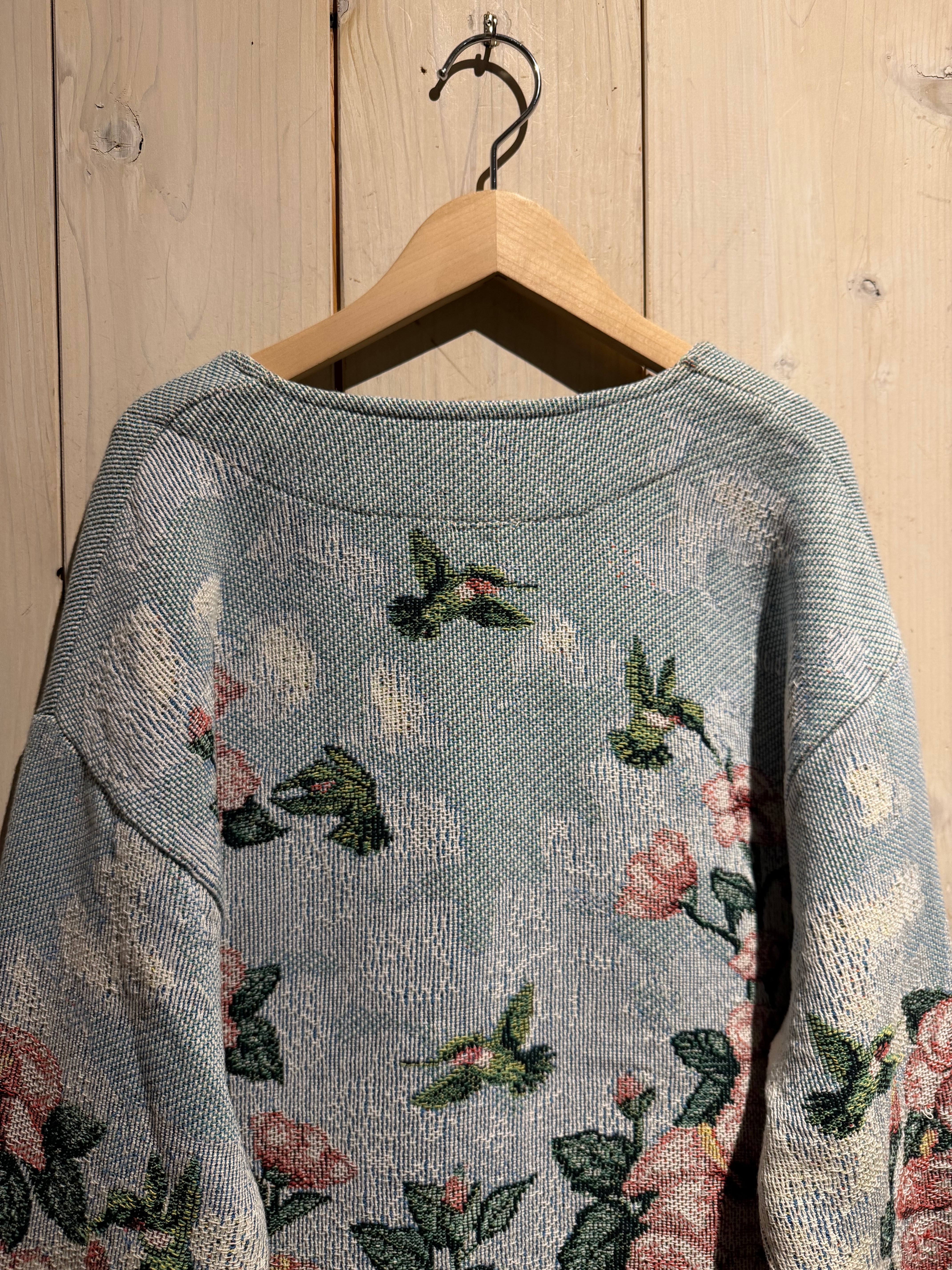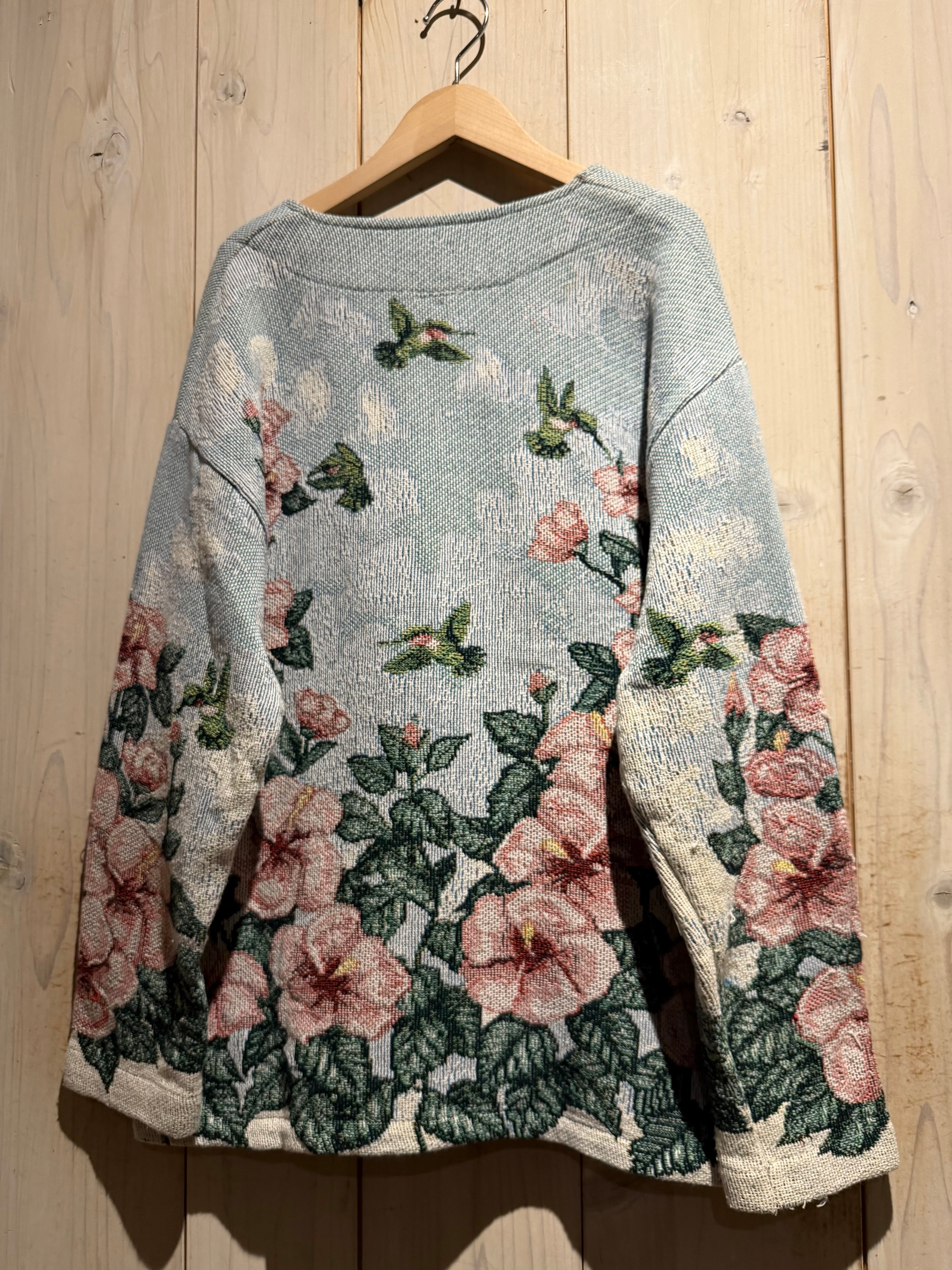 淡いライトブルーをベースに、ピンクの大ぶりな花と深みあるグリーンのリーフを全面に配置。さらにハミングバードを散りばめ、まるでタペストリーのような芸術的なデザインに仕上げられています。