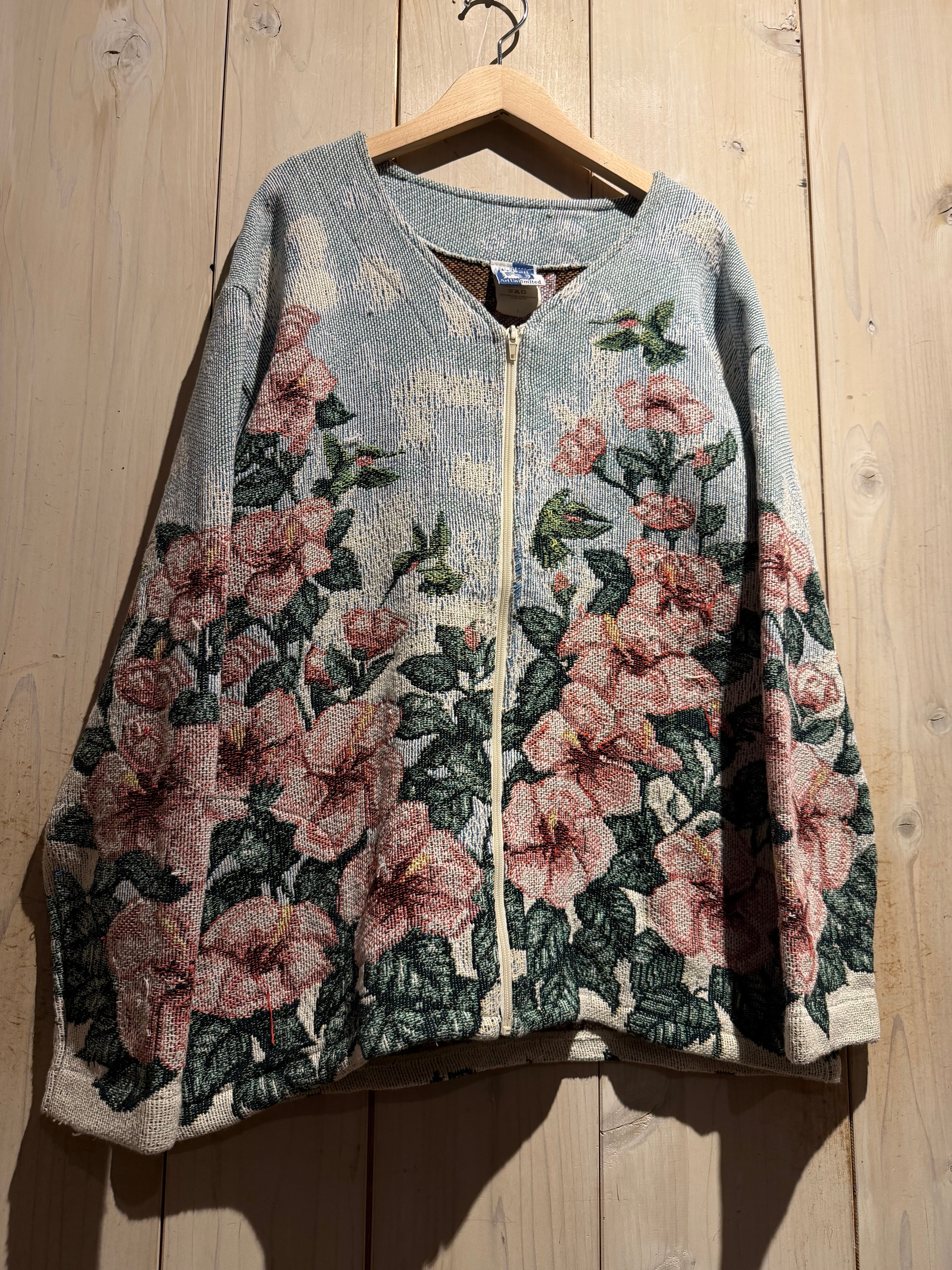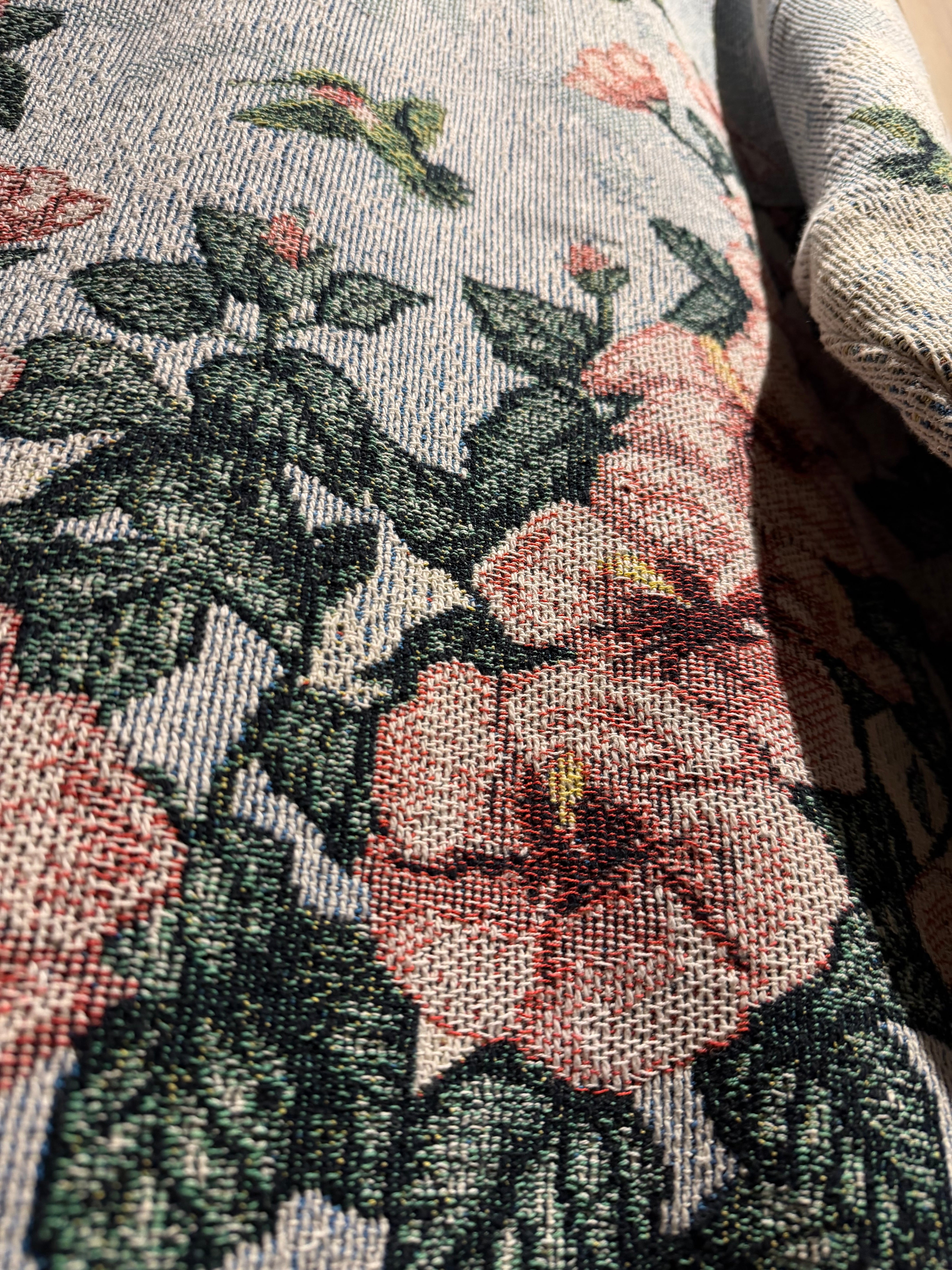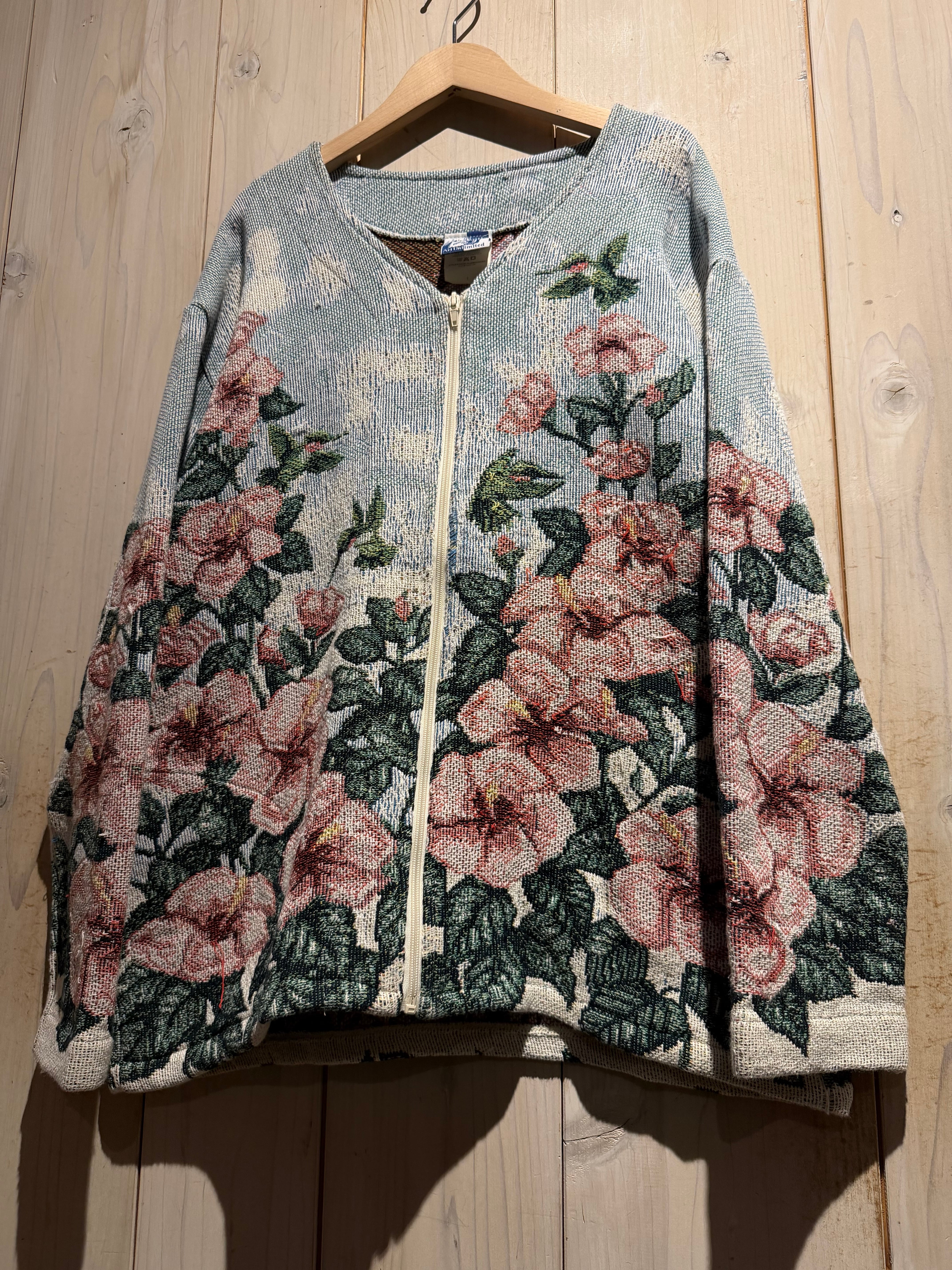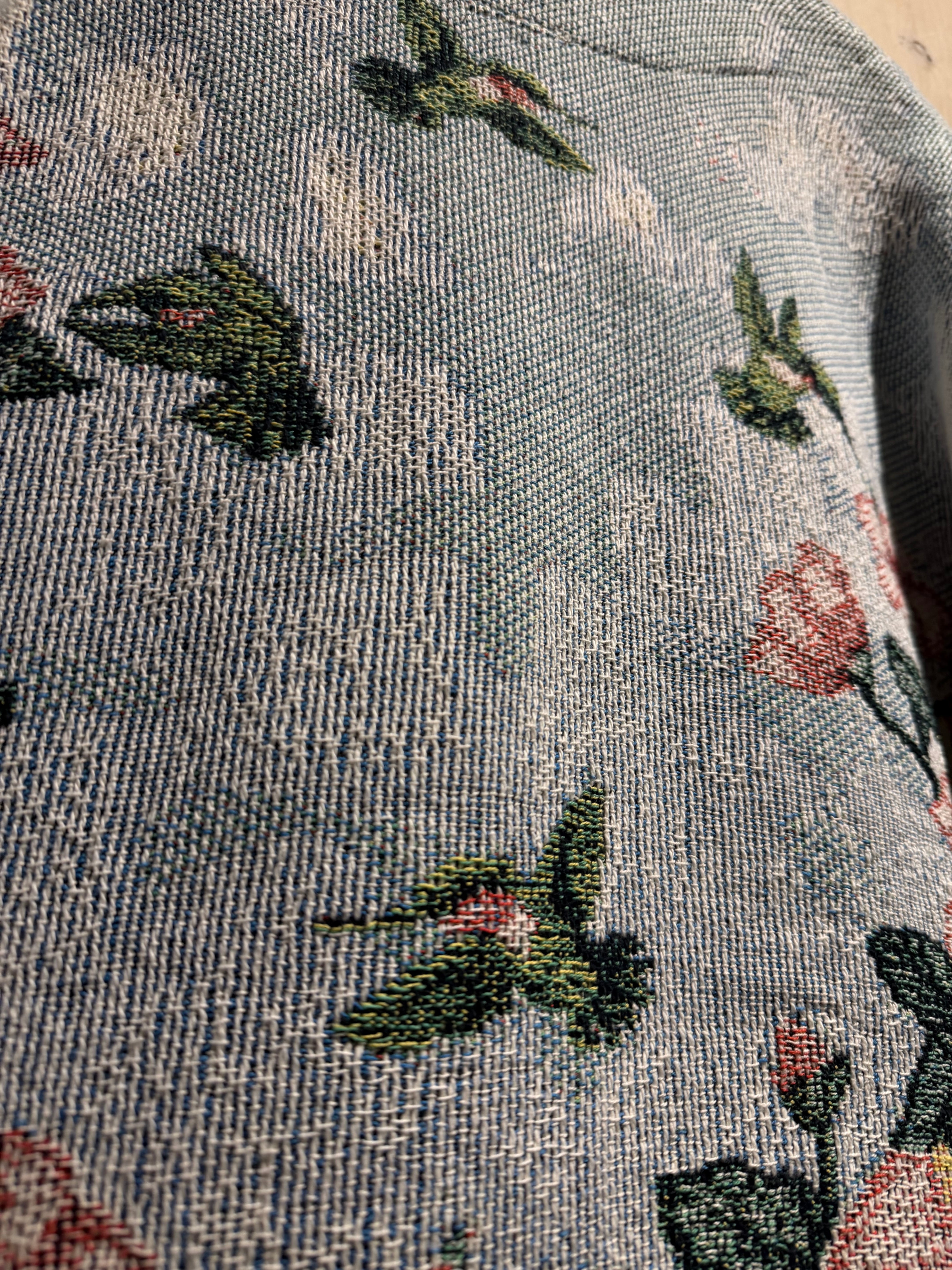 淡いライトブルーをベースに、ピンクの大ぶりな花と深みあるグリーンのリーフを全面に配置。さらにハミングバードを散りばめ、まるでタペストリーのような芸術的なデザインに仕上げられています。