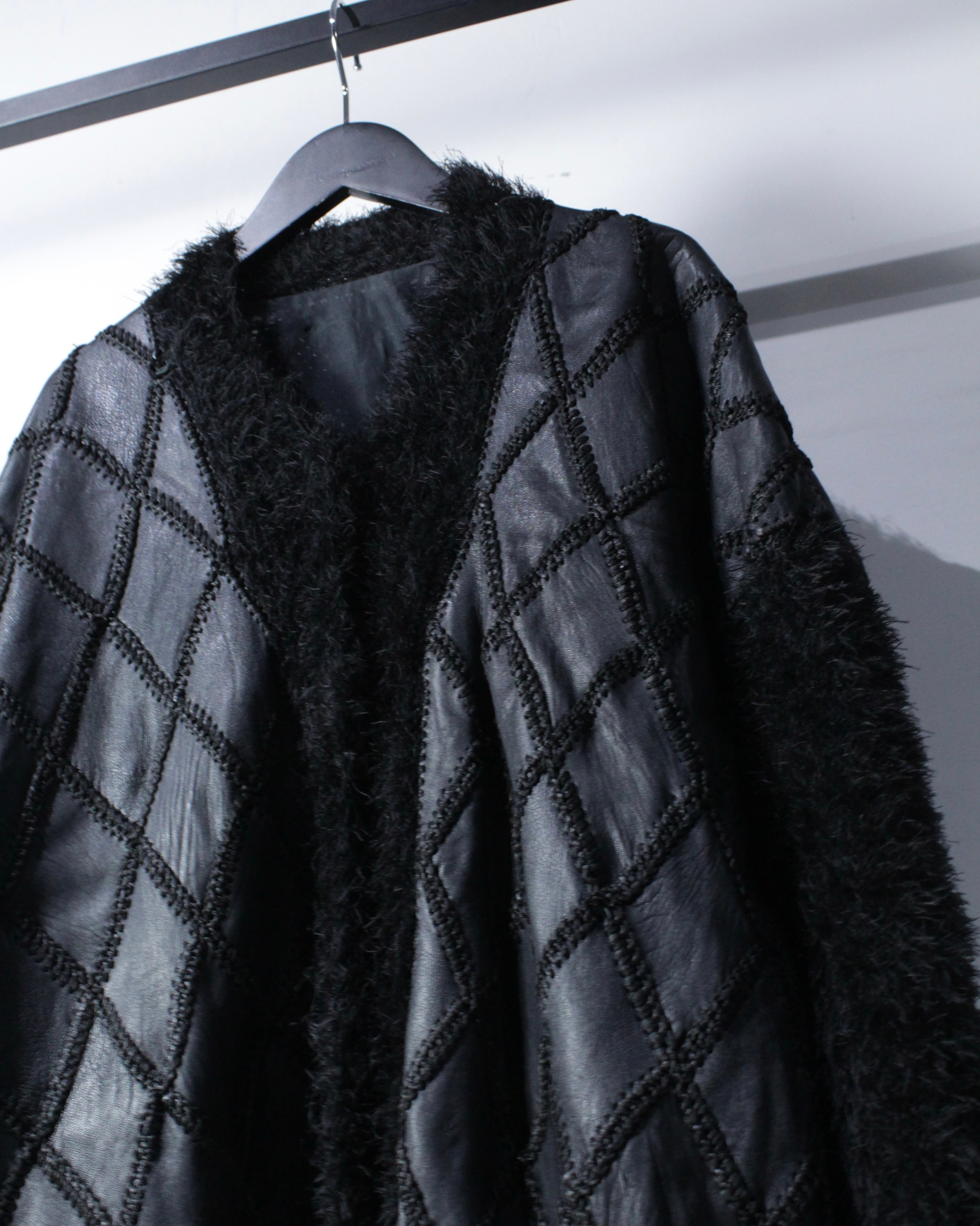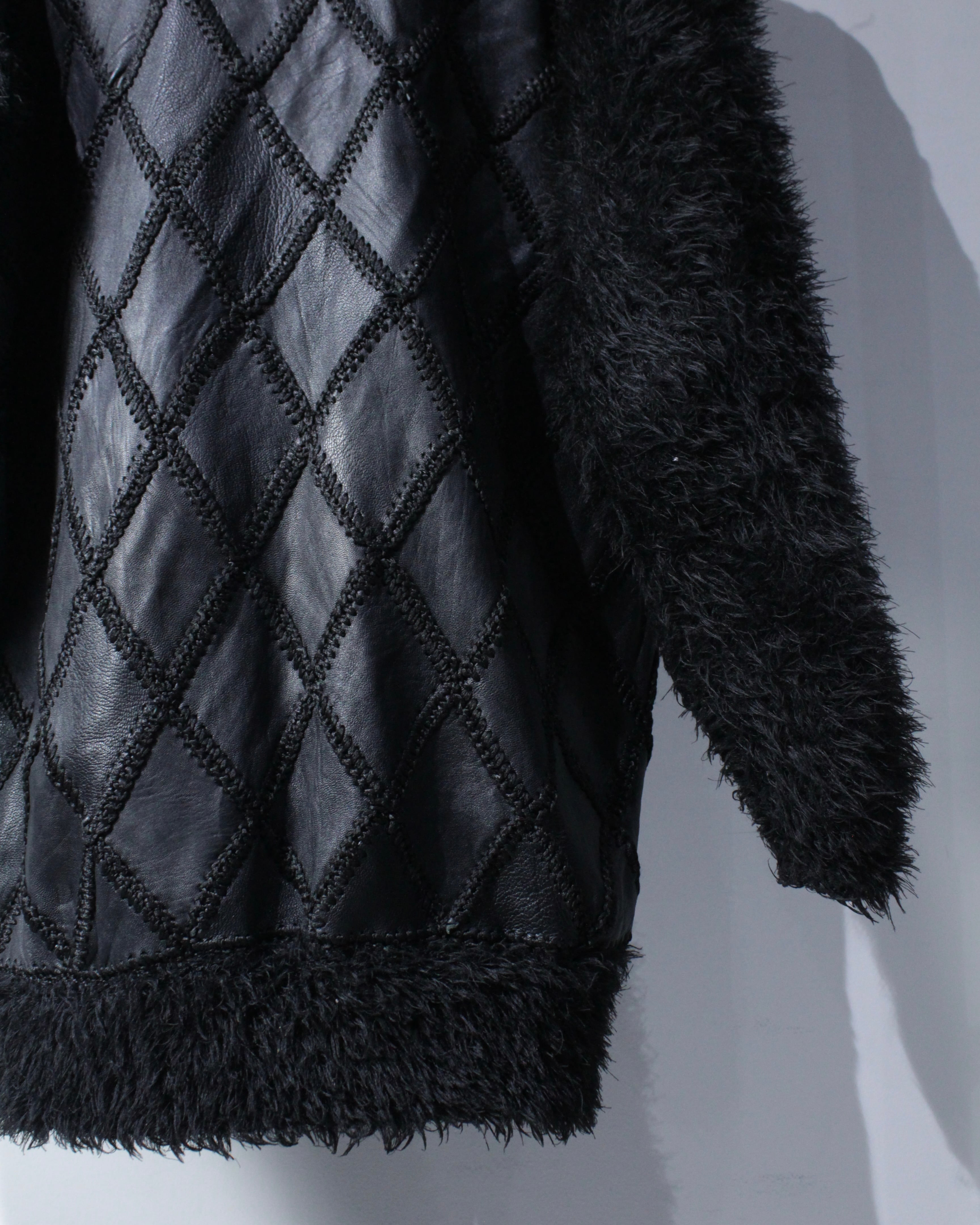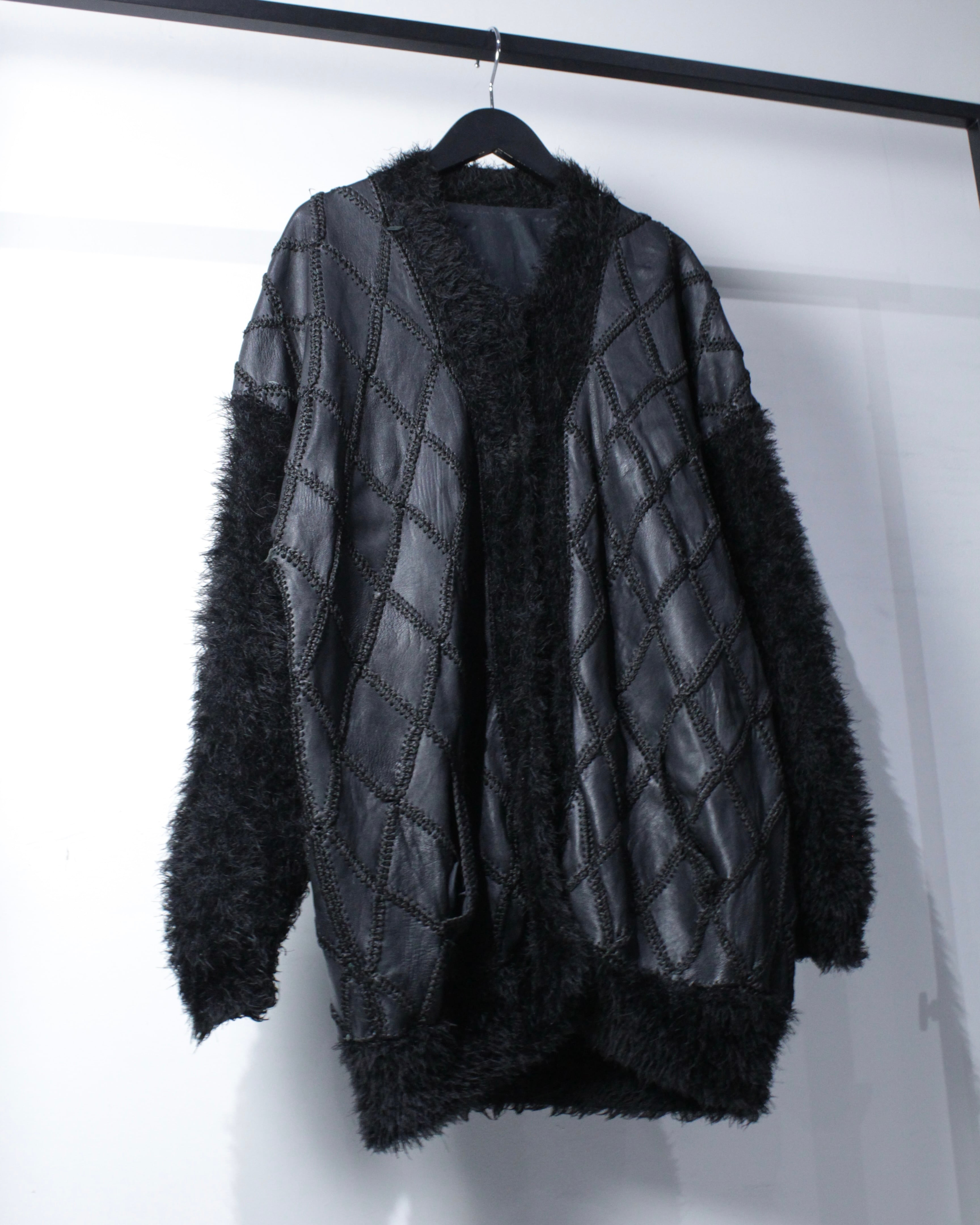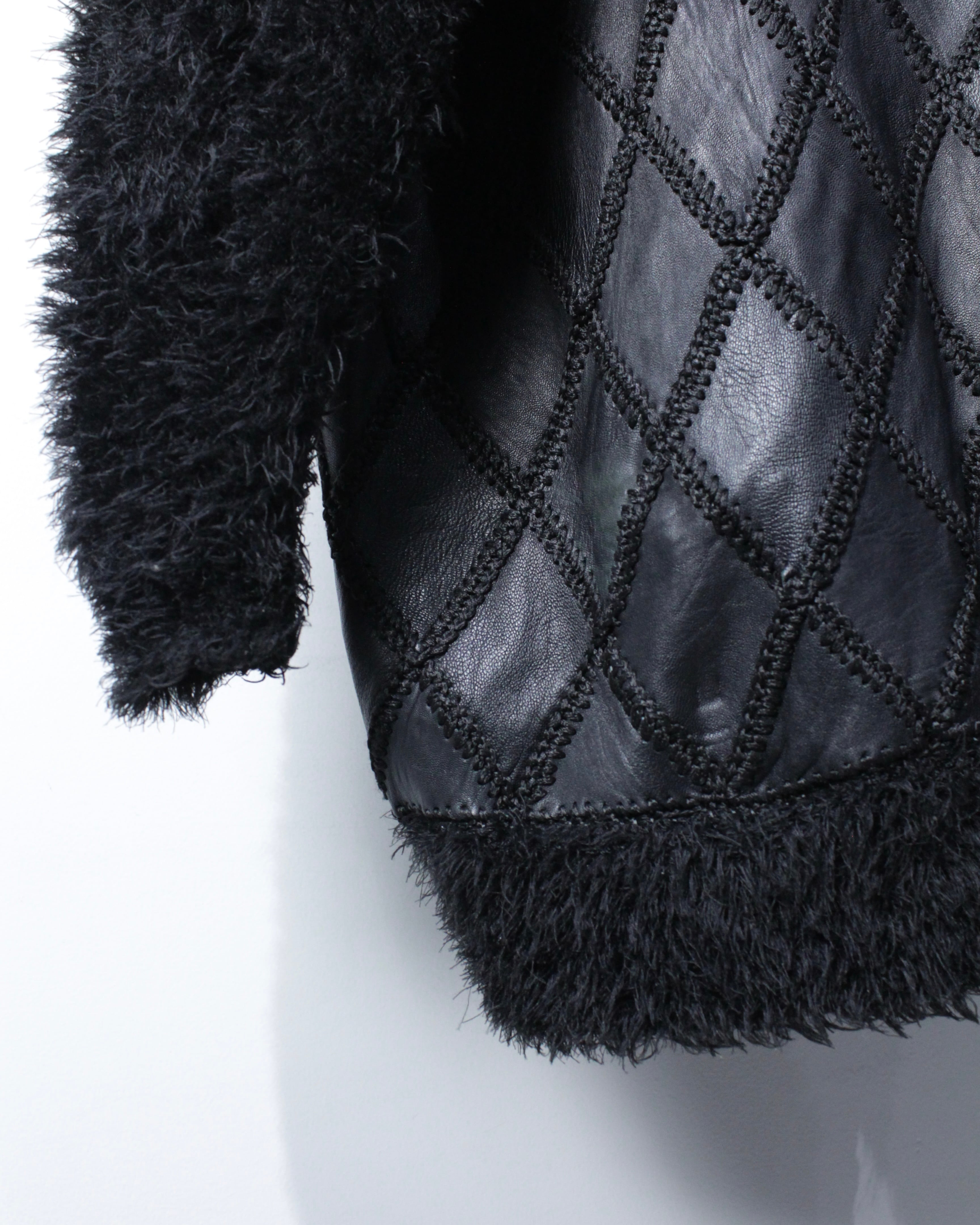 対して袖やフロント縁、裾には毛足の長いシャギーニットを用いており、レザーの滑らかさとふわりとした起毛感とのコントラストが秀逸で、素材同士の対比がそのままデザインへと昇華されています。