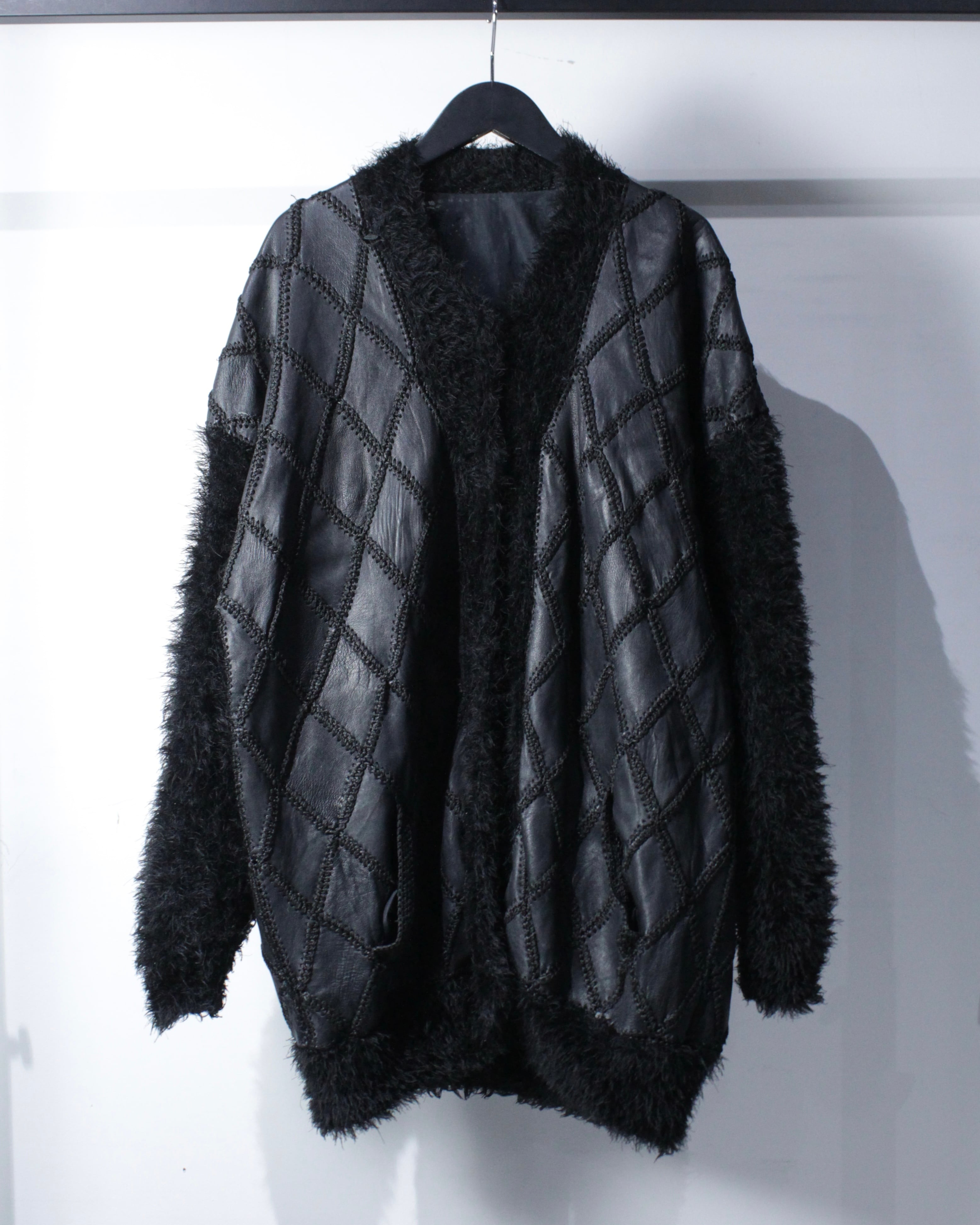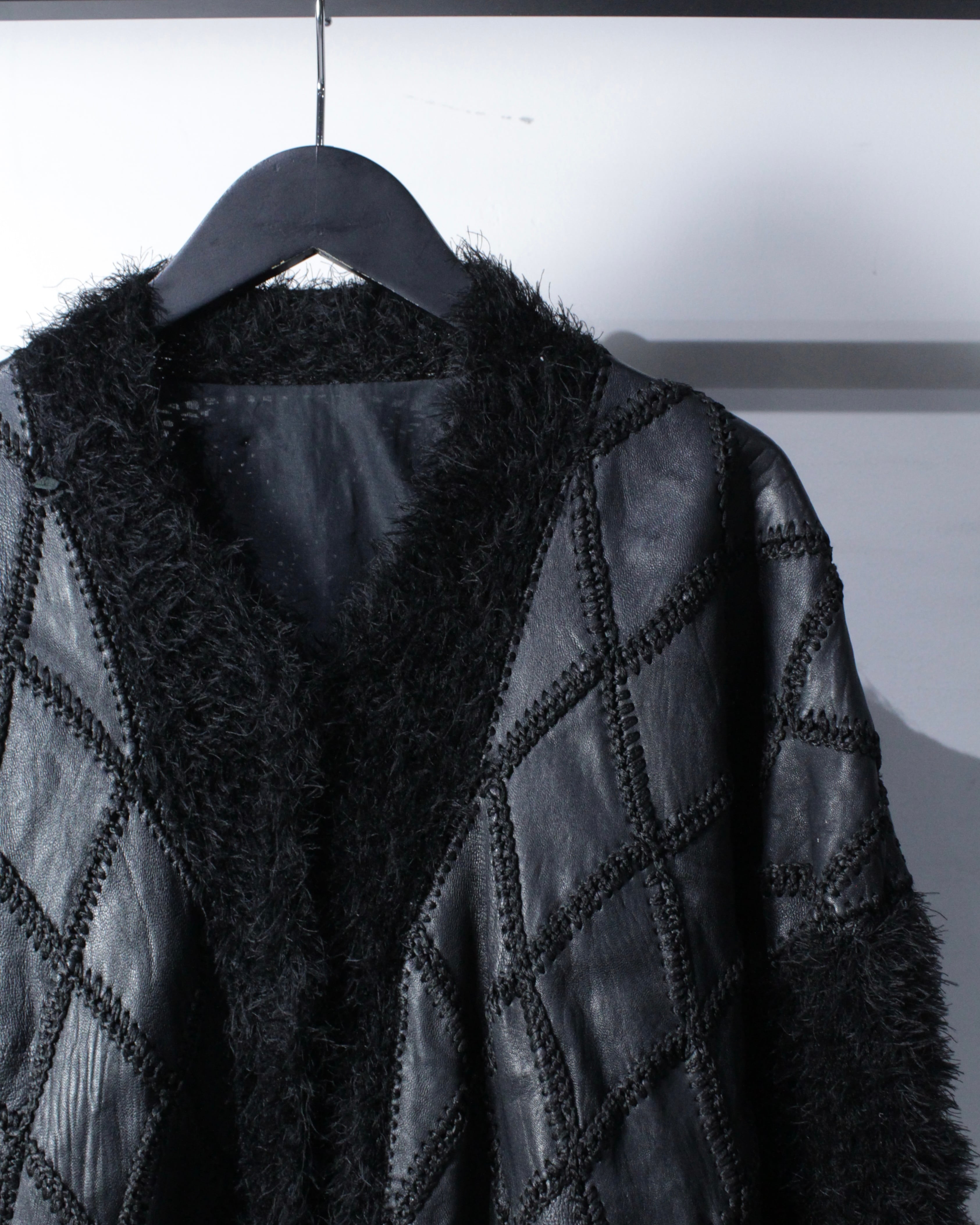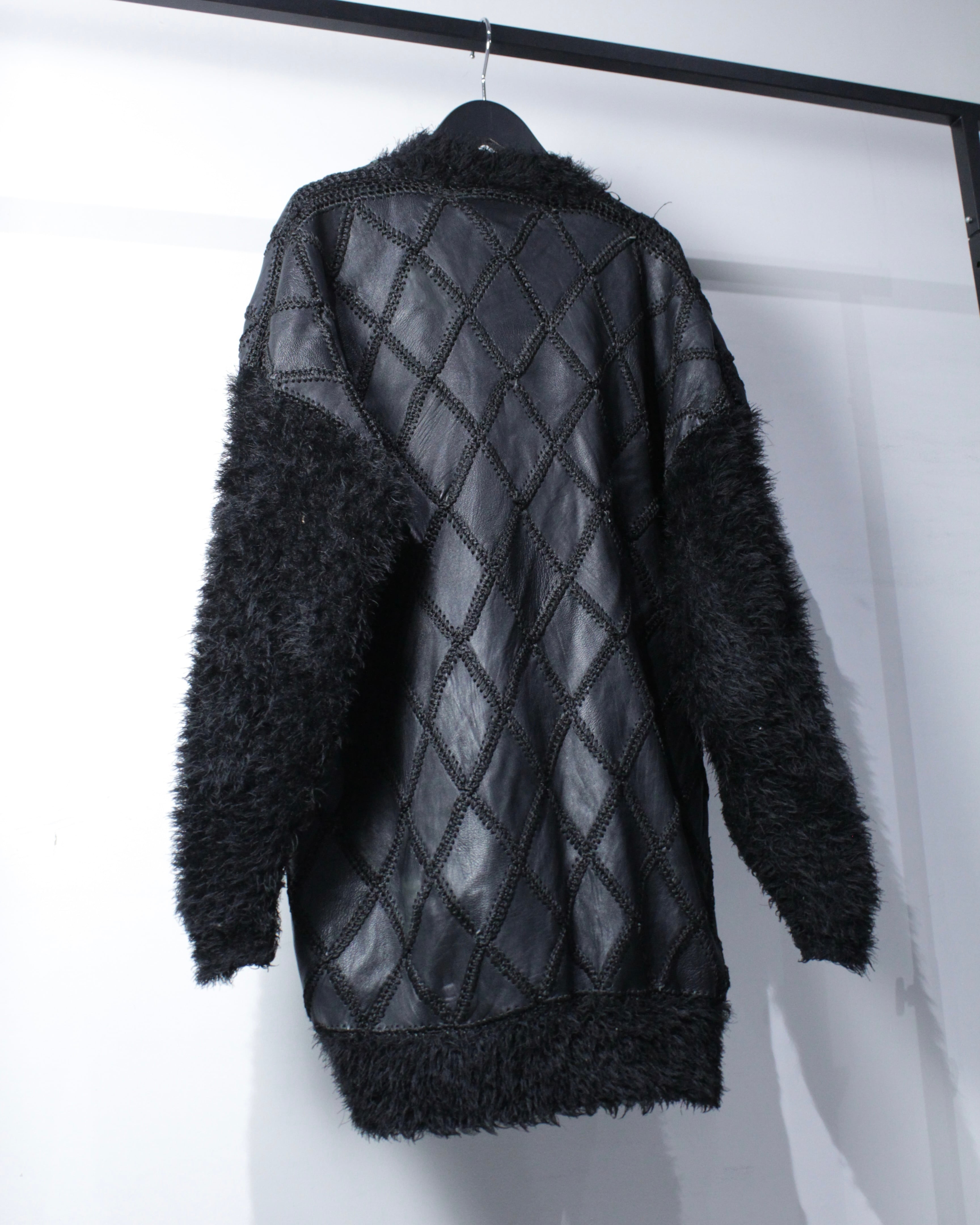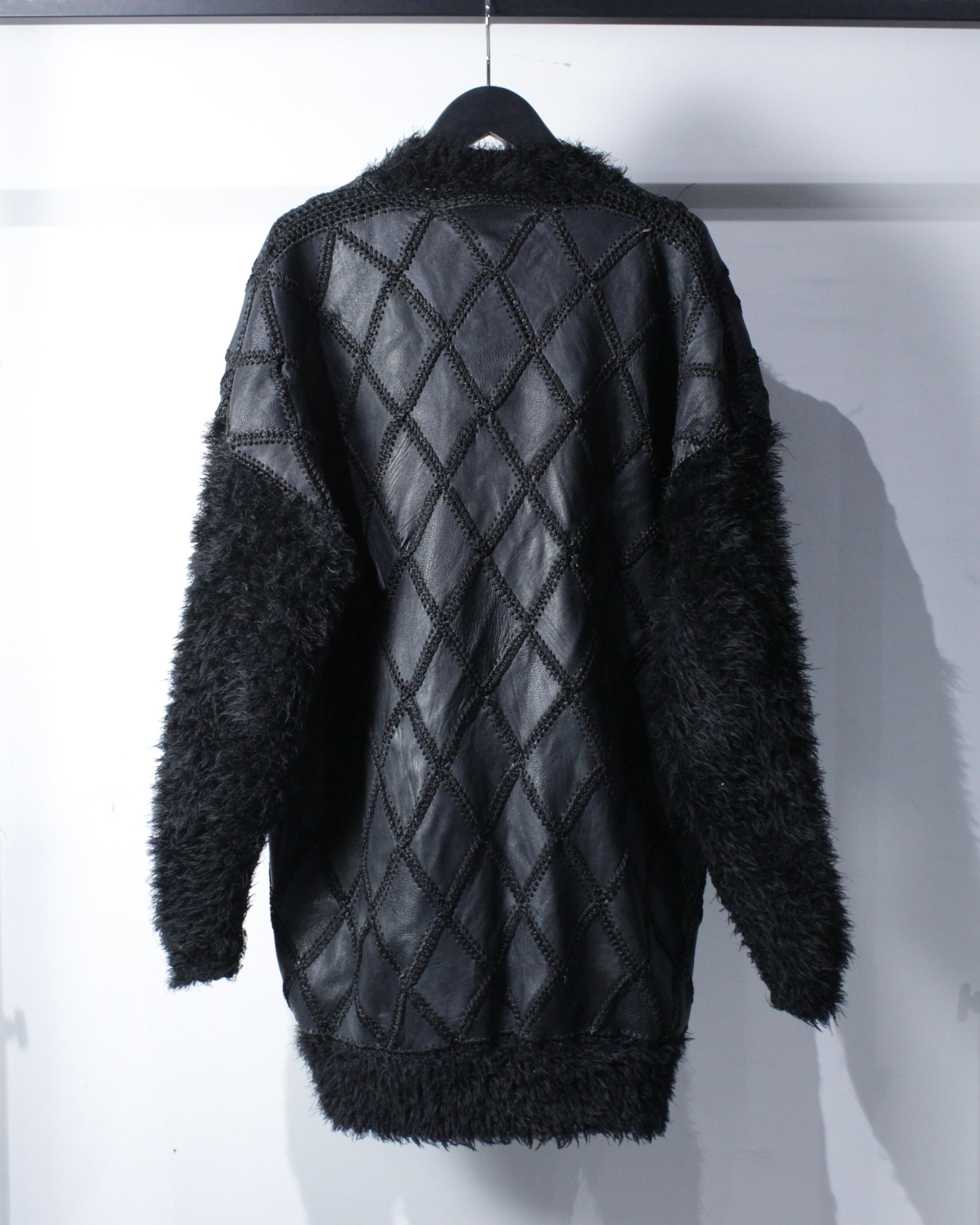 対して袖やフロント縁、裾には毛足の長いシャギーニットを用いており、レザーの滑らかさとふわりとした起毛感とのコントラストが秀逸で、素材同士の対比がそのままデザインへと昇華されています。